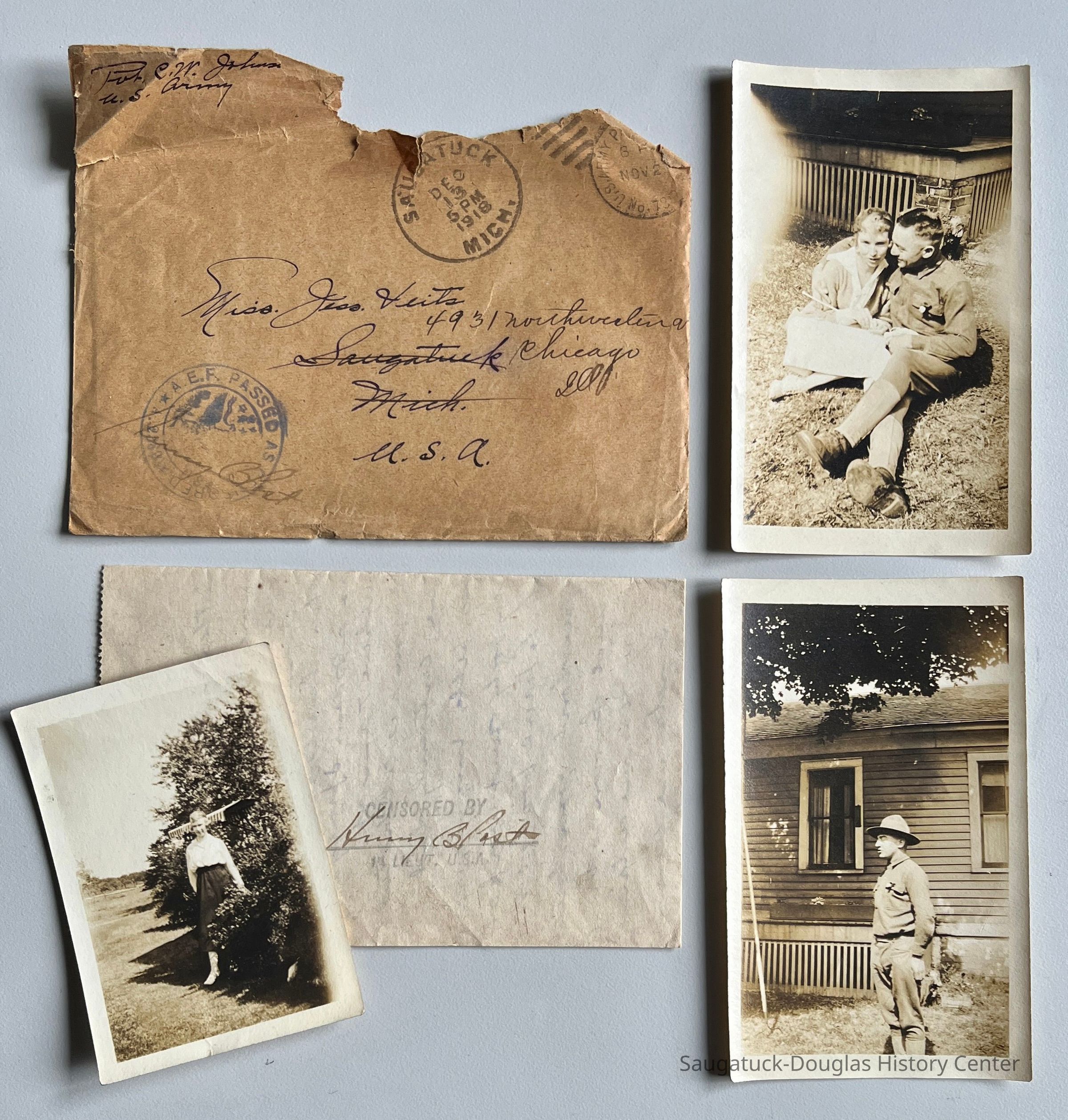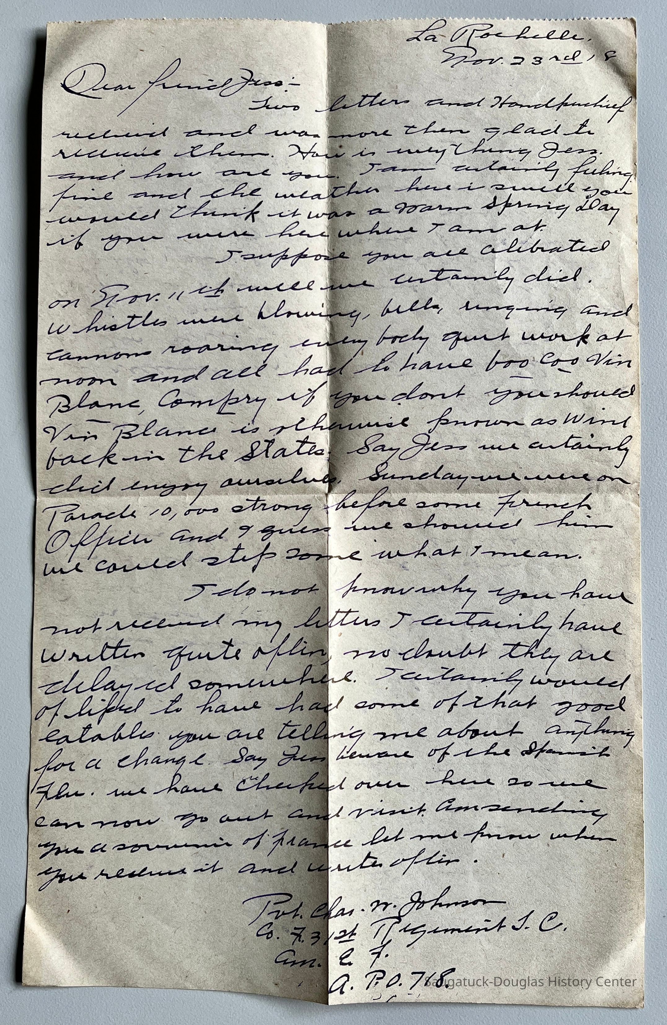 La Rochelle, Nov. 23rd, 18 [1918] Dear friend Jess Two letters and handkerchief received and was more than glad to receive them. How is my thing Jess. and how are you. I am certainly feeling fine and the weather here is swell you would think it was a warm spring day if you were here where I am at. I suppose you all celebrated on Nov. 11th well we certainly did. Whistles were blowing, bells, ringing and cannons roaring every body quit work at noon and all had to have boo coo Vin Blanc, Compry if you don't you should Vin Blanc is ... known as wine back in the States. Say Jess we certainly did enjoy .... Sunday we were on parade 10,000 strong before some French officer and I guess we showed him we could step some what I mean. I do not know why you have not received my letters. I certainly have written quite often, no doubt they are delayed somewhere. I certainly would of liked to have had some of that good eatables you are telling me about anything for a change. Say Jess beware of the Spanish Flu. We have checked over here so we can no go out and visit. I am sending you a souvenir of France let me know when you received it and write often. Pvt. Chas. M [W?] Johnson Co. F. 31st Regiment T.C. Am E. F. A.P.O. 718