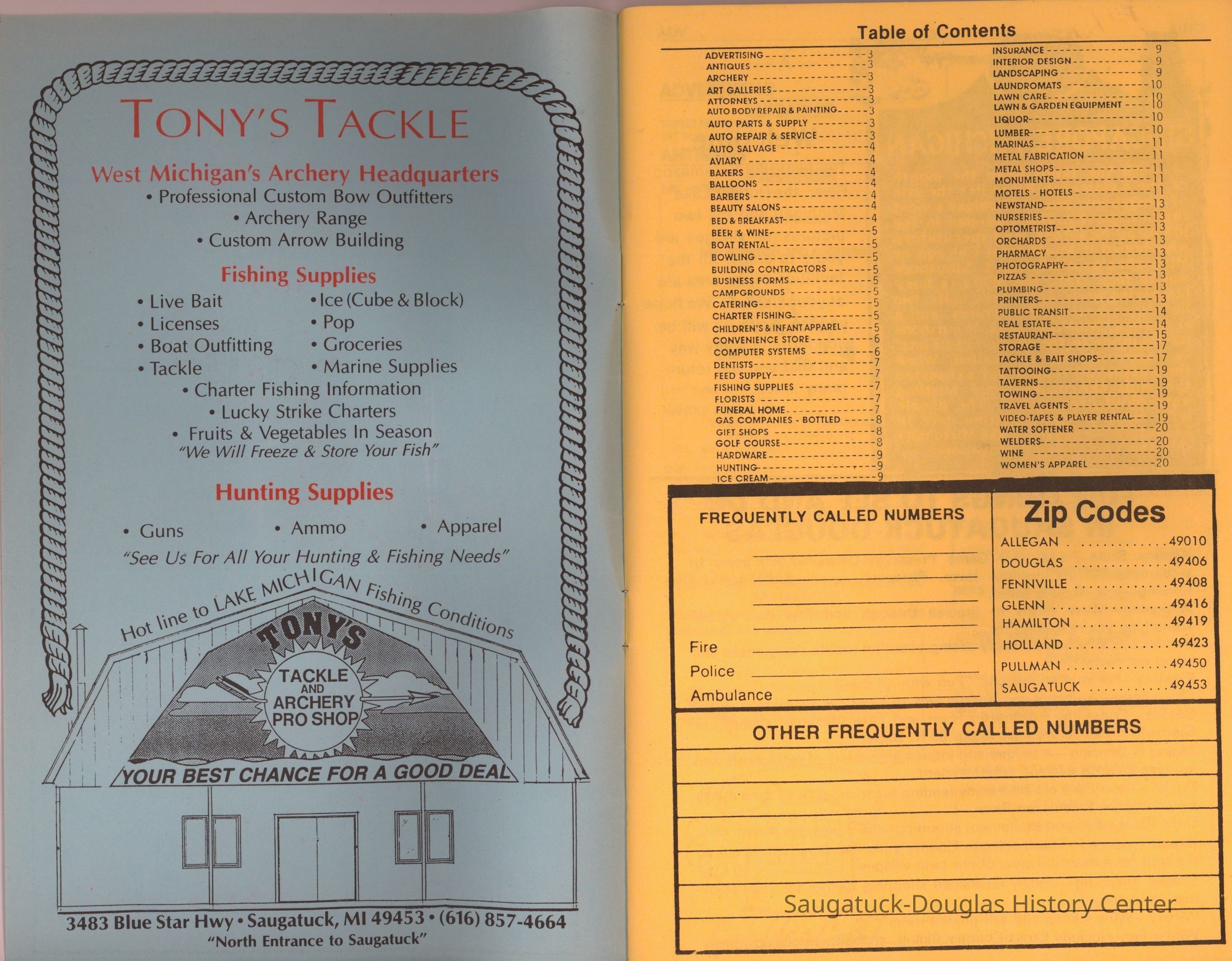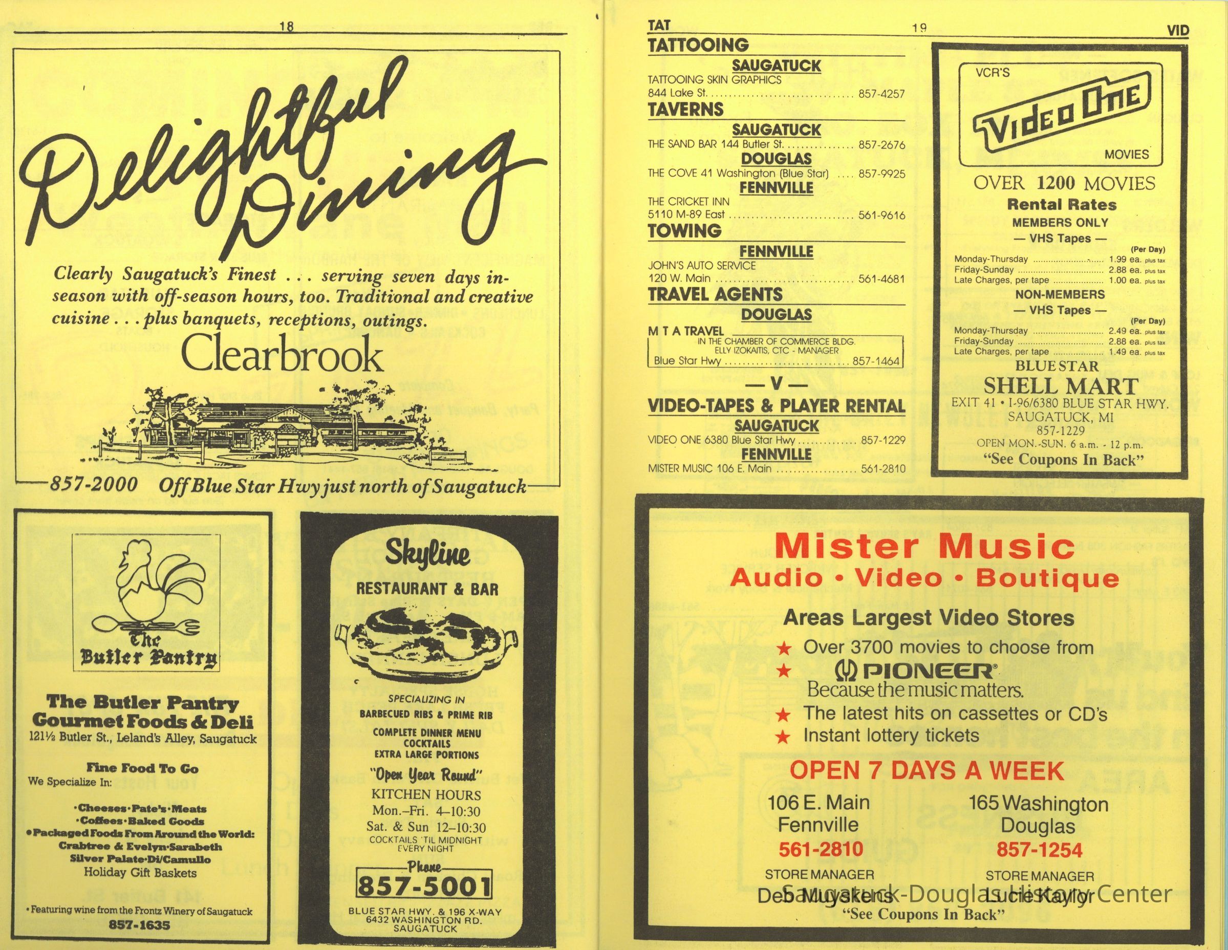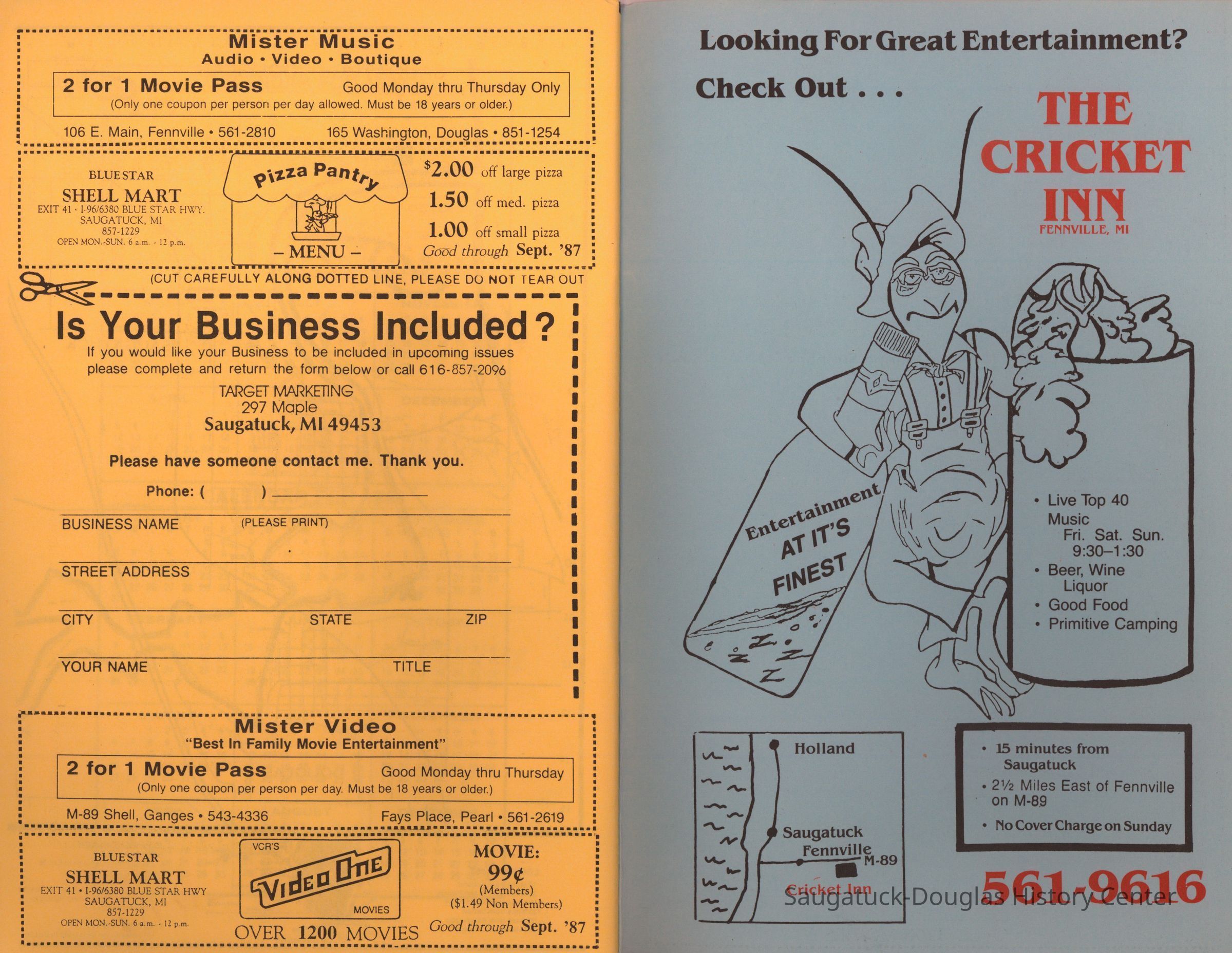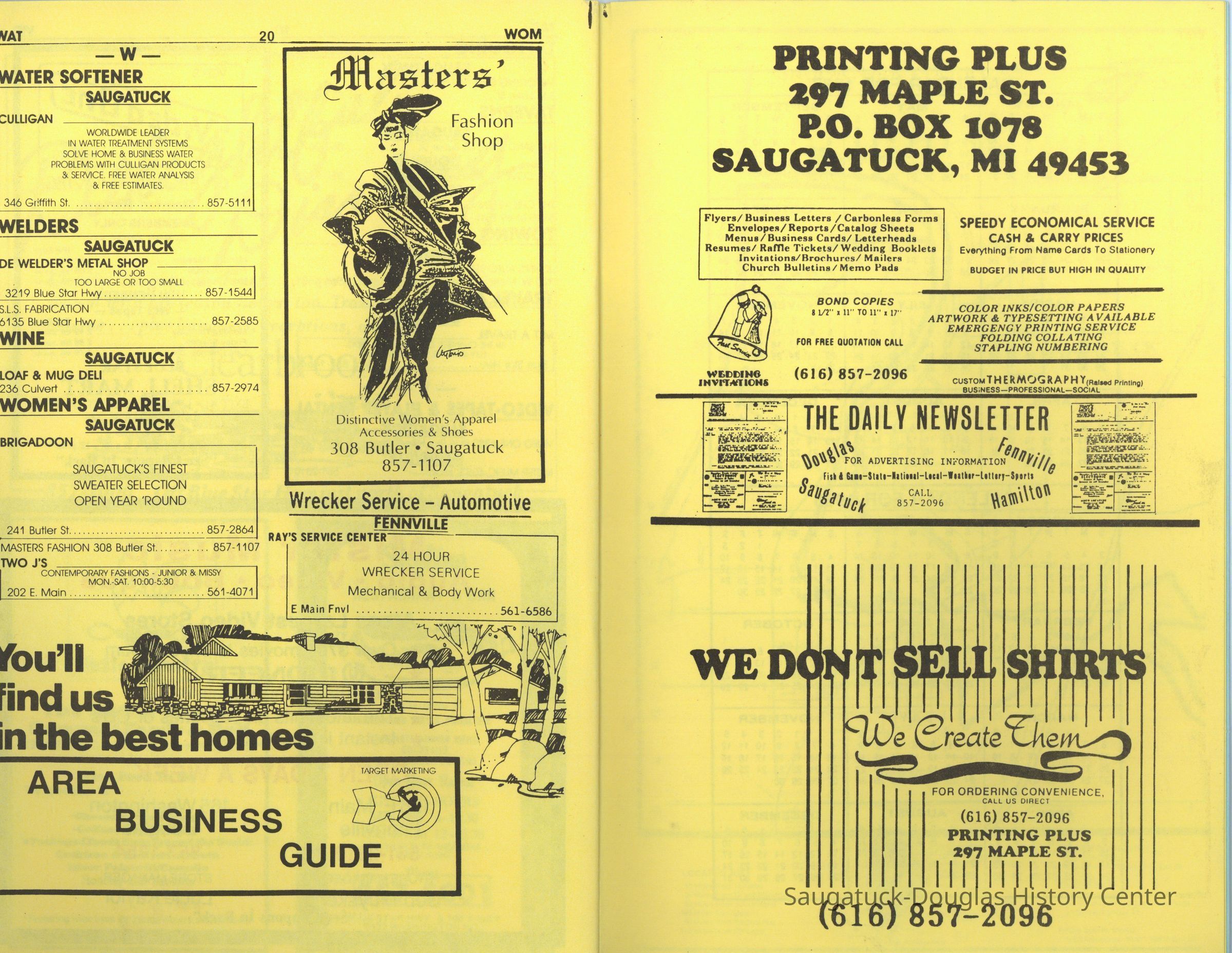 A snapshot of what businesses were advertising in 1987. Many business are listed multiple times and have display ads that might not be on the same page as the listing. Produced by Target Marketing a.k.a. Printing Plus at 297 Maple St., Saugatuck