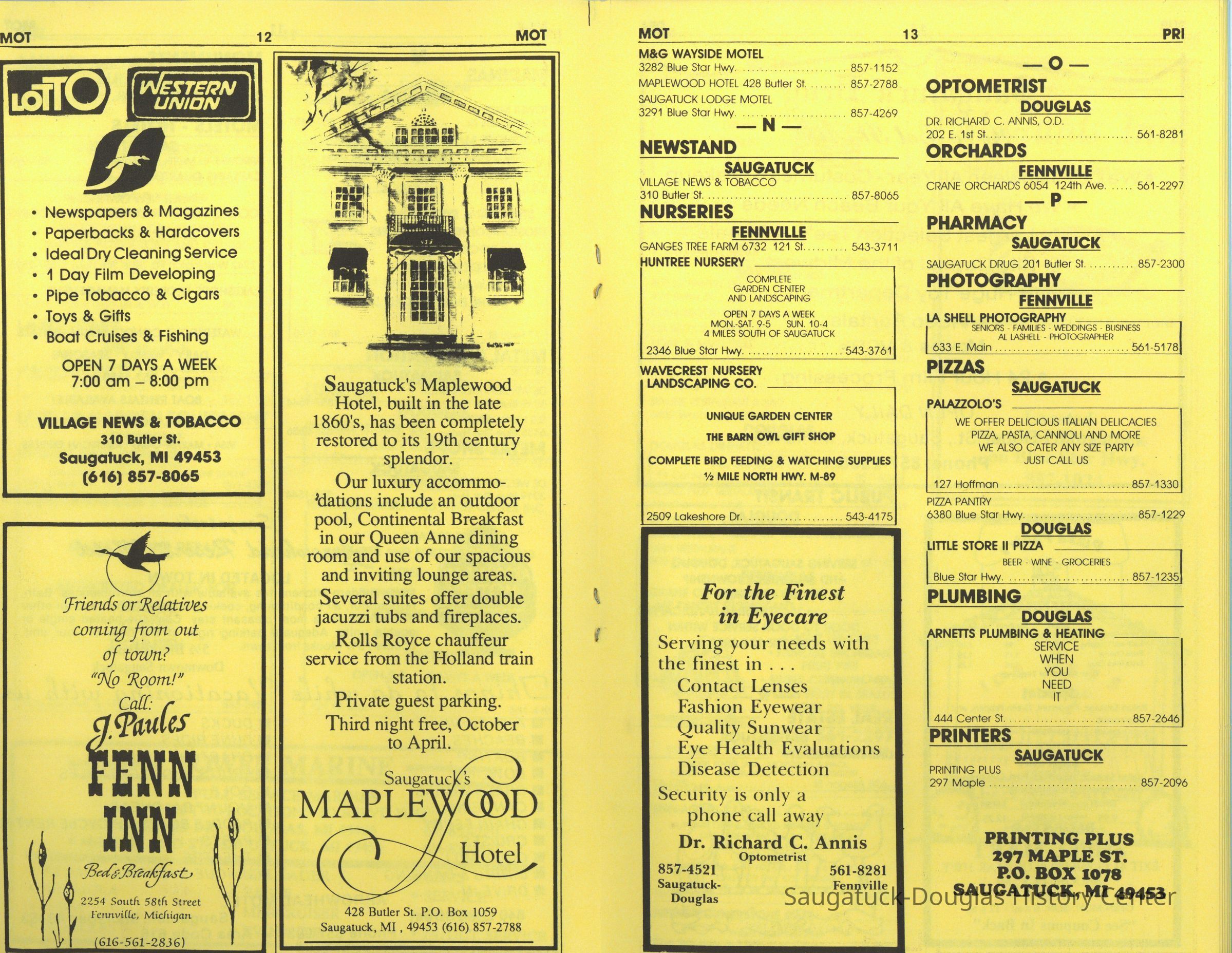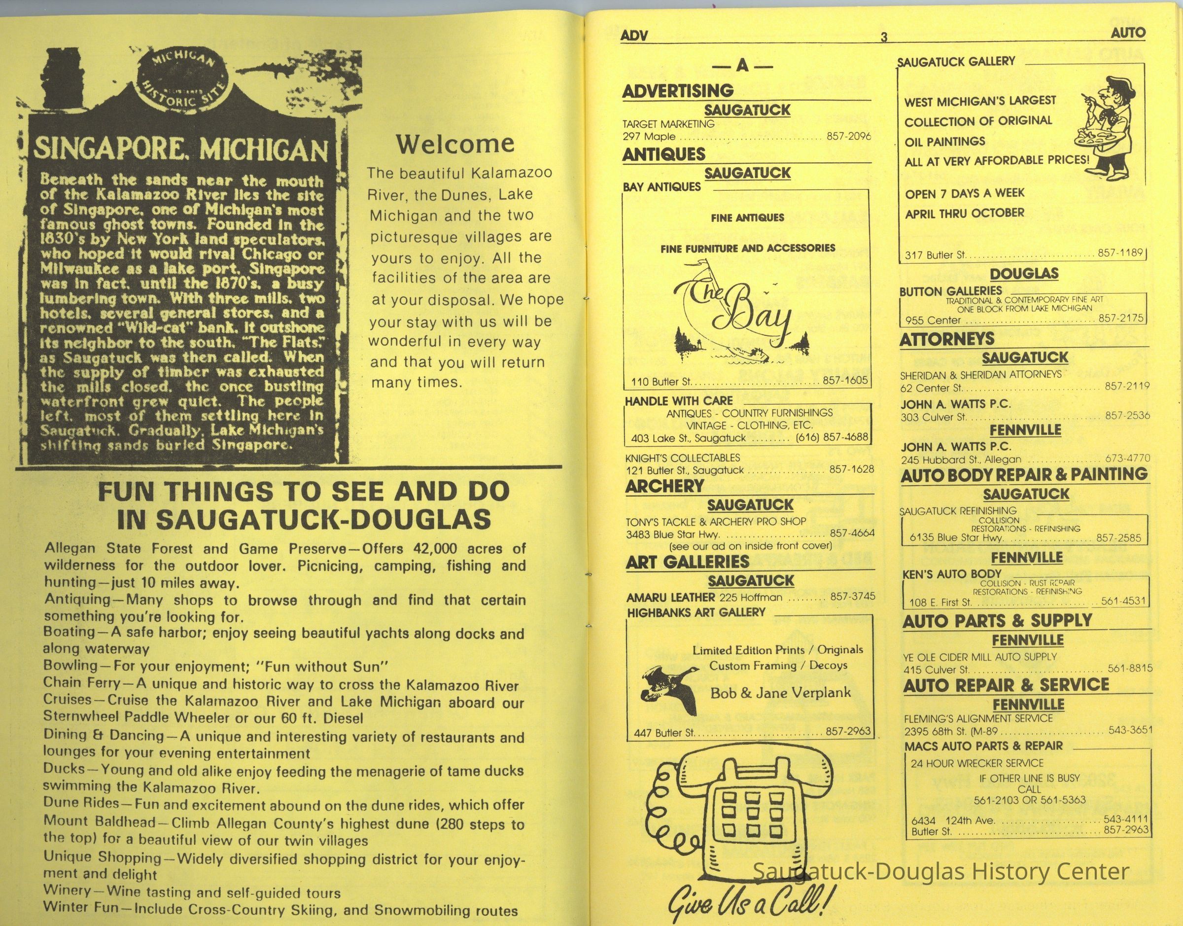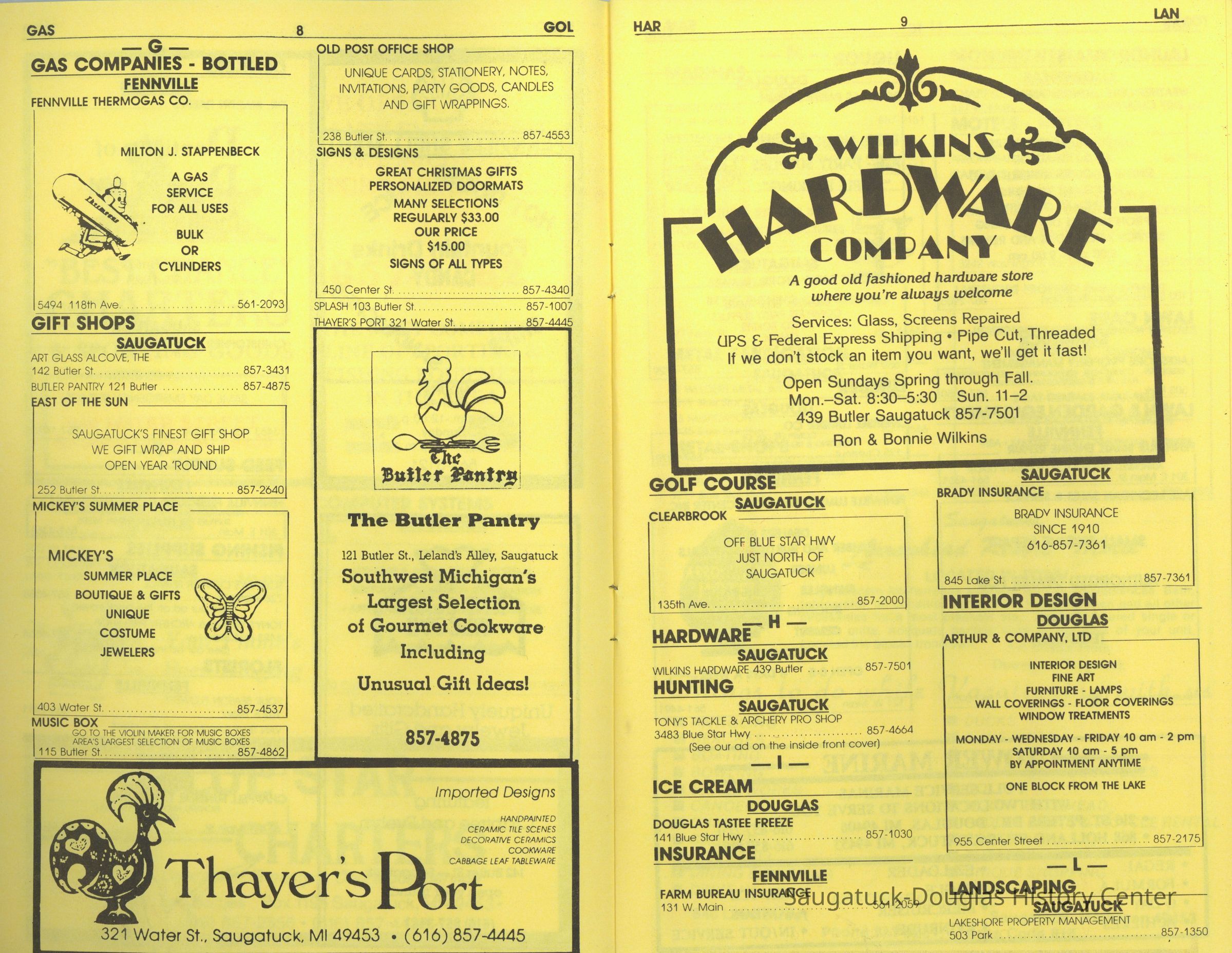 Blue Star Barns/Amsterdam/Tony's Tackle110 Butler St./Urban Found/Bay Building/Redebaugh homeHandled with CareAmaru Leather447 Butler/Inn of Saugatuck/Victorian Inn/Highbanks Art Gallery/John Koning homeButton Gallery & Home/Tews' GardensHotel Saugatuck/900 Lake/Twin Gables Hotel/Singapore Country Inn48 W Center/Respite Cappuccino Court/Mr. Miller's Art Emporium/Norton Drug StoreWild Dog/Copper Grille/Douglas Bakery229 Center/Alley's Lakeview Lanes/Collins' Community Lanes BowlingSaugatuck RV Resort/West Wind KOA/West Wind Cottages236 Culver/Coast 236/Hercules/Loaf and Mug/Simonson Studio #1Viola Fox Building/103-107 Butler/Leland Lodge/S.A. Morrison home 1850-1978640 Water/Big Lake Outfitters/Best Chance Charters142 Butler/Lucia's/Art Glass Alcove/Curious Cove/Green Parrot Cafe/Sorenson BuildingRaebel, MartinWiley, Christopher B.439 Butler/Butler Pantry/Wilkins/Koning/Nies Hardware252 Butler/Tuck's Pandora Christmas Shop/East of the Sun/Cabin Tavern/Walz's Butcher Shop/Nichols Bldg.115 Butler/Beach Day/MI Coast/Music Box/John Ball's Restaurant/Niles Jewelery 1910321 Water St./Saugatuck Tea Party/Tuscan Pot/Kleeman's TavernClearbrook Golf Club/Hamilton Lake Club/Saugatuck Golf ClubBlue Star Cafe/141 BSHwy/M&M's/Tastee-TreetBrady/L.R. Brady Insurance Company216 St Peter's Dr./Safe Harbor/Tower Marina/Capt. Hamilton House650 Water/Saugataco/River Market/Gleason's Party Store840 Lake/Arrowhead Resort310 Butler/Fenn Valley Tasting Room/Consumers Power/Village News & Tobacco428 Butler/Maplewood Hotel b.1860/facade 1923645 Water/Ida Red's Cottage/Diepenhorst fish marketEveryday People Cafe/11W Center/Douglas Dinette/Walz or Waltz Meat MarketCafe Sir DouglasTara Restaurant/Spencer House/200 Center141 Butler/Sand Bar Saloon/Edson Crow Barbershop & Billiard ParlorSpectators/Skyline241 Butler/Momentum/Brigadoon