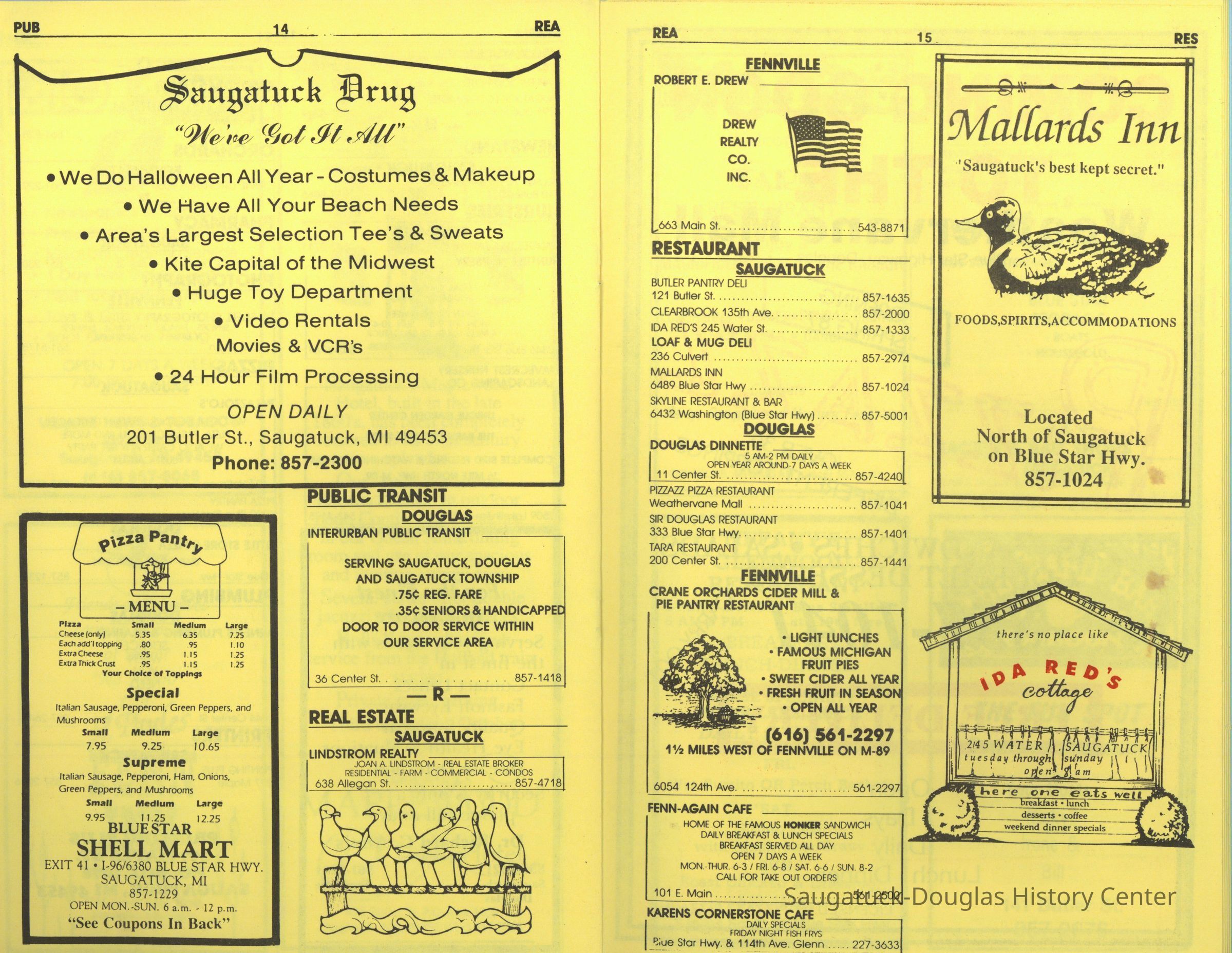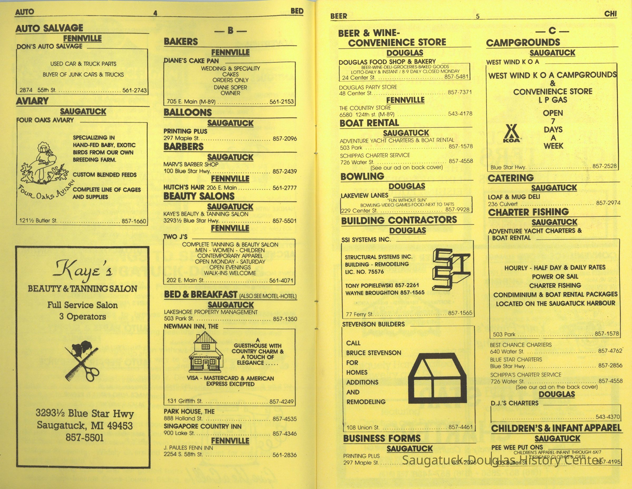 Blue Star Barns/Amsterdam/Tony's Tackle110 Butler St./Urban Found/Bay Building/Redebaugh homeHandled with CareAmaru Leather447 Butler/Inn of Saugatuck/Victorian Inn/Highbanks Art Gallery/John Koning homeButton Gallery & Home/Tews' GardensHotel Saugatuck/900 Lake/Twin Gables Hotel/Singapore Country Inn48 W Center/Respite Cappuccino Court/Mr. Miller's Art Emporium/Norton Drug StoreWild Dog/Copper Grille/Douglas BakeryAlley's Lakeview Lanes/Collins' Community Lanes BowlingSaugatuck RV Resort/West Wind KOA/West Wind Cottages236 Culver/Coast 236/Hercules/Loaf and Mug/Simonson Studio #1Viola Fox Building/103-107 Butler/Leland Lodge/S.A. Morrison home 1850-1978Big Lake Outfitters/Best Chance Charters142 Butler/Art Glass Alcove/Curious Cove/Green Parrot Cafe/Sorenson BuildingRaebel, MartinWiley, Christopher B.439 Butler/Butler Pantry/Wilkins/Koning/Nies HardwareTuck's Pandora Christmas Shop/252 Butler/East of the Sun/Cabin Tavern/Walz's Butcher Shop/Nichols Bldg.115 Butler/Beach Day/MI Coast/Music Box/John Ball's Restaurant/Niles Jewelery 1910321 Water St./Saugatuck Tea Party/Tuscan Pot/Kleeman's TavernClearbrook Golf Club/Hamilton Lake Club/Saugatuck Golf ClubBlue Star Cafe/141 BSHwy/M&M's/Tastee-TreetBrady/L.R. Brady Insurance Company216 St Peter's Dr./Safe Harbor/Tower Marina/Capt. Hamilton HouseSaugataco/River Market/Gleason's Party Store/Best Chance Charters840 Lake/Arrowhead Resort310 Butler/Fenn Valley Tasting Room/Consumers Power/Village News & Tobacco428 Butler/Maplewood Hotel b.1860/facade 1923Ida Red's Cottage/Diepenhorst fish marketEveryday People Cafe/11W Center/Douglas Dinette/Walz or Waltz Meat MarketCafe Sir DouglasTara Restaurant/Spencer House/200 Center141 Butler/Sand Bar Saloon/Edson Crow Barbershop & Billiard ParlorSpectators/Skyline241 Butler/Momentum/Brigadoon