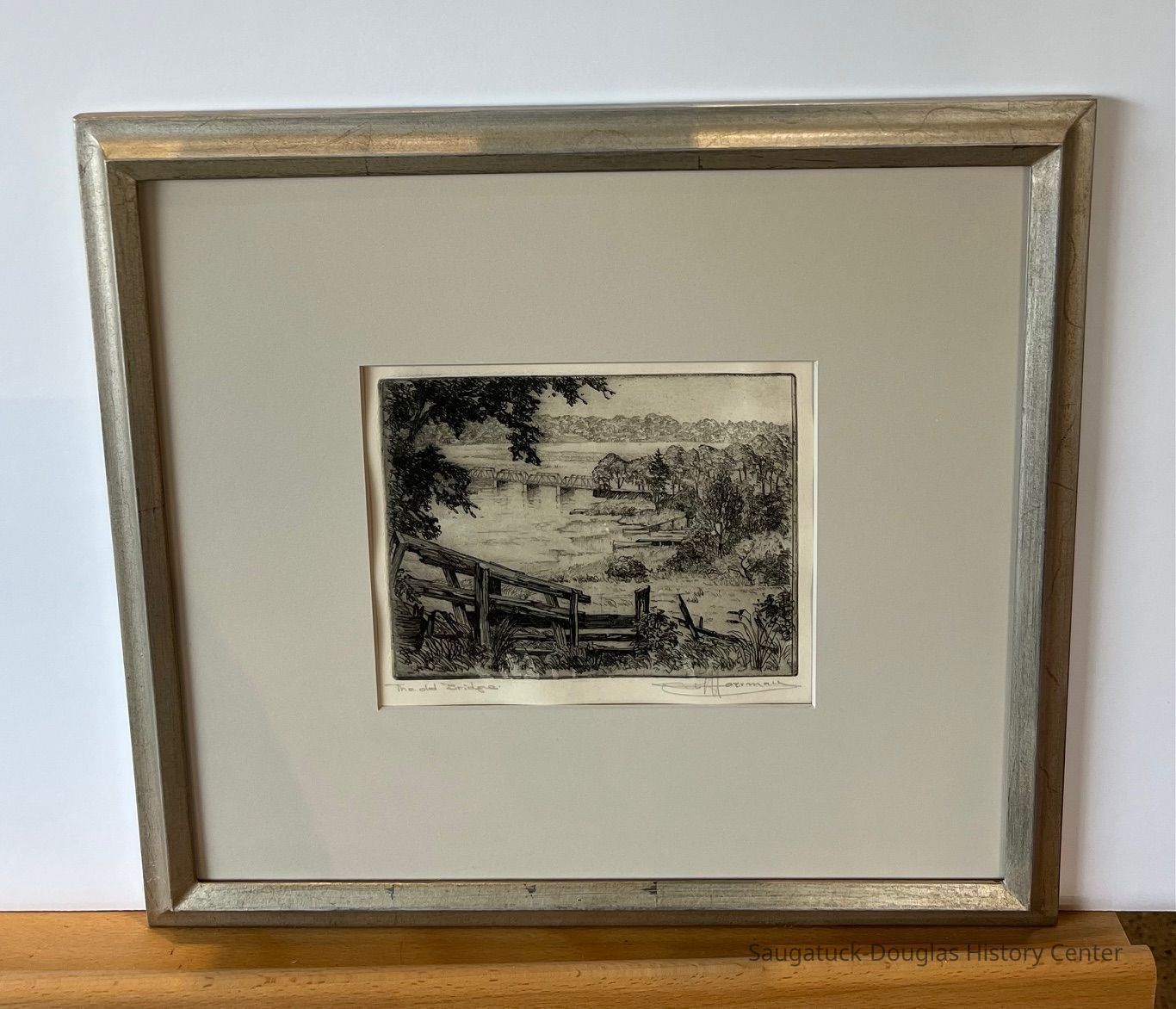 In the foreground, dilapidated timbers. In the distance a wide lake crossed by a truss bridge. The scene may be the causeway and truss bridge, that along with an island and a swing bridge, crossed the Kalamazoo between Saugatuck and Douglas.