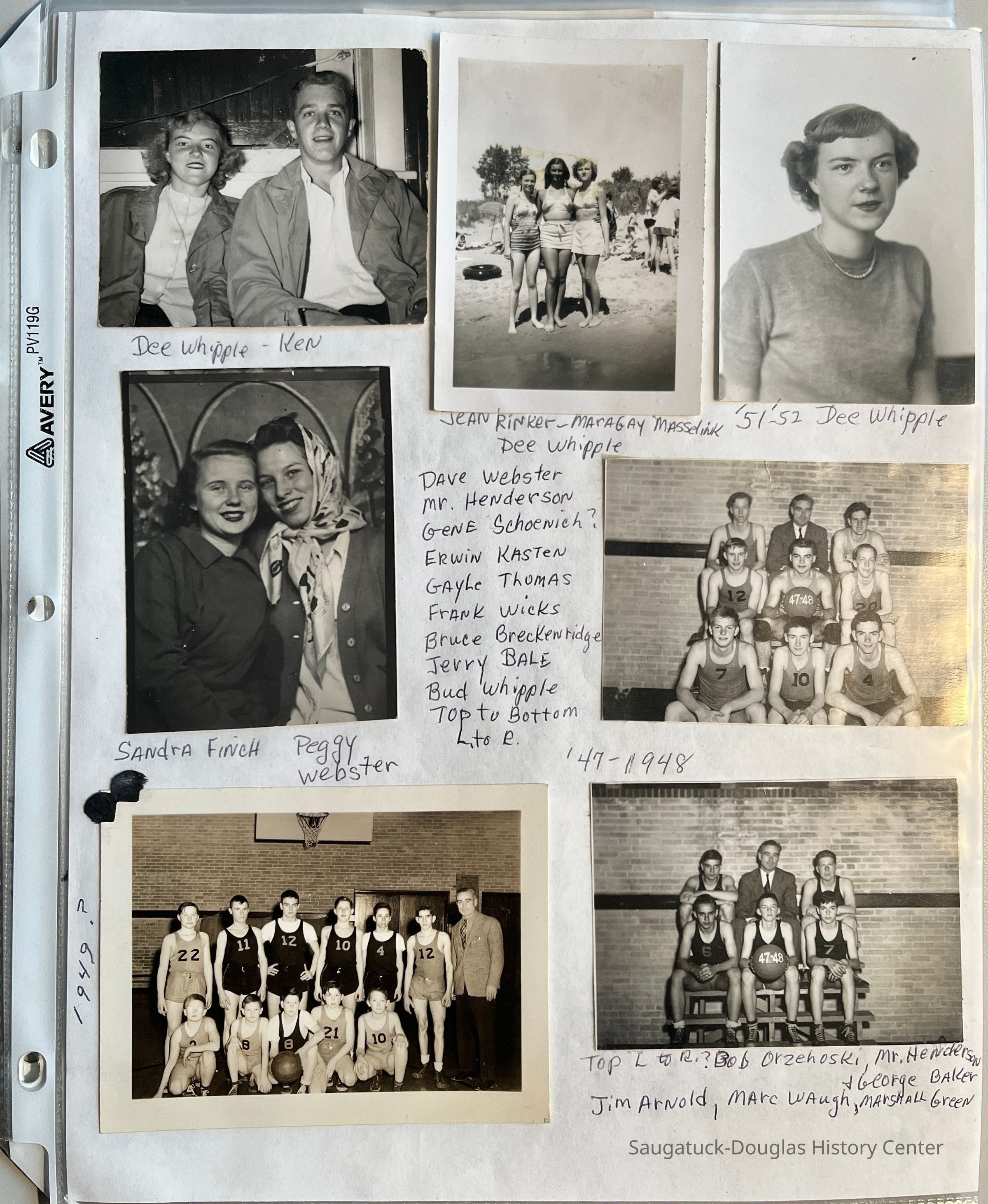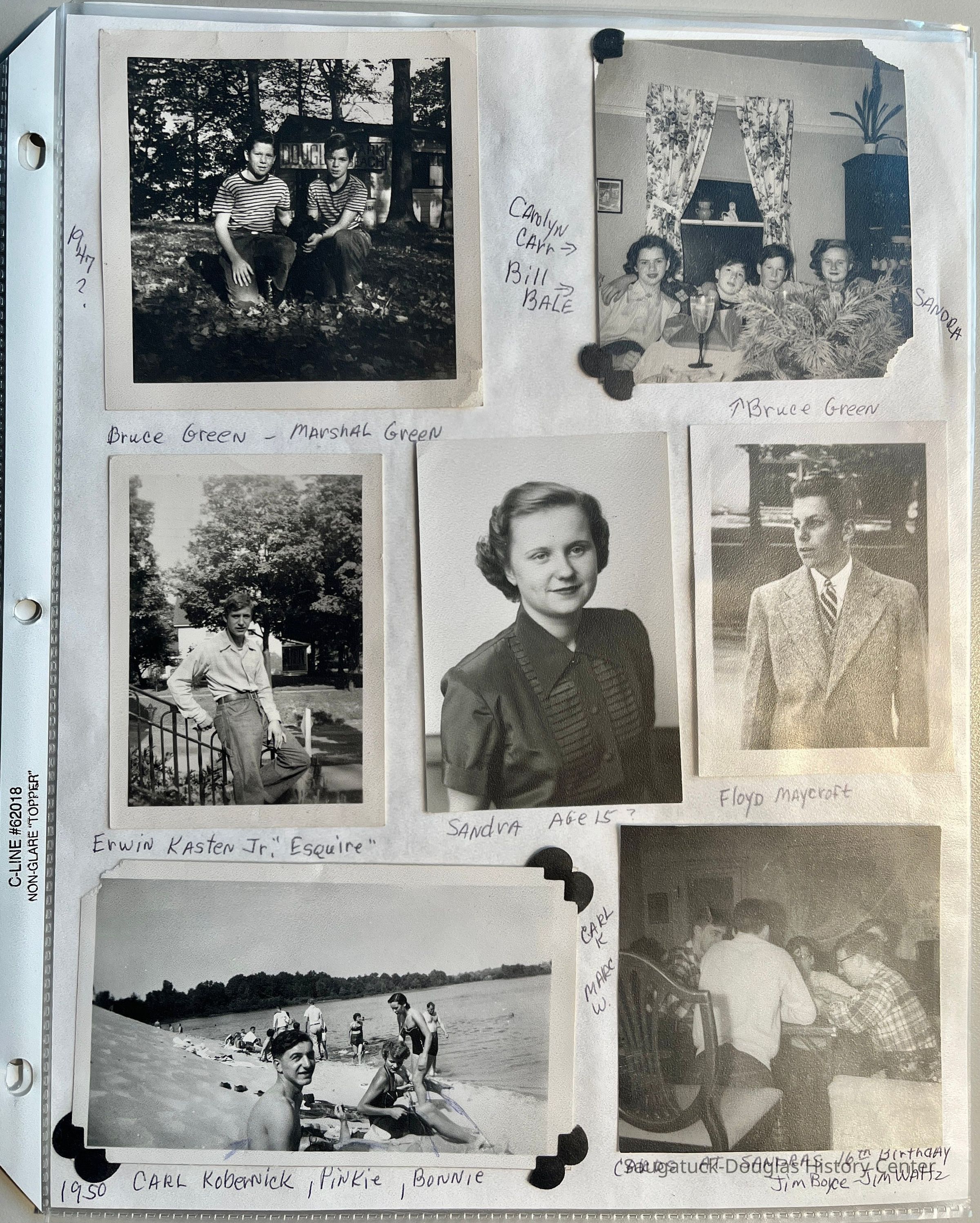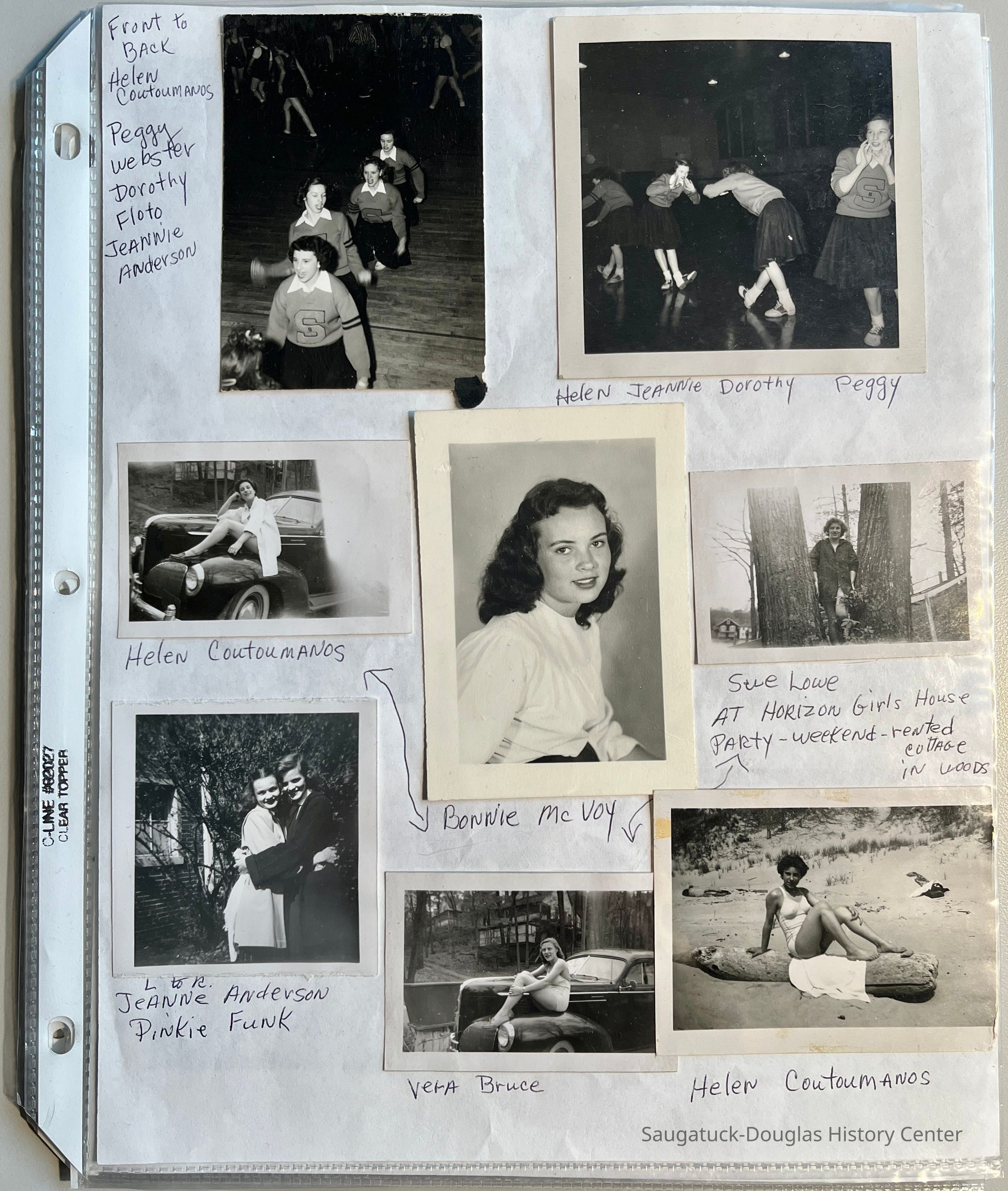 Photographs of school friends collected by Sandra (Finch) Edson, then known as Sandra Finch. The photos are taped to six sheets of white paper and slid inside plastic sleeves. The names or notes about the people pictured are handwritten on the paper. Many photos are dated from the late 1940s to the early 1950s and show students born in the 1930s. The photos are posed, seated portraits or casual snapshots of teens at the beach, picnicking, sitting or leaning on cars, playing cards at a birthday party, cheerleaders cheering, and basketball teams or groups of students lined up.