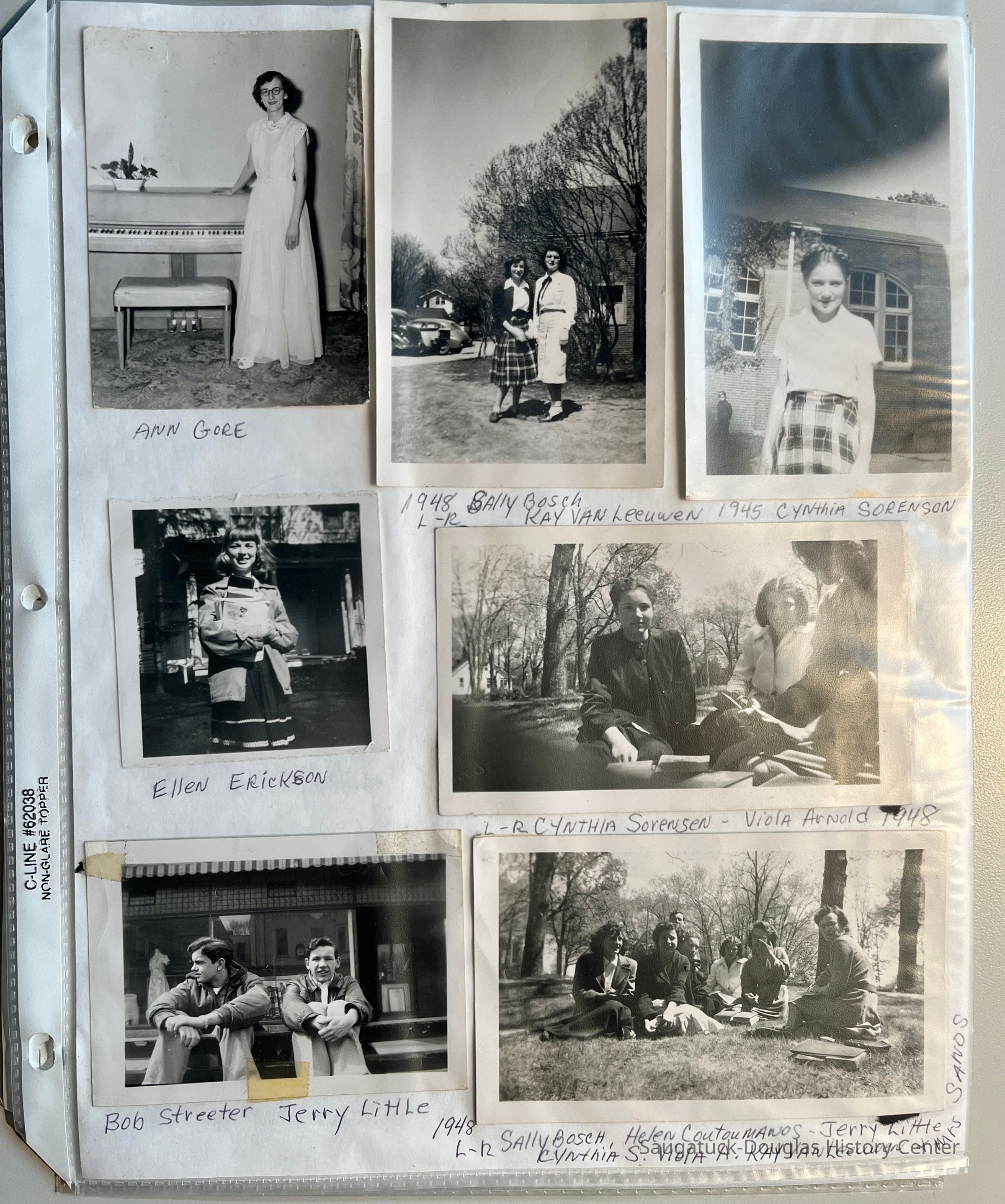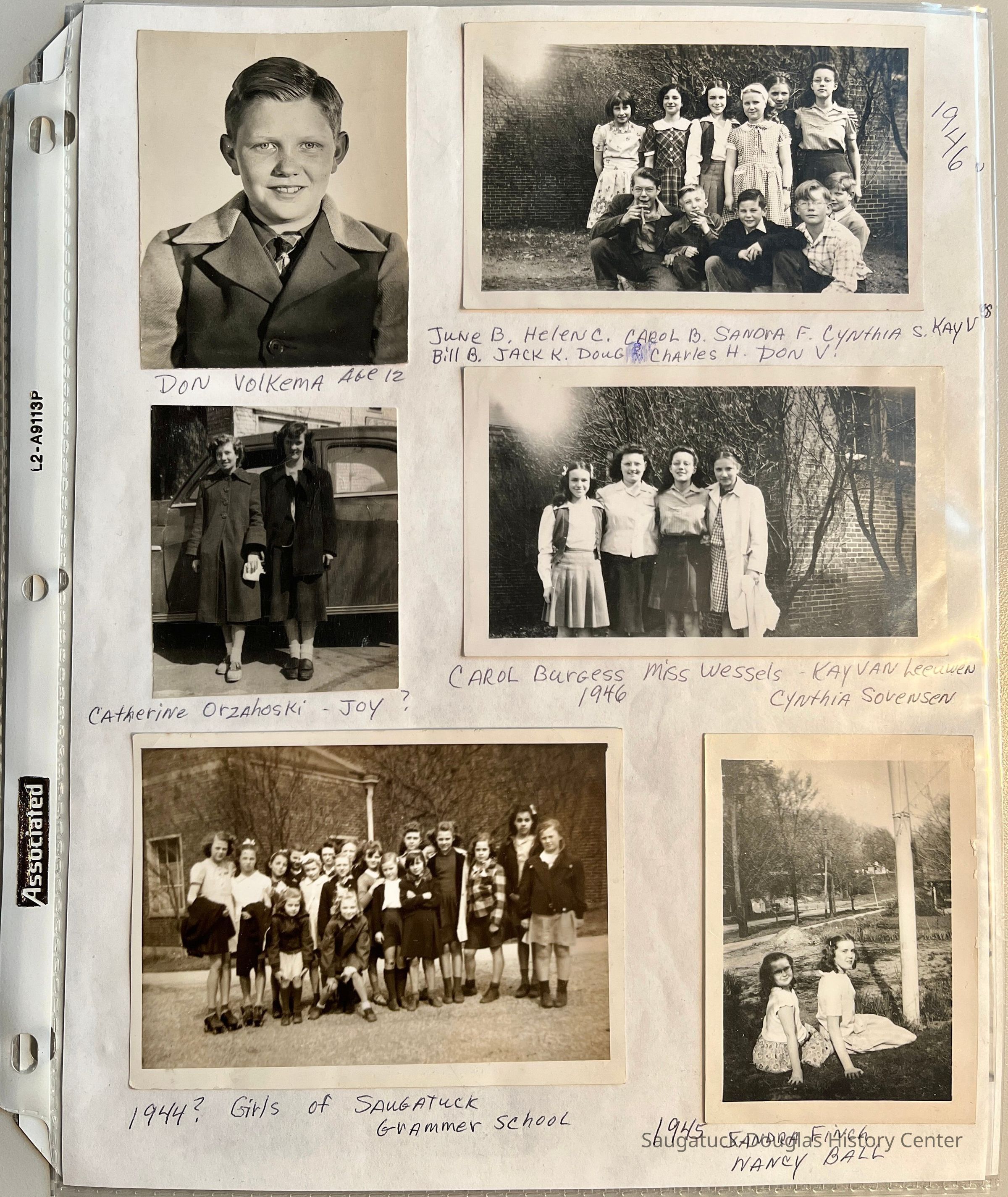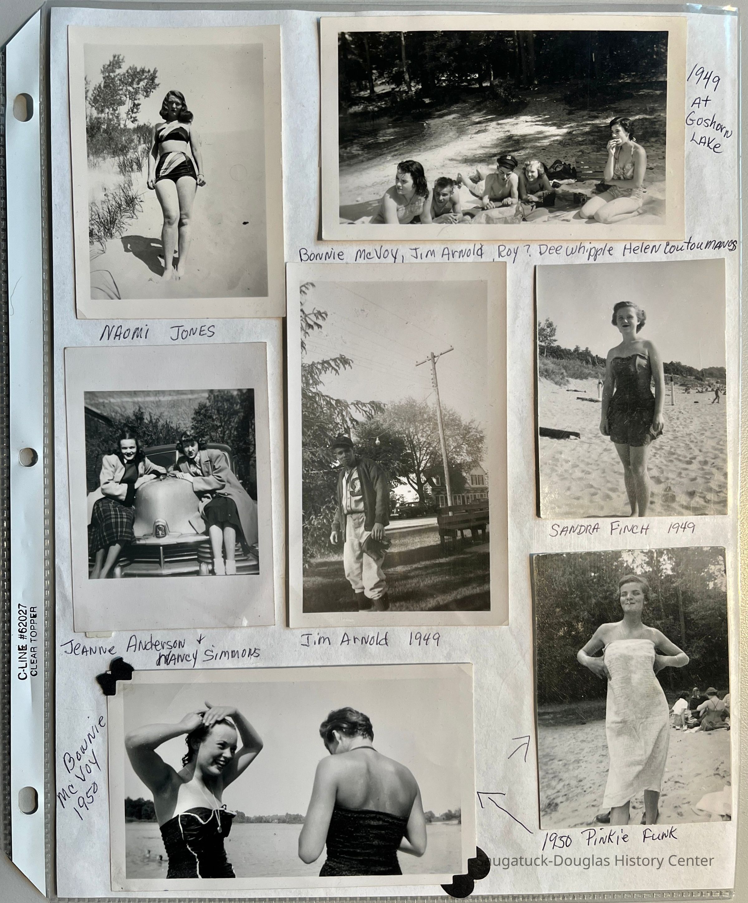 Photographs of school friends collected by Sandra (Finch) Edson, then known as Sandra Finch. The photos are taped to six sheets of white paper and slid inside plastic sleeves. The names or notes about the people pictured are handwritten on the paper. Many photos are dated from the late 1940s to the early 1950s and show students born in the 1930s. The photos are posed, seated portraits or casual snapshots of teens at the beach, picnicking, sitting or leaning on cars, playing cards at a birthday party, cheerleaders cheering, and basketball teams or groups of students lined up.