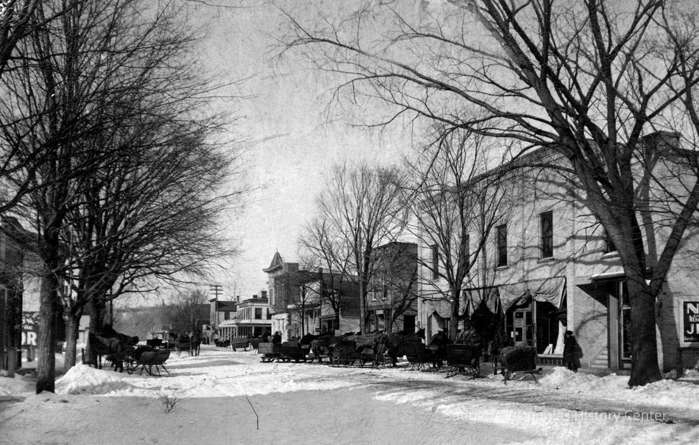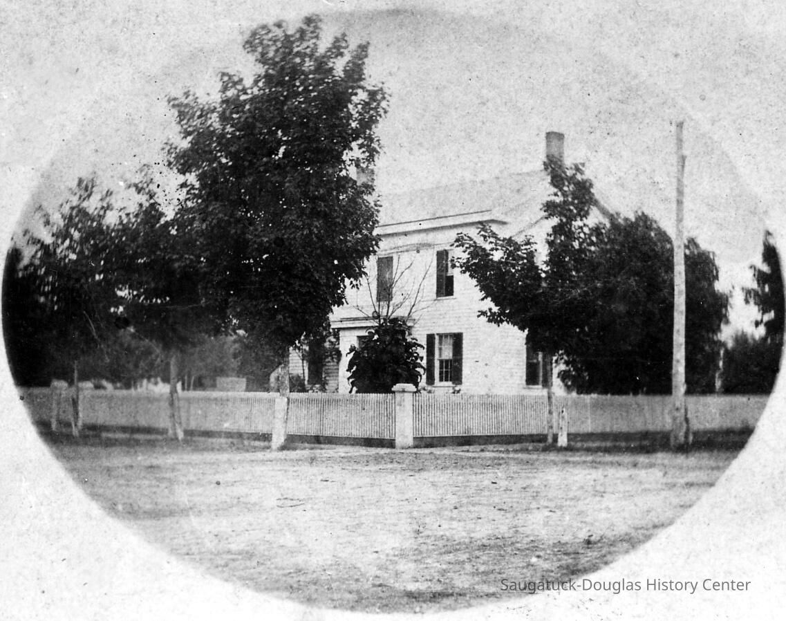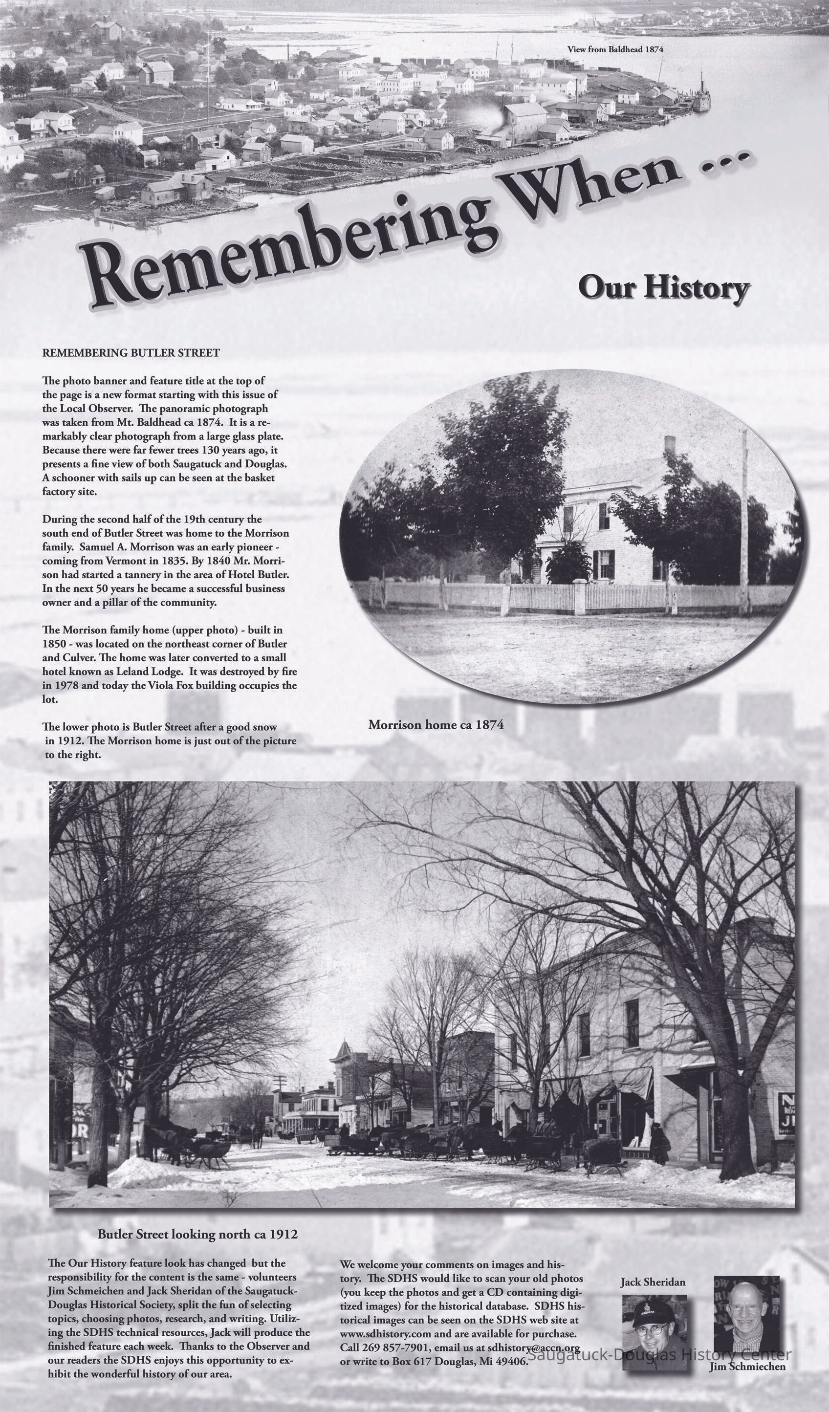 REMEMBERING BUTLER STREET The photo banner and feature title at the top of the page is the new look starting with this issue of the Local Observer. The panoramic photograph was taken from Mt. Baldhead about 1874. It is a remarkably clear photograph from a large glass plate. Because there were far fewer trees 130 years ago, it presents a fine view of both Saugatuck and Douglas. A schooner with sails up can be seen at the basket factory site. During the second half of the 19th century the south end of Butler Street was home to the Morrison family. Samuel A. Morrison [sic - Stephen] was one of the early Saugatuck area pioneers –coming from Vermont in 1835. In 1840 Mr. Morrison started a tannery in the area where Hotel Butler stands today. In the next fifty years he became a successful business owner and a pillar of the community. The Morrison family home (upper photo) - built in 1850 - was located on the southeast corner of Butler and Culver across from the Saugatuck Village Hall. The home was later converted to a small hotel known as Leland Lodge. It was destroyed by fire in 1978 and is today the site of the Viola Fox building. The lower photo reveals Butler Street after a good snow about 1912. The Morrison home is just out of the picture on the right. The OUR HISTORY feature look has changed but the responsibility for the content has not changed - volunteers Jim Schmiechen and Jack Sheridan of the Saugatuck-Douglas Historical Society, split the work of selecting topics, choosing photos, researching and writing. Utilizing the SDHS technical resources, Jack will produce the finished product each week. Thanks to the Local Observer and our readers the SDHS enjoys this opportunity to exhibit the wonderful history of our area.
