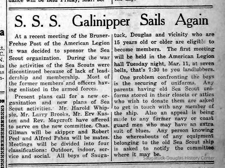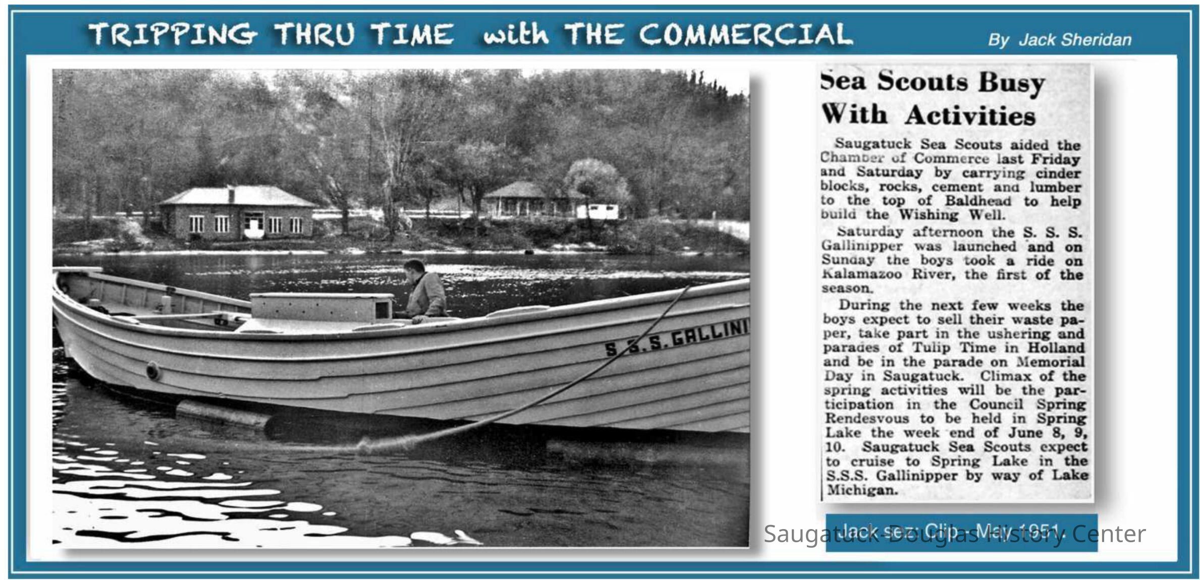 https://sdhistoricalsociety.org/Newsletter/2014/oct14/oct14_newsletter.htm Below is Frank Lovejoy’s description (and photos) of the Sea Scouts "wood" Gallinipper. Frank writes: I took these pictures (not sure of the date) in the mid 50's spring launch. In the pics are Charlie Gilman, our scout master, Stan Showers, in the white bucks, Guy Francis, whose parents owned the Francis Food Store, Frank Fiala at the bow of the boat and Don Kuehne in his runabout. Don's Mom owned a restaurant in Saugatuck. Other members not shown here were Ralph Birkholz, Ted Nielson, Mackie Clough, Pat Devine. During my time with the scouts, Charlie acquired a 20' sailboat from a person in Holland. The boat had broken its moorings, banged into a dock and caved in the port bow and snapped the mast. It was a fun learning project for our group. While some worked on restoring the hull, Ralph Birkholz and I were assigned to repair the mast. We contacted Mr. Forester who at the time worked a Chris Craft. We explained what our project was and in a few days we were called to his home to pick up a fabricated mast. It was in the rough. Four pieces of timber glued together that didn't look like a mast at all other than it was the correct length. After many hours of planning, sanding, sealing and varnishing the mast was stepped in the completely repaired hull. A job well done. Charlie spent many hours with the crew teaching us the fine points of sailing not to mention seamanship, boat handling and responsibility. I have no idea what happened to the sail boat. As for the Gallinipper? While I was in the Navy I heard that Charlie had decided for some reason to pull up the self baling decks and make some changes whatever they may have been I don't know.