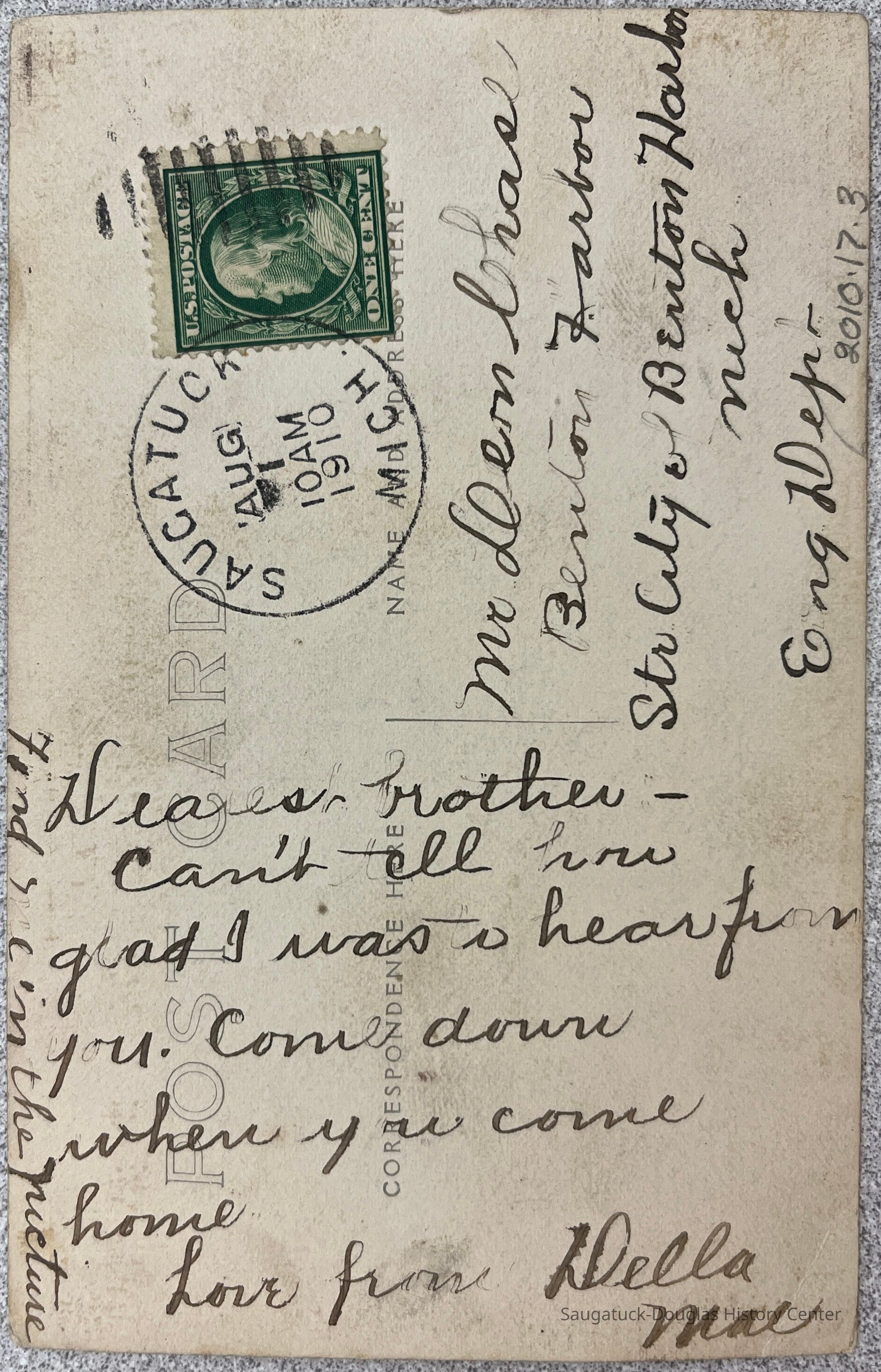 Postcard has been mailed and is postmarked Aug. 1, 1910.