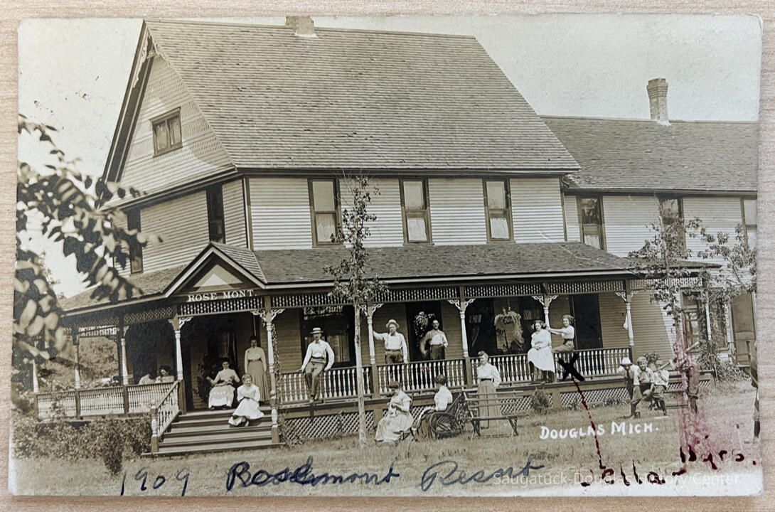 1909 Photograph of the Rosemont Resort on Lake Michigan in Douglas. People are shown on the porch including Della Mae Smith noted as 13 yrs old on front.