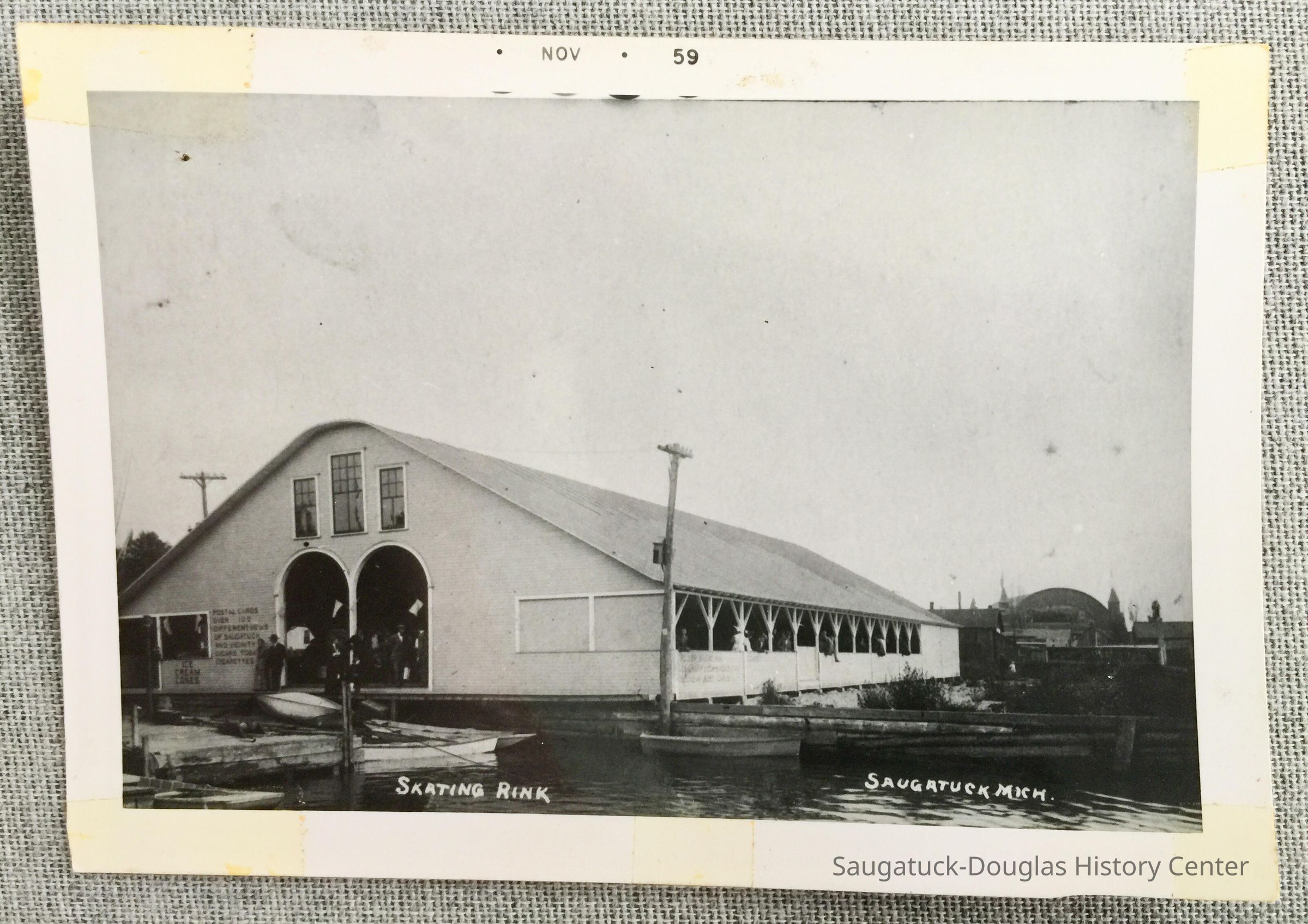 The Big Pavilion is visible in the background. Painted on the front of the building is "postal cards over 100 different views of Saugatuck and vicinity cigars Tobacco Cigarettes Ice Cream Cones."