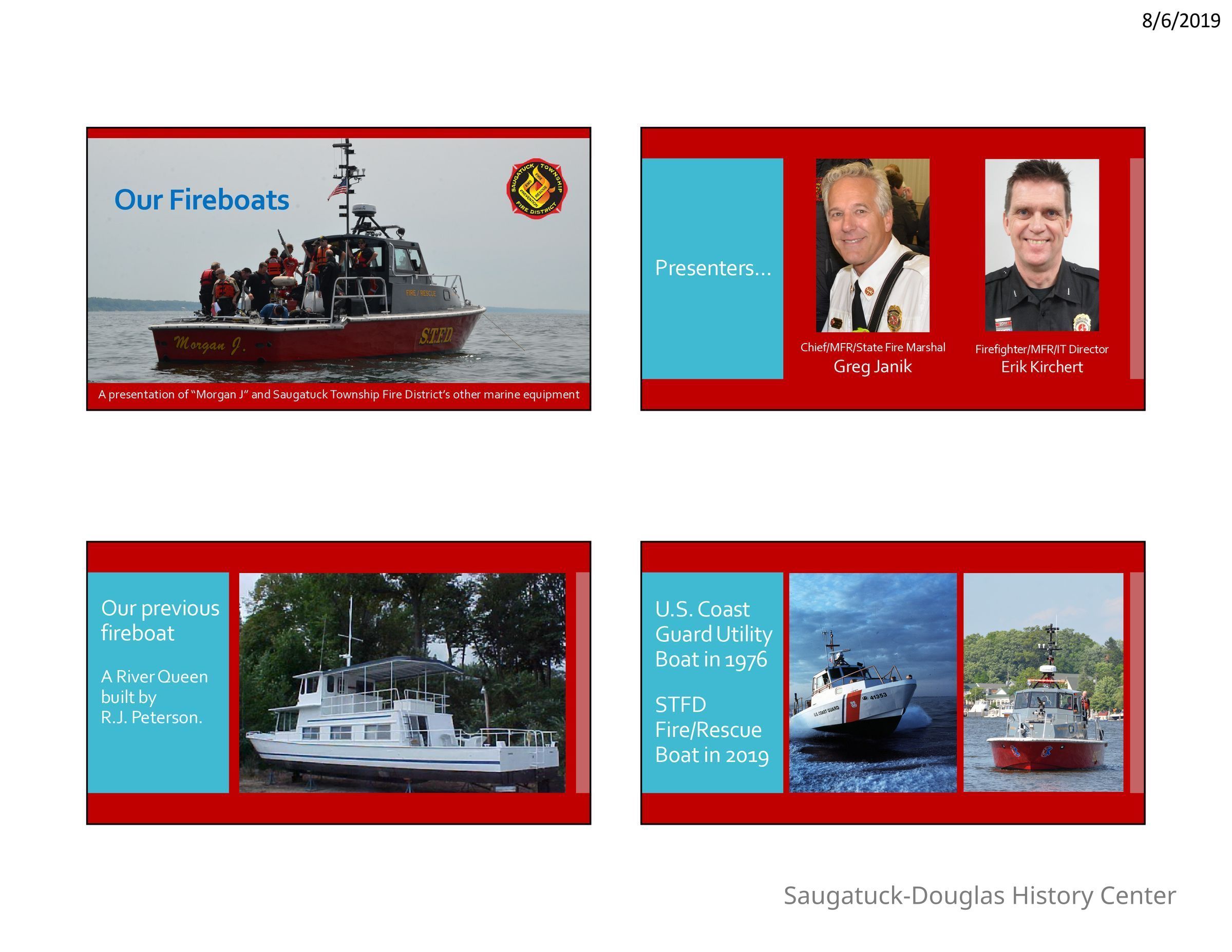 August 6, 2019 Saugatuck-Douglas History Center Tuesday Talk featuring Saugatuck Township Fire District [STFD] Chief Greg Janik and IT officer Erik Kirchert talking about the fire department's fleet of fire boats and how they are used with comparison to the recent fire at Paris' Notre Dame cathedral. Special attention given to the "Morgan J." named in honor long-time fire fighter and fire board member Morgan Edgcomb, Jr.