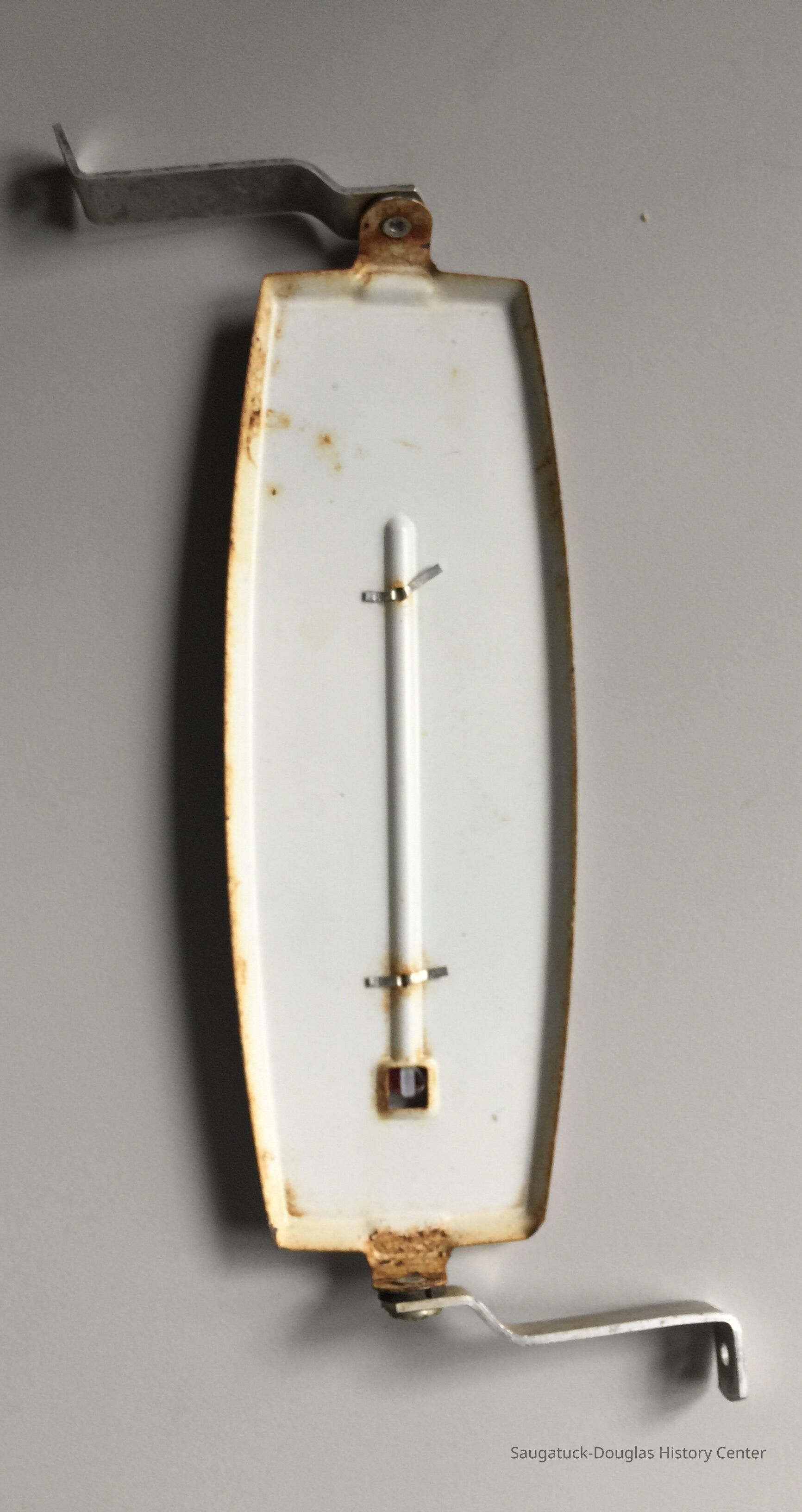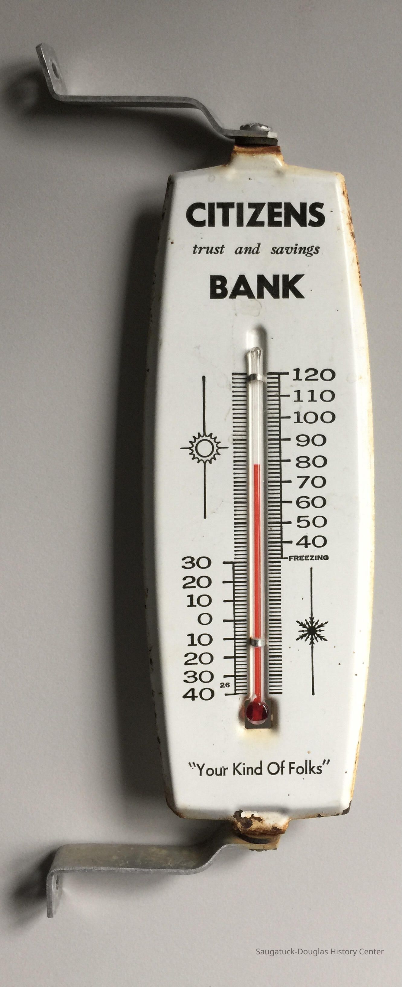 Branded metal thermometer with swiveling metal brackets for mounting outside a window to measure outdoor temprature. White stamped metal plate with black enamel printing of the degrees and the text "Citizens Bank trust and savings" and "Your Kind Of Folks" A mercury-type red fluid thermometer is strapped to the metal plate. Some rust and fading but generally in working condition. 26 degrees below zero is given special consideration on the degrees scale.