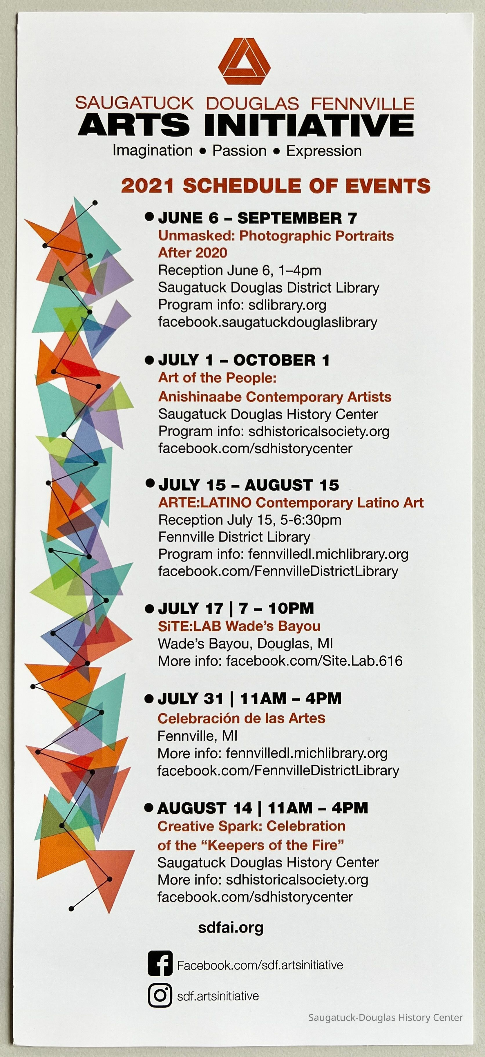 UNMASKED: PHOTOGRAPHIC PORTRAITS AFTER 2020 June 6-September 7 Saugatuck Douglas District Library Exhibit of cell phone portraits by community residents Programs: Demonstrations, Book Read, Classes, Movies, Artists/Local Photographers: Kim Zahnow, Scott Sullivan ART OF THE PEOPLE: CONTEMPORARY ANISHNAABE ARTISTS July 1- October 10 Saugatuck Douglas History Center Opening Reception July 1 Exhibit of works by 7 Anishnaabe artists Smaller version of exhibit from the Muskegon Museum of Art Coinciding with SDHC outdoor exhibit First Michiganders Programs: Tuesday Talks, Artist Demonstrations Artists: Annishnaabe Artists: Jason Quigno, Le’Ana Asher, Jason Wesaw, Shirley Bracker, Kelly Church, Adam Avery, Summer Peters CREATIVE SPARK: CELEBRATION OF THE “THREE FIRES” August 14th 11-4pm Saugatuck Douglas History Center Dancing and Music Loom Beading Quillwork Demo Native American Food Story telling (parables) Regalia display Vendors Black ash basket demonstration SiTE:LAB Critical Infracture/Challenge Privilege July 17th 7-10pm Wade’s Bayou. SiTE:LAB in partnership with Ox-Bow and the City of Douglas Poetry, Jazz, Hip hop and Cello performances Experimental design studio Artists:Paul Amenta, Kyd Kane, CC, Jordan Hamilton, SuperDre, Collab ARTE:LATINO July 15-August 15 Fennville District Library Opening July 15 Exhibit of Works by Contemporary Latino Artists Artists: Dante Rodriguez, Xavier Tavera, Robert de los Santos, and others CELEBRACION DE LAS ARTES July 31 11-4pm Fennville District Library
