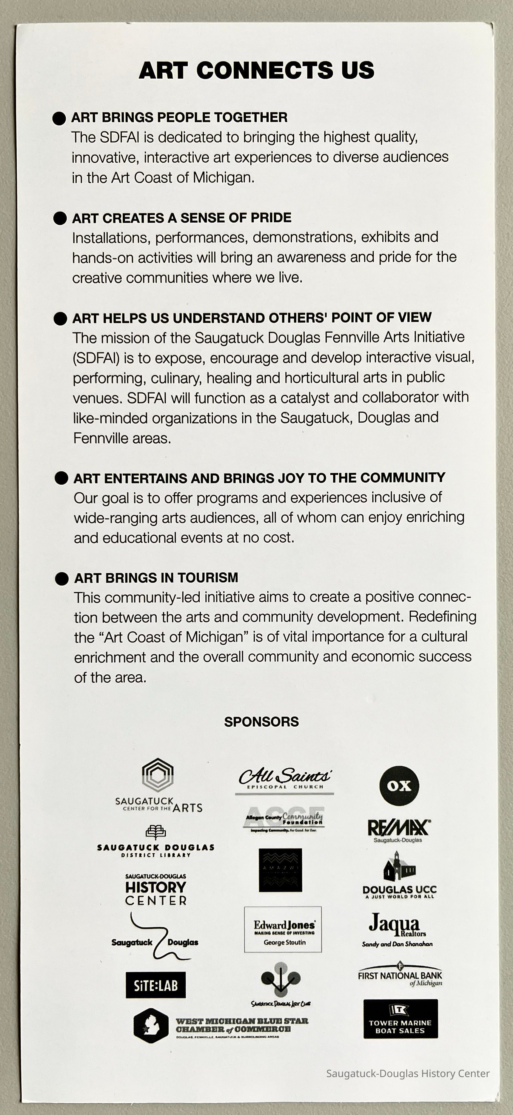 SDFAI was a short-lived non-profit, organized by Maryjo Lemanski, that sought to revitalize the Saugatuck-area's arts scene. Special attention was given to represent artists and citizens who may have not been well represented in the past.