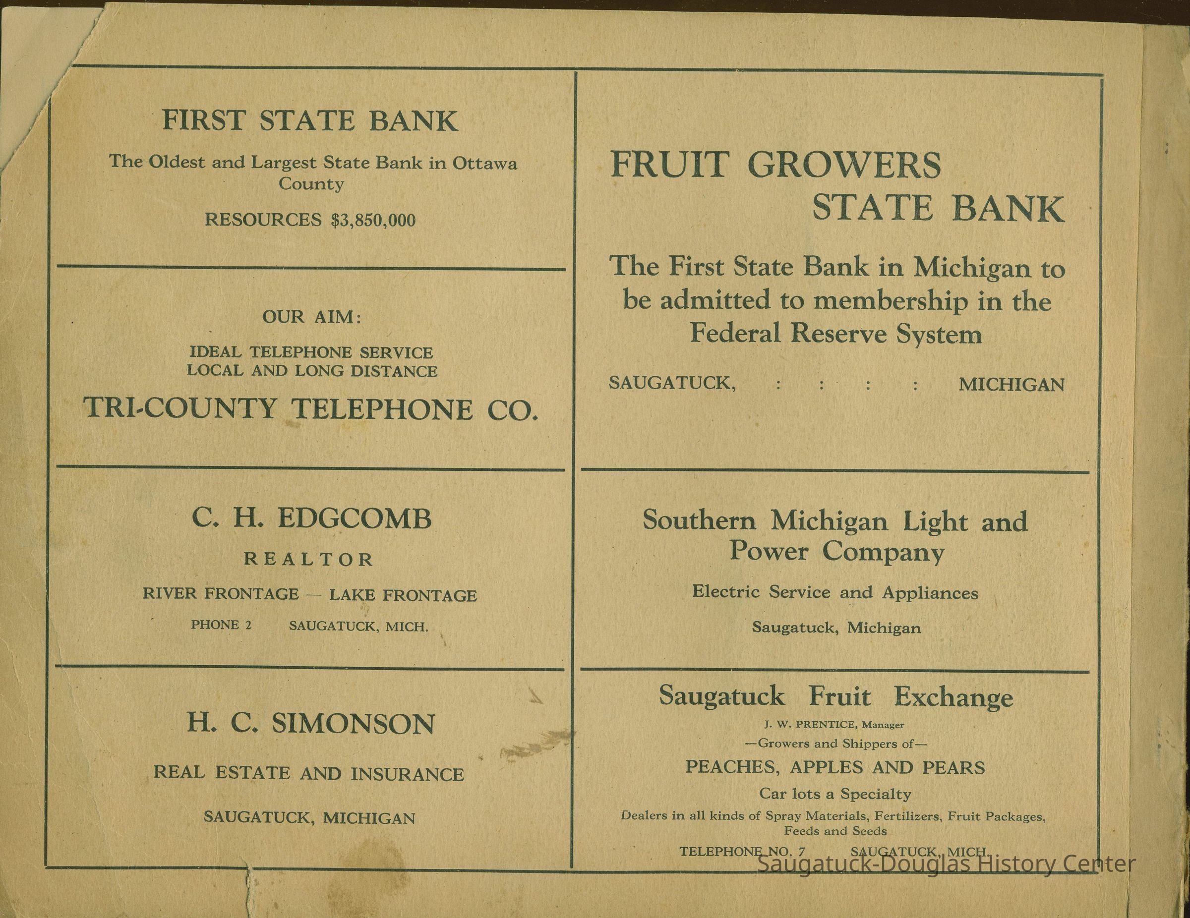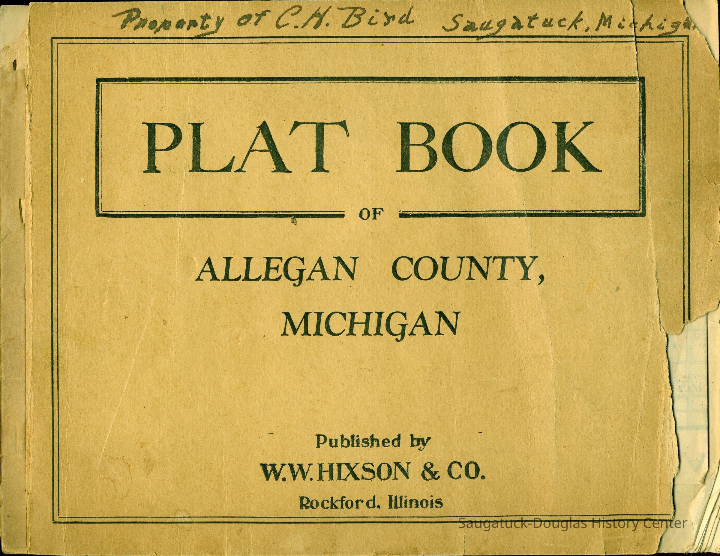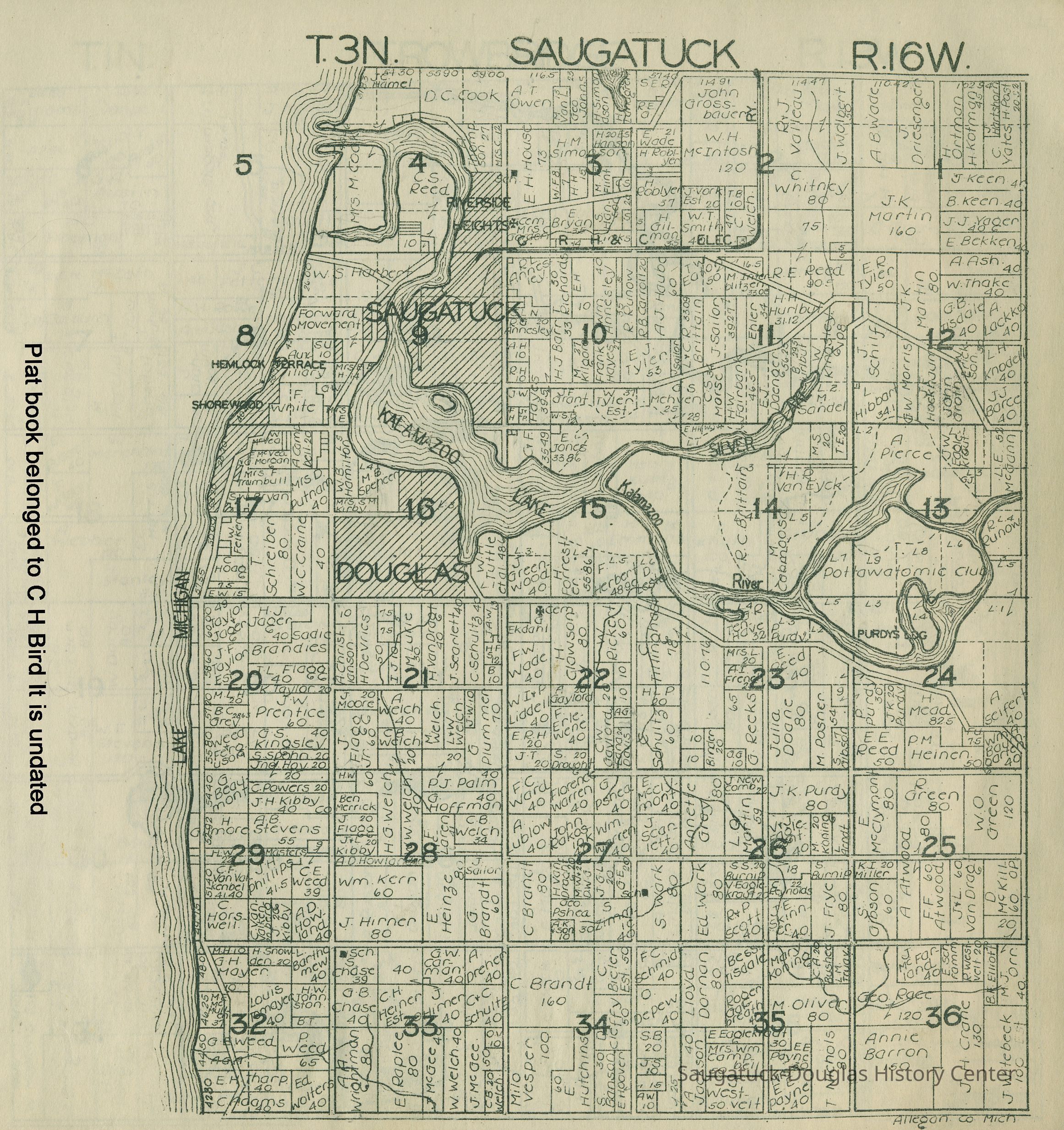 Scans of the cover and two pages from a plat book owned by Charles Bird that shows developments named Riverside Heights and Hemlock Terrace. The new Kalamazoo outlet is shown, as well as the lake shore properties annexed by Douglas. Other interesting details include the Interurban G.R.H. & C. Electric railroad tracks, Purdys Landing, Pottawatomie Club, Forward Movement, Cook, Putnam, McVea and Reed parcels. Schools, like Chase School, are shown as square blocks. Crosses indicated cemeteries.