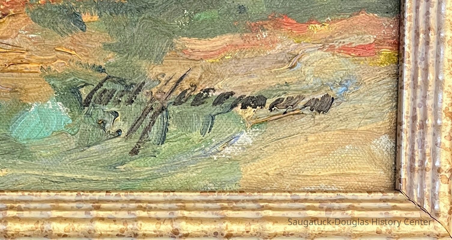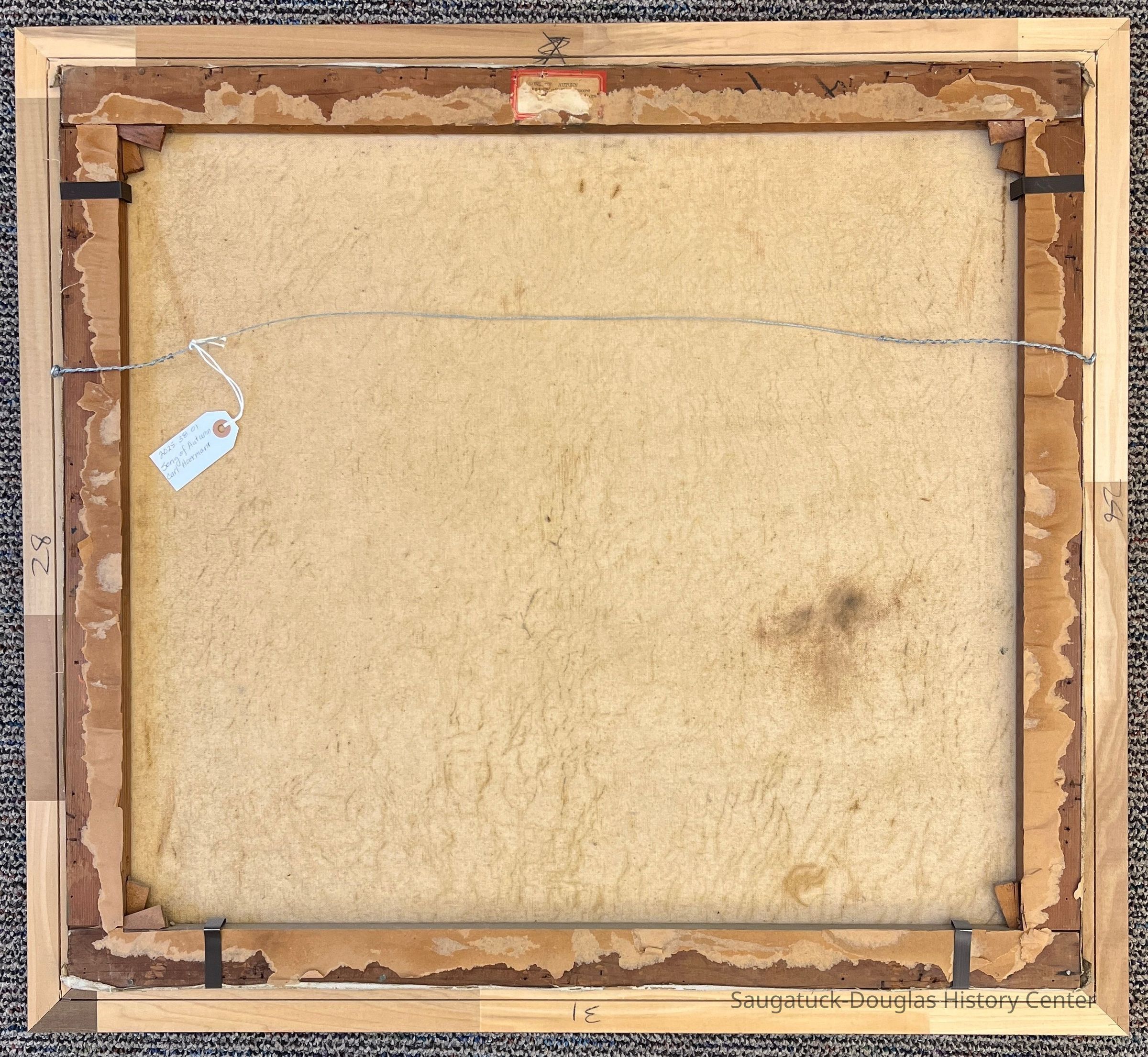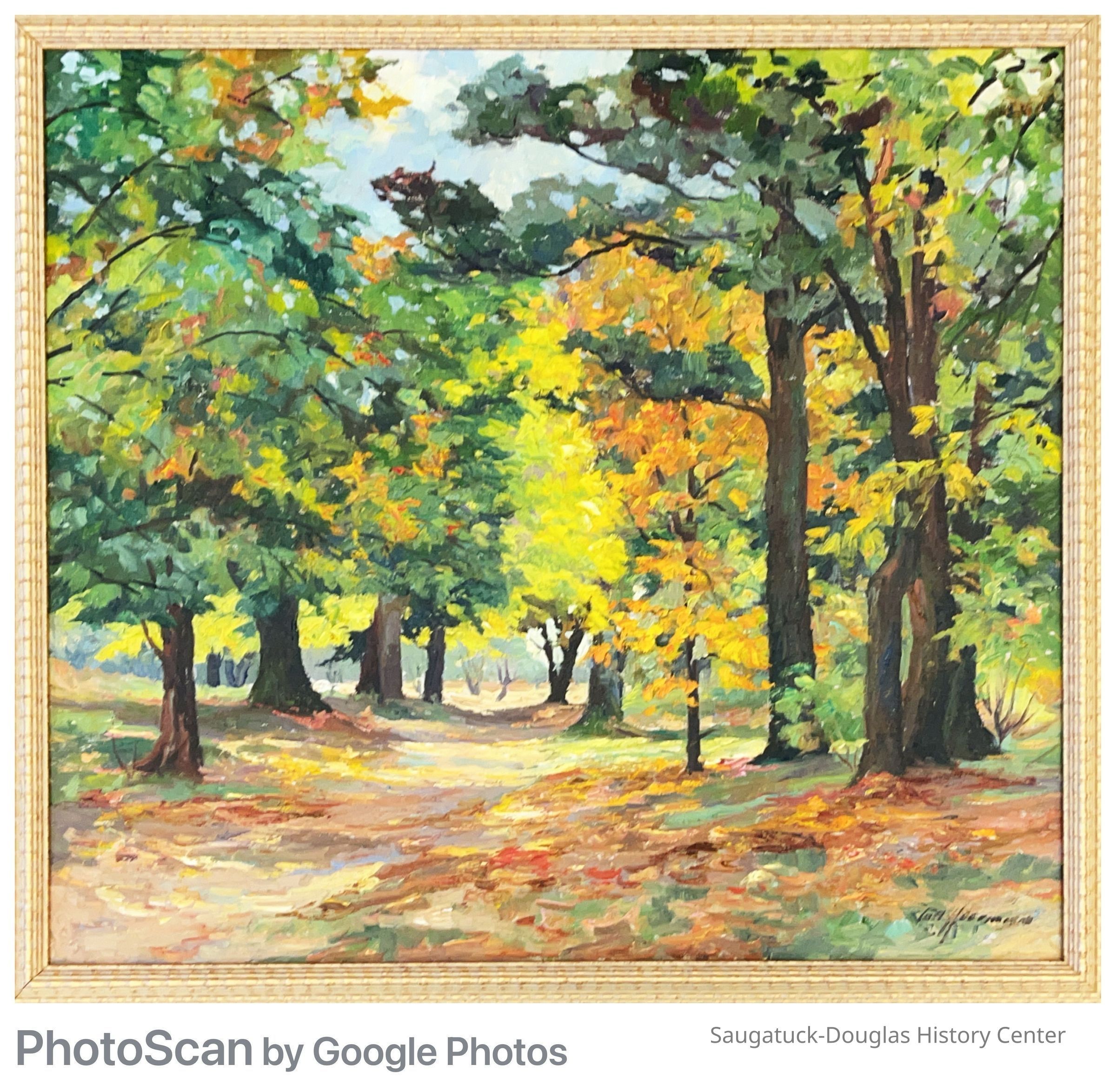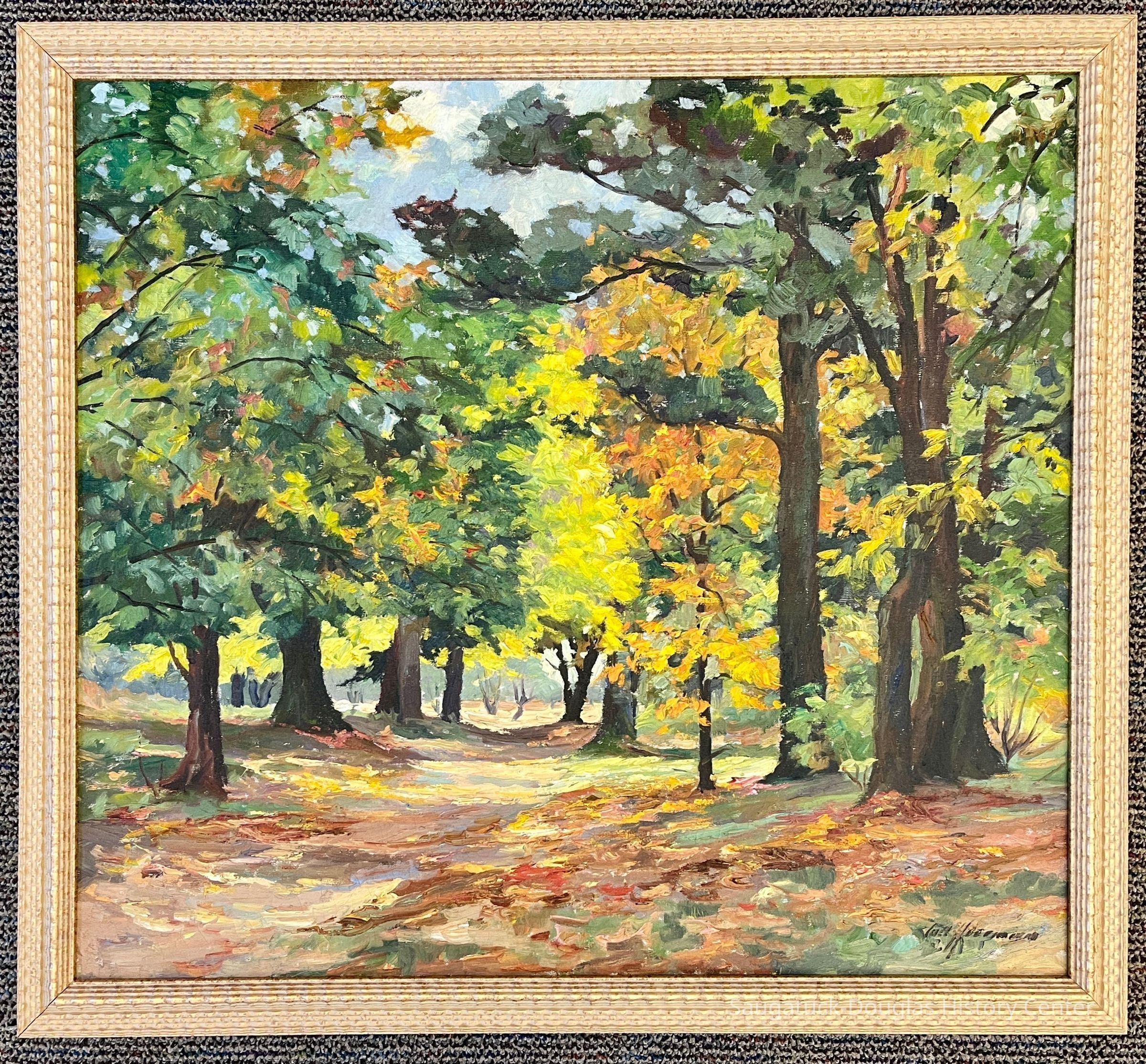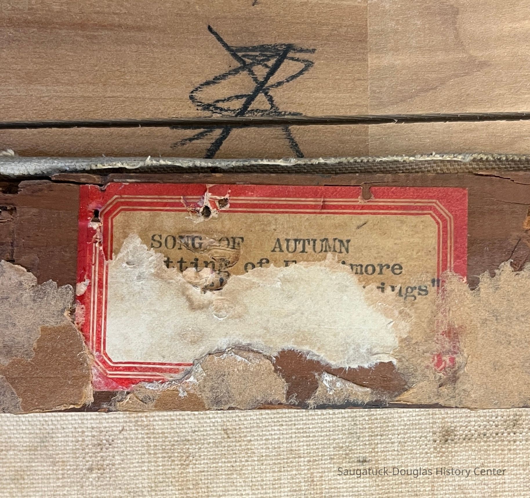 Landscape of trees with fall-colored leaves on the branches and on the ground. Framed with 1.75 inch textured beige and gold frame. A partial label on the back of the canvas stretcher indicates the title is "Song of Autumn."