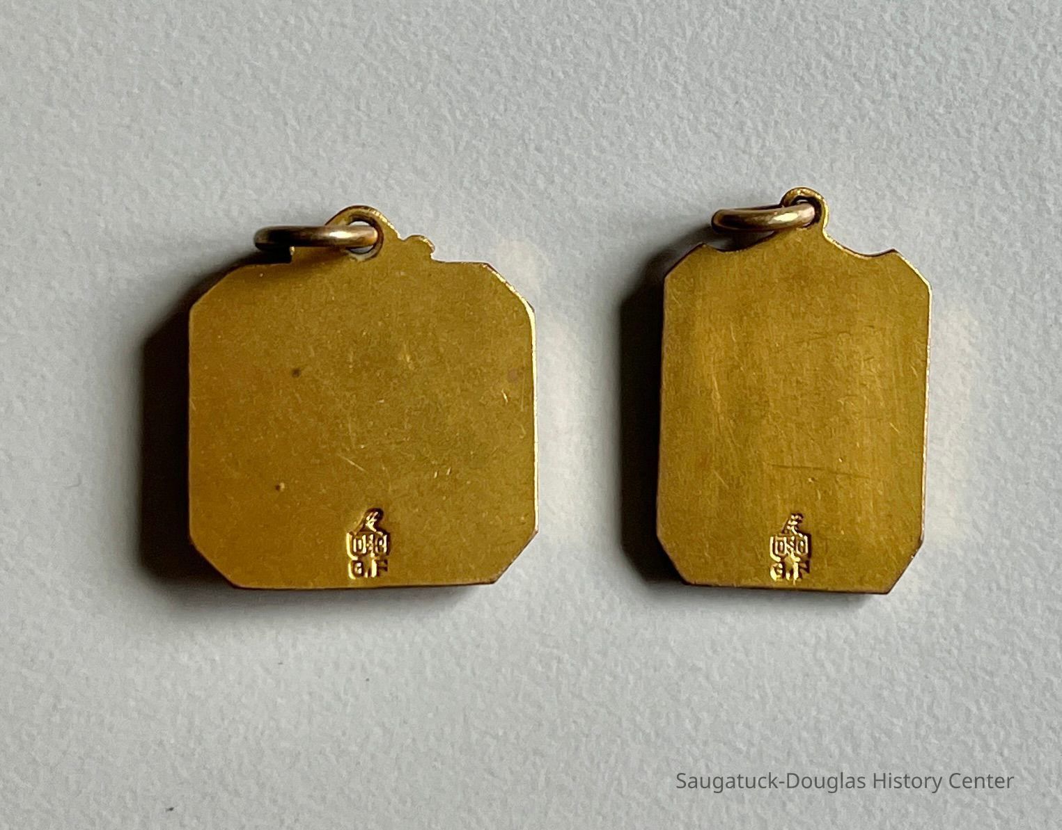 Both charms have gold-tone jump rings. The backs are blank except for a makers mark that reads "D&C/G.F."