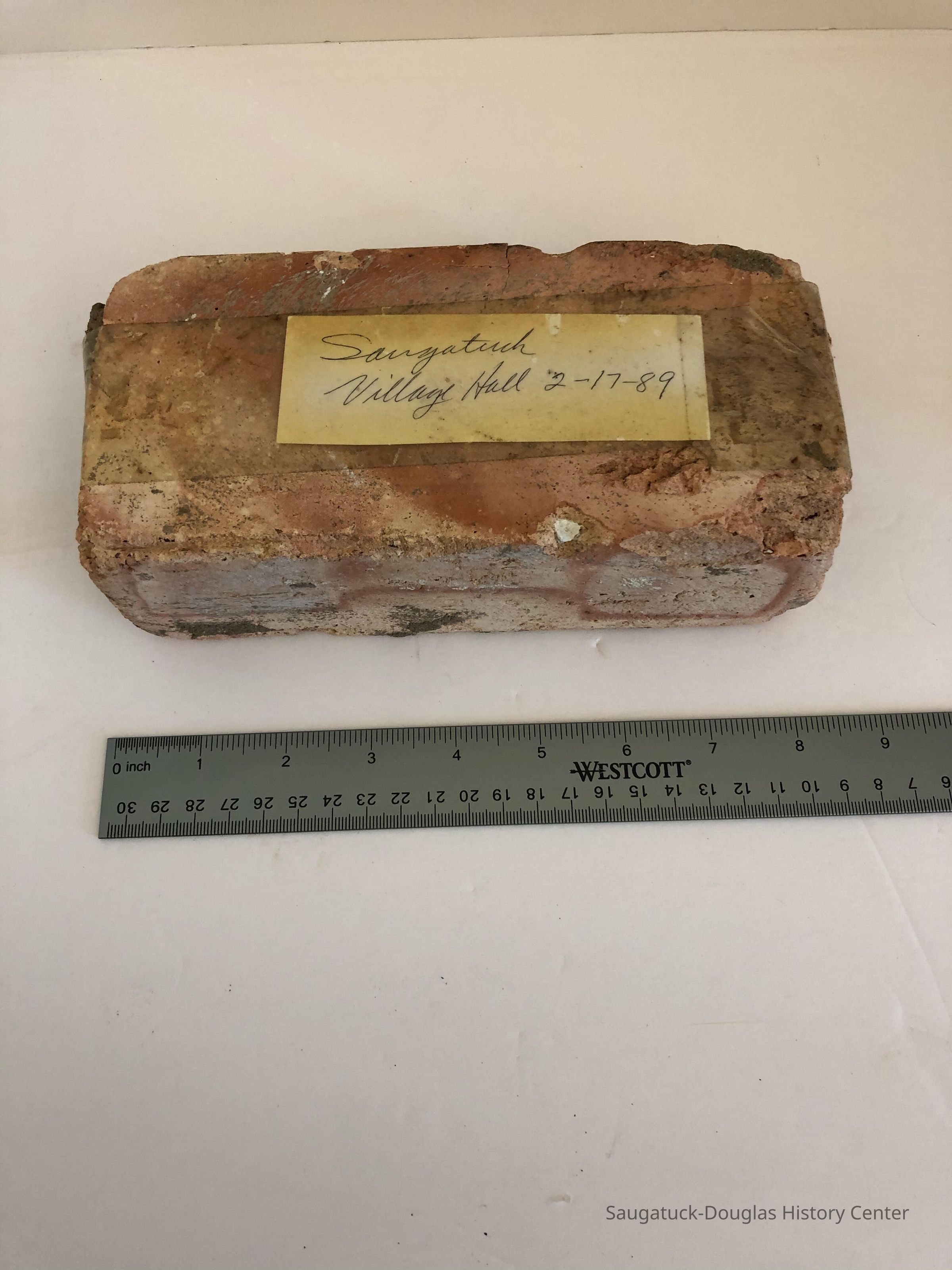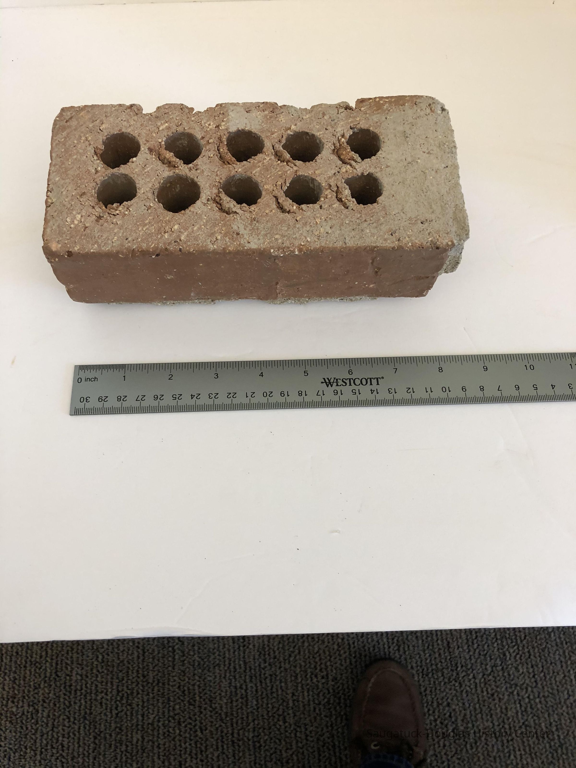 Two bricks. One brick with a paper label with writing "Saugatuck Village Hall 2-17-89" Second brick has 10 holes through the brick.