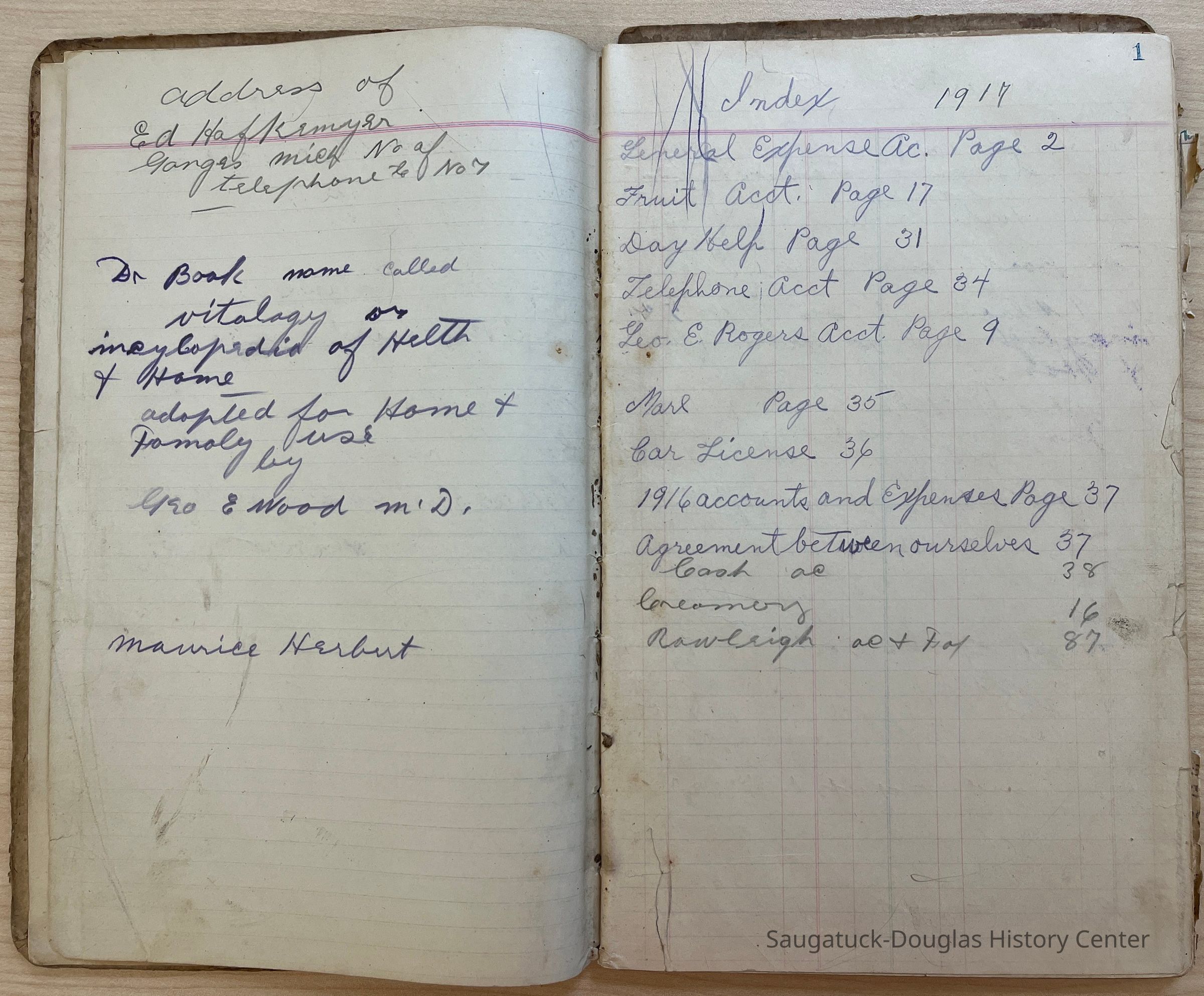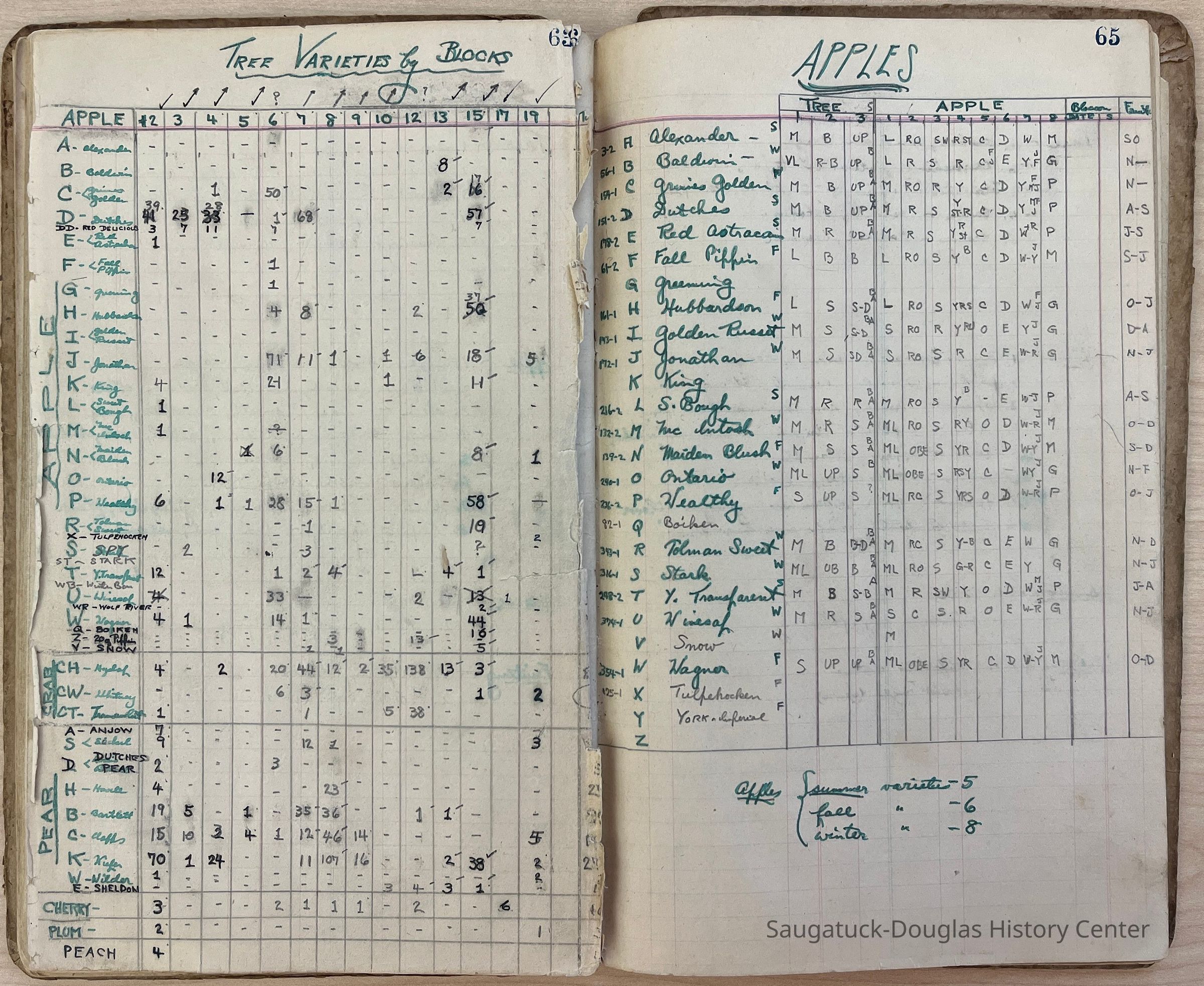 Six Riverside Farm account books for the years 1933-1940 plus an index/expenses marked 1917. The books includes land-use maps, calculations, addresses, general expenses and fruit variety notations. The farm grew many varieties of apples, crab apples, plus pears, cherries, plums and peaches.