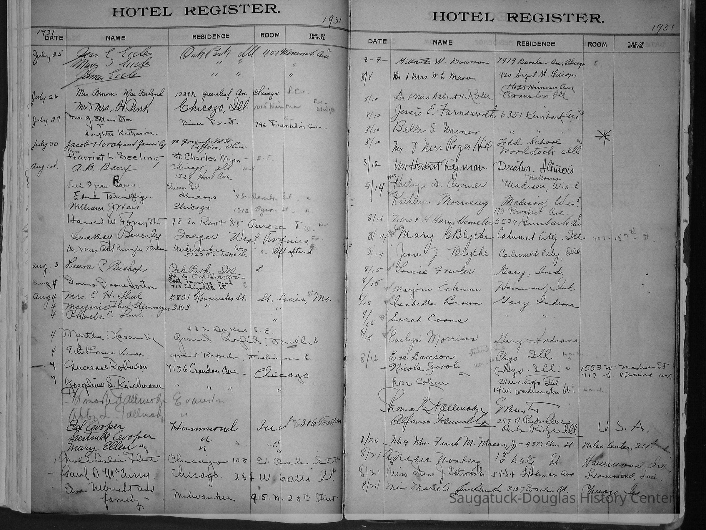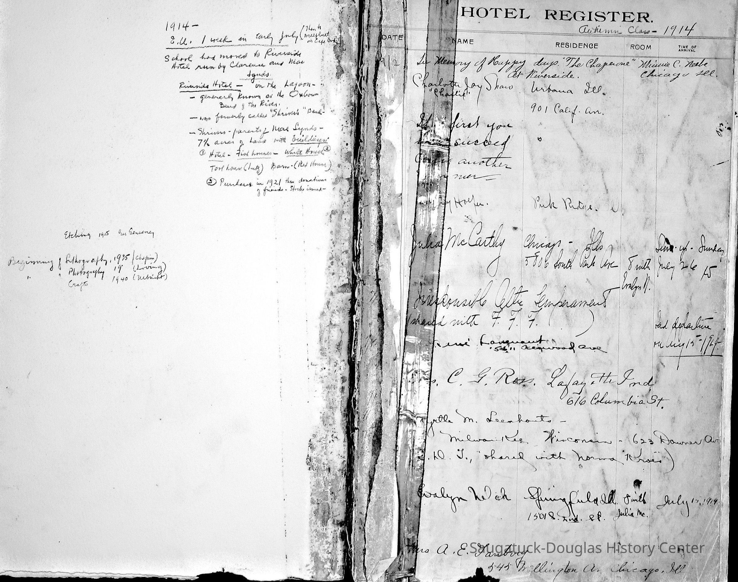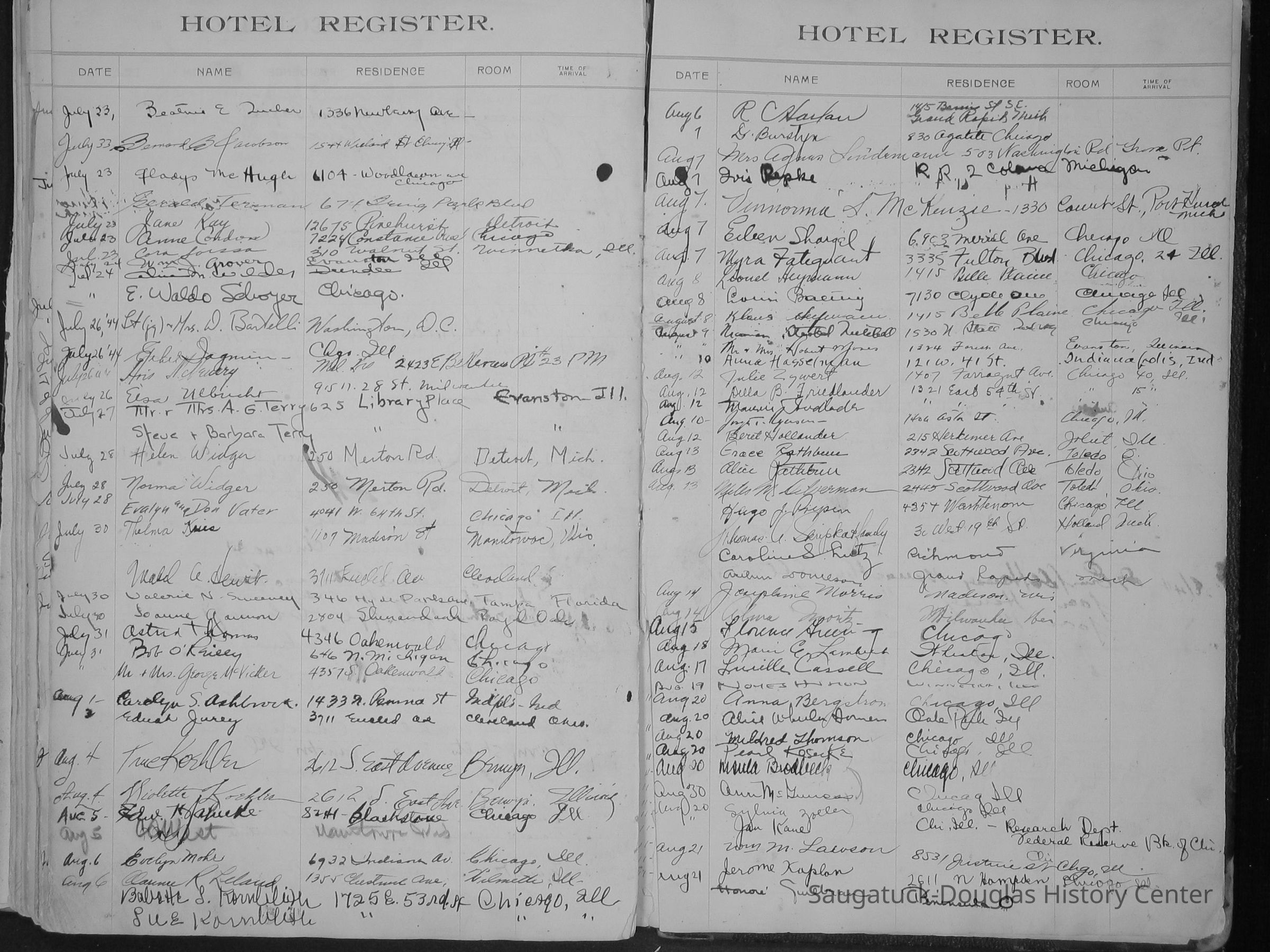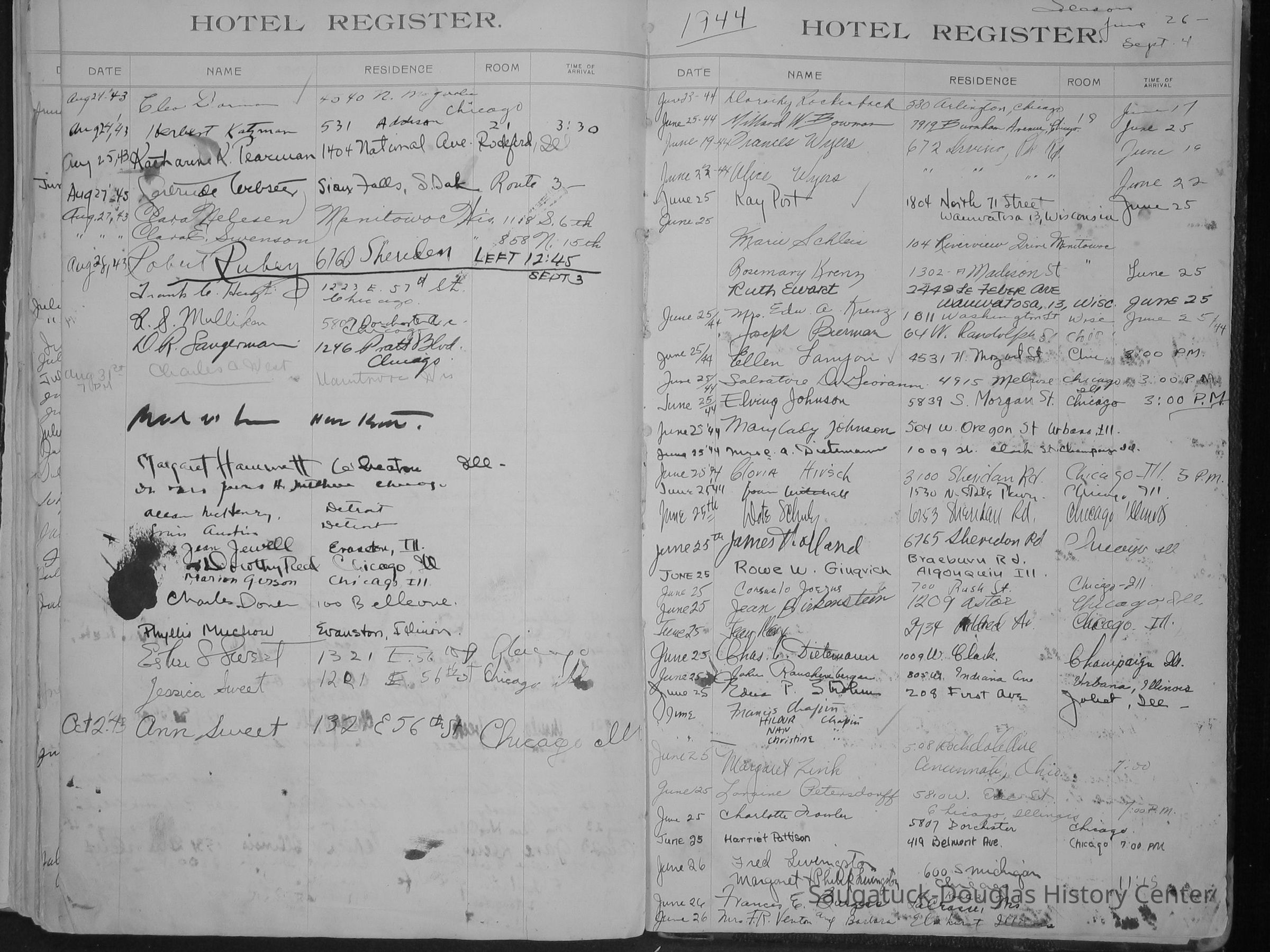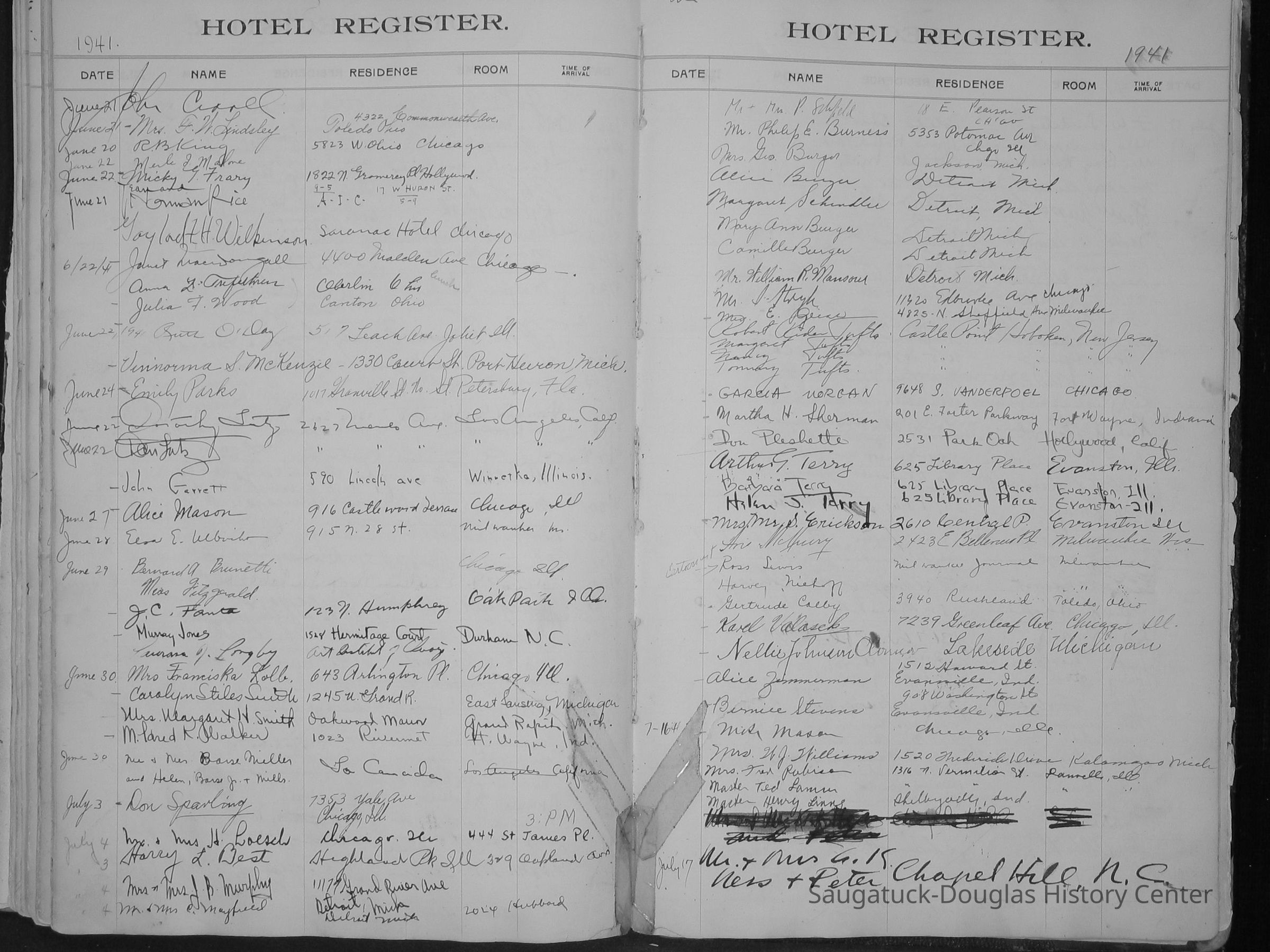 Photographs of the Ox-Bow Inn lodging register pages from 1914 to 1944. The photos were taken in June 2004 when the register was on loan from the archive of the School of the Art Institute of Chicago.