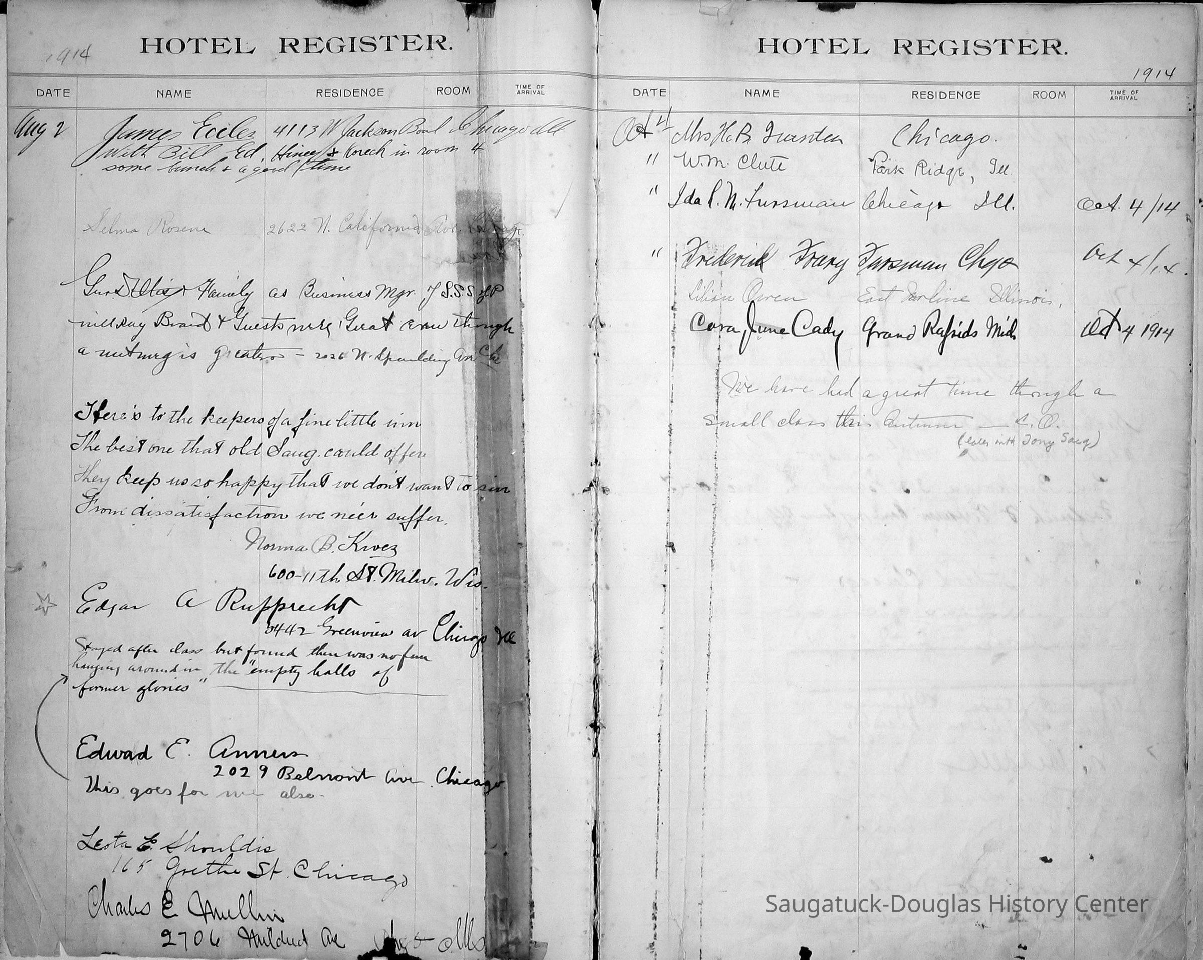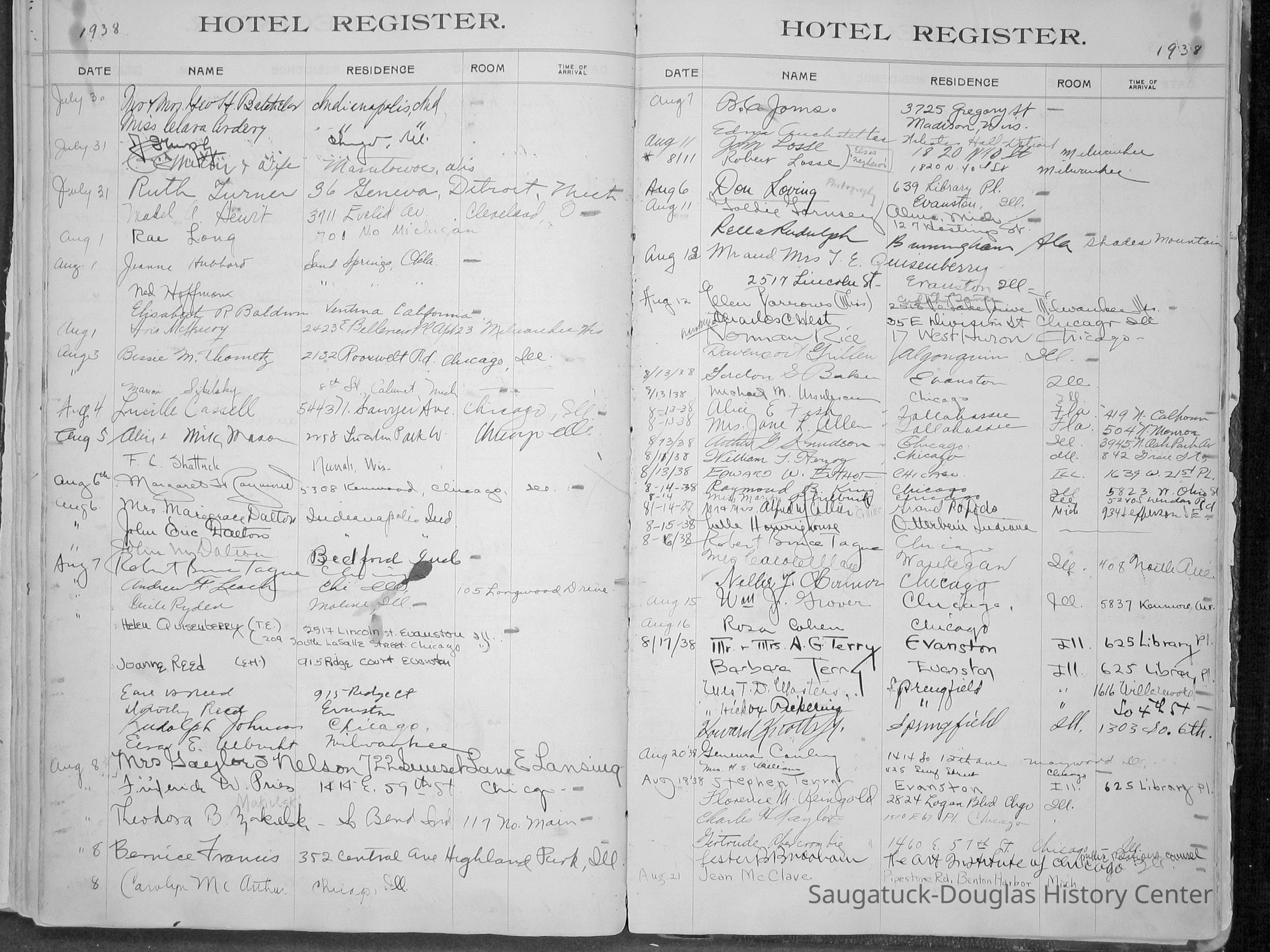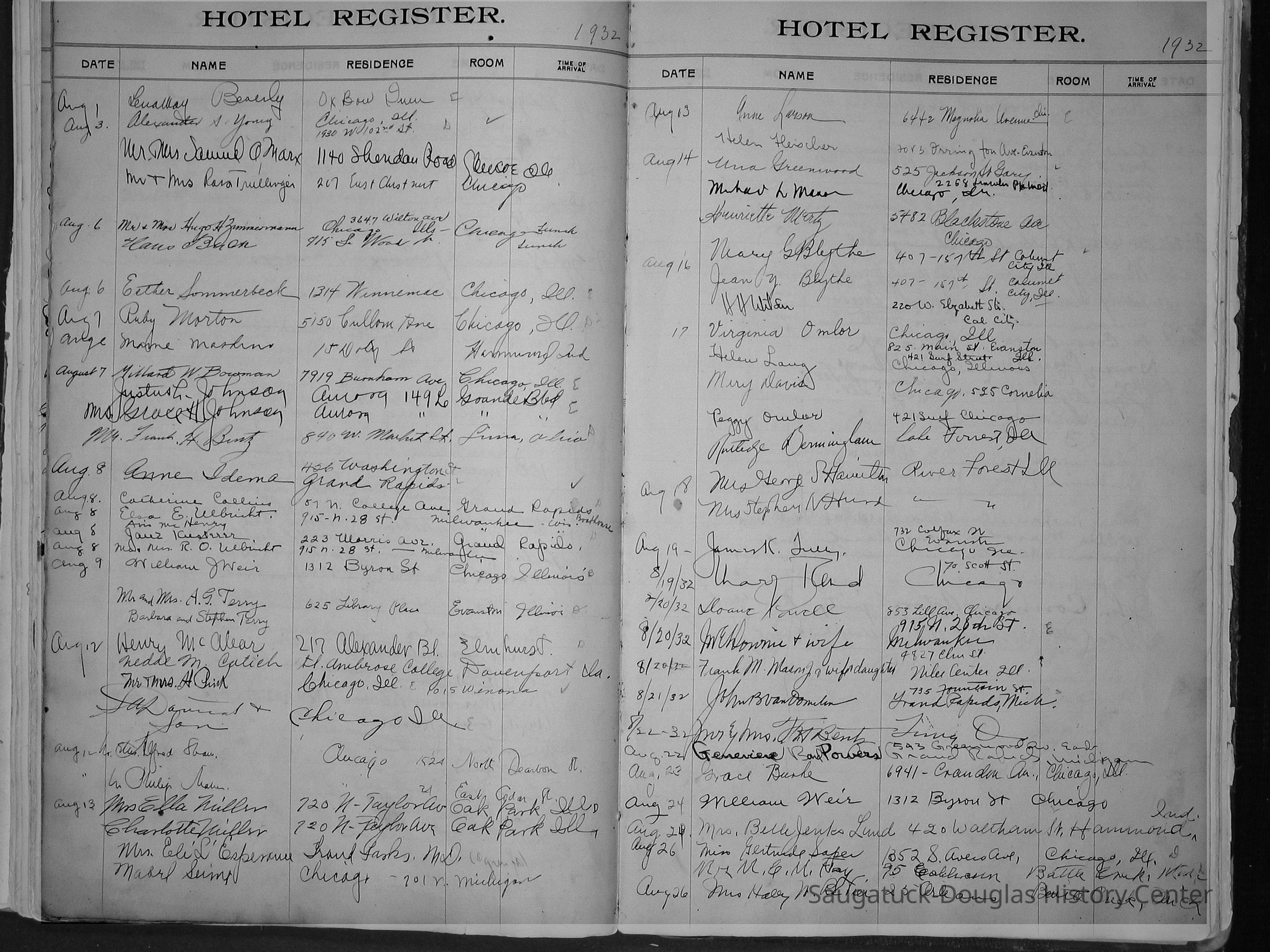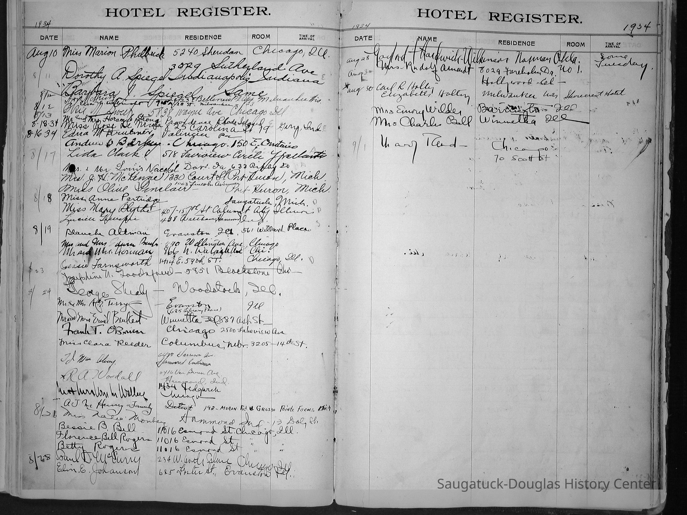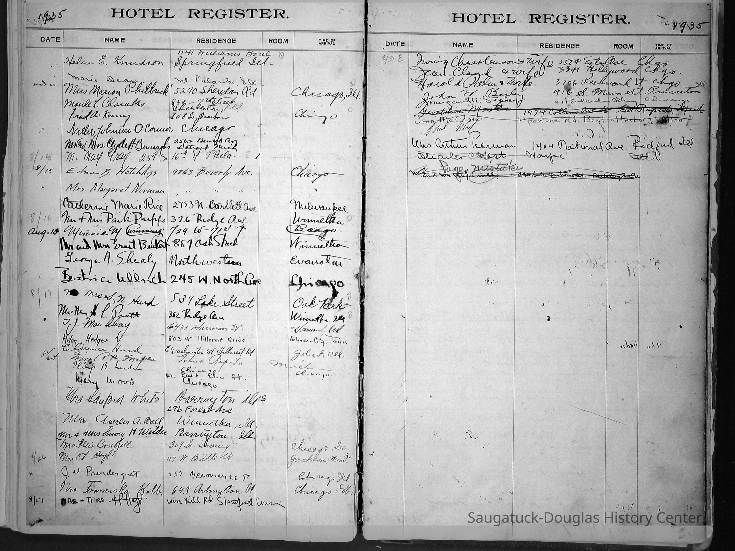 Photographs of the Ox-Bow Inn lodging register pages from 1914 to 1944. The photos were taken in June 2004 when the register was on loan from the archive of the School of the Art Institute of Chicago.