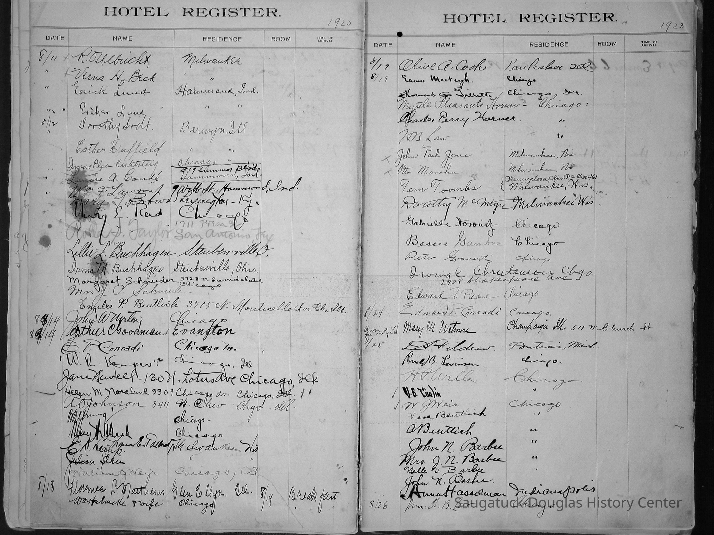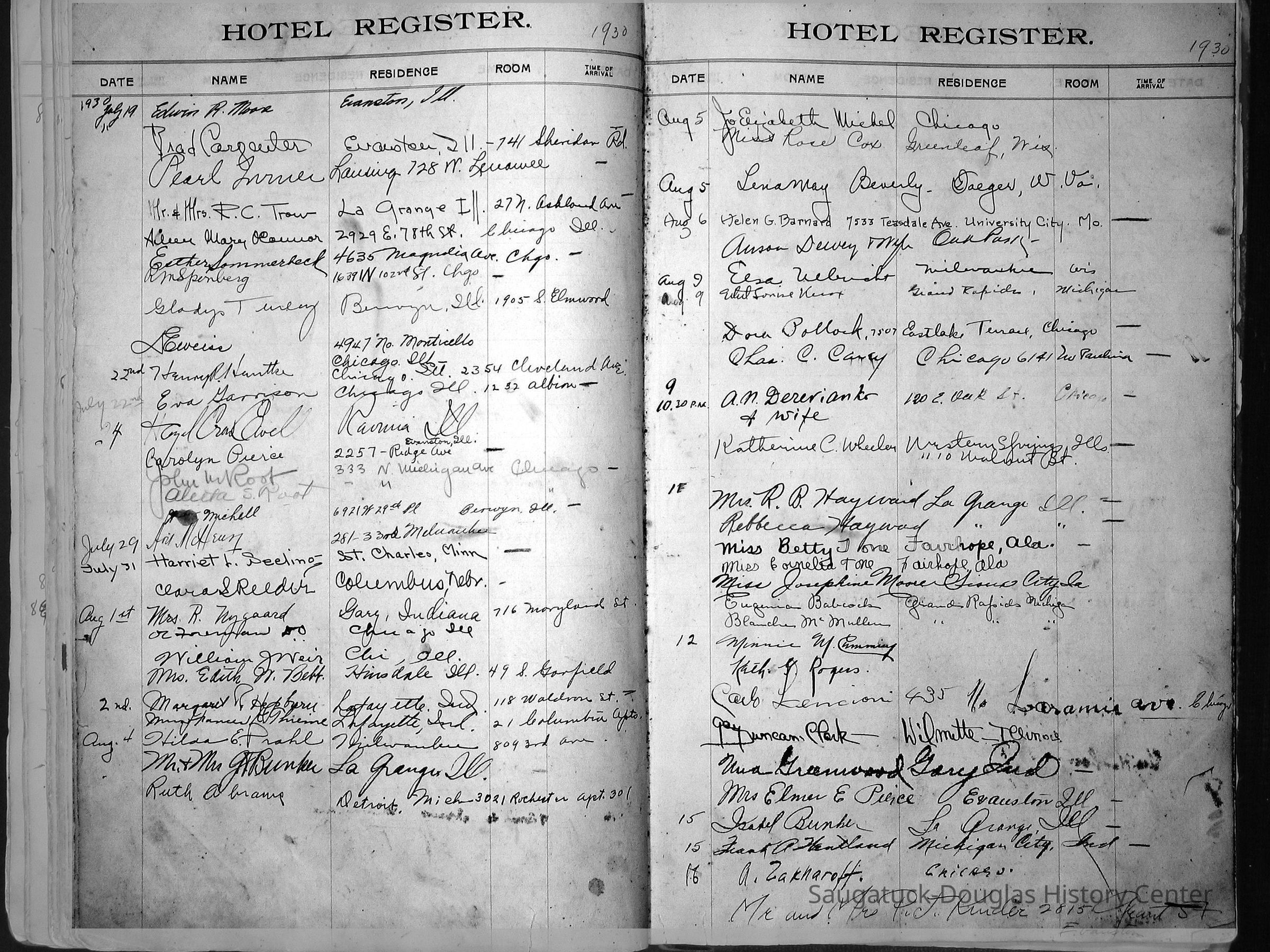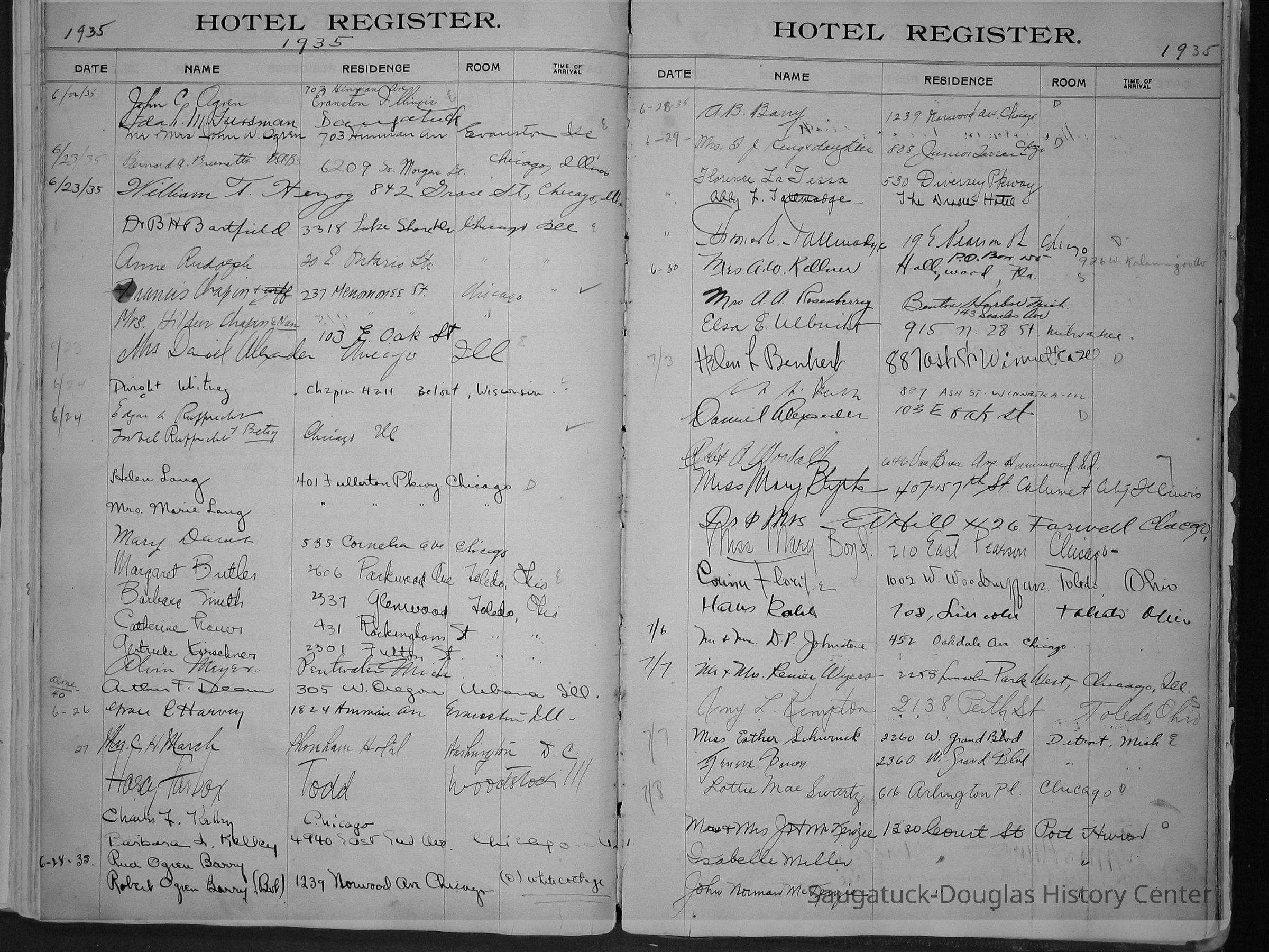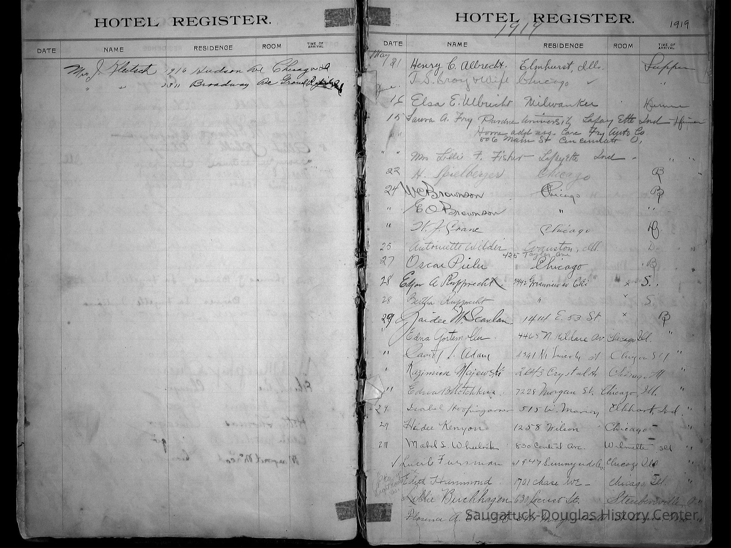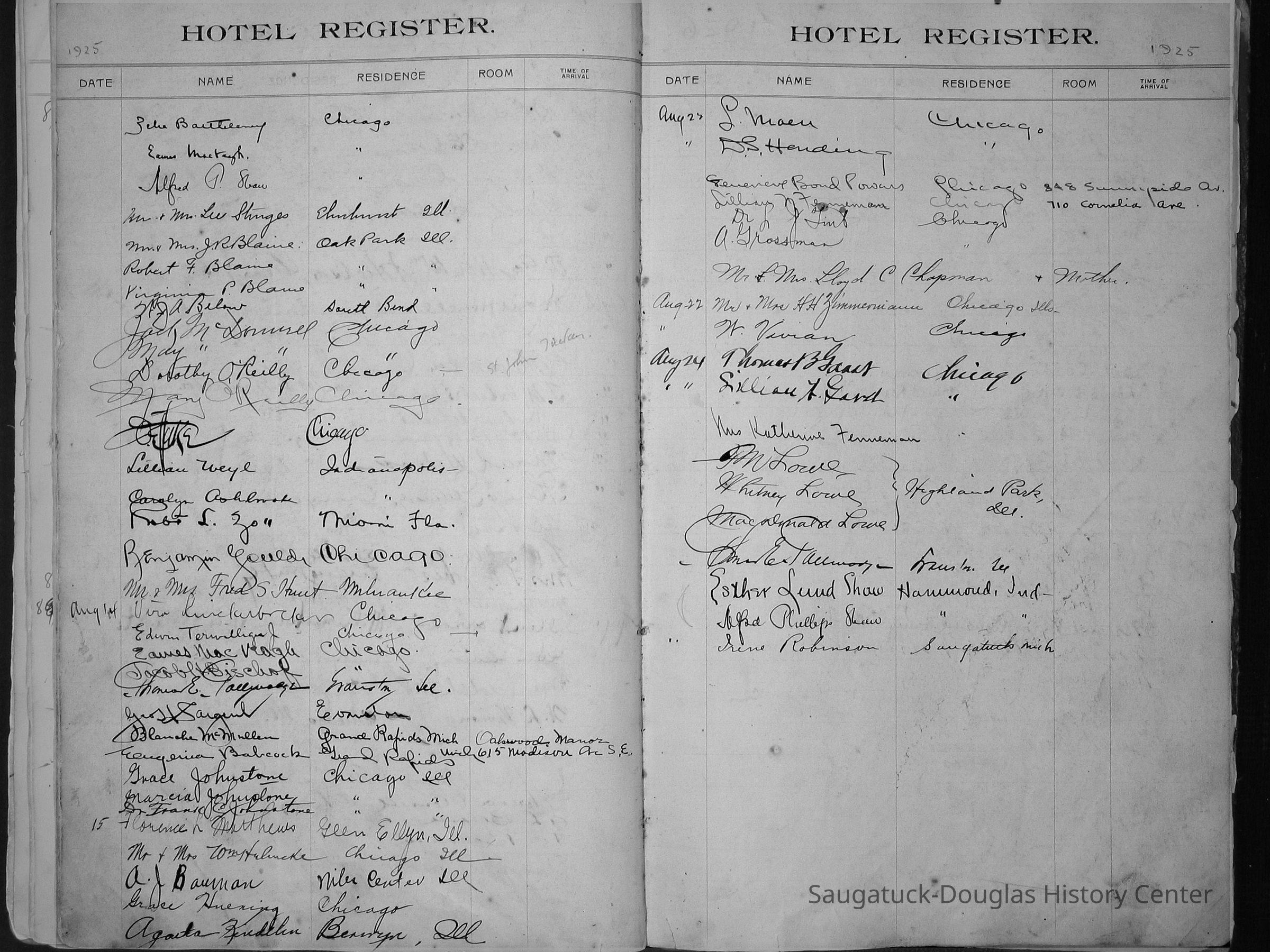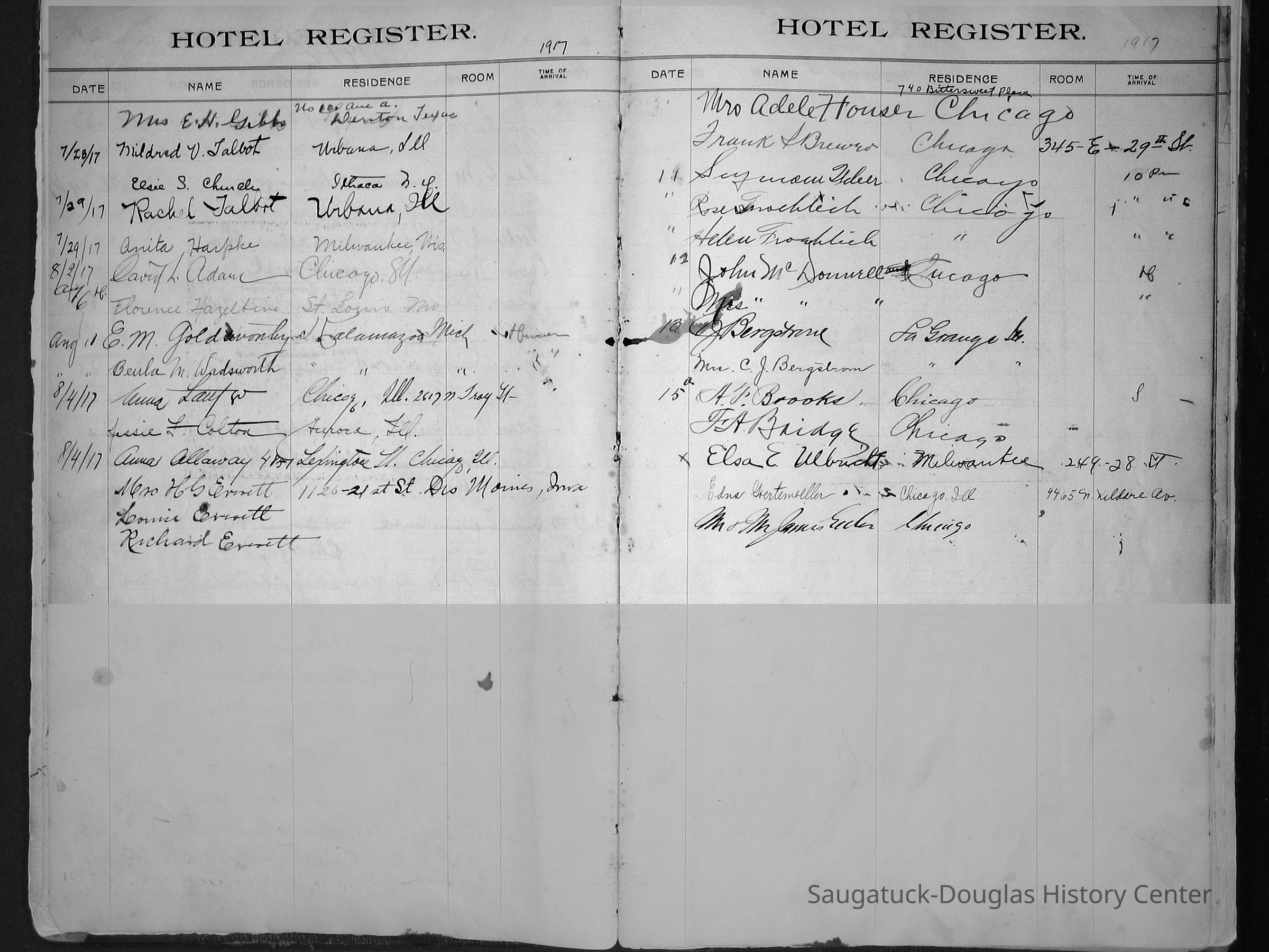 Photographs of the Ox-Bow Inn lodging register pages from 1914 to 1944. The photos were taken in June 2004 when the register was on loan from the archive of the School of the Art Institute of Chicago.