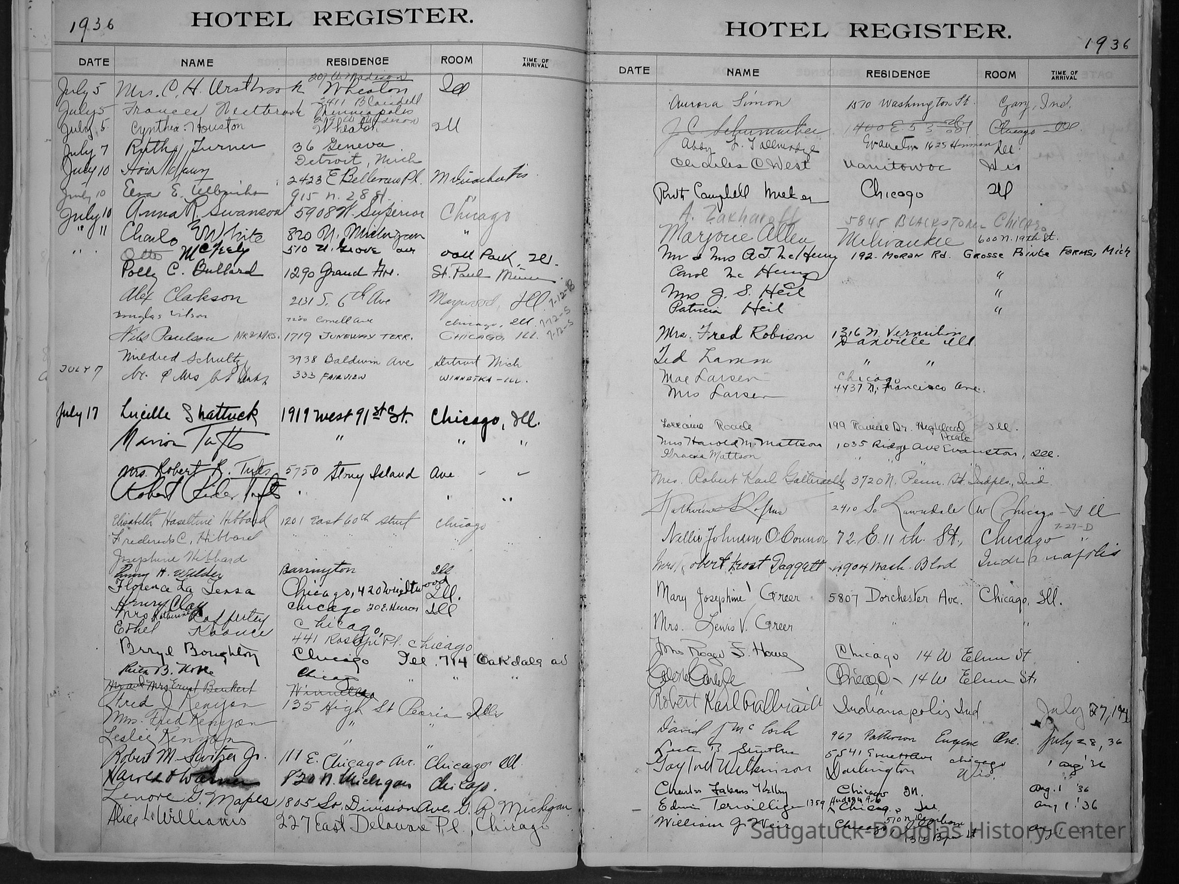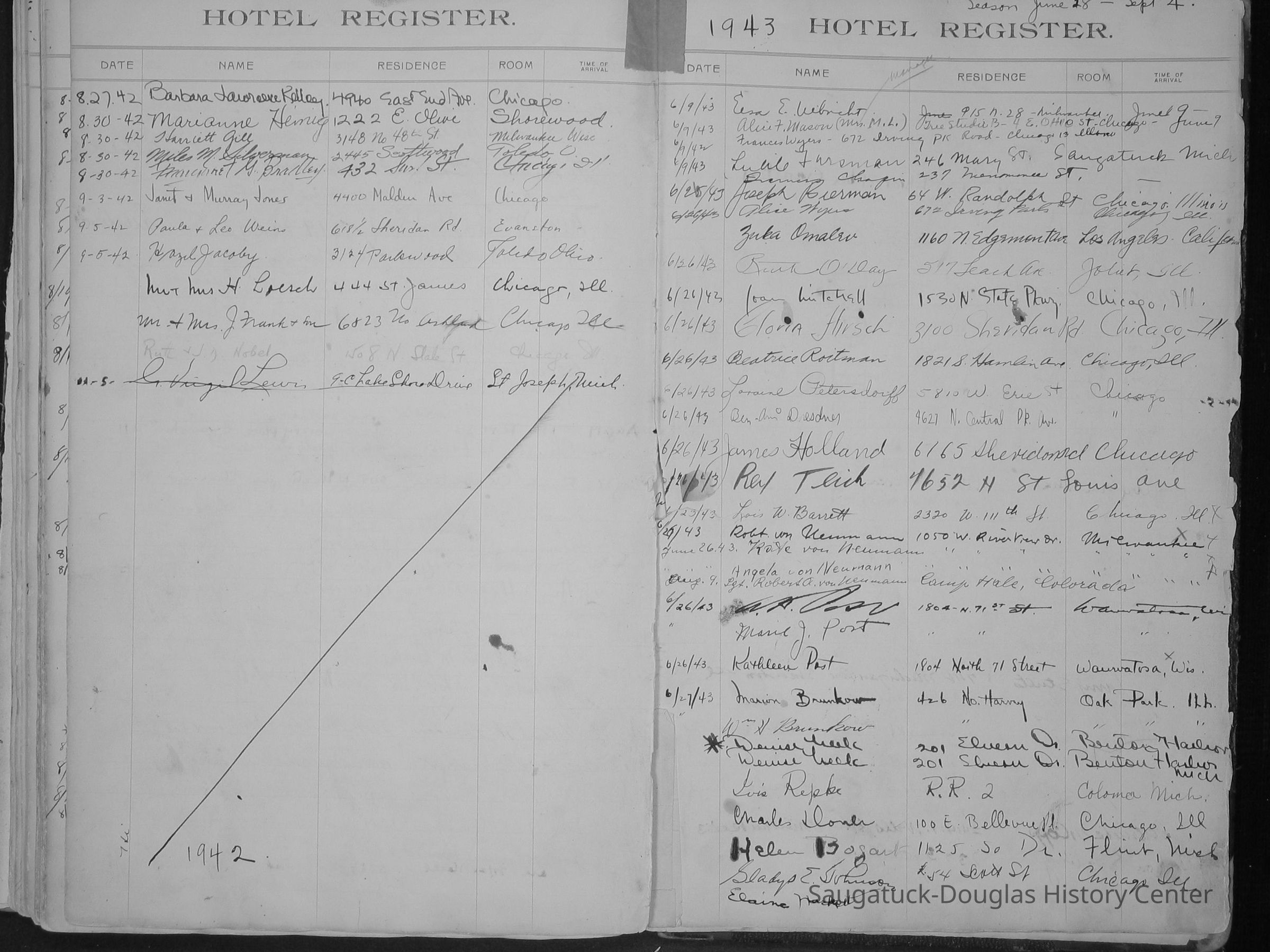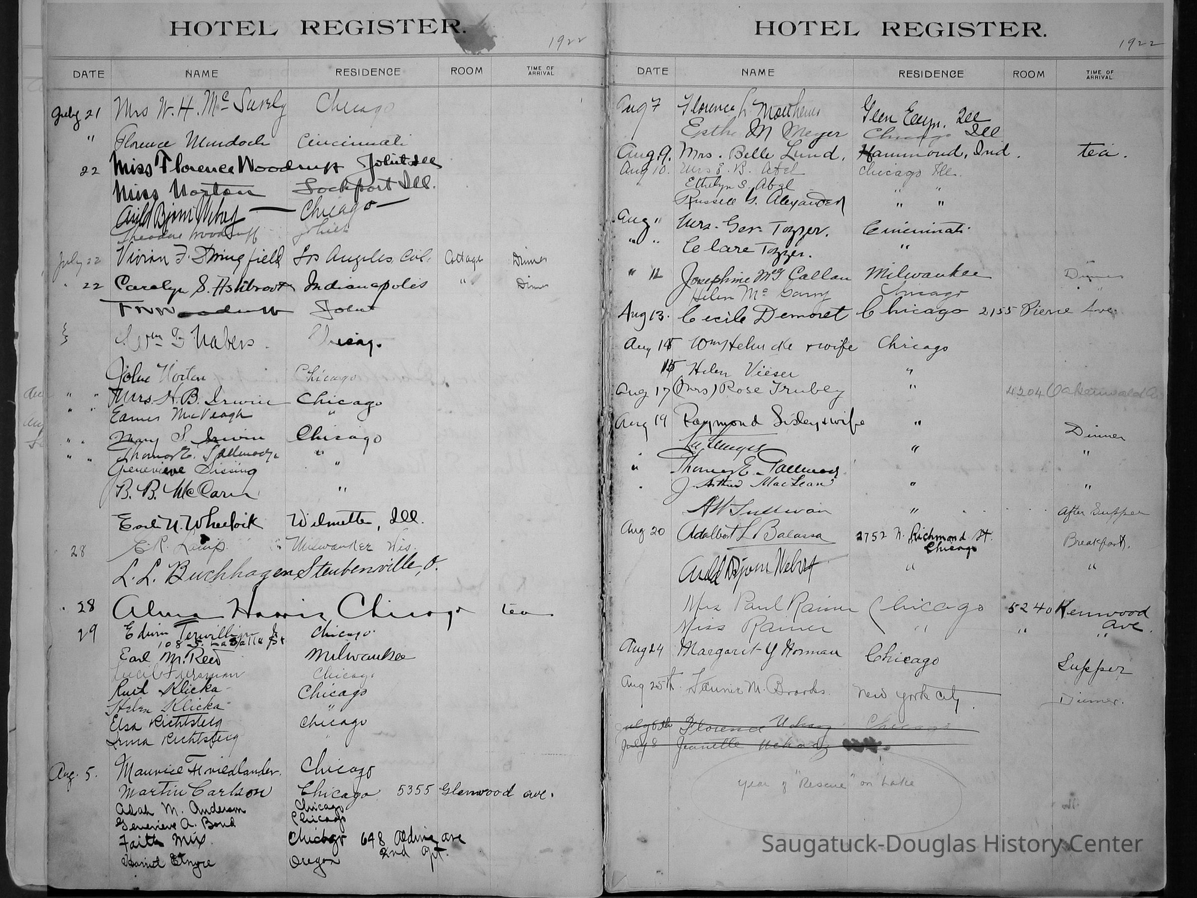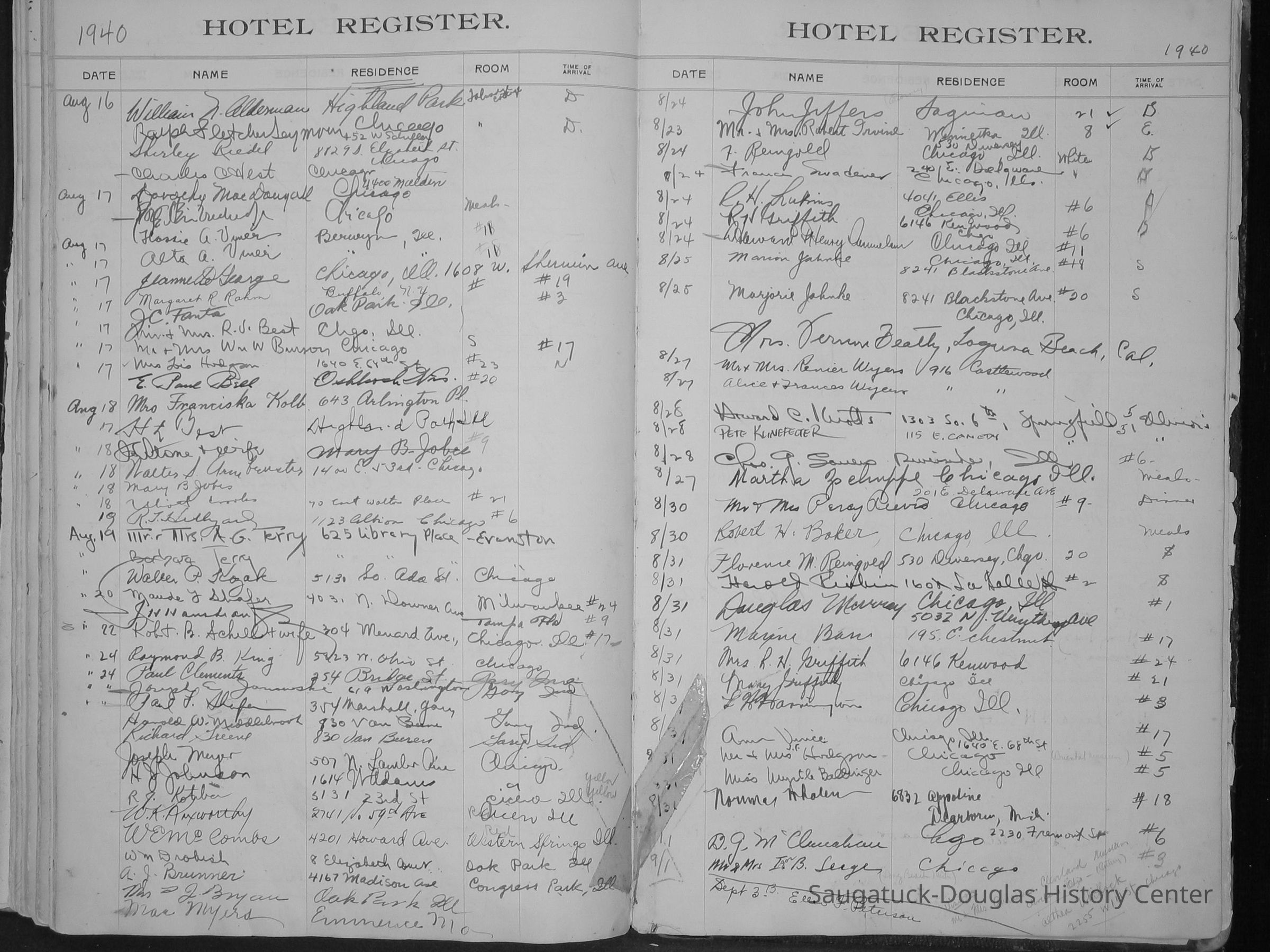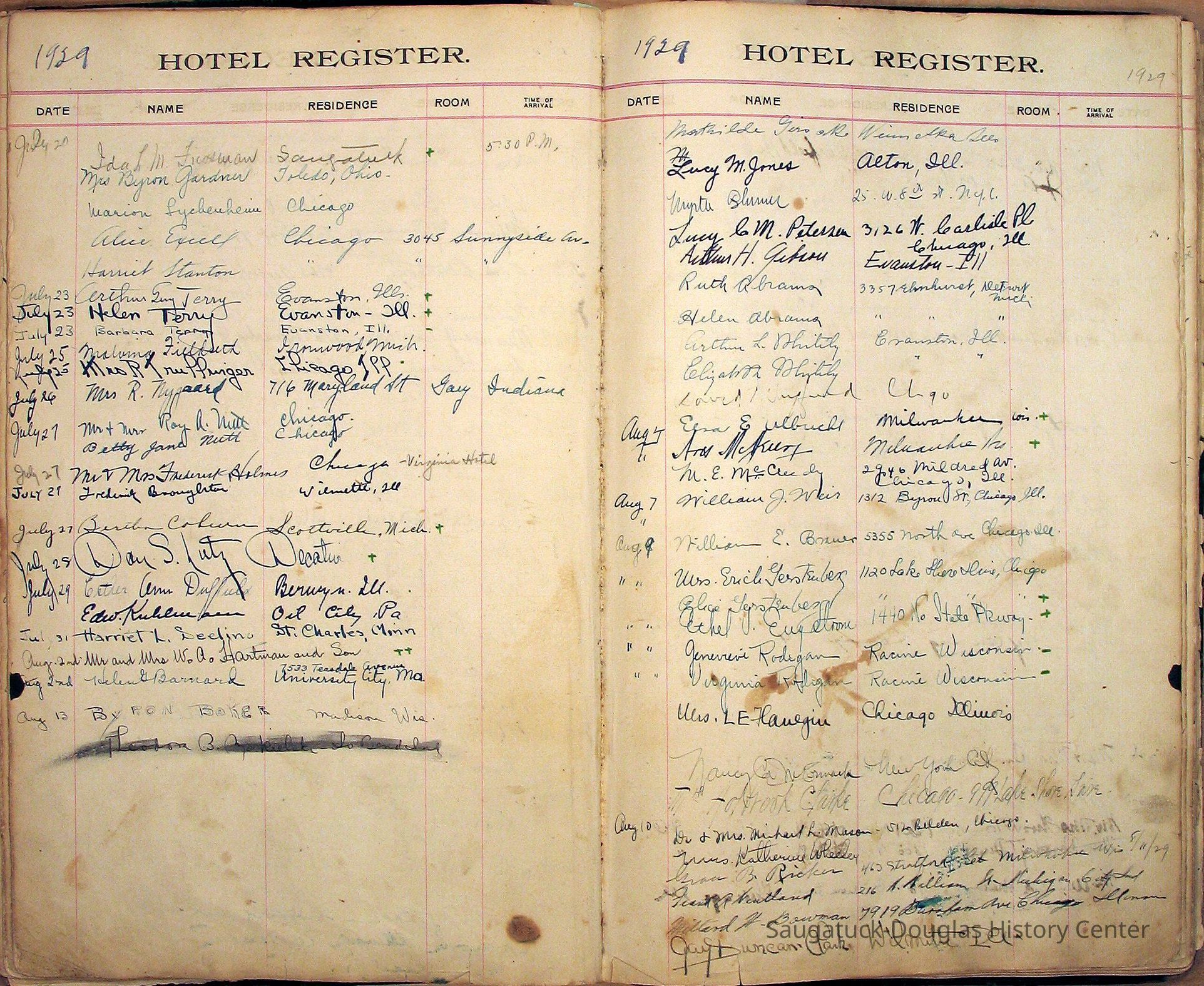 Photographs of the Ox-Bow Inn lodging register pages from 1914 to 1944. The photos were taken in June 2004 when the register was on loan from the archive of the School of the Art Institute of Chicago.