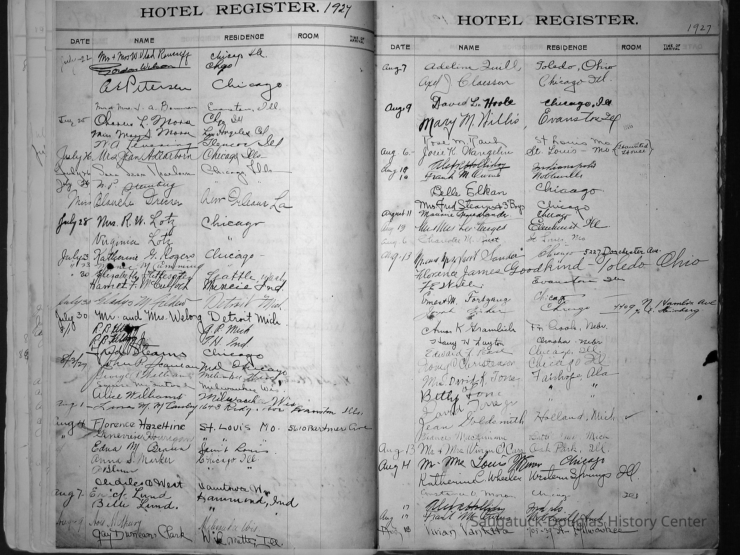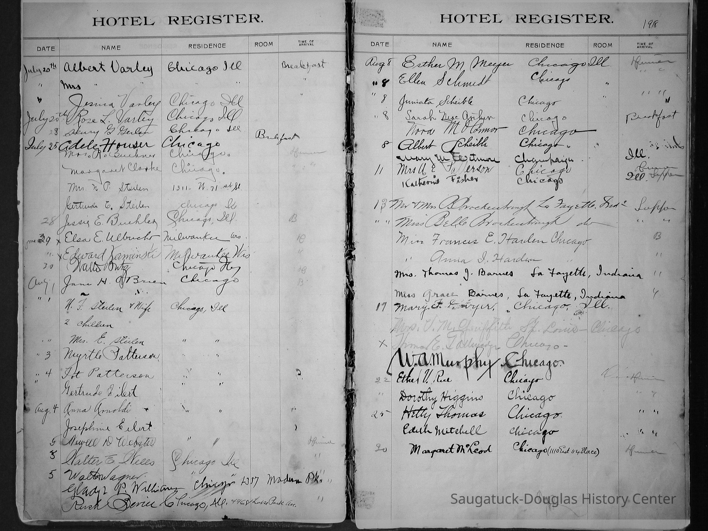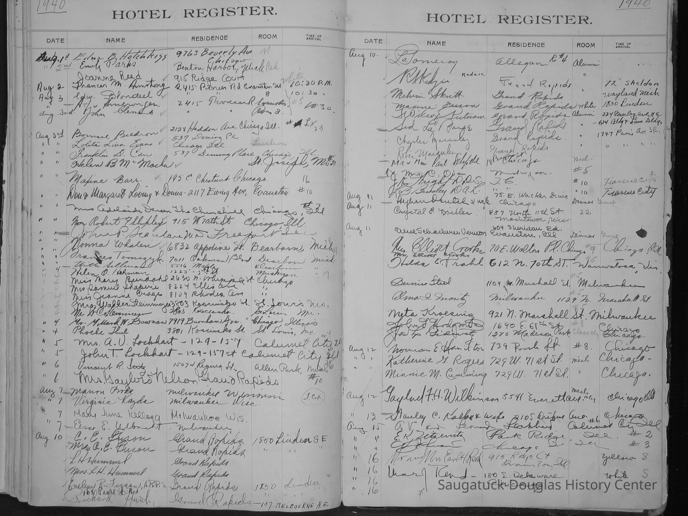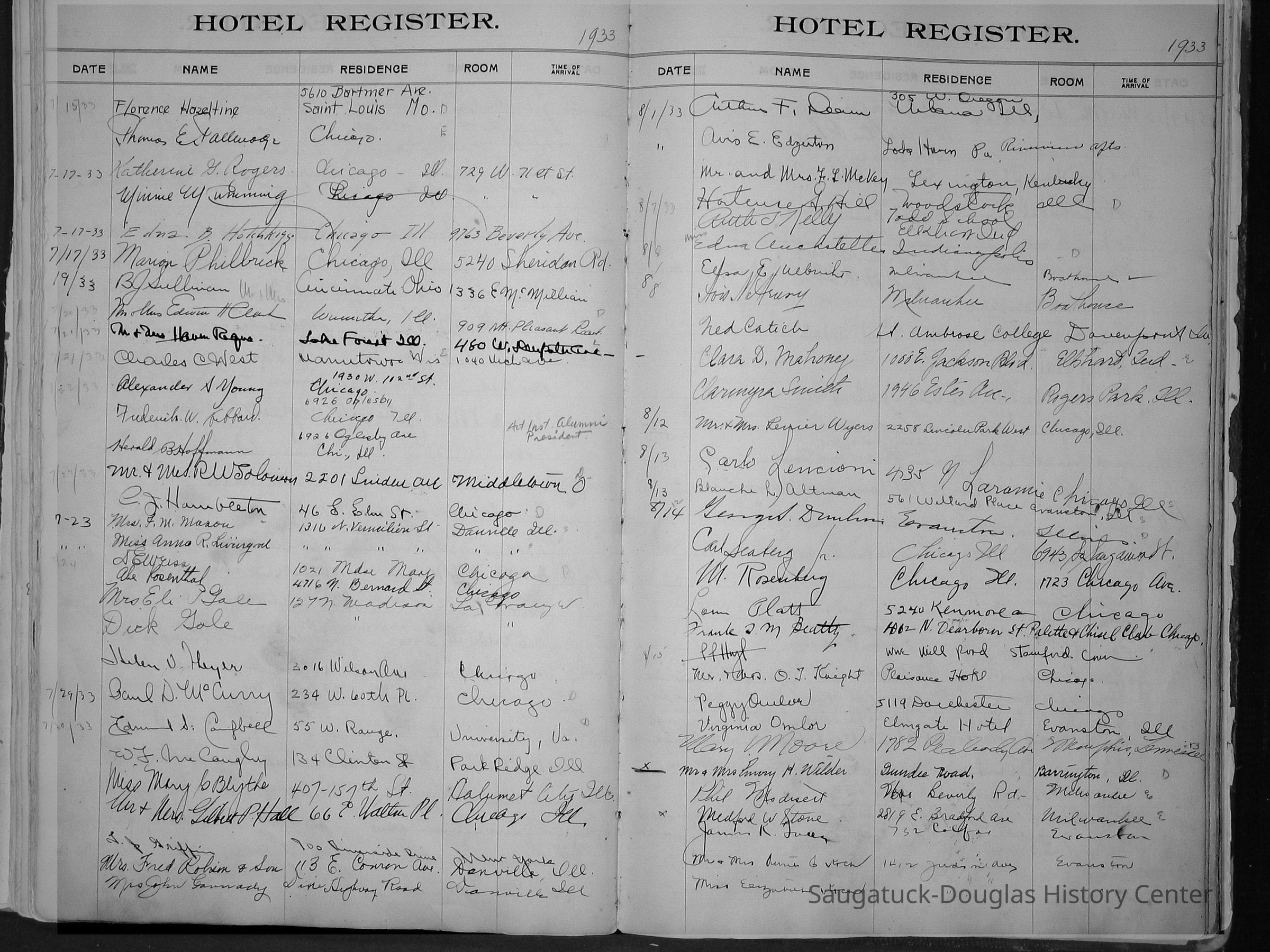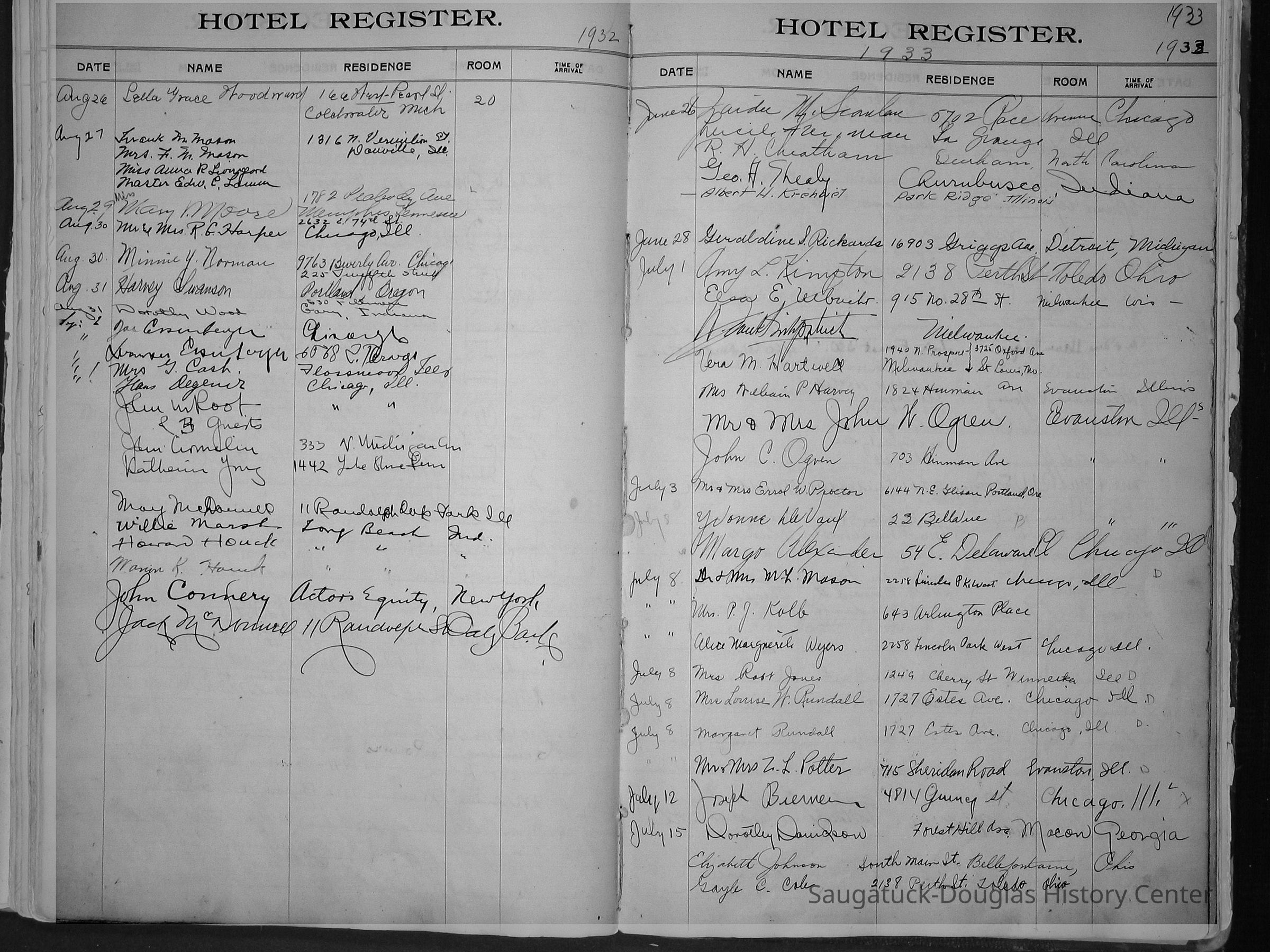 Photographs of the Ox-Bow Inn lodging register pages from 1914 to 1944. The photos were taken in June 2004 when the register was on loan from the archive of the School of the Art Institute of Chicago.