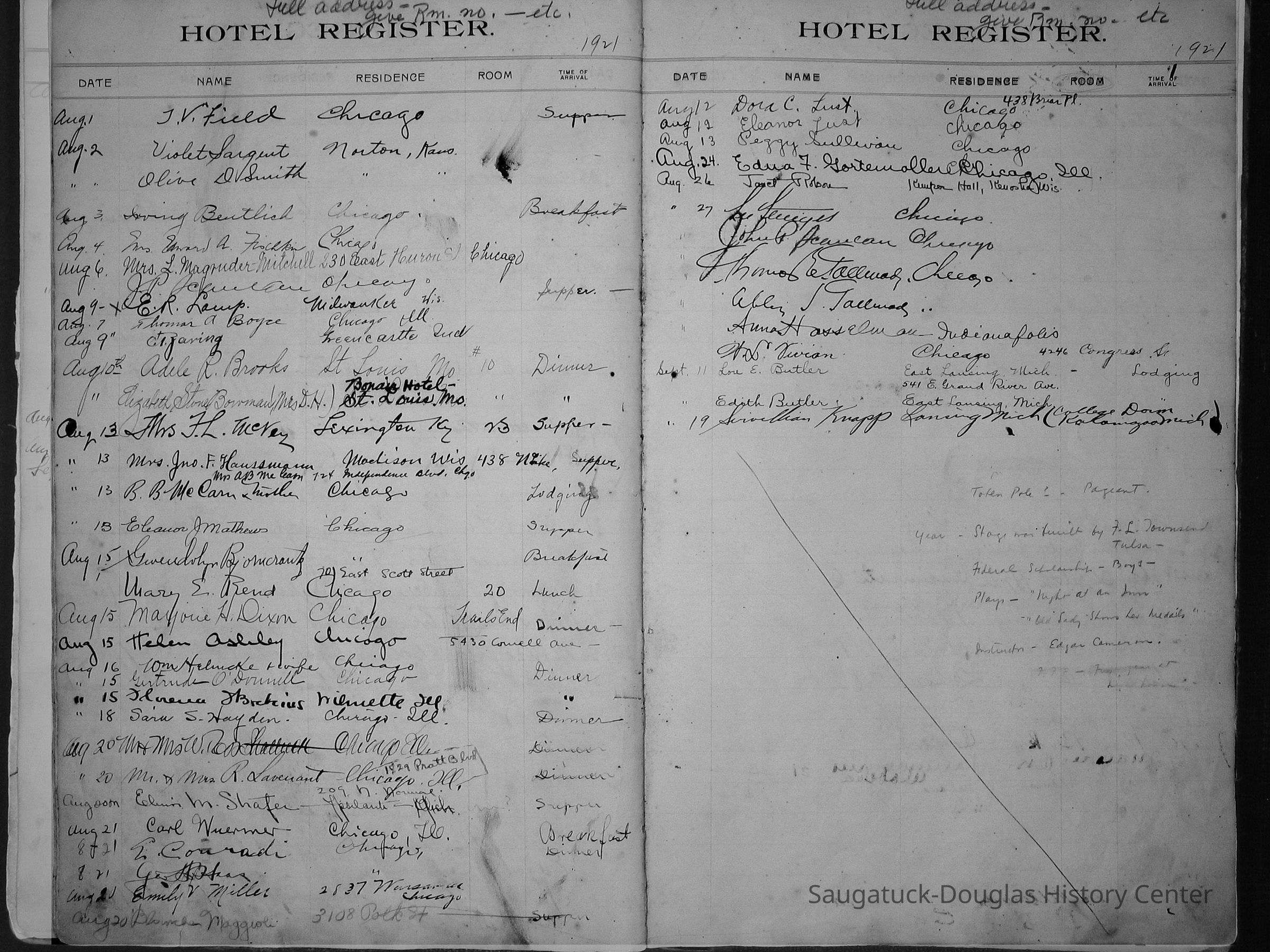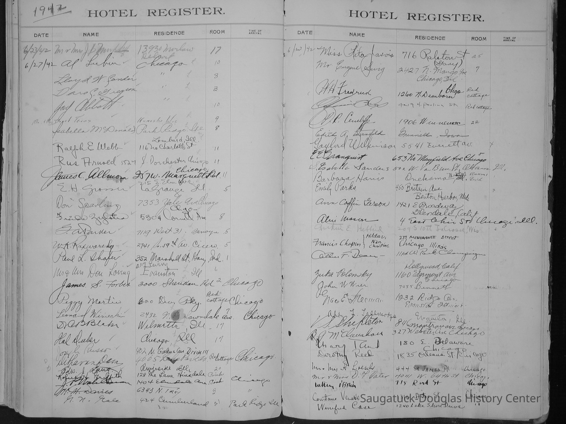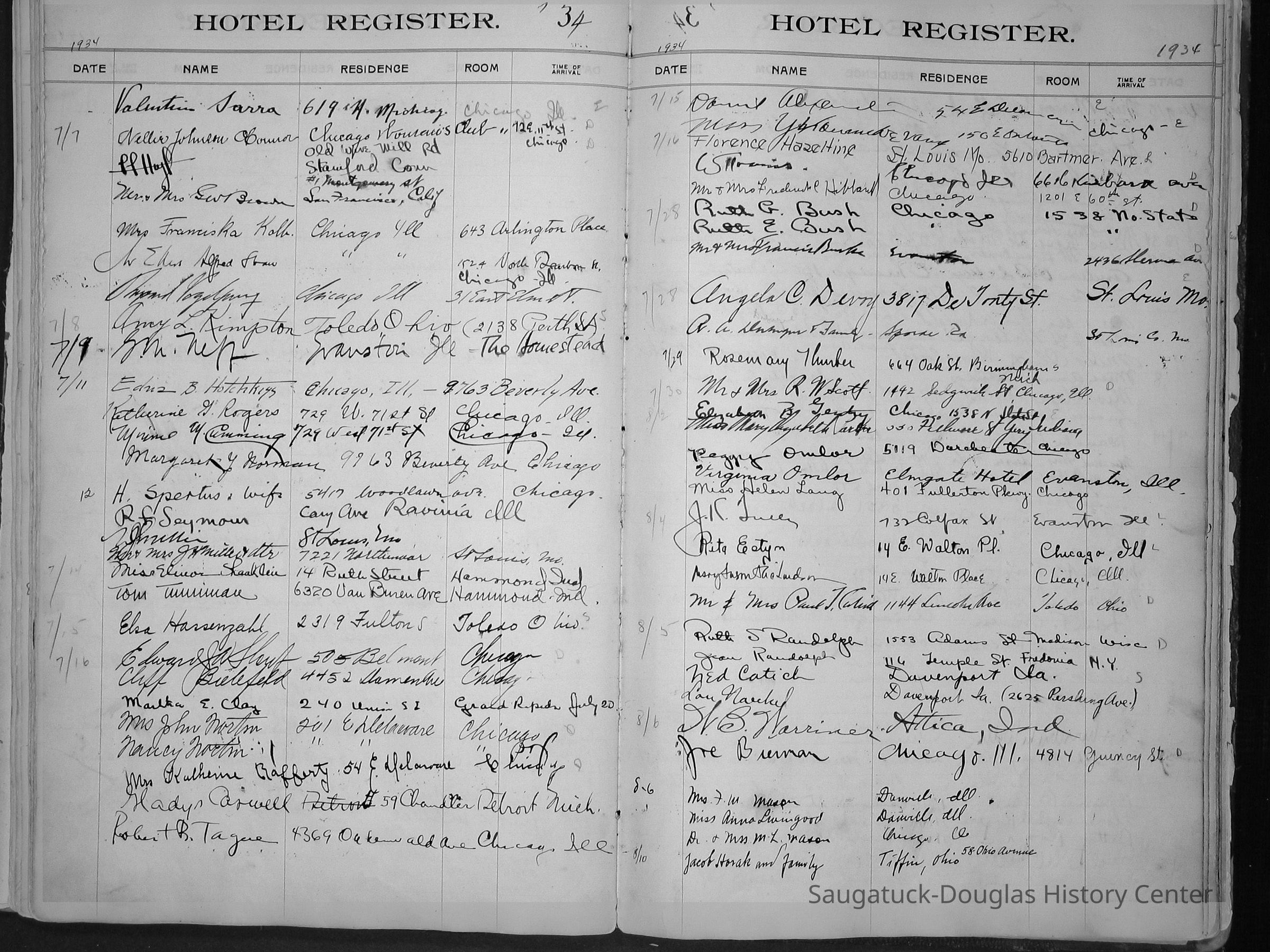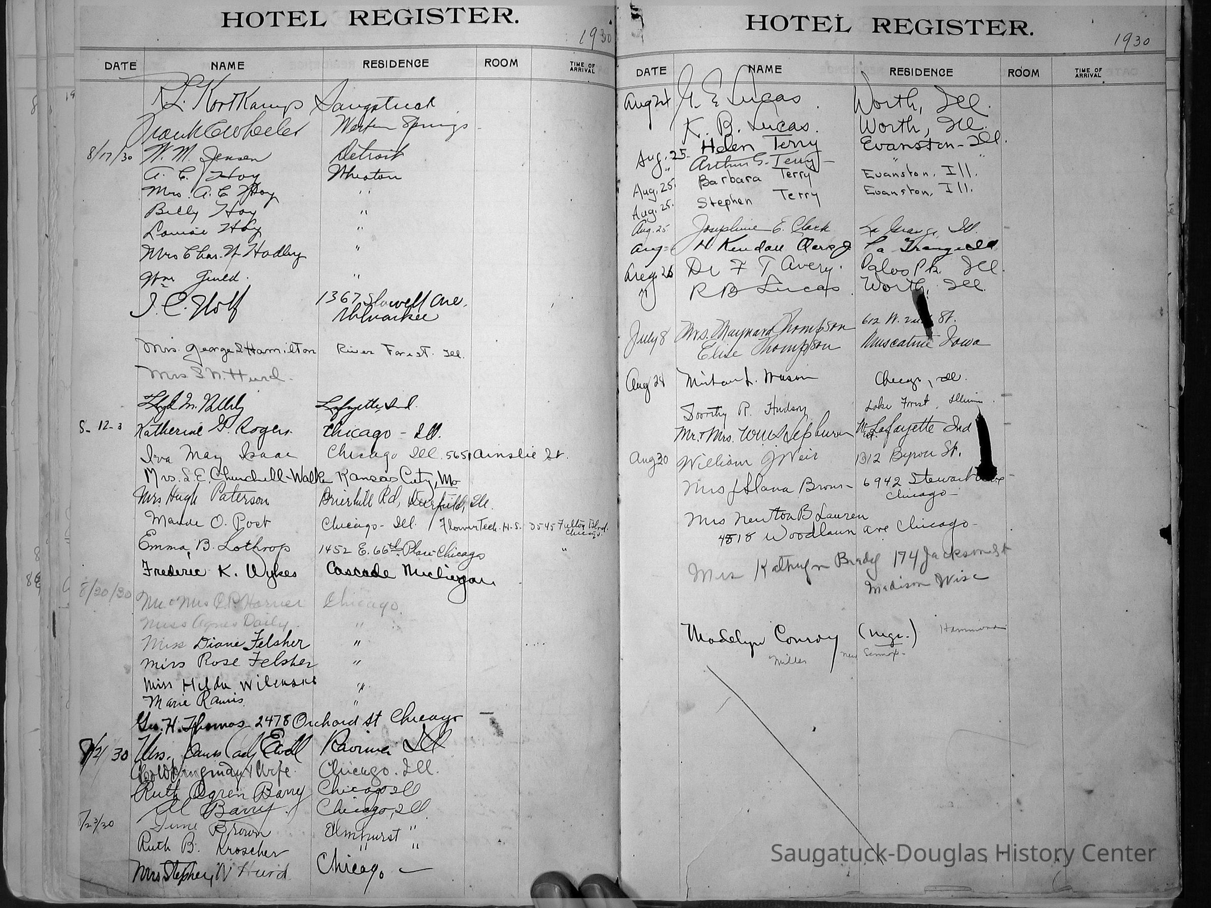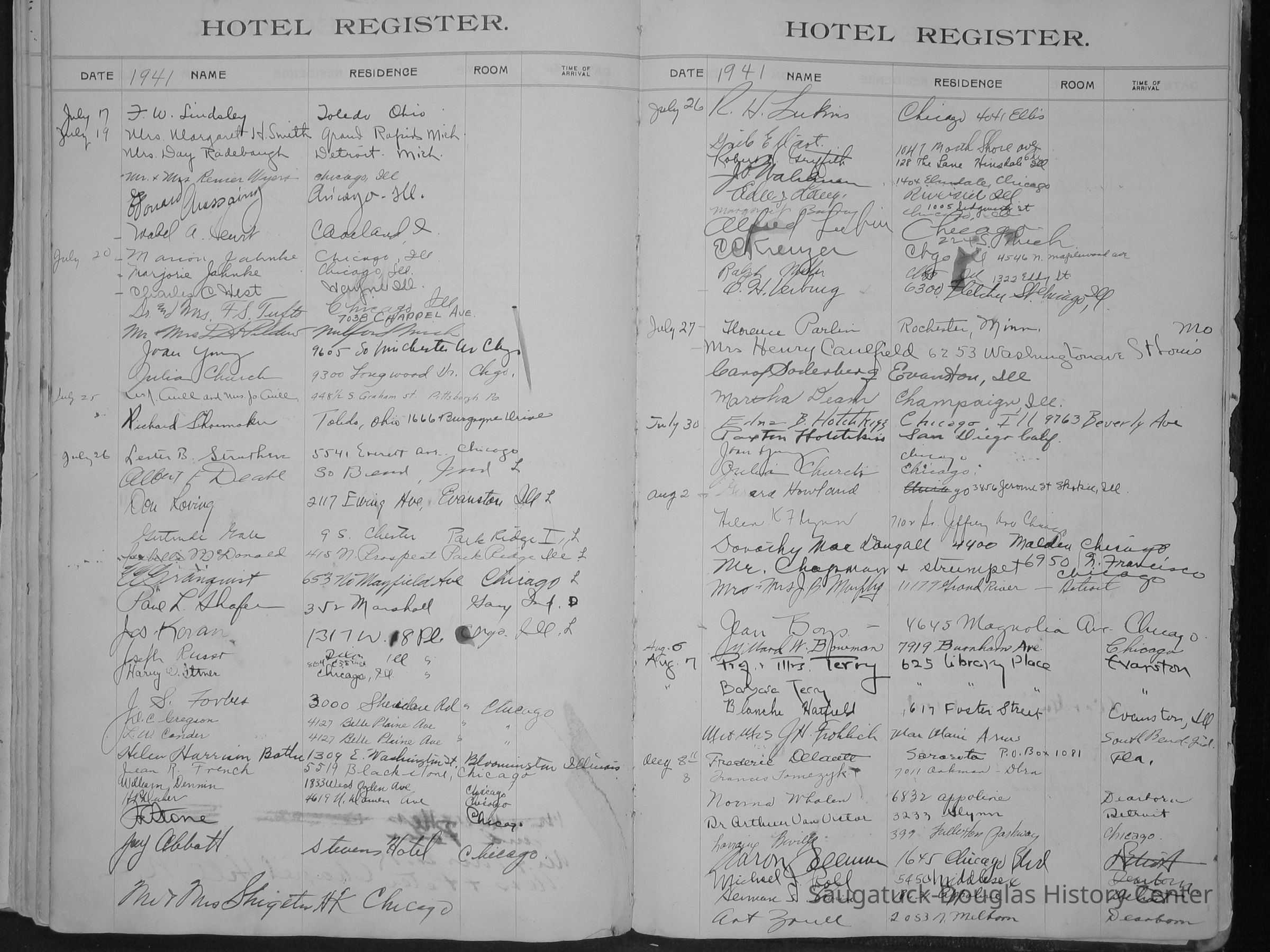 Photographs of the Ox-Bow Inn lodging register pages from 1914 to 1944. The photos were taken in June 2004 when the register was on loan from the archive of the School of the Art Institute of Chicago.