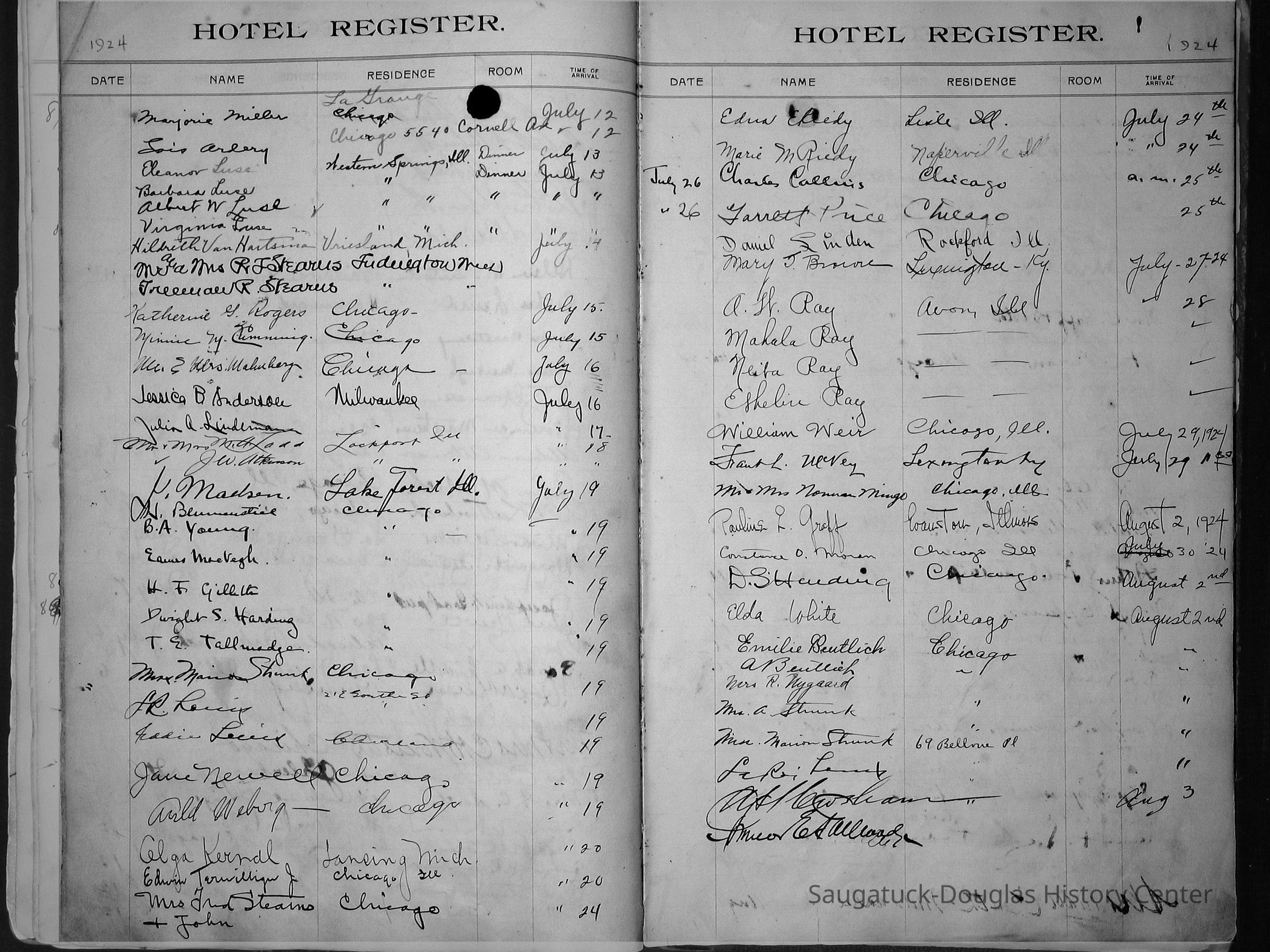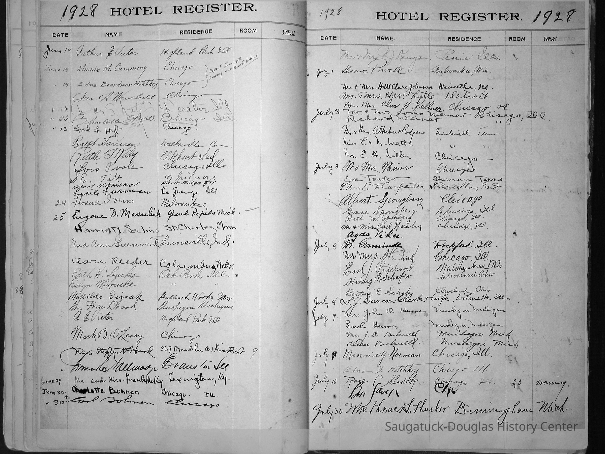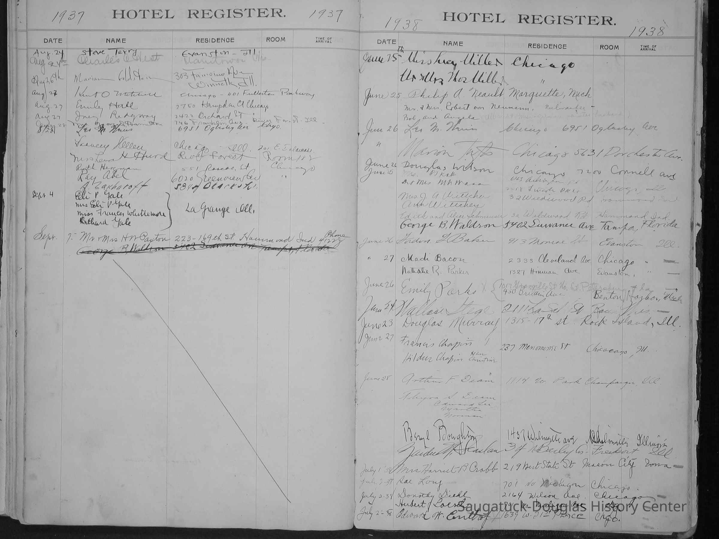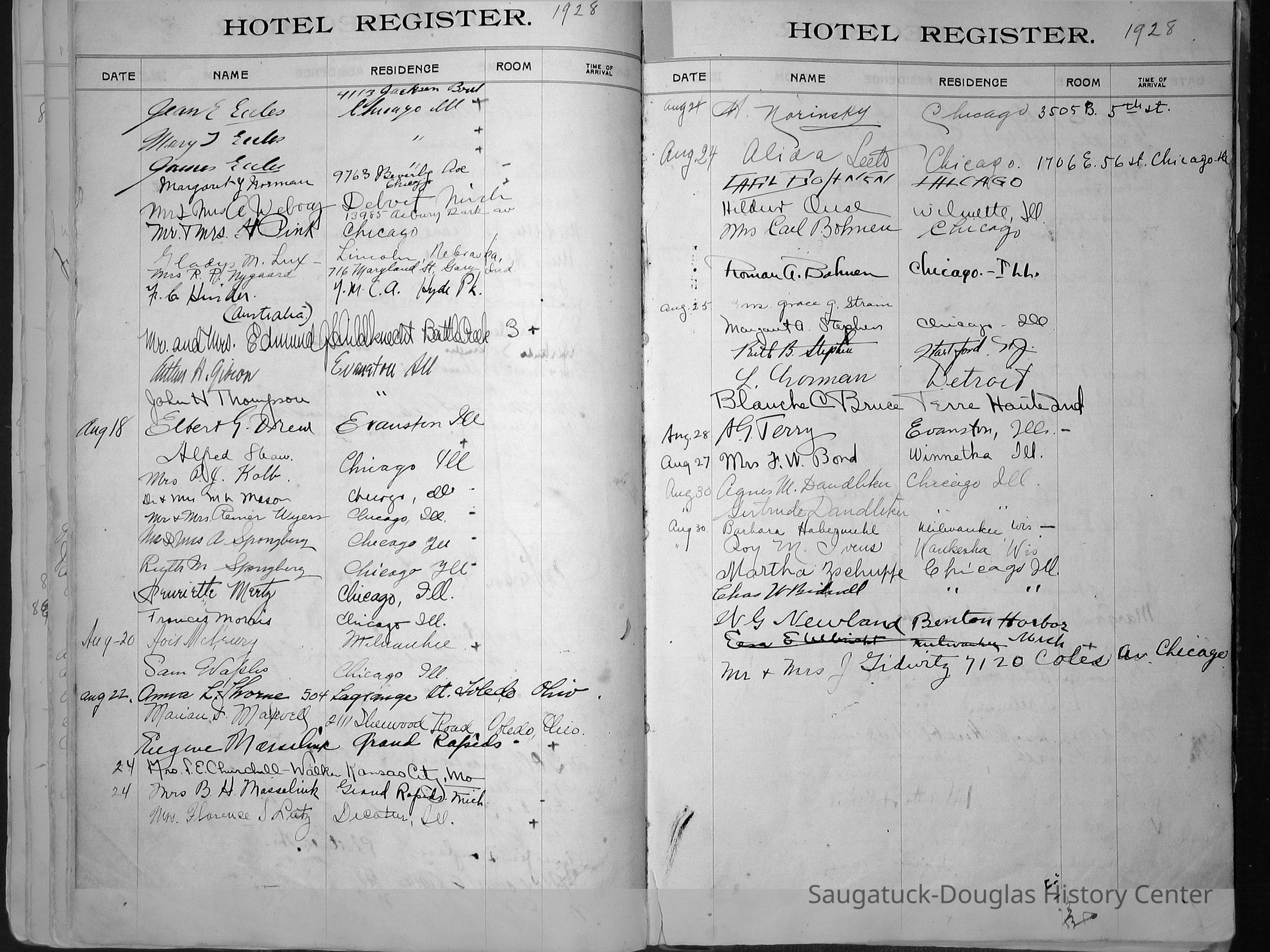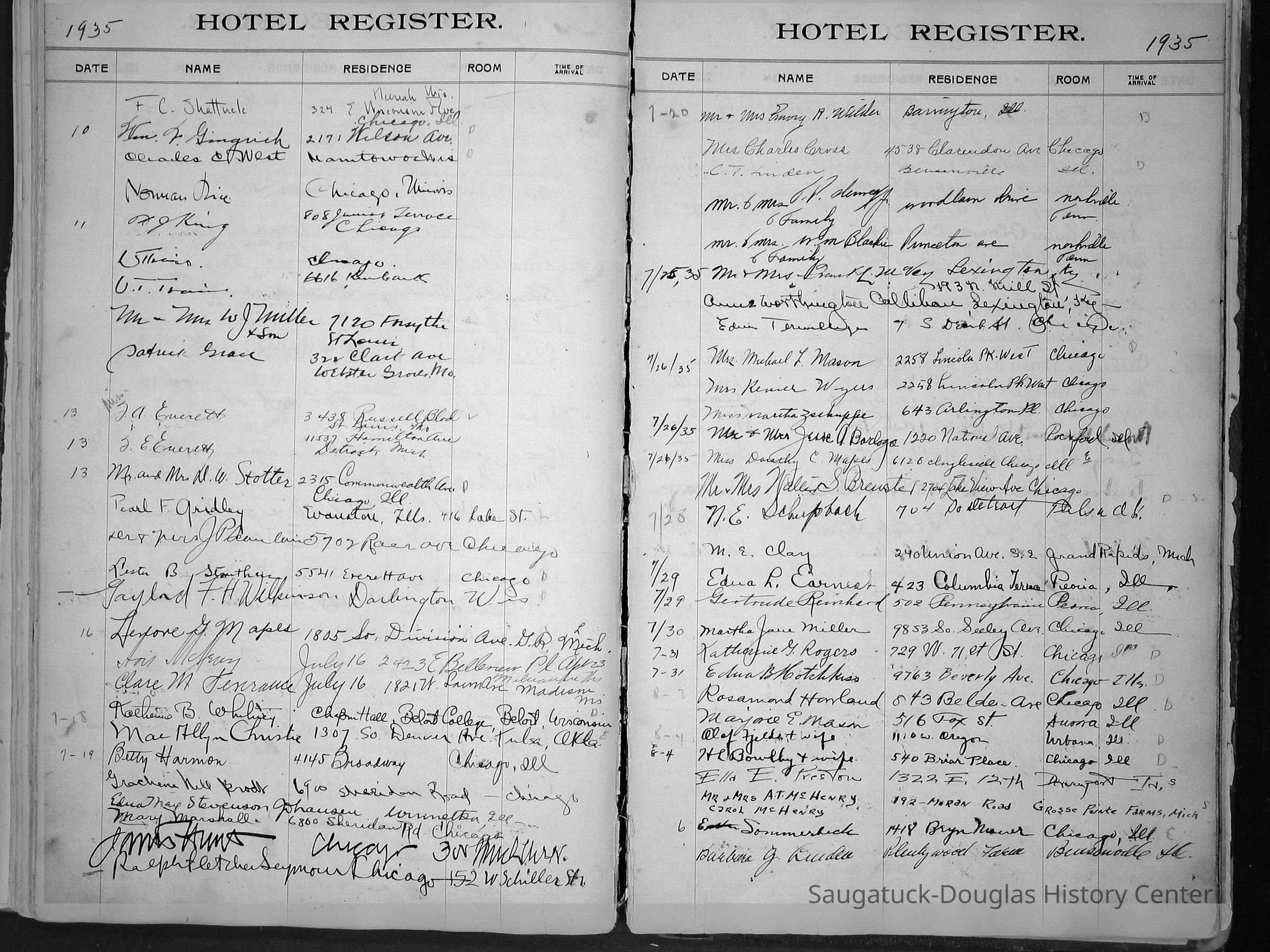 Photographs of the Ox-Bow Inn lodging register pages from 1914 to 1944. The photos were taken in June 2004 when the register was on loan from the archive of the School of the Art Institute of Chicago.