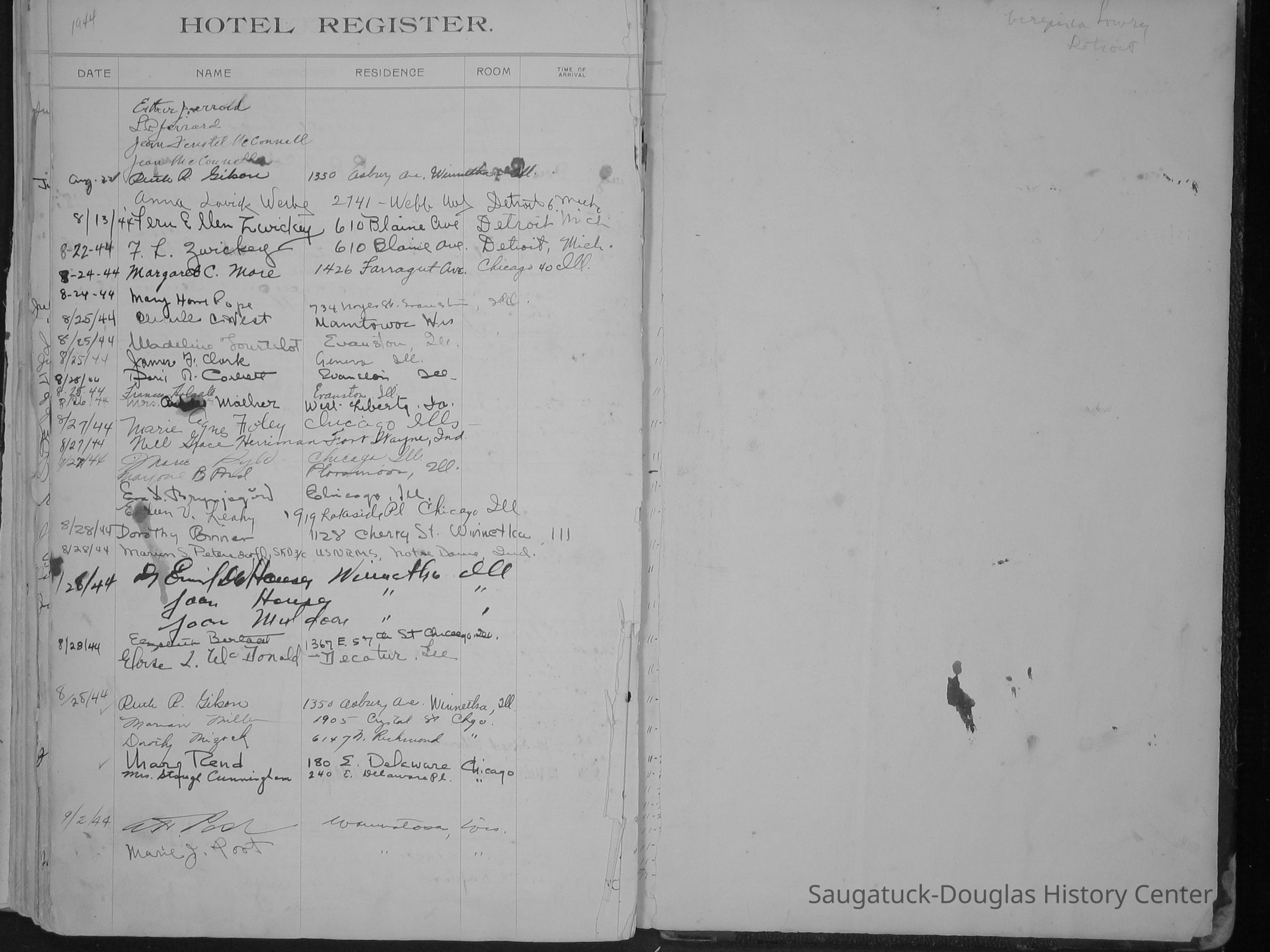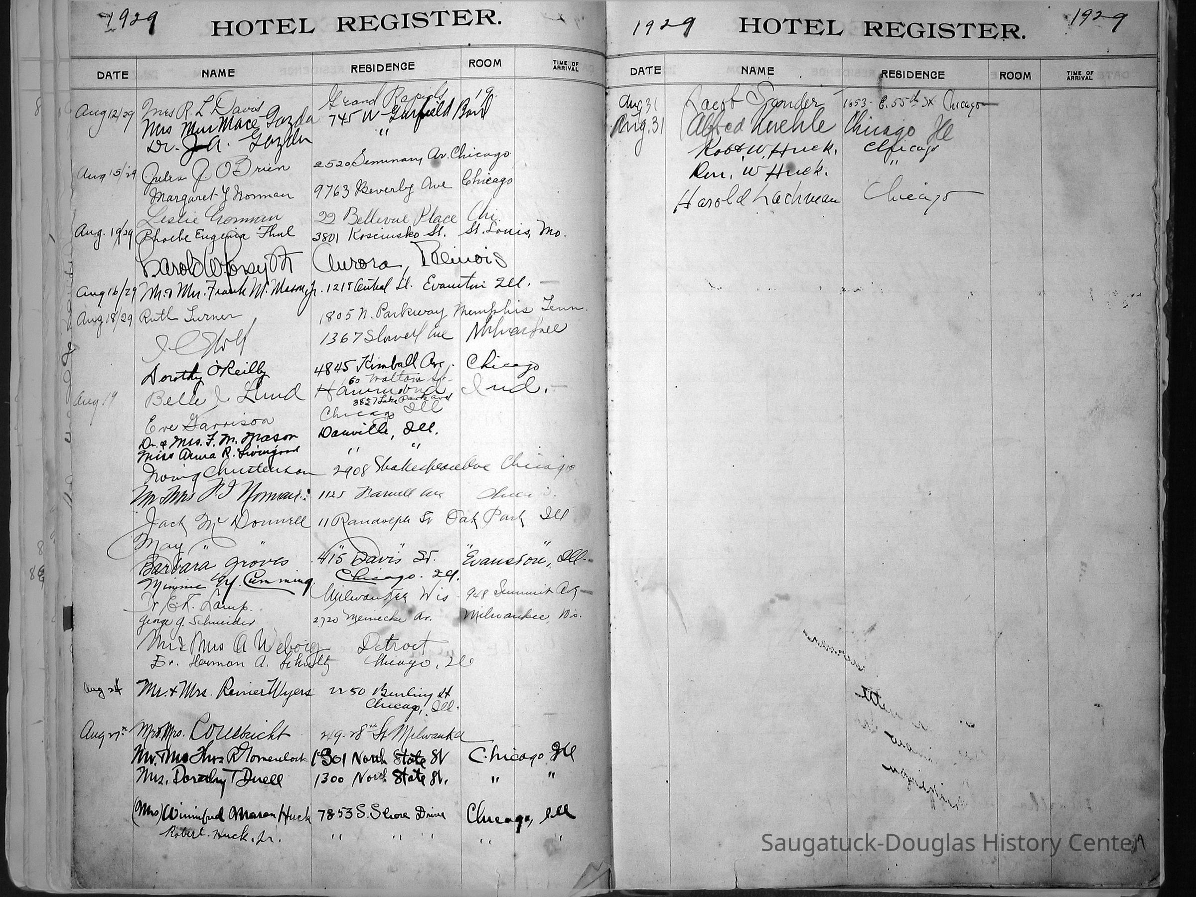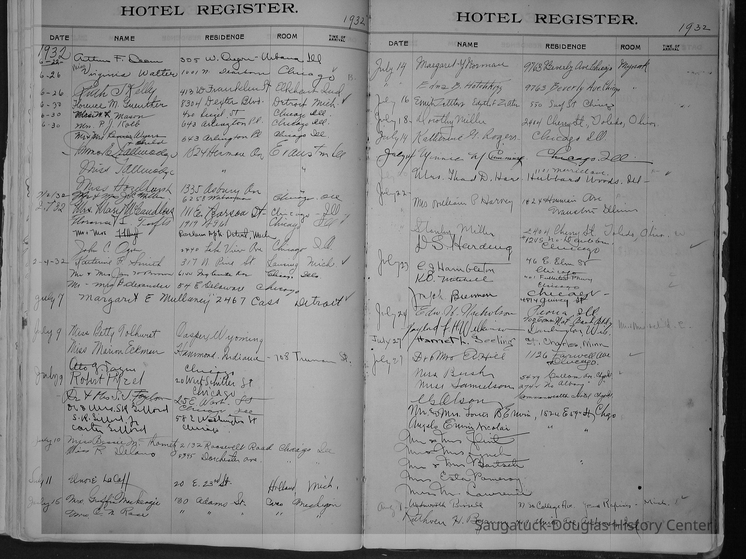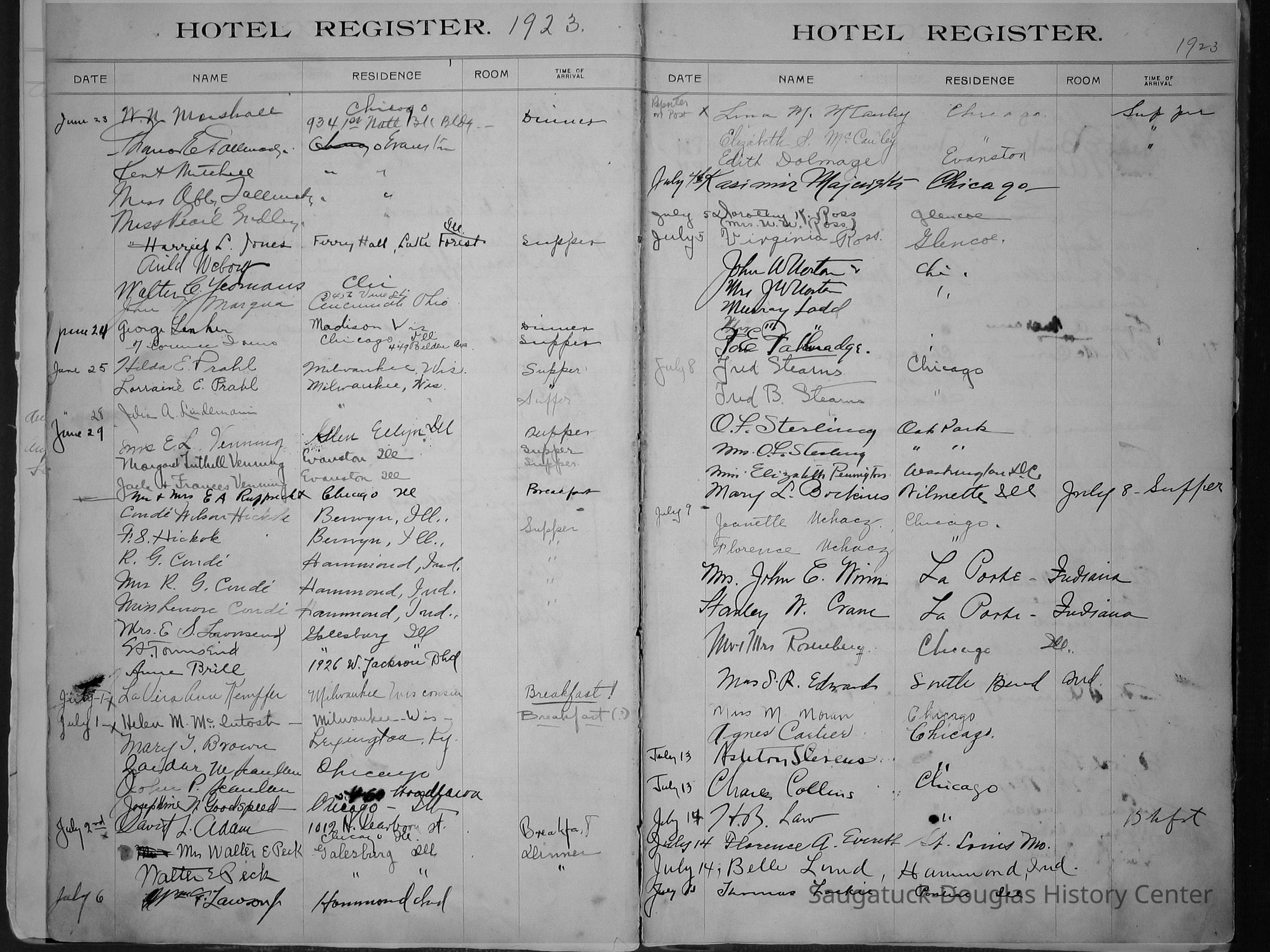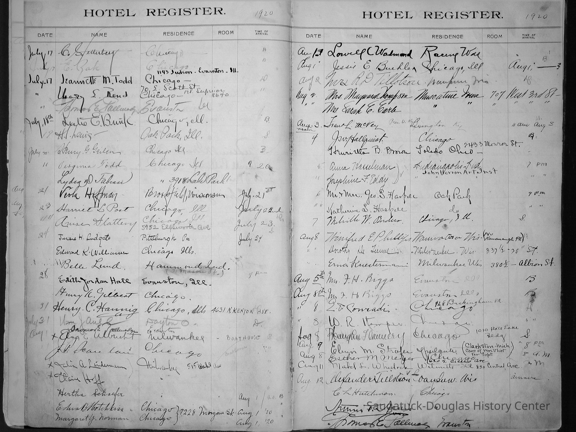 Photographs of the Ox-Bow Inn lodging register pages from 1914 to 1944. The photos were taken in June 2004 when the register was on loan from the archive of the School of the Art Institute of Chicago.
