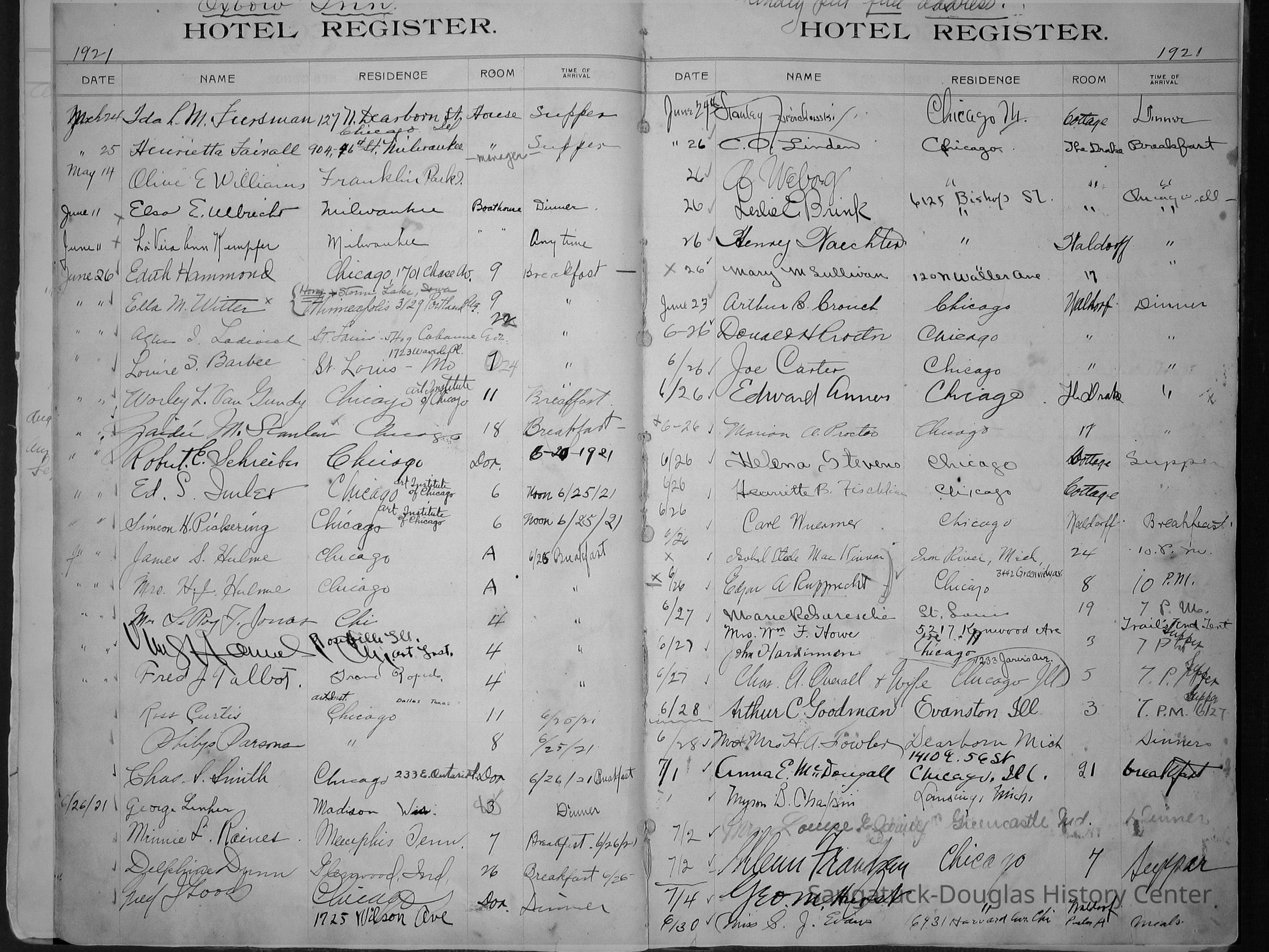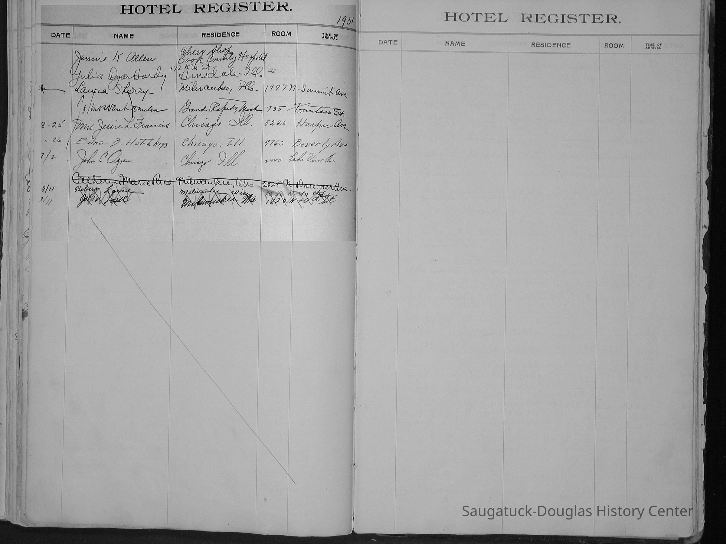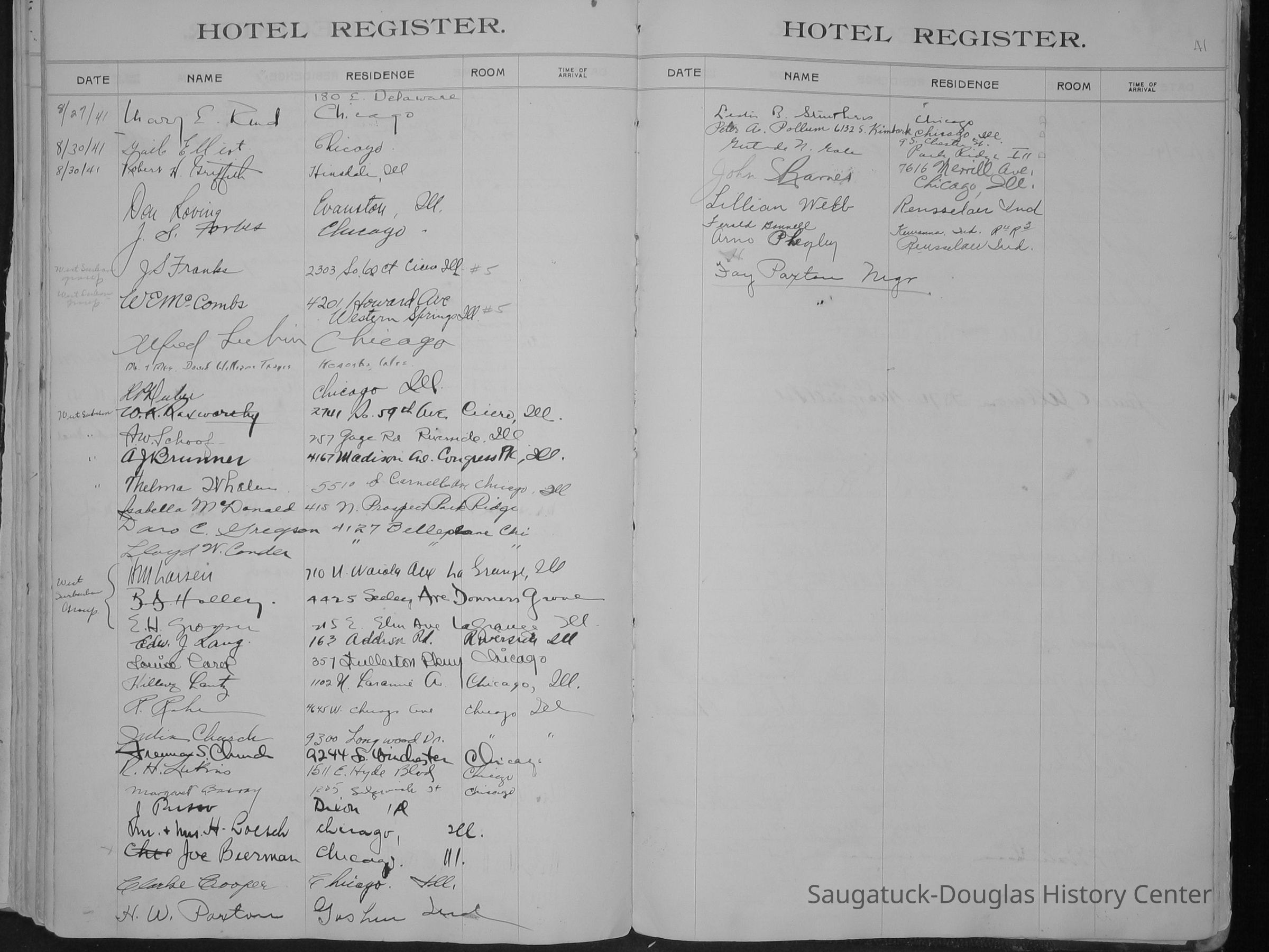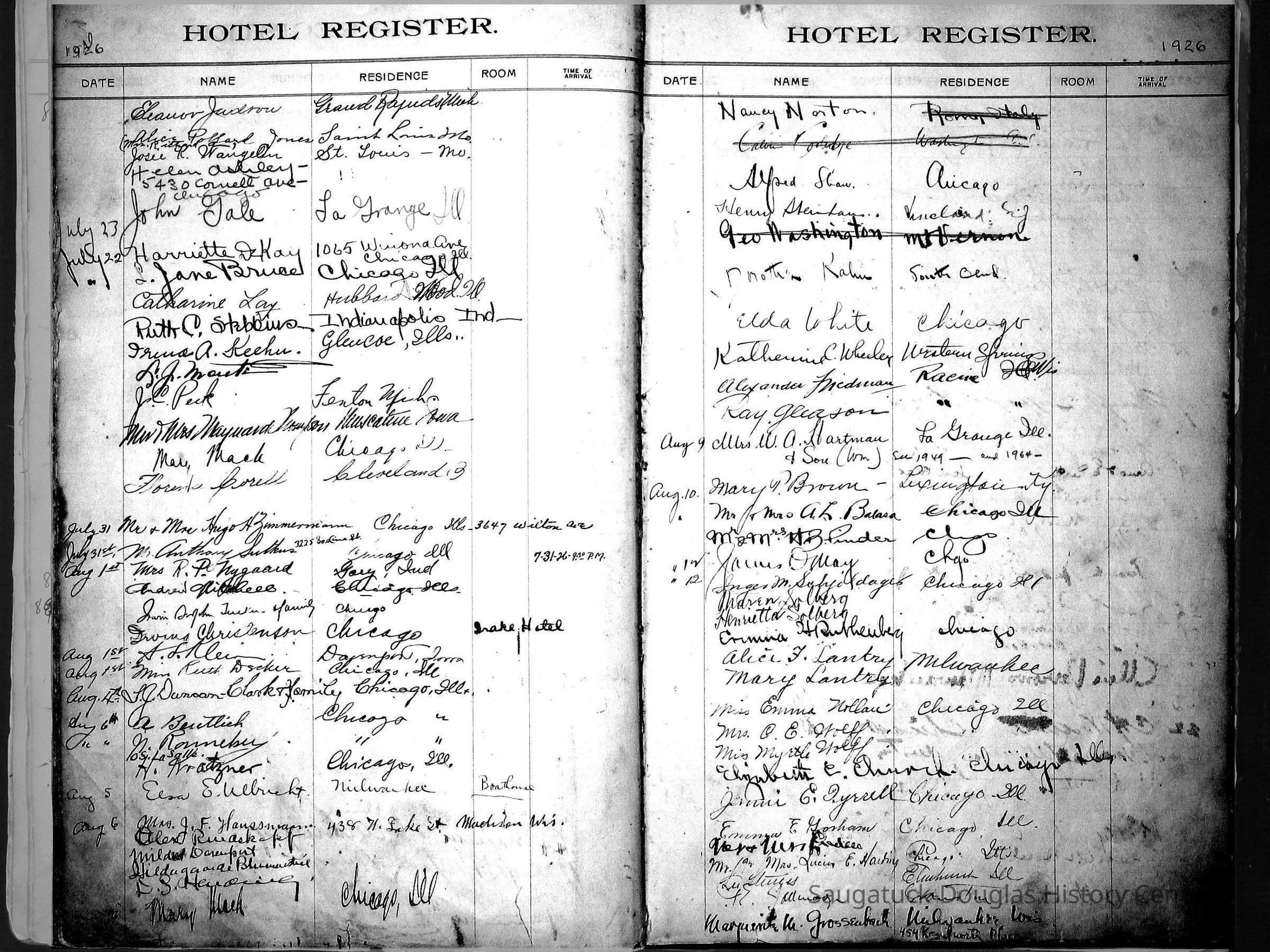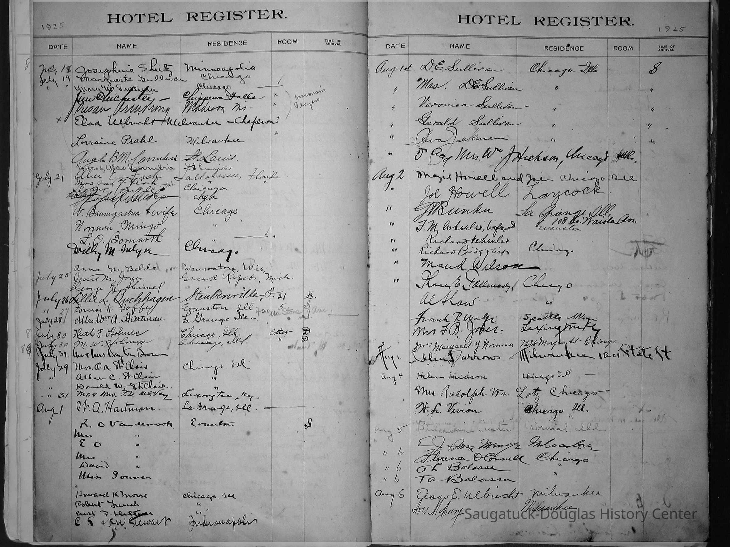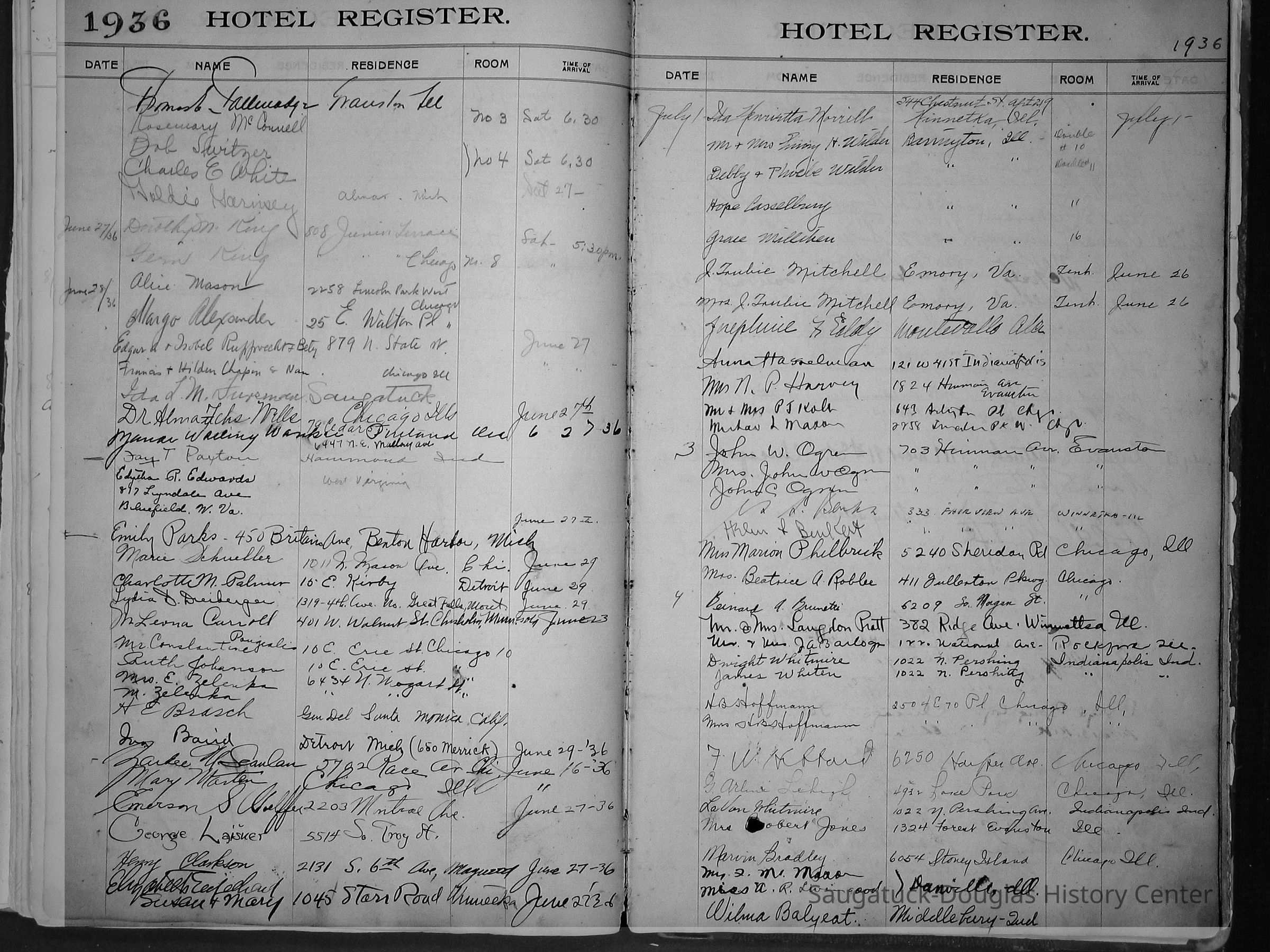Photographs of the Ox-Bow Inn lodging register pages from 1914 to 1944. The photos were taken in June 2004 when the register was on loan from the archive of the School of the Art Institute of Chicago.