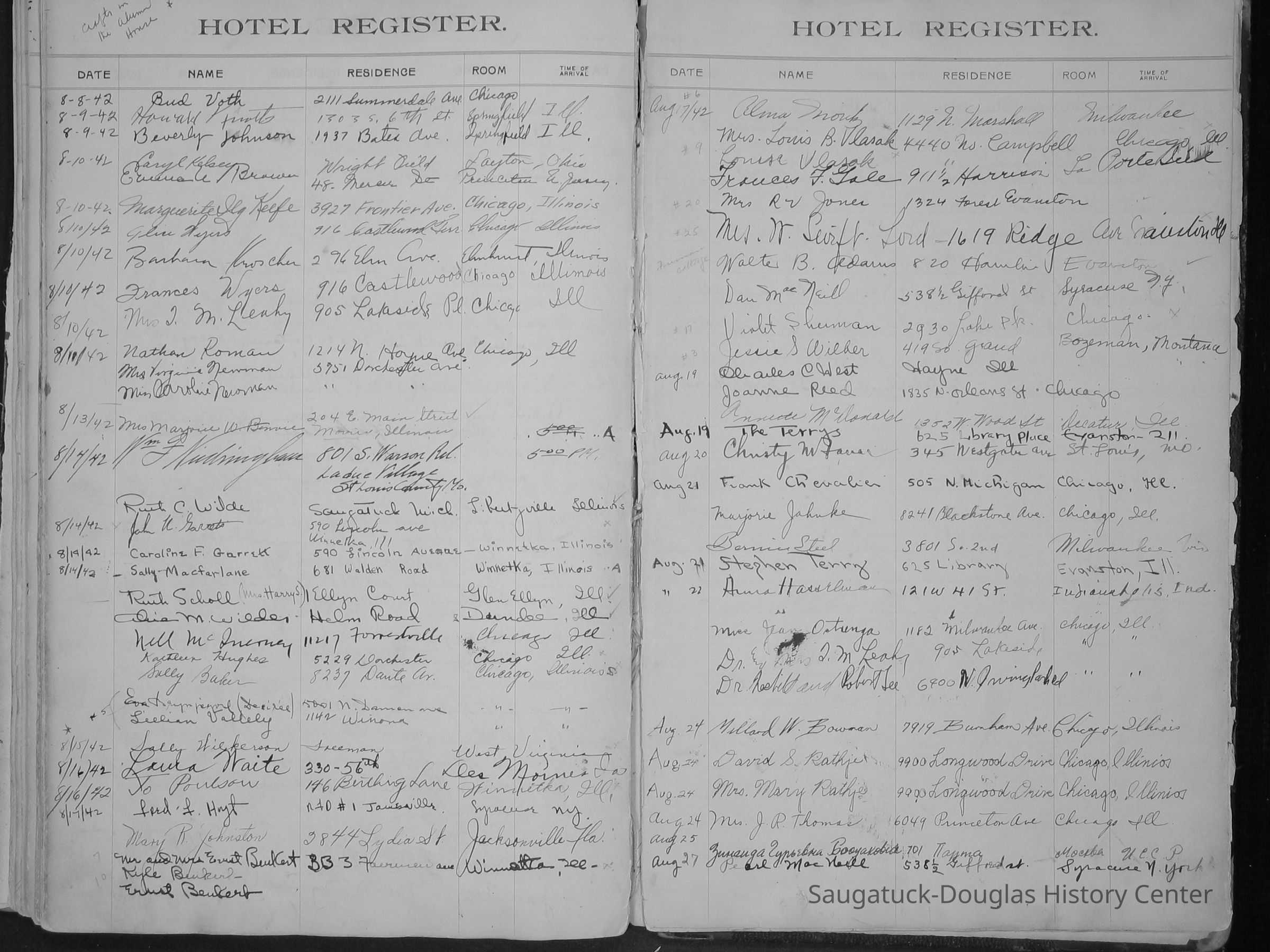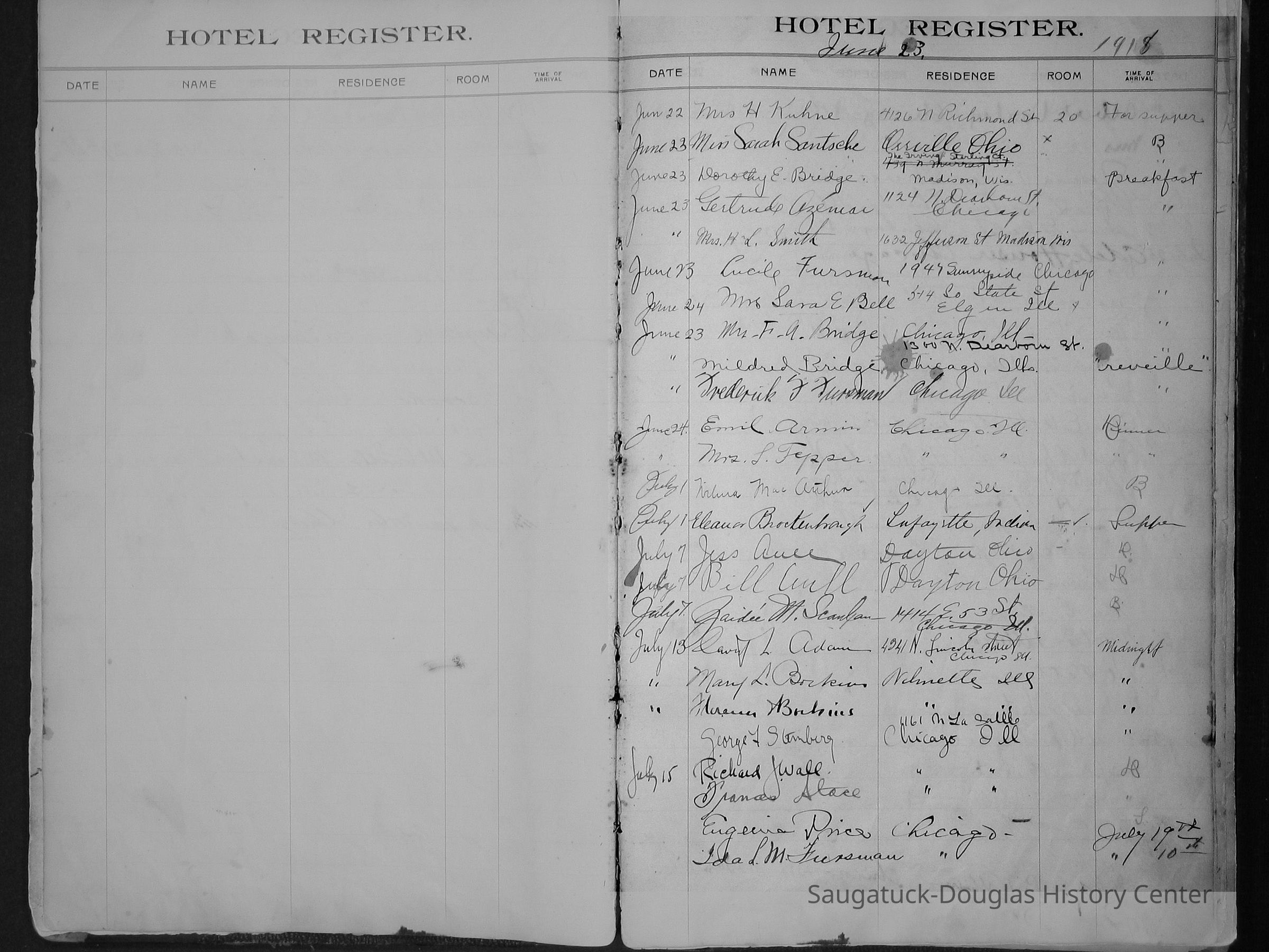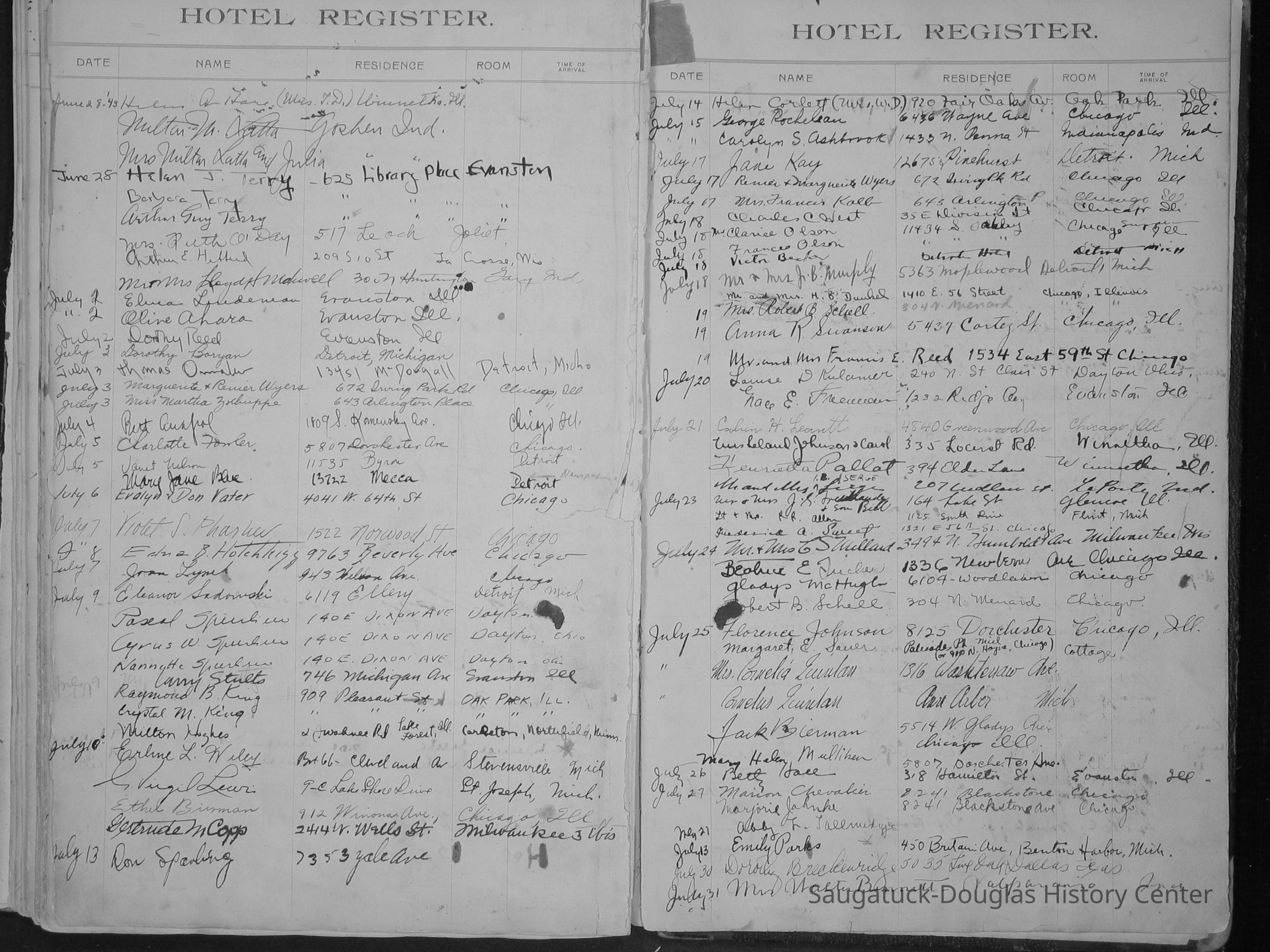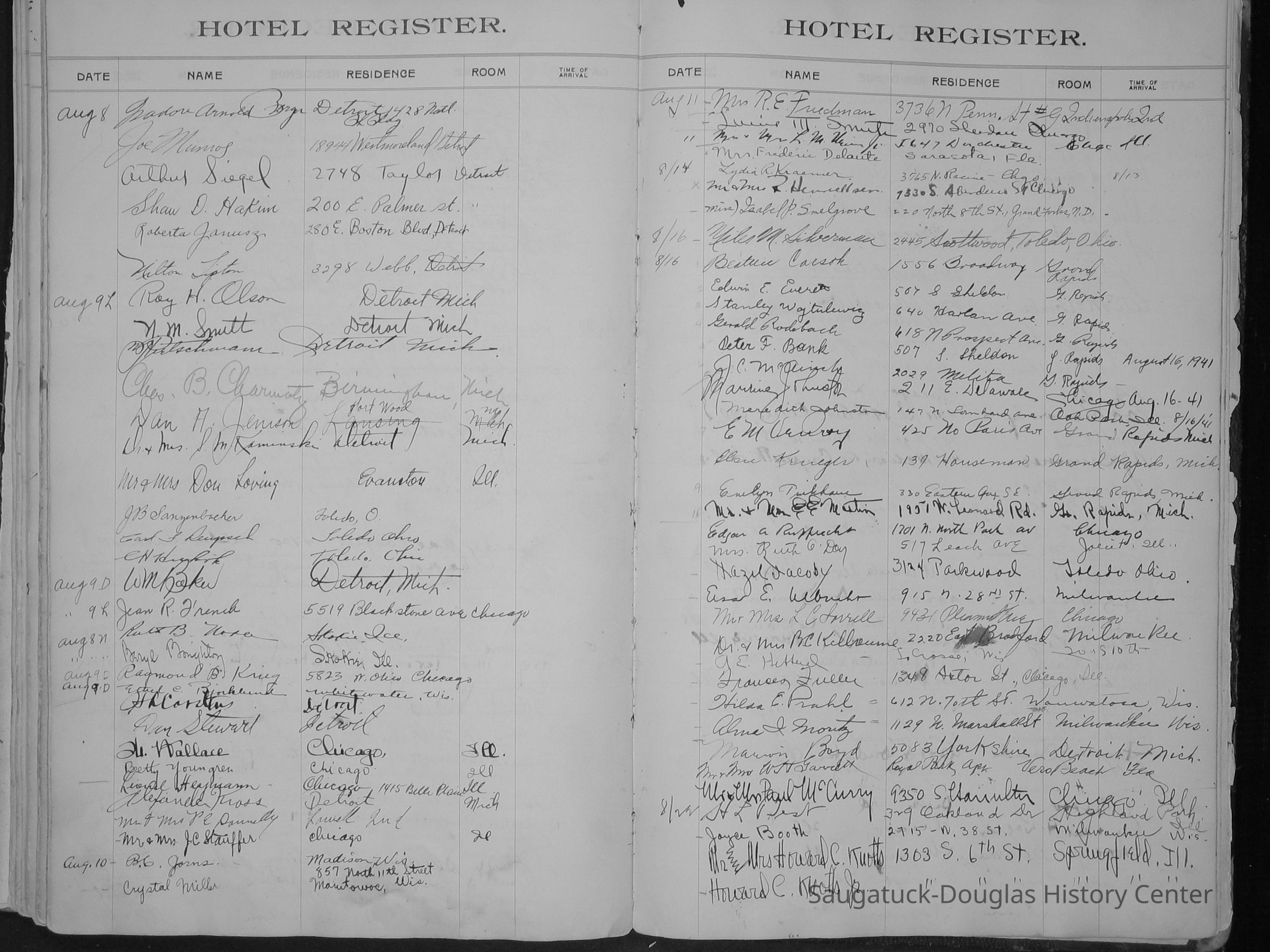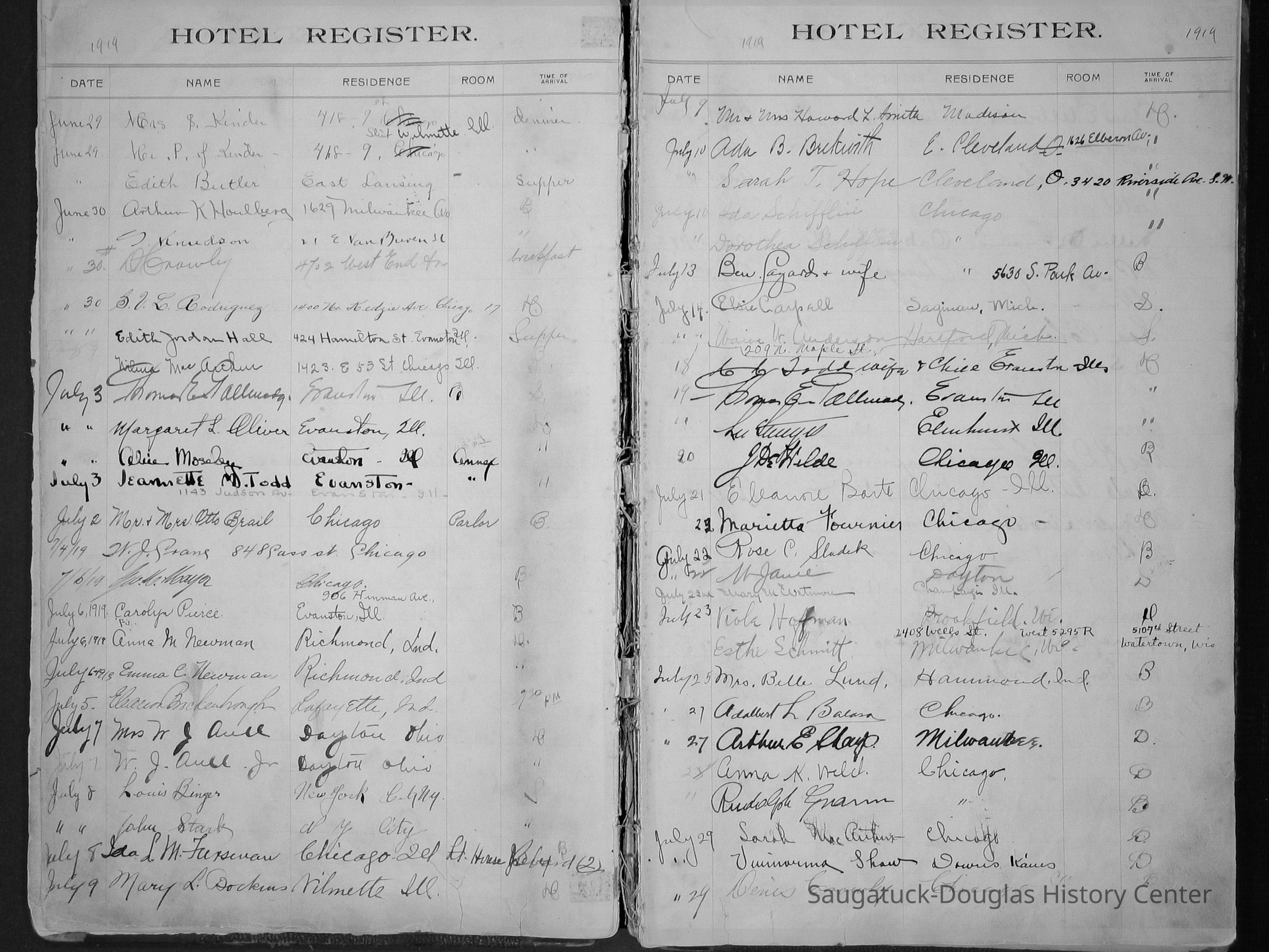 Photographs of the Ox-Bow Inn lodging register pages from 1914 to 1944. The photos were taken in June 2004 when the register was on loan from the archive of the School of the Art Institute of Chicago.