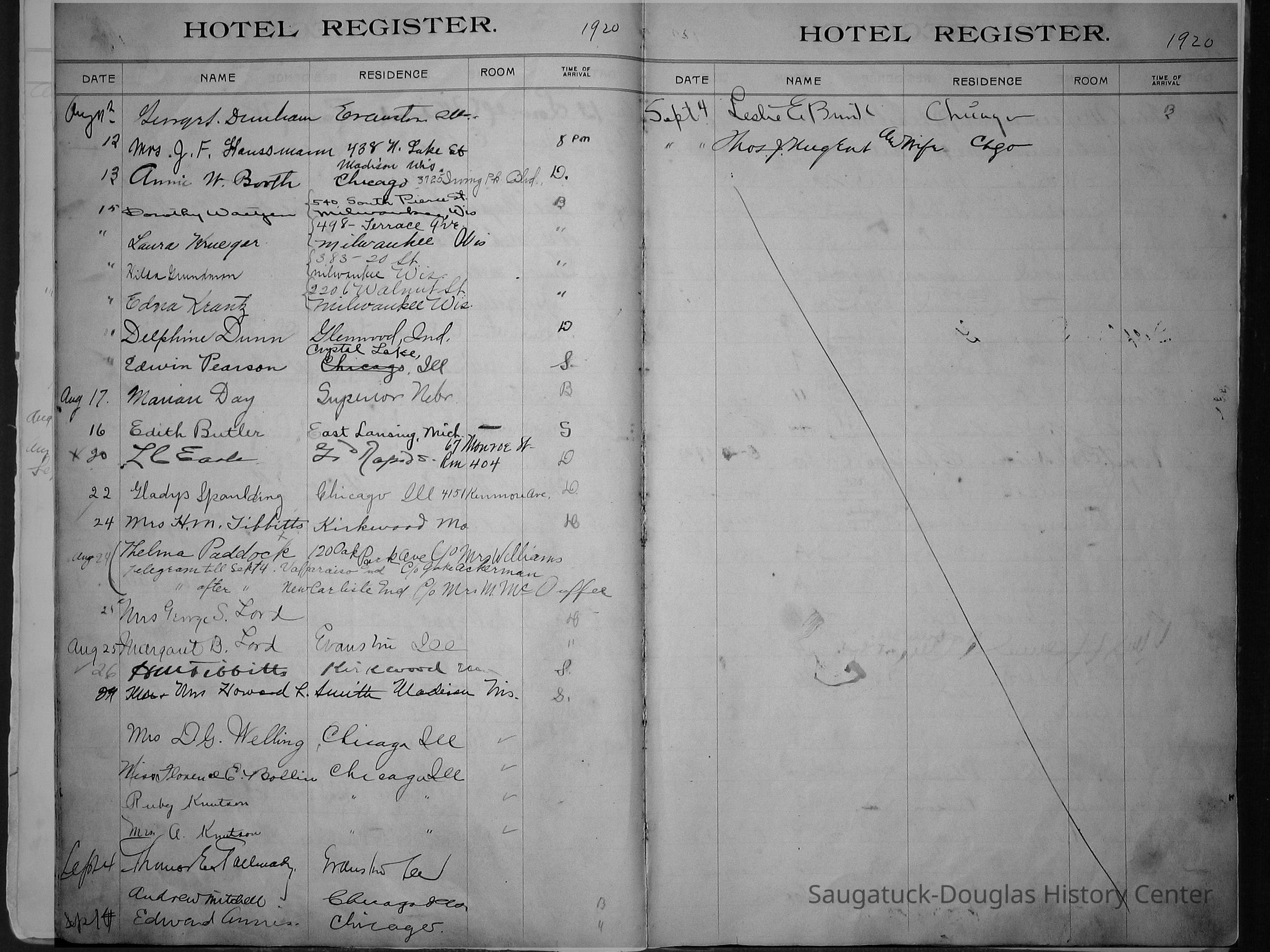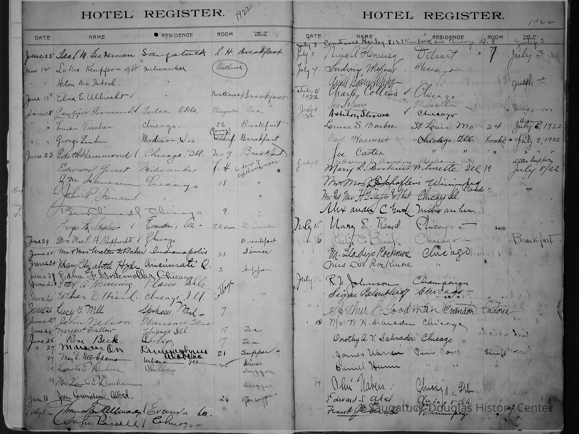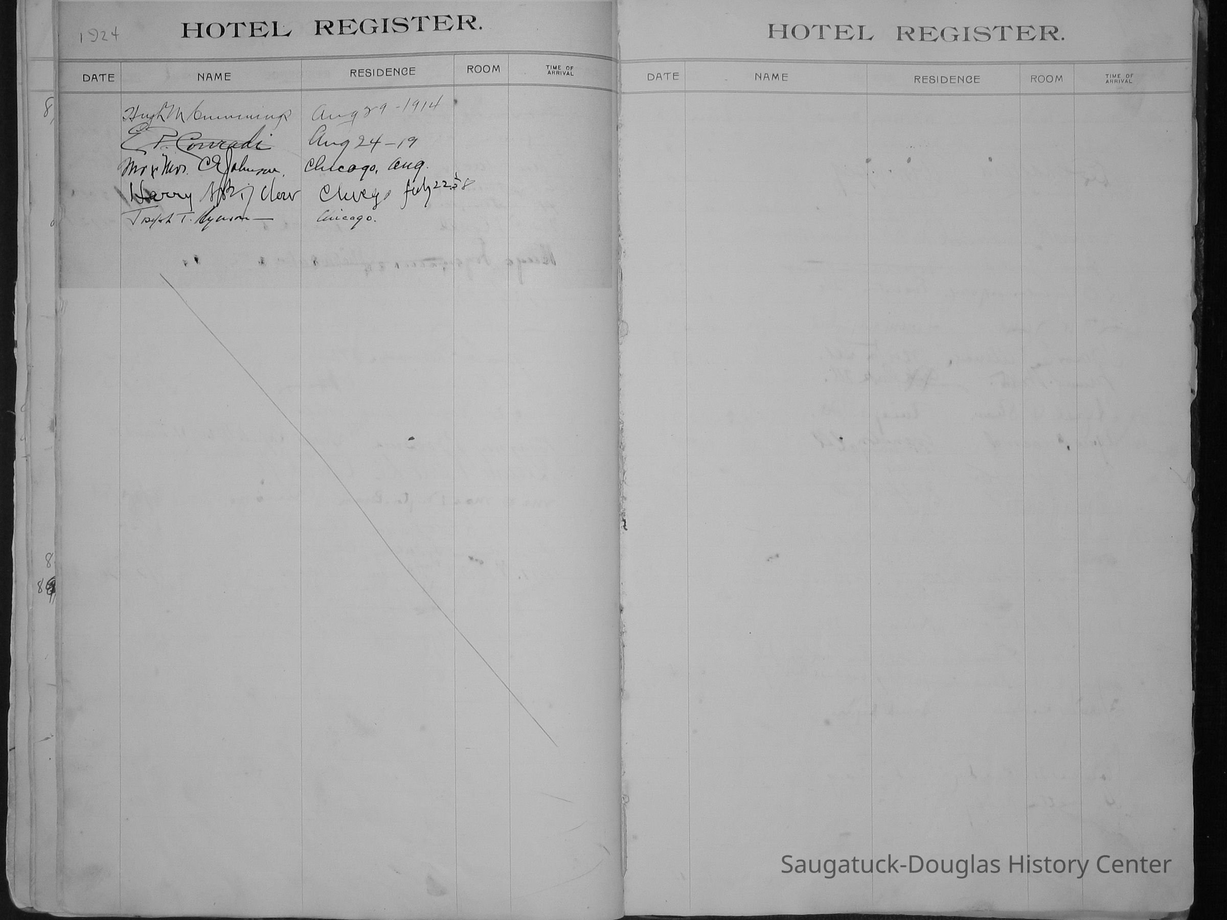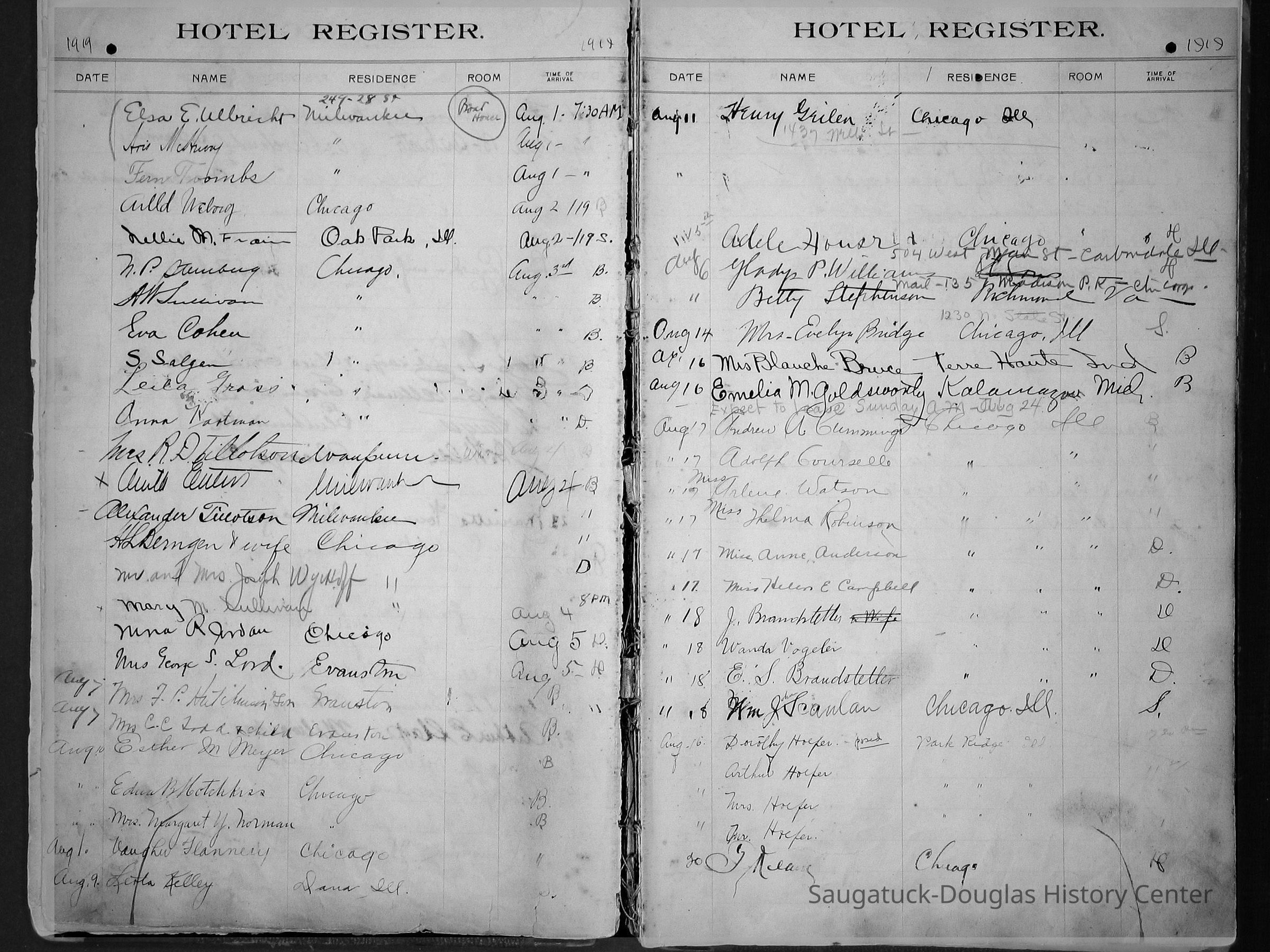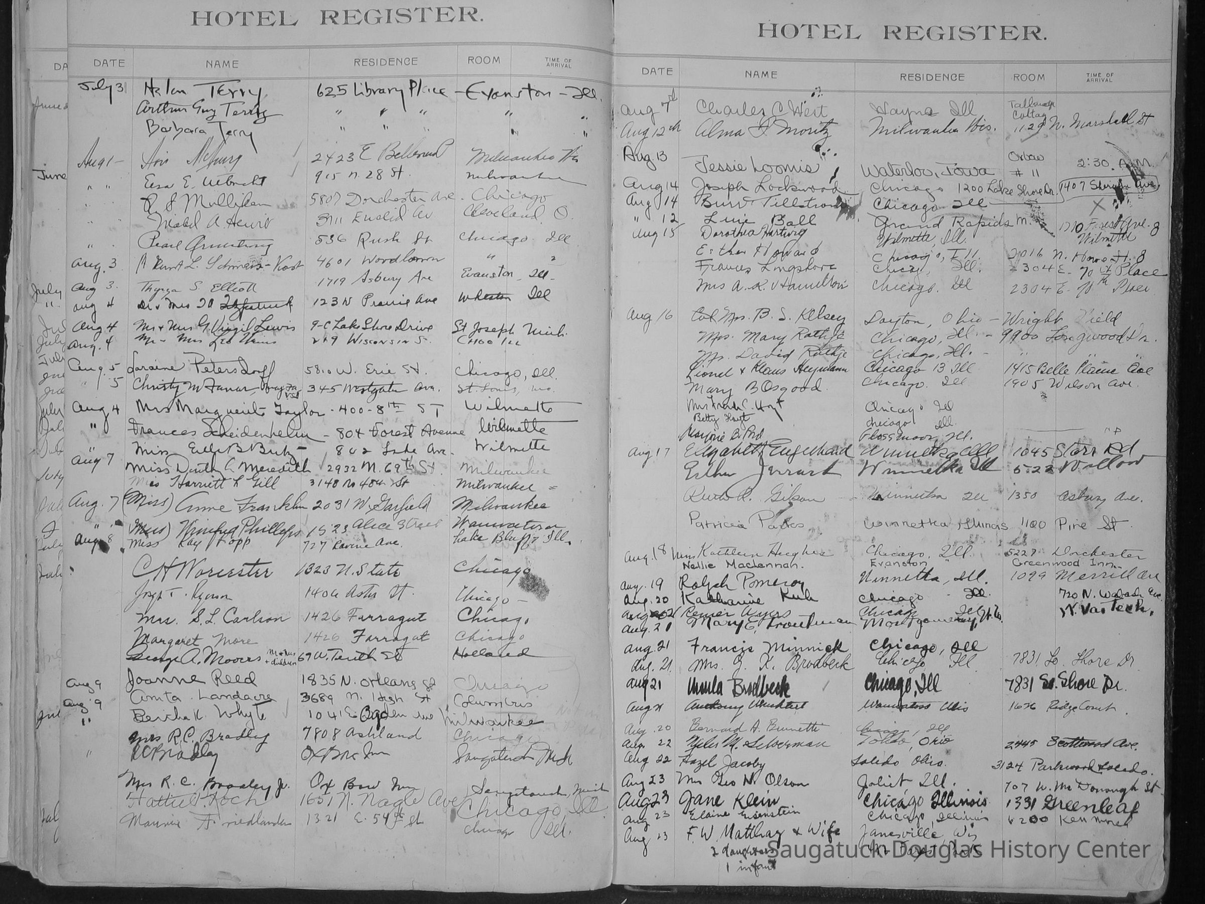 Photographs of the Ox-Bow Inn lodging register pages from 1914 to 1944. The photos were taken in June 2004 when the register was on loan from the archive of the School of the Art Institute of Chicago.