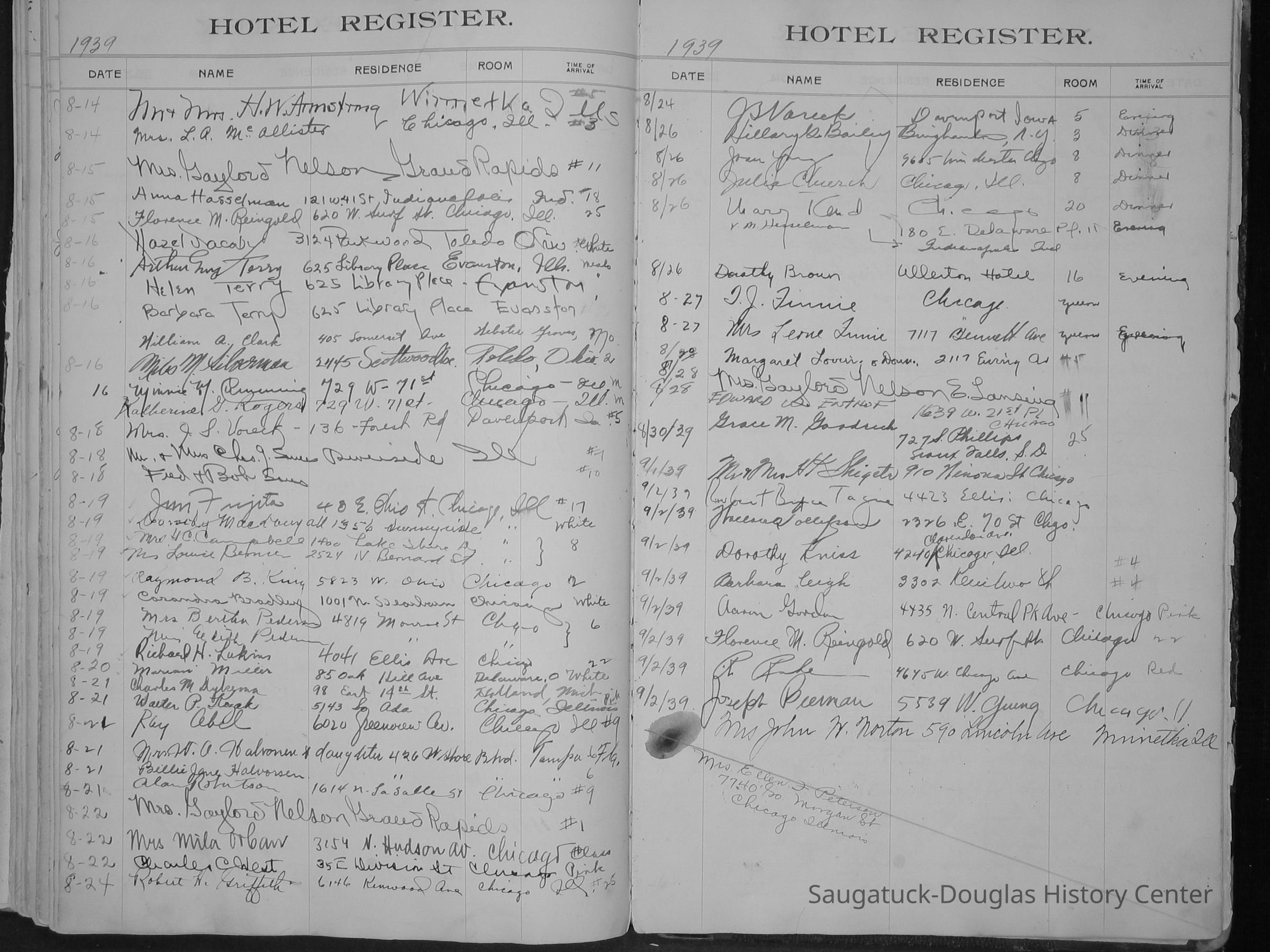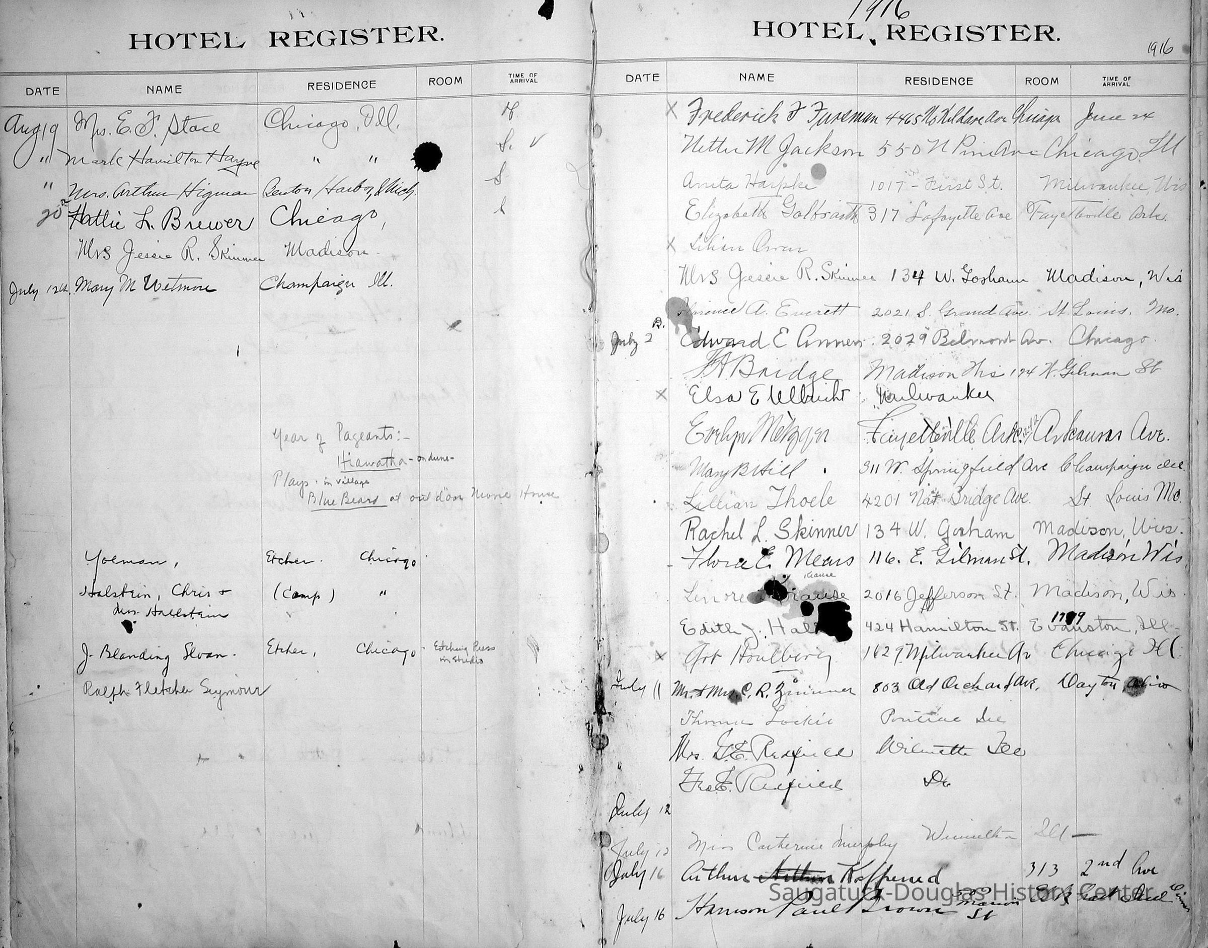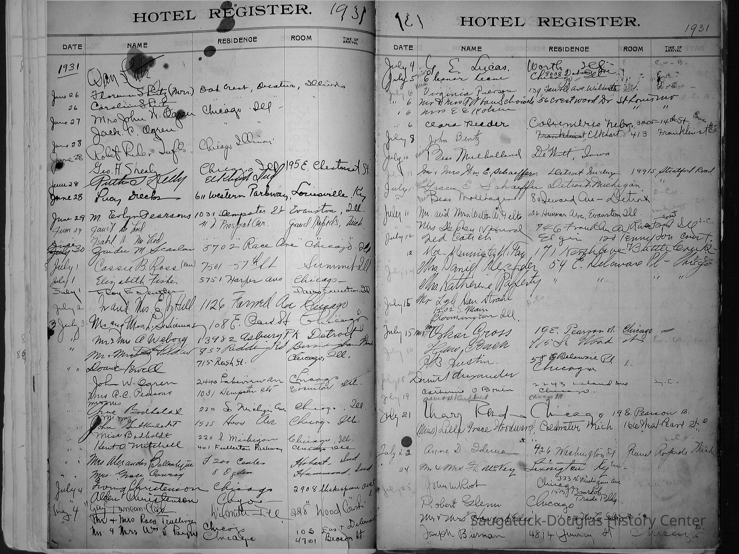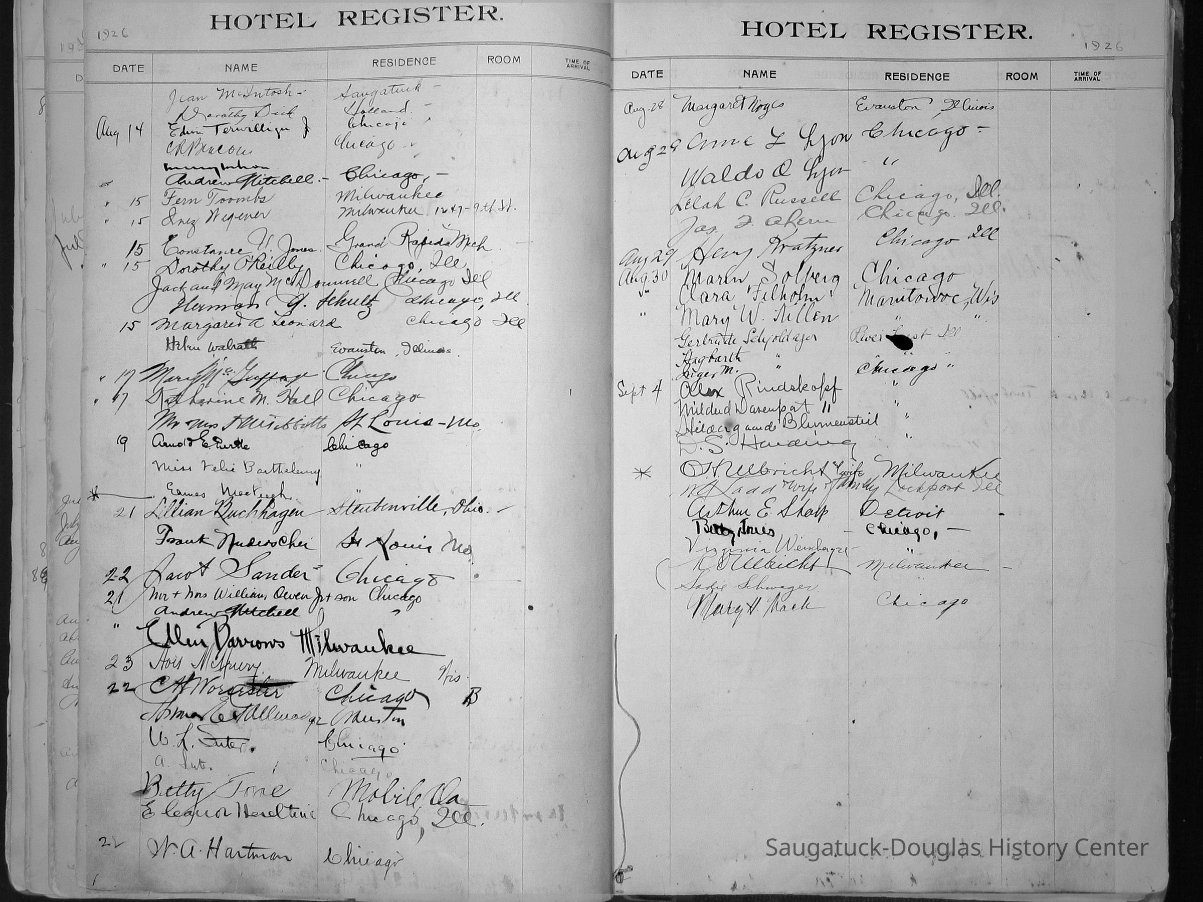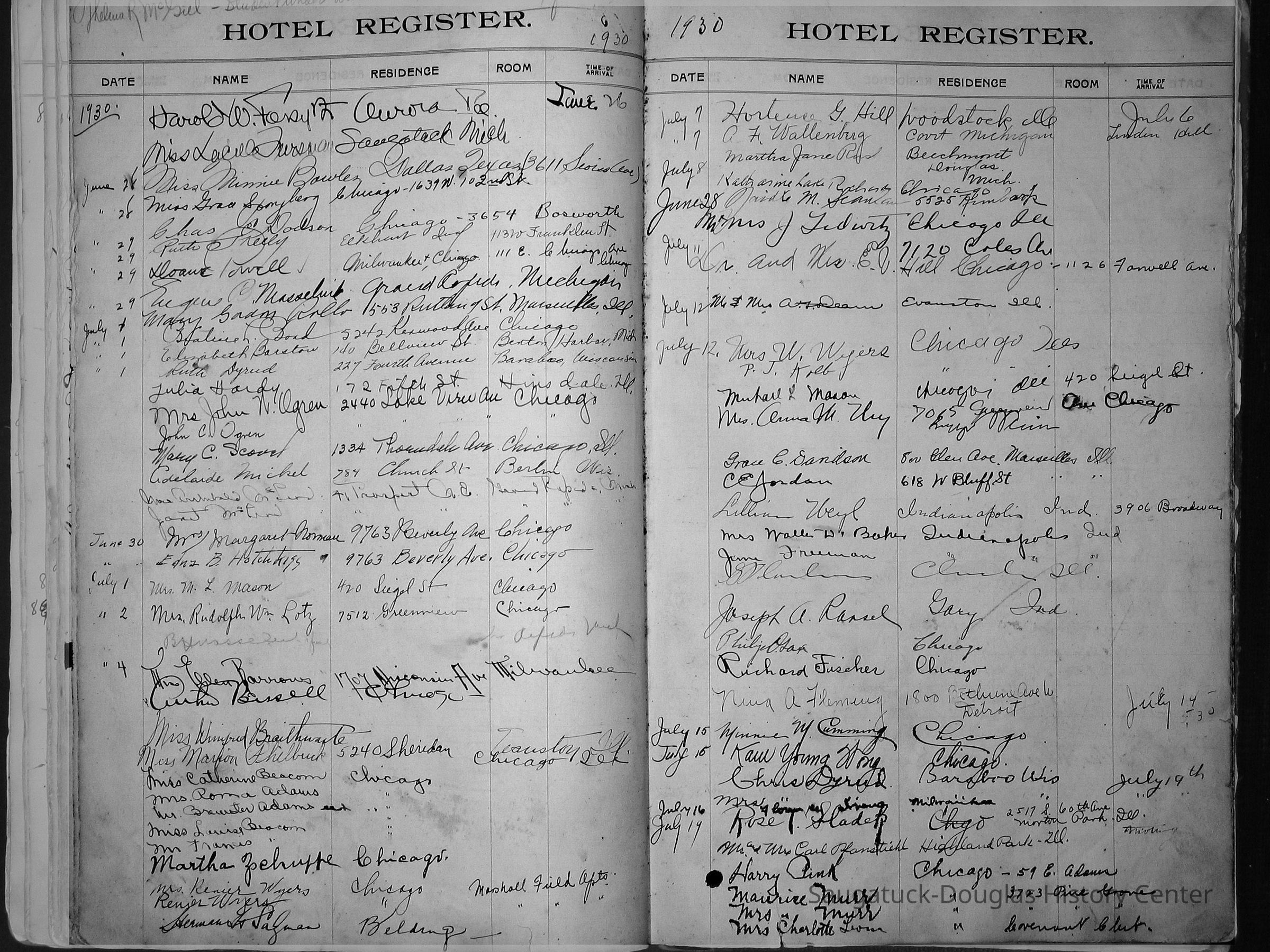 Photographs of the Ox-Bow Inn lodging register pages from 1914 to 1944. The photos were taken in June 2004 when the register was on loan from the archive of the School of the Art Institute of Chicago.