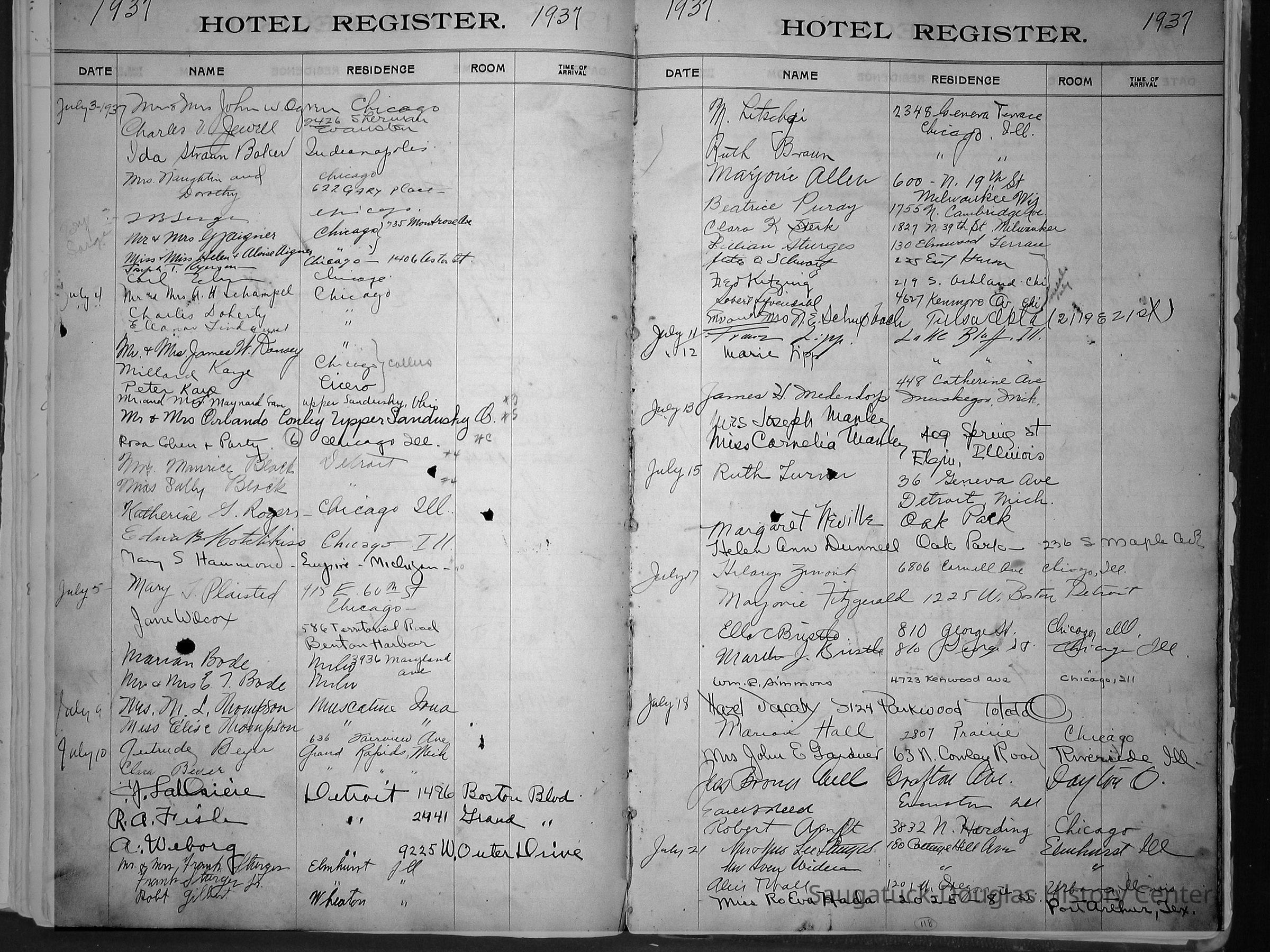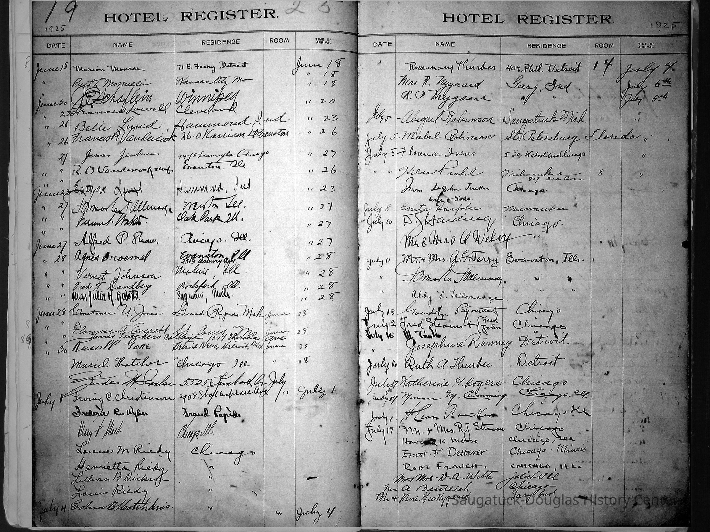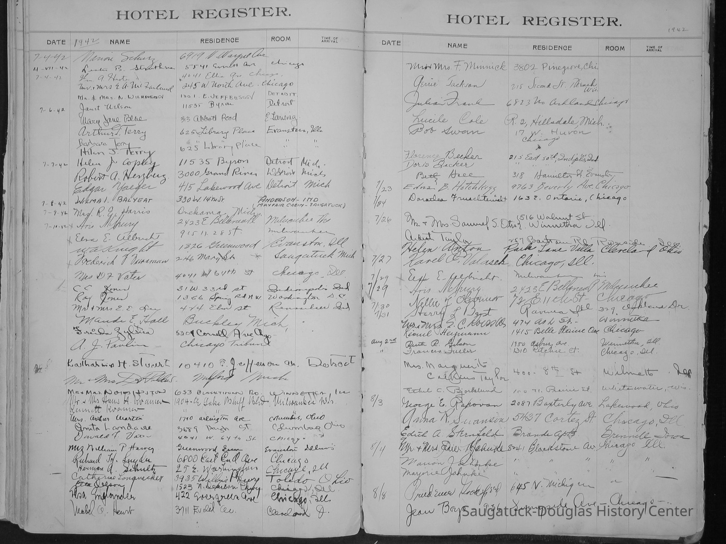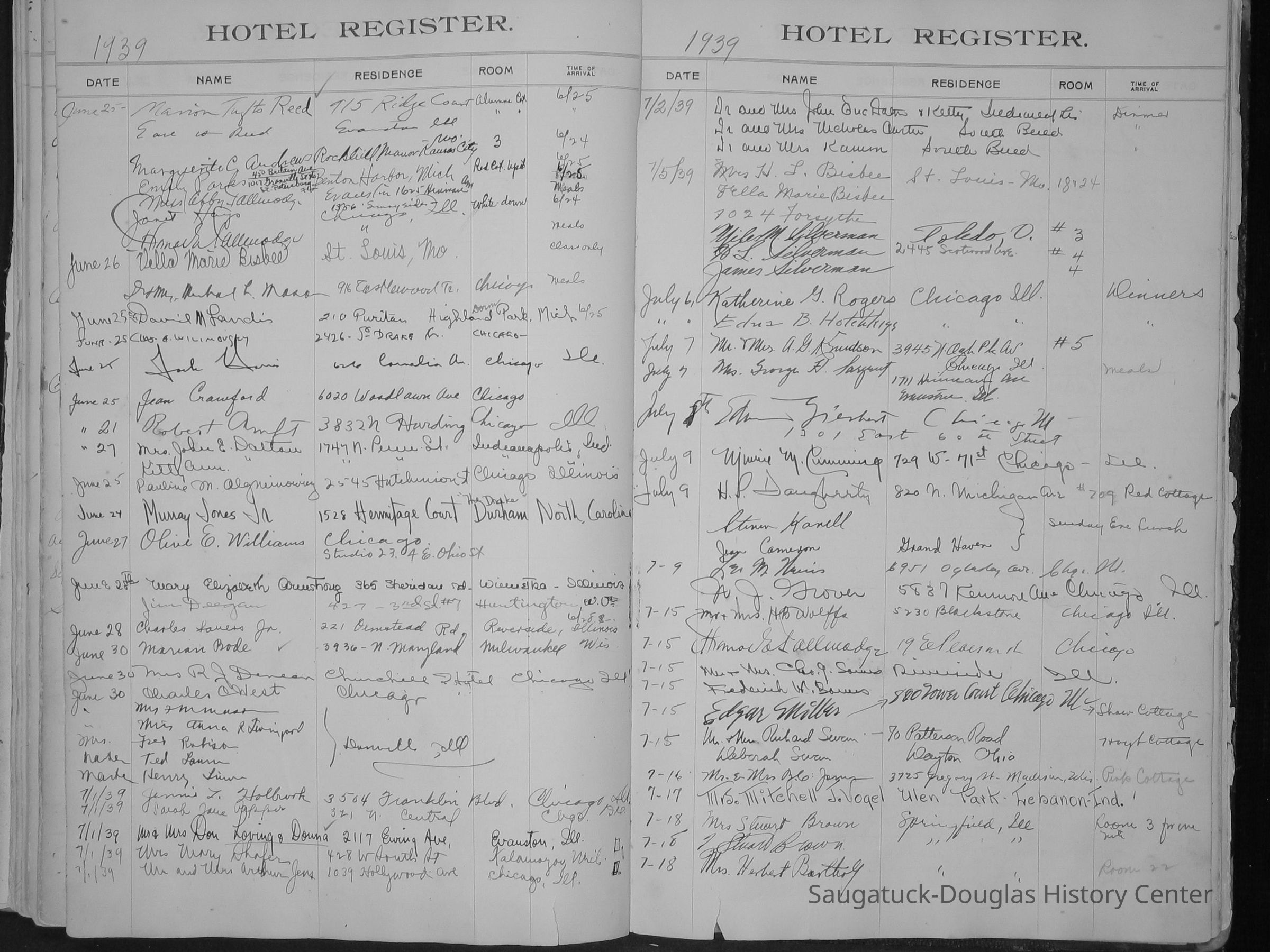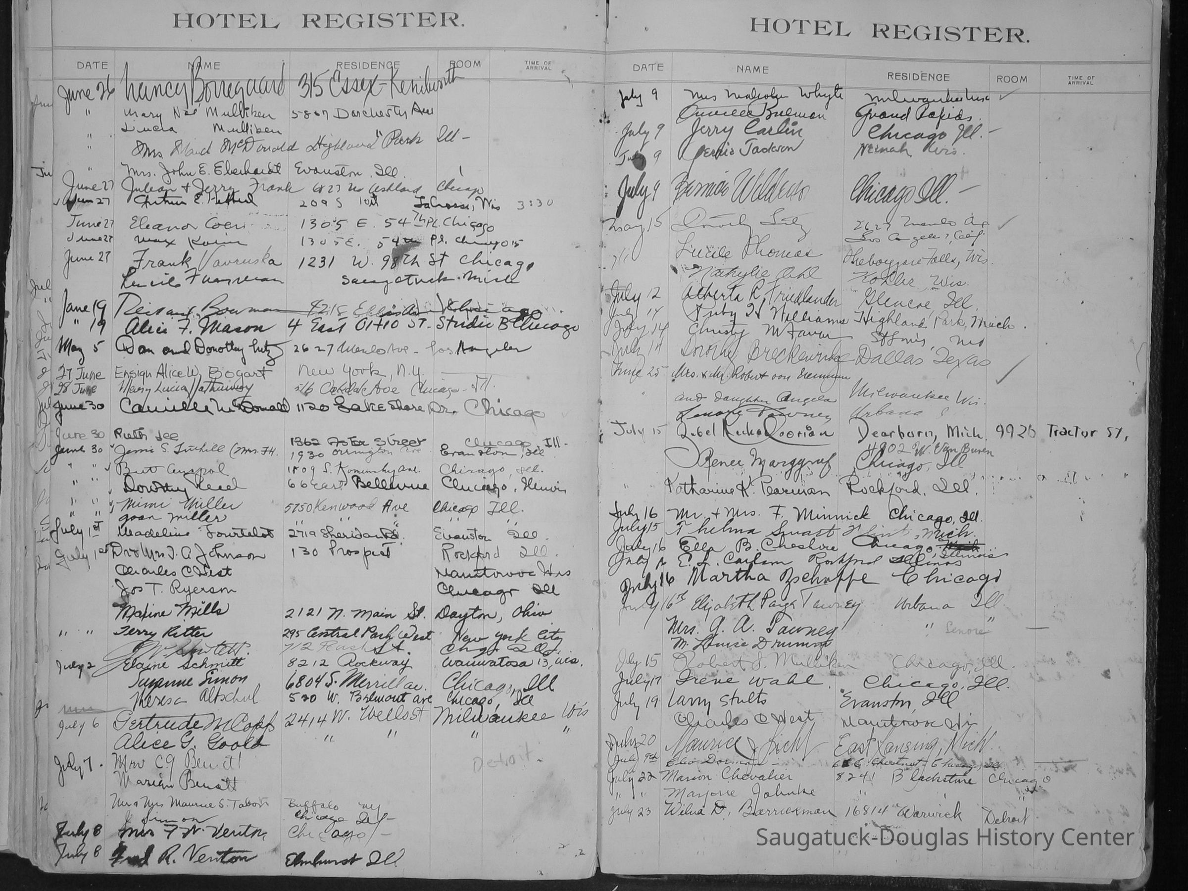 Photographs of the Ox-Bow Inn lodging register pages from 1914 to 1944. The photos were taken in June 2004 when the register was on loan from the archive of the School of the Art Institute of Chicago.