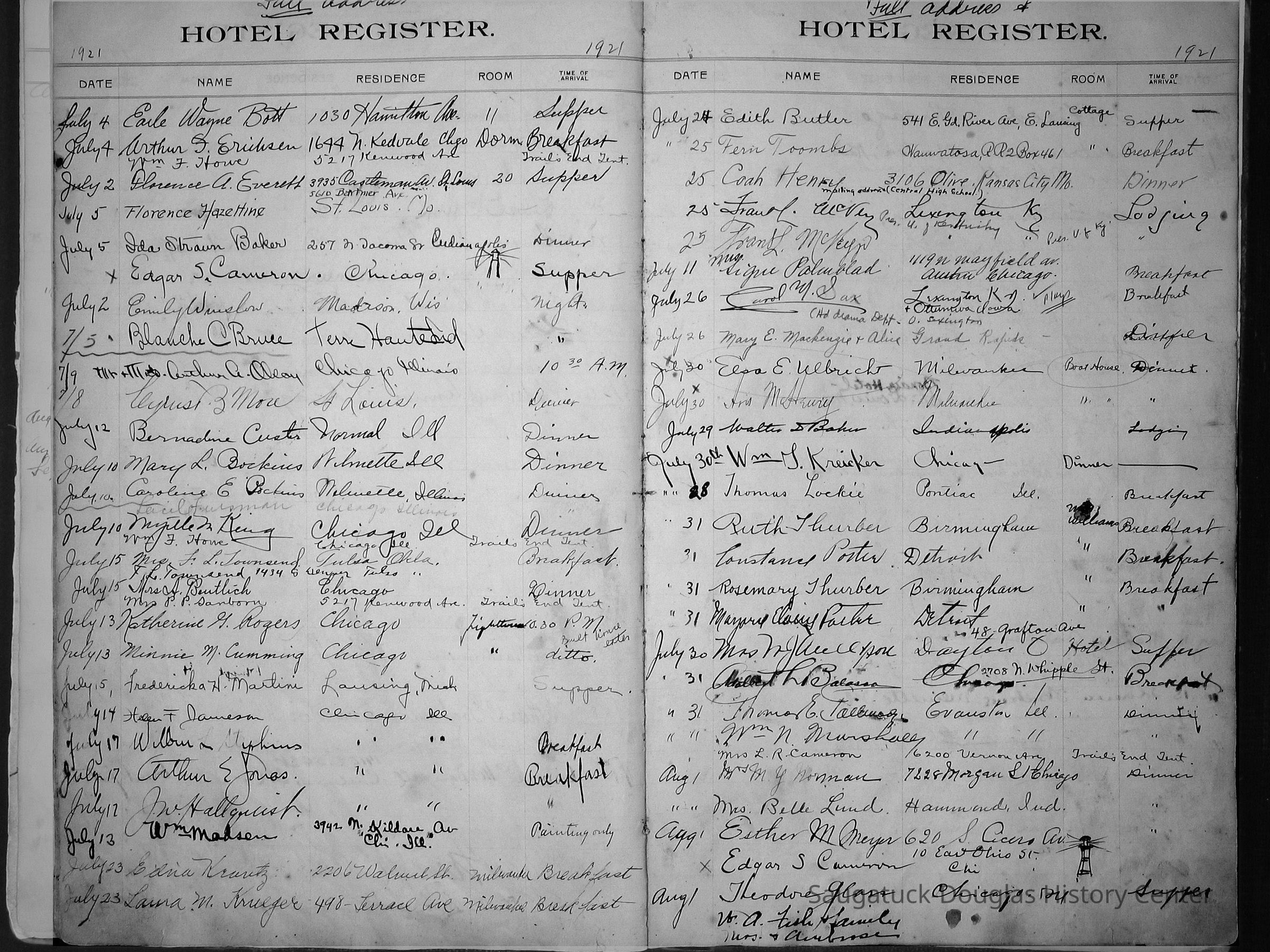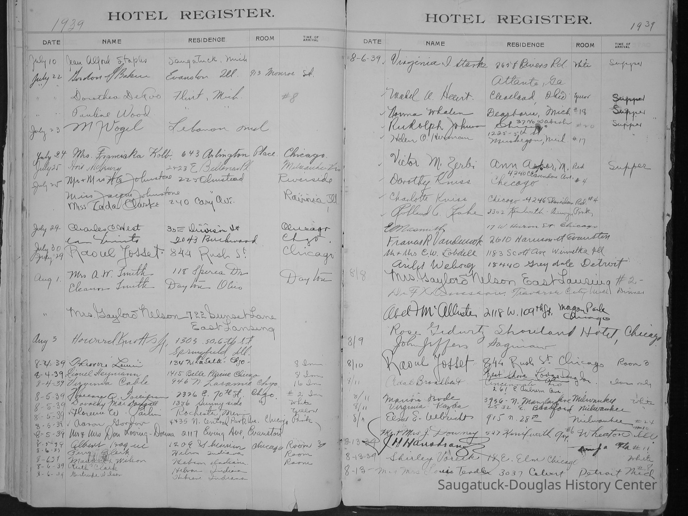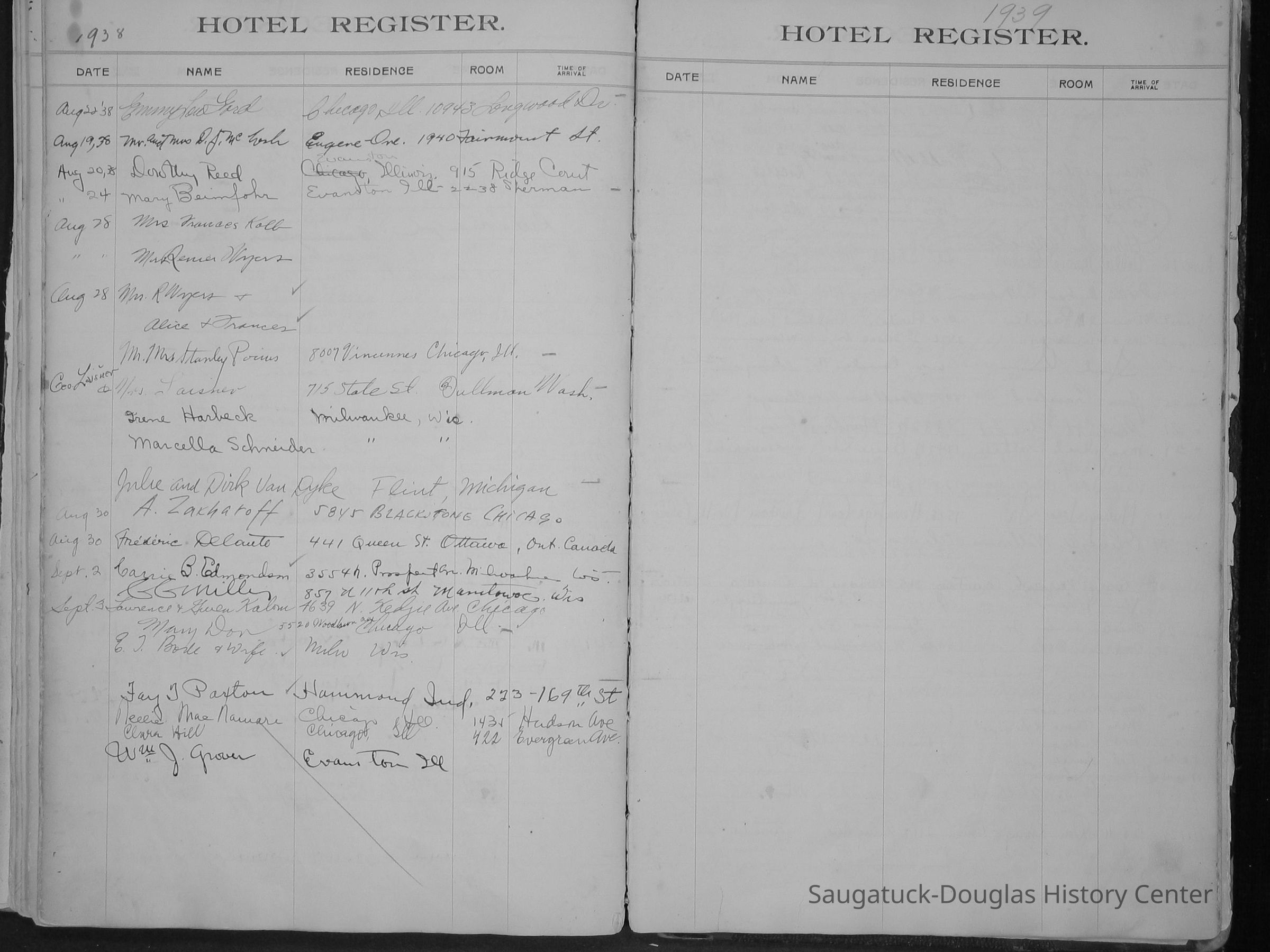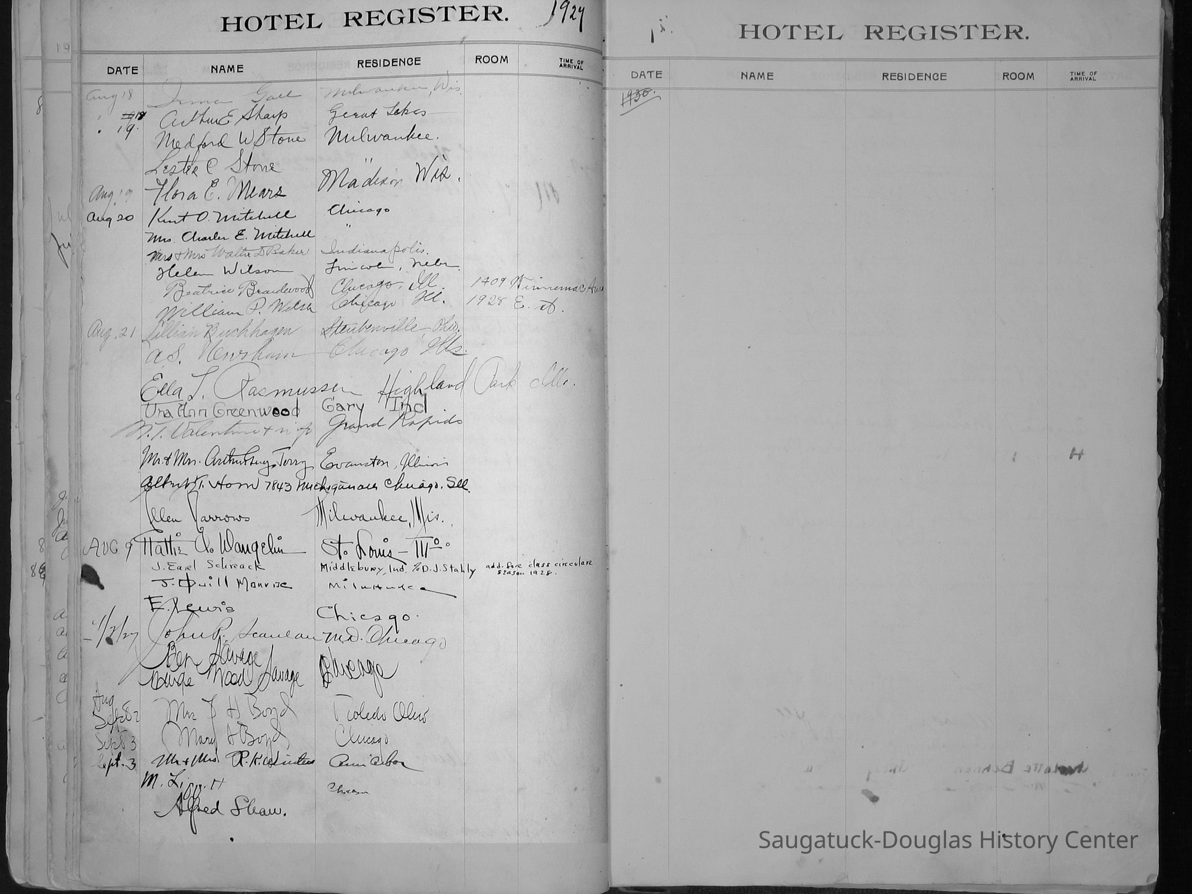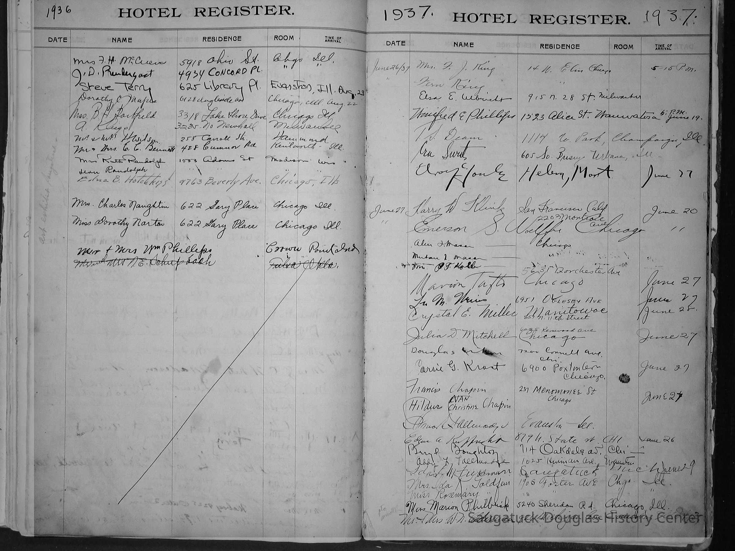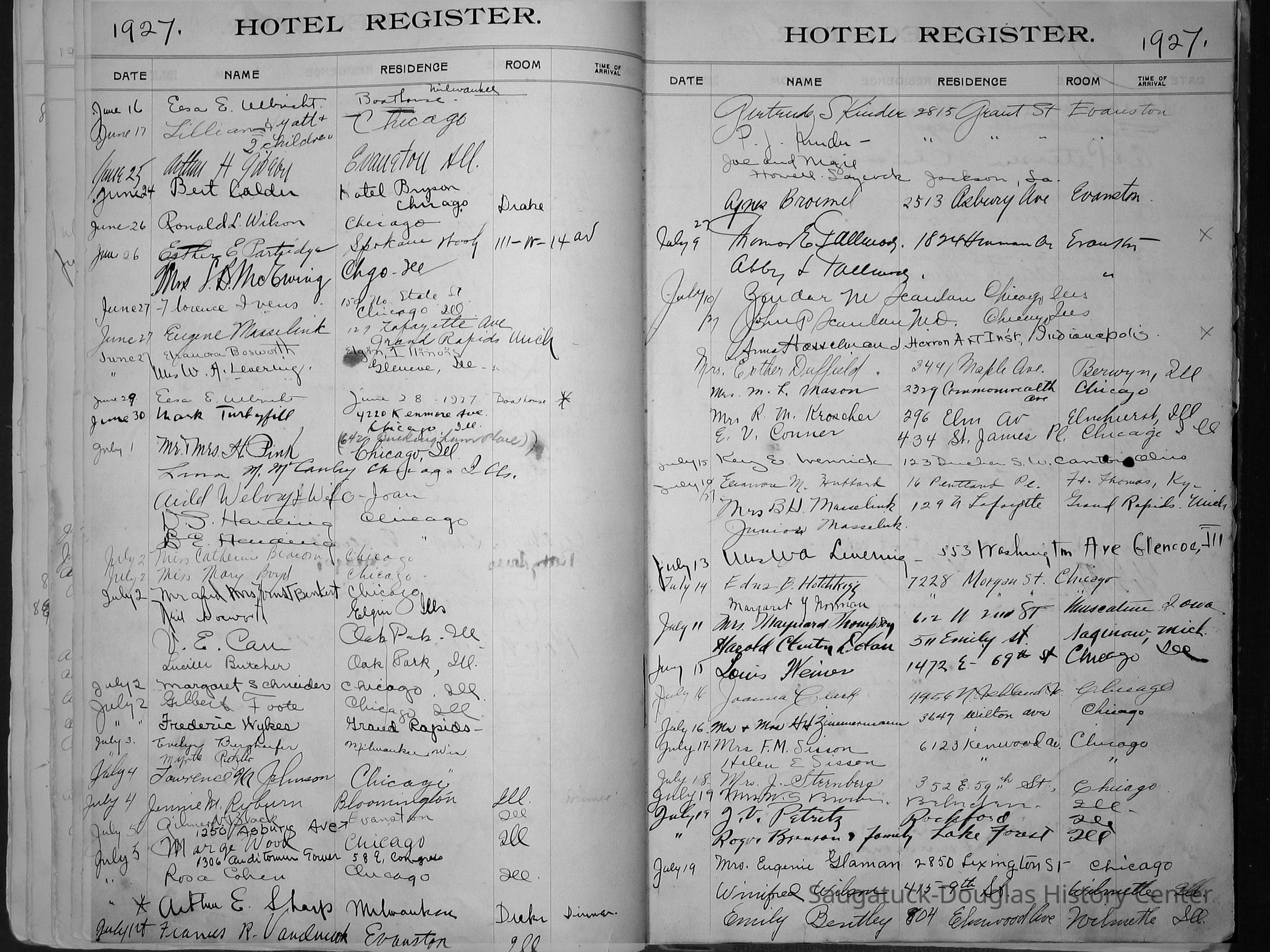 Photographs of the Ox-Bow Inn lodging register pages from 1914 to 1944. The photos were taken in June 2004 when the register was on loan from the archive of the School of the Art Institute of Chicago.