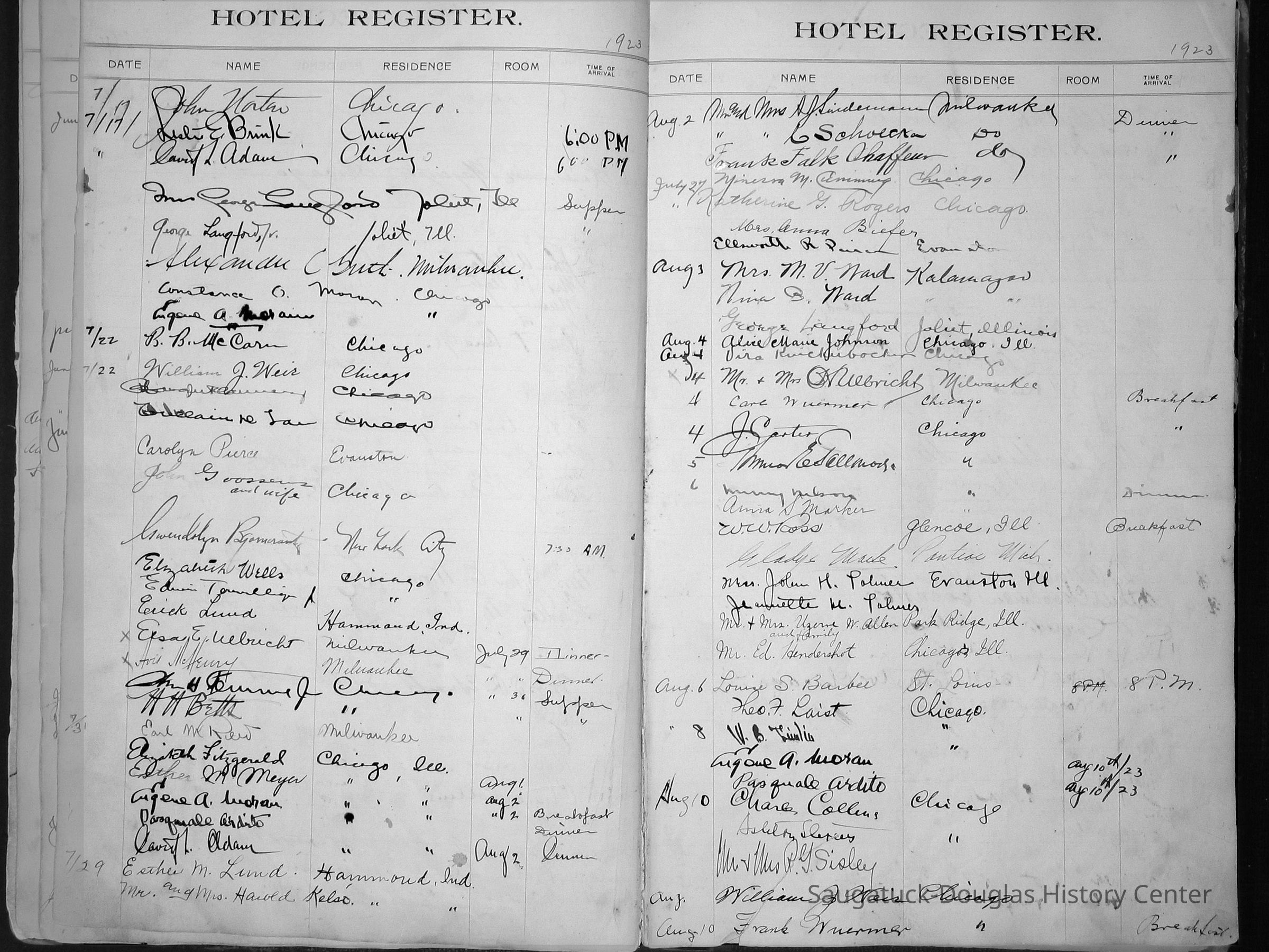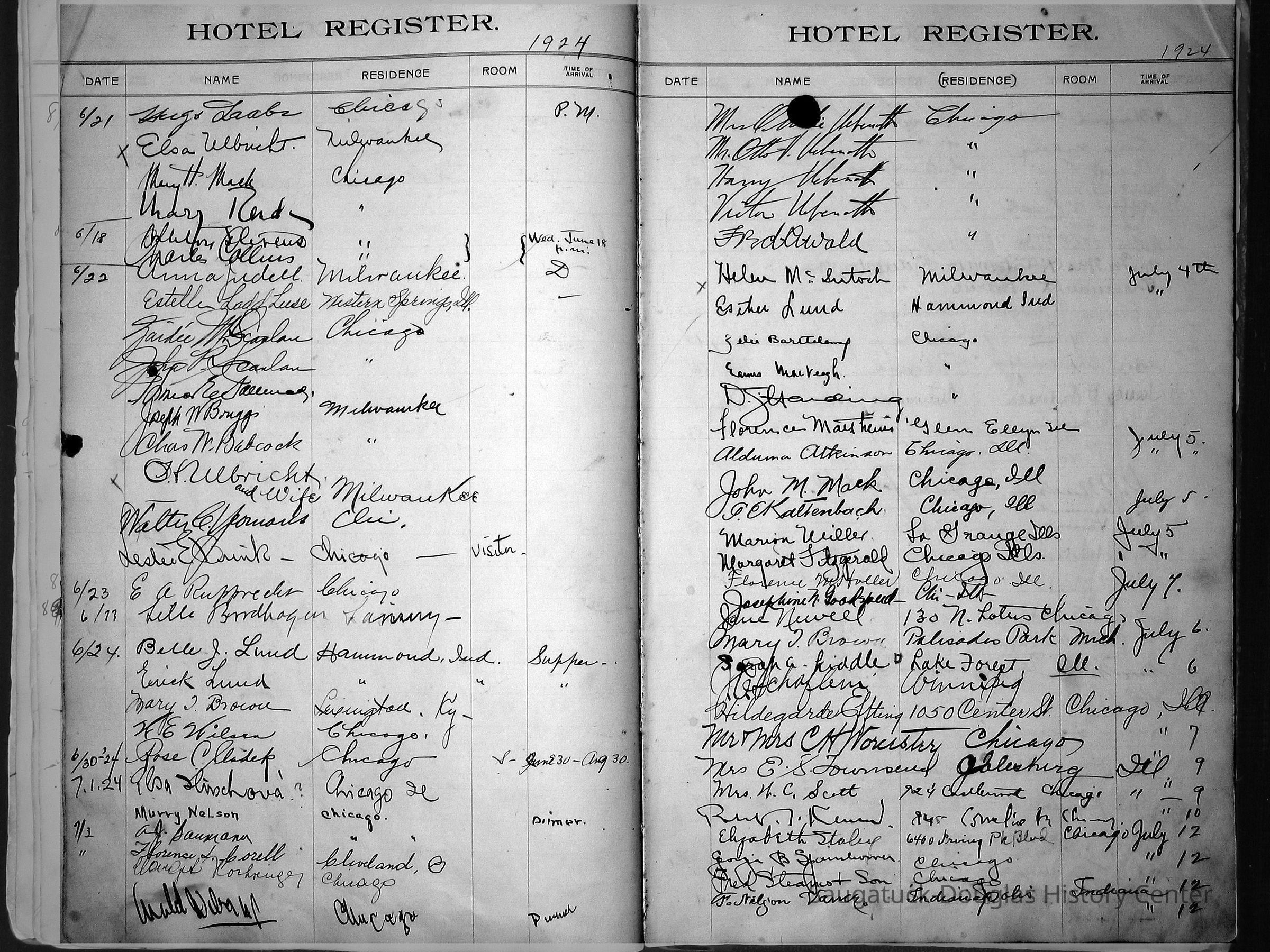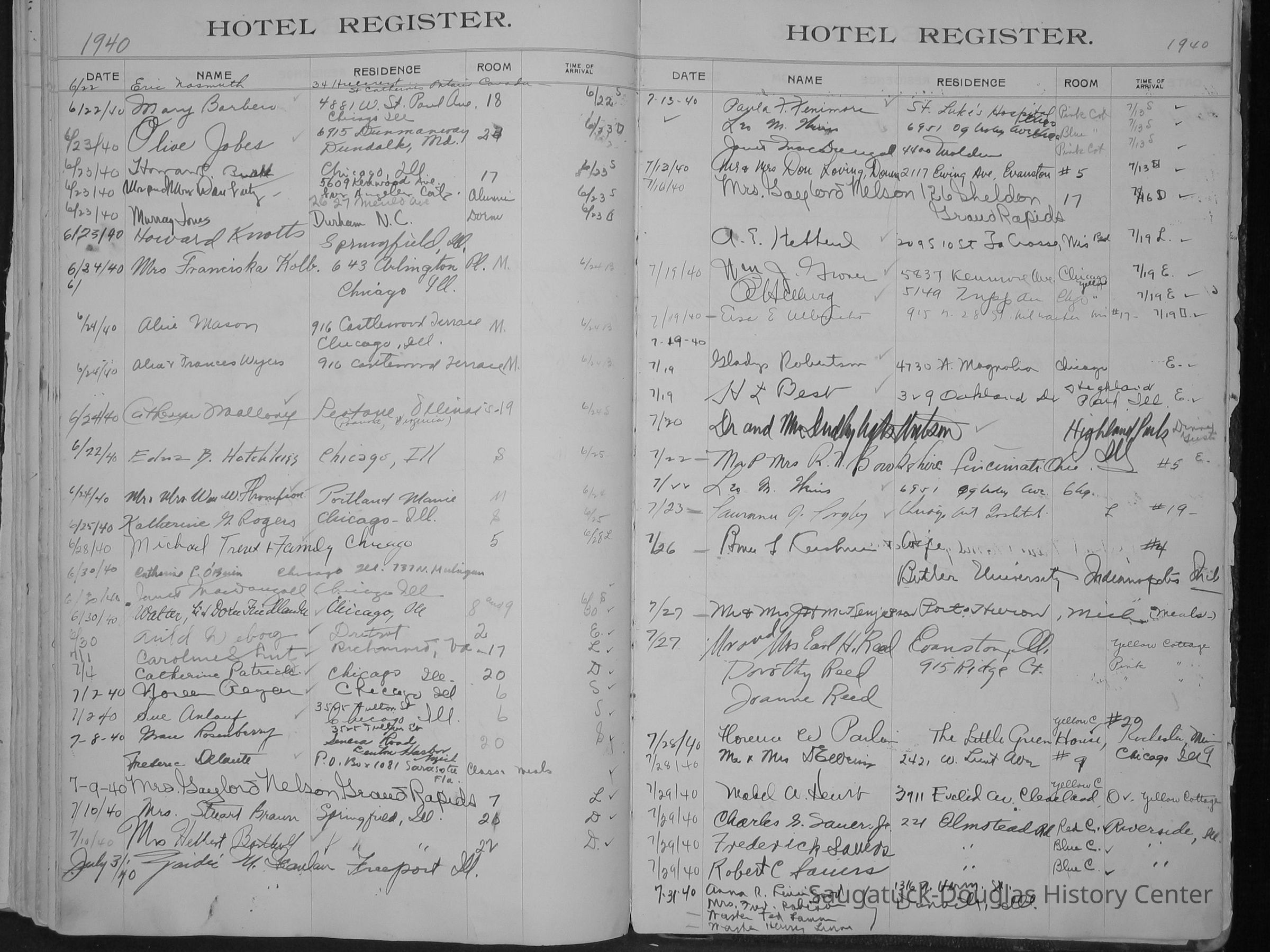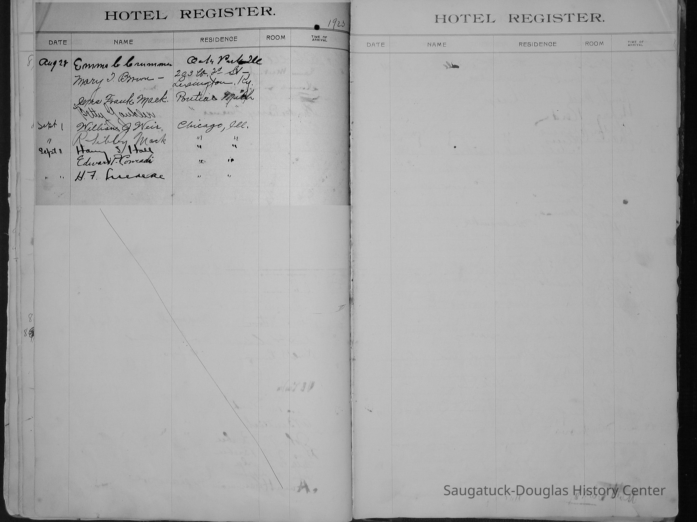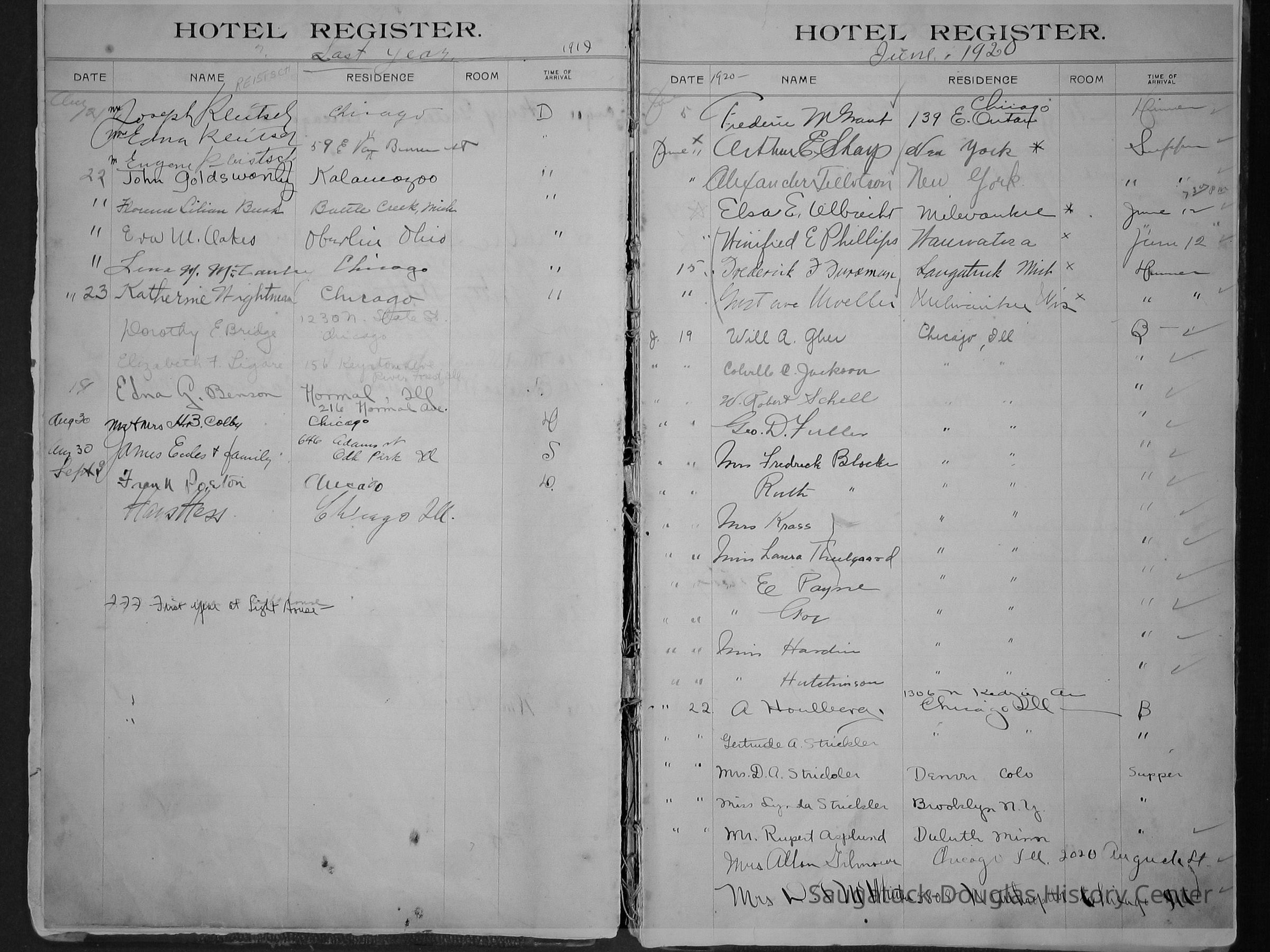 Photographs of the Ox-Bow Inn lodging register pages from 1914 to 1944. The photos were taken in June 2004 when the register was on loan from the archive of the School of the Art Institute of Chicago.