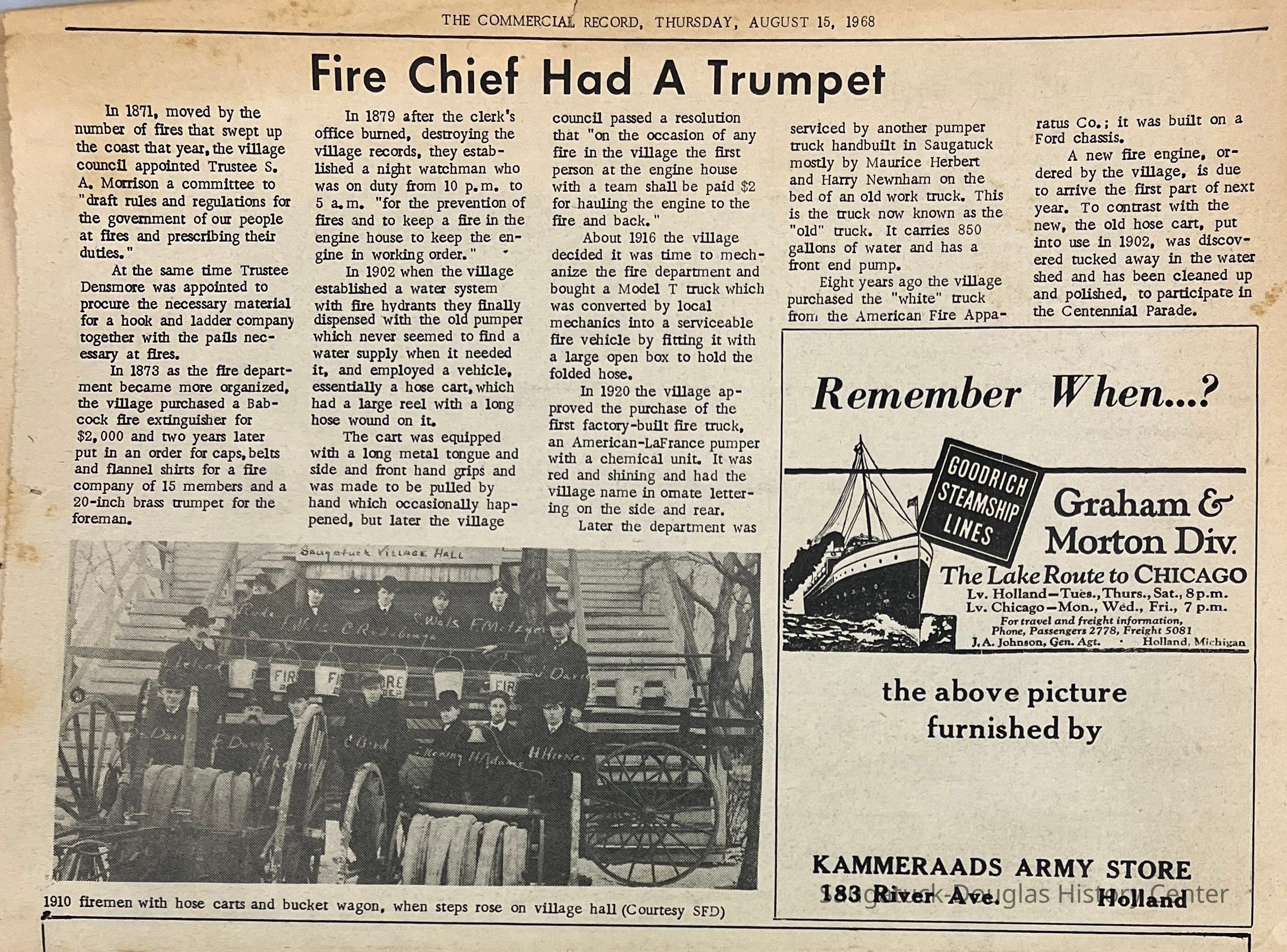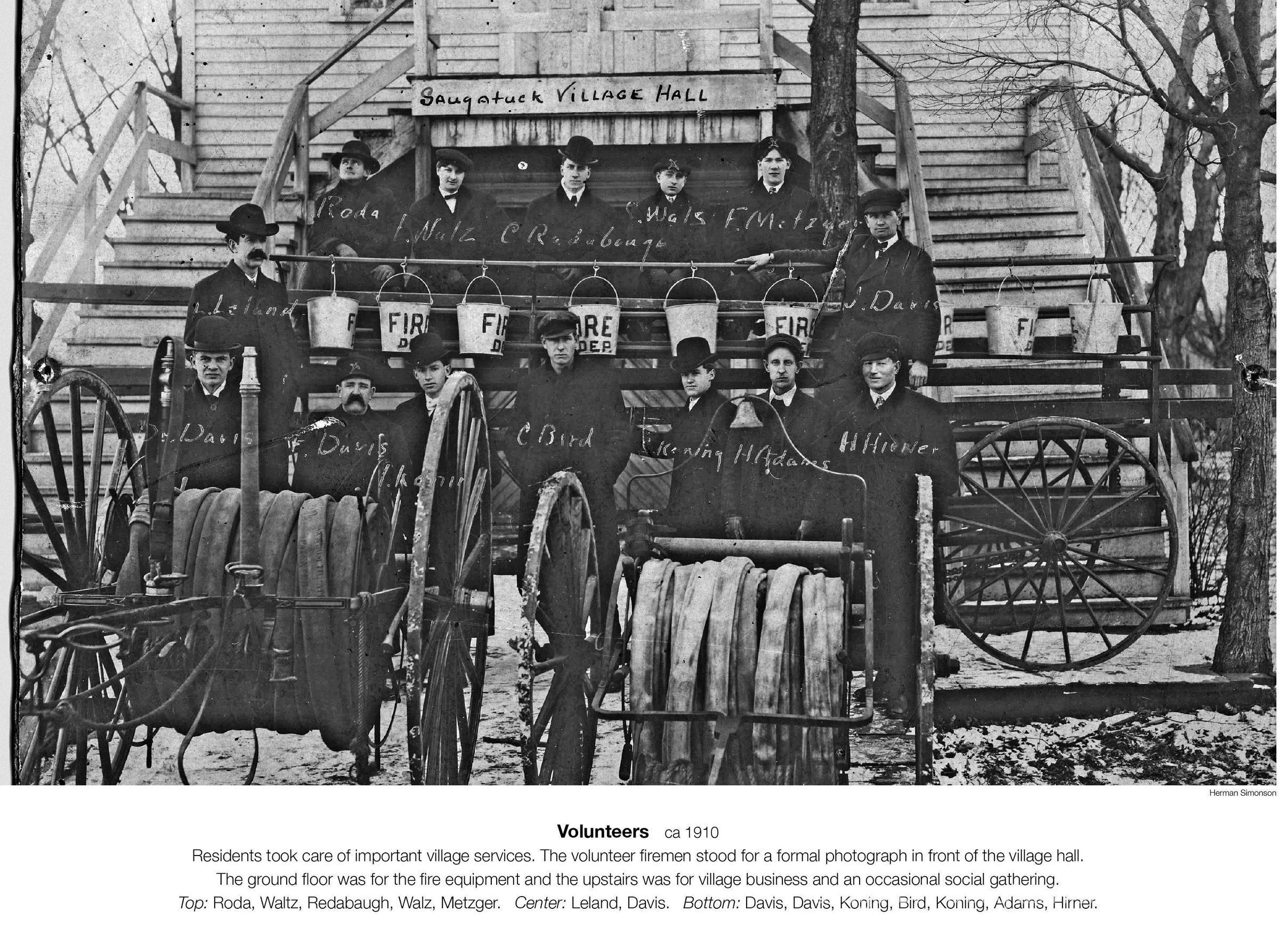 Saugatuck Township Fire DistrictWalz, Frederick J. “Fritz” 1880-1945Metzger, Frederick J. “Fritz” 1889-1937Walz, Christian "Chris" 1854-1921Davis, JimLeland, E.L. "Lee" 1878-1963Davis, Dr.Koning, Arie James "Ira" 1883-1975Bird, Charles Edmund “Carl” Jr. 1879-1968Adams, Homer Henry 1872-1941Hirner, Herman 1881-1966Davis, Frederick Arthur 1871-1912Redebaugh, Charles Nelson "Charlie" 1881-1947Koning, James 1882-1946Rode, Richard August 1875-1940102 Butler/Saugatuck Village Hall