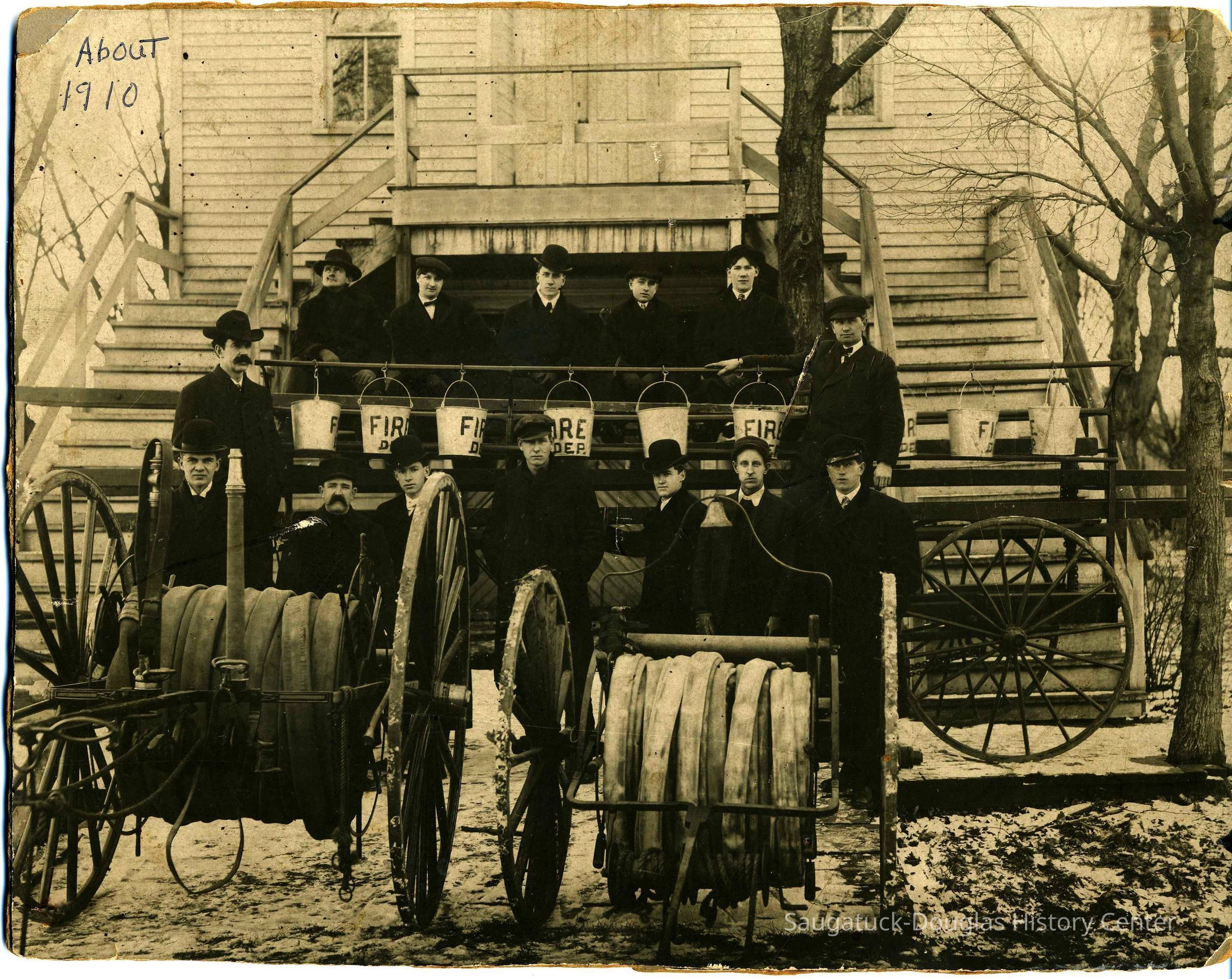 This image was featured for History Mystery#1 with the solution: Saugatuck Volunteer Fire Department, ca. 1908, in front of Saugatuck Village Hall. Members were (L to R, front row: D. Davis, F. Davis, I. Koning, C. Bird, Koning, H. Adams, H. Hirner; back row: L. Leland, R. Ruda, K. Walz, C. Redabaugh, S. Walz, F. Metzger, J. Davis)