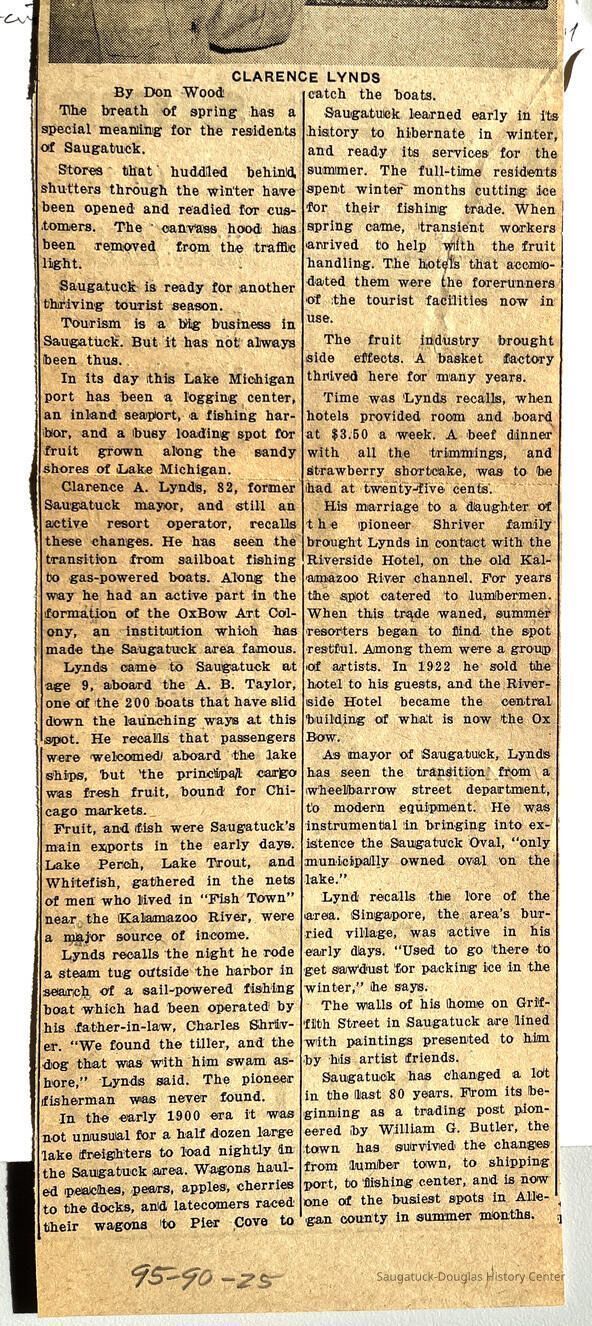 OCR scan of clipping By Don Wood The breath of spring has a special meaning for the residents of Saugatuck. Stores that huddled behind, shutters through the winter have been opened and readied for customers. The canvass hood has been removed from the traffic light. Saugatuck is ready for another thriving tourist season. Tourism is a big business in Saugatuck. But it has not always been thus. In its day this Lake Michigan port has been a logging center, an inland seaport, a fishing harbor, and a busy loading spot for fruit grown along the sandy shores of Lake Michigan. Clarence A. Lynd's, 82, former Saugatuck mayor, and still an active resort operator, recalls these changes. He has seen the transition from sailboat fishing to gas-powered boats. Along the way he had an active part in the formation of the OxBow Art Colony, an institution which has made the Saugatuck area famous. Lynds came to Saugatuck at age 9, aboard the A. B. Taylor, one Of the 200 boats that have slid down the launching ways at this spot. He recalls that passengers were welcomed) aboard the lake ships, but 'the principle cargo was fresh fruit, bound for Chicago markets. Fruit, and fish were Saugatuck’s main exports in the early days. Lake Perch, Lake Trout, and Whitefish, gathered in the nets of men who lived in “Fish Town” near the Kalamazoo River, were a major source of income. Lynds recalls the night he rode a steam tug outside the harbor in search of a sail-powered fishing boat which had been operated by his father-in-law, Charles Shriver. “We found the tiller, and the dog that was with him swam ashore,” Lynds said. The pioneer fisherman was never found. In the early 1900 era it was not unusual for a half dozen large lake freighters to load nightly Ln the Saugatuck area. Wagons hauled peaches, pears, apples, cherries to the docks, and latecomers raced their wagons 'to Pier Cove to catch the boats. Saugatuck learned early in its history to hibernate in winter, and ready its services for the summer. The full-time residents spent winter' months cutting ice for their fishing trade. When spring came, transient workers arrived to help with the fruit handling. The hotels that accommodated them were the forerunners of the tourist facilities now in use. The fruit industry brought side effects. A basket factory thrived here for many years. Time was Lynds recalls, when hotels provided room and board at $3.50 a week. A beef dinner with all the trimmings, and strawberry shortcake, was to be had at twenty-five cents. His marriage to a daughter of the pioneer Shriver family brought Lynds in contact with the Riverside Hotel, on the old Kalamazoo River channel. For years the spot catered to lumbermen. When this trade waned, summer resorters began to find the spot restful. Among them were a group of artists. In 1922 he sold the hotel to his guests, and the Riverside Hotel became the central building of what is now the Ox Bow. As mayor of Saugatuck, Lynds has seen the transition from a wheelbarrow street department, to modern equipment. He was instrumental in bringing into existence the Saugatuck Oval, “only municipally owned oval on the lake.” Lynds recalls the lore of the area. Singapore, the area’s hurried village, was active in his early days. “Used to go there to get sawdust 'for packing ice in the winter,” he says. The walls of his home on Griffith Street in Saugatuck are lined with paintings presented to him by his artist friends. Saugatuck has changed a lot in the Hast 8V years. From its beginning as a trading posit pioneered by William G. Butler, the town has survived the changes from lumber town, to shipping port, to fishing center, and is now one of the busiest spots in Allegan county in summer months.