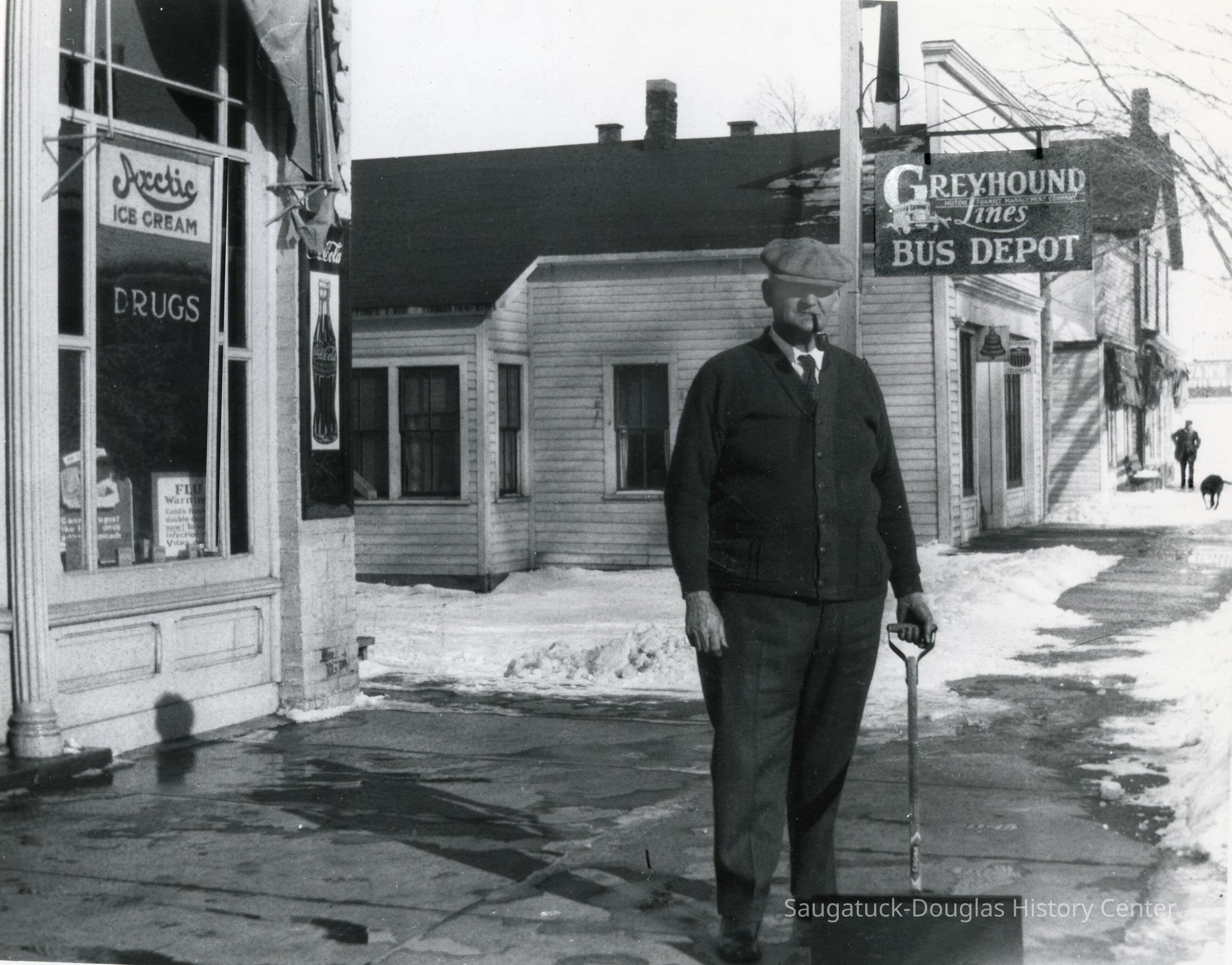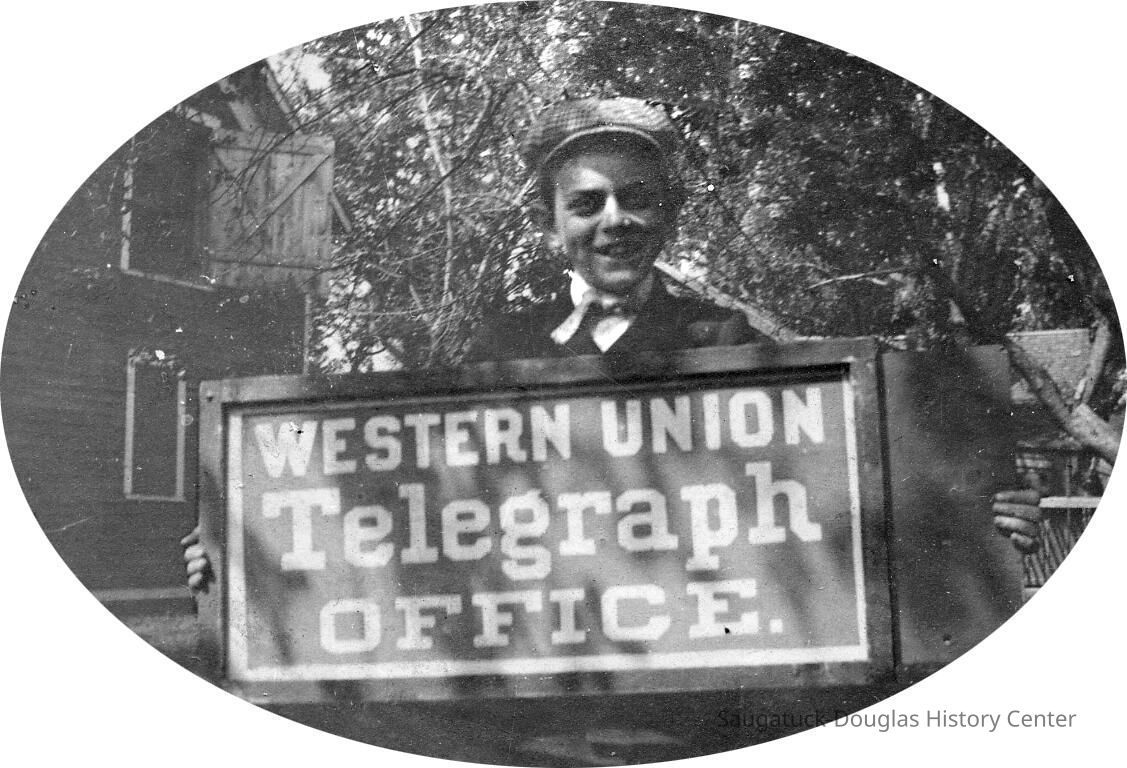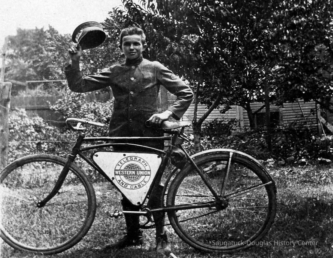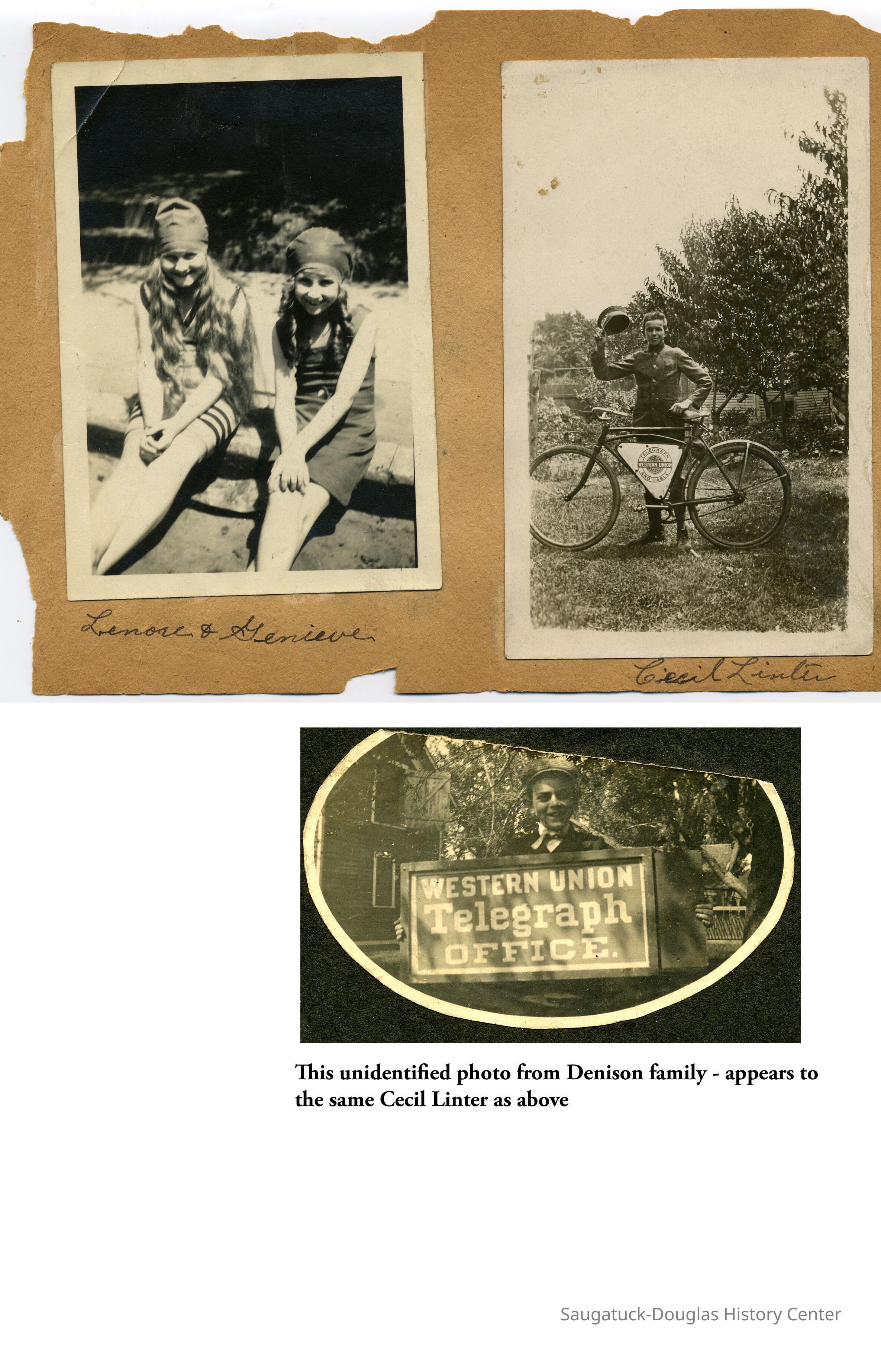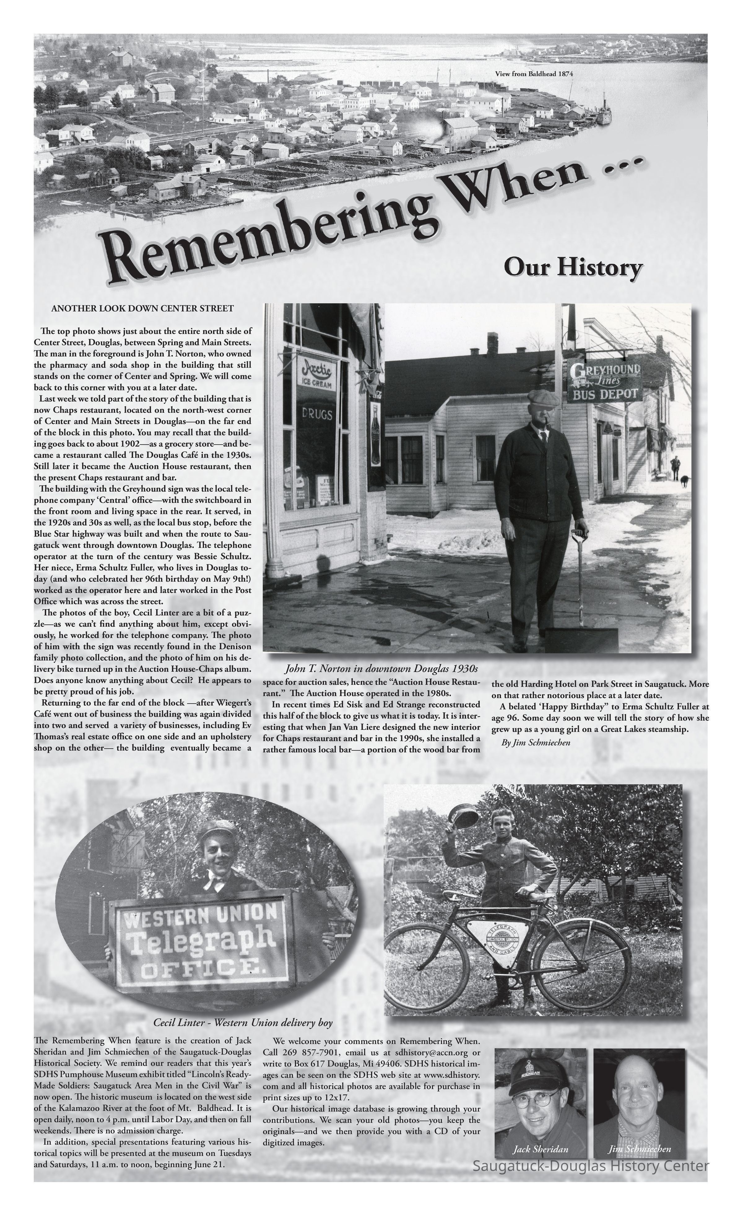 ANOTHER LOOK DOWN CENTER STREET The top photo shows just about the entire north side of Center Street, Douglas, between Spring and Main Streets. The man in the foreground is John T. Norton, who owned the pharmacy and soda shop in the building that still stands on the corner of Center and Spring. We will come back to this corner with you at a later date. Last week we told part of the story of the building that is now Chaps restaurant, located on the north-west corner of Center and Main Streets in Douglas—on the far end of the block in this photo. You may recall that the building goes back to about 1902—as a grocery store—and became a restaurant called The Douglas Café in the 1930s. Still later it became the Auction House restaurant, then the present Chaps restaurant and bar. The building with the Greyhound sign was the local telephone company ‘Central’ office—with the switchboard in the front room and living space in the rear. It served, in the 1920s and 30s as well, as the local bus stop, before the Blue Star highway was built and when the route to Saugatuck went through downtown Douglas. The telephone operator at the turn of the century was Bessie Schultz. Her niece, Erma Schultz Fuller, who lives in Douglas today (and who celebrated her 96th birthday on May 9th!) worked as the operator here and later worked in the Post Office which was across the street. The photos of the boy, Cecil Linter are a bit of a puzzle—as we can’t find anything about him, except obviously, he worked for the telephone company. The photo of him with the sign was recently found in the Denison family photo collection, and the photo of him on his delivery bike turned up in the Auction House-Chaps album. Does anyone know anything about Cecil? He appears to be pretty proud of his job. Returning to the far end of the block —after Wiegert’s Café went out of business the building was again divided into two and served a variety of businesses, including Ev Thomas’s real estate office on one side and an upholstery shop on the other— the building eventually became a space for auction sales, hence the “Auction House Restaurant.” The Auction House operated in the 1980s. In recent times Ed Sisk and Ed Strange reconstructed this half of the block to give us what it is today. It is interesting that when Jan Van Liere designed the new interior for Chaps restaurant and bar in the 1990s, she installed a rather famous local bar—a portion of the wood bar from the old Harding Hotel on Park Street in Saugatuck. More on that rather notorious place at a later date. A belated ‘Happy Birthday” to Erma Schultz Fuller at age 96. Some day soon we will tell the story of how she grew up as a young girl on a Great Lakes steamship. By Jim Schmiechen