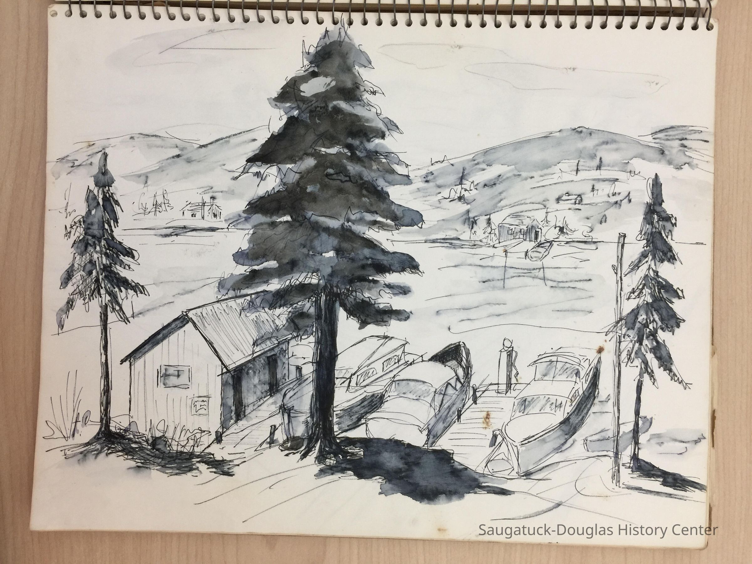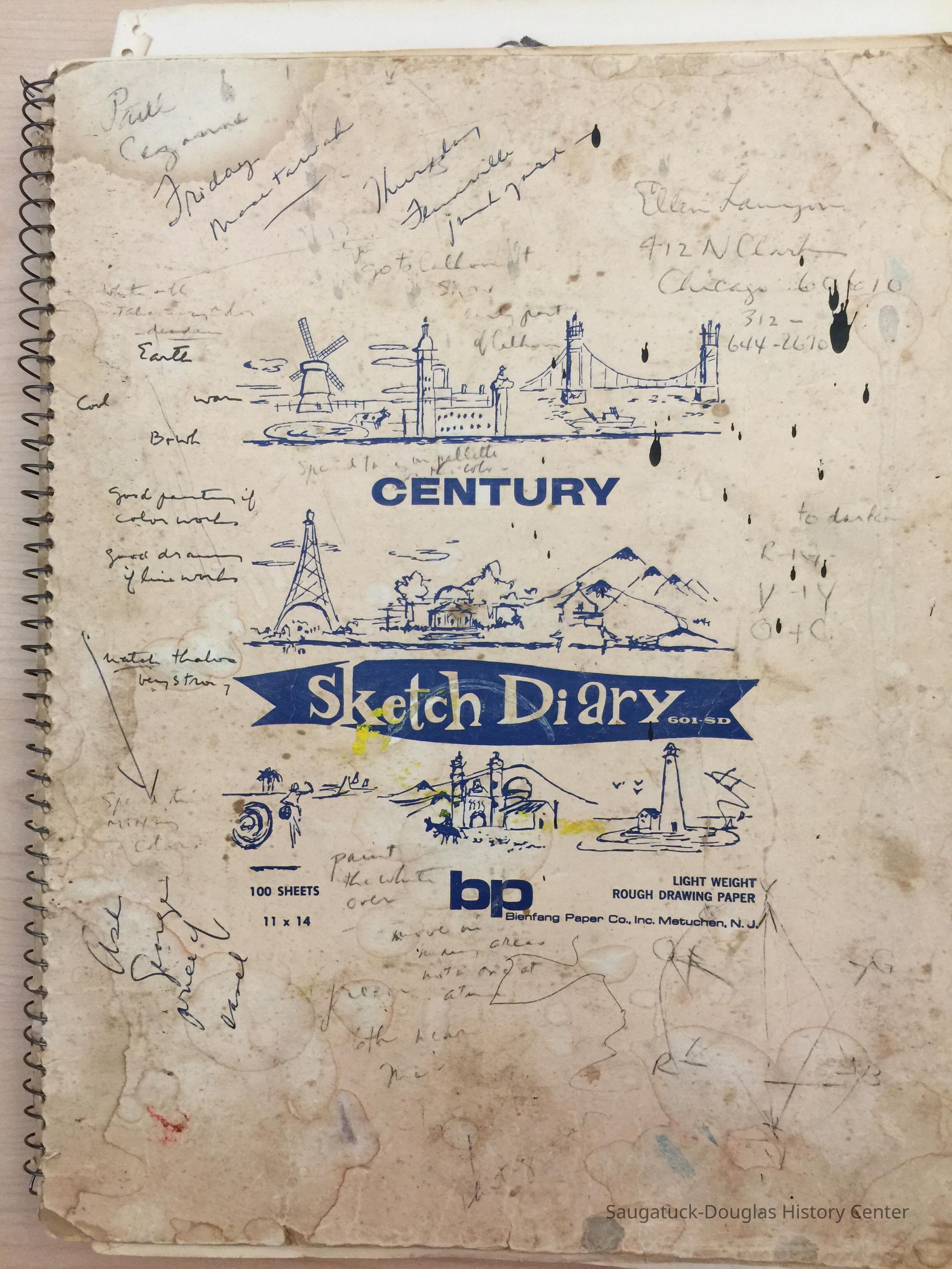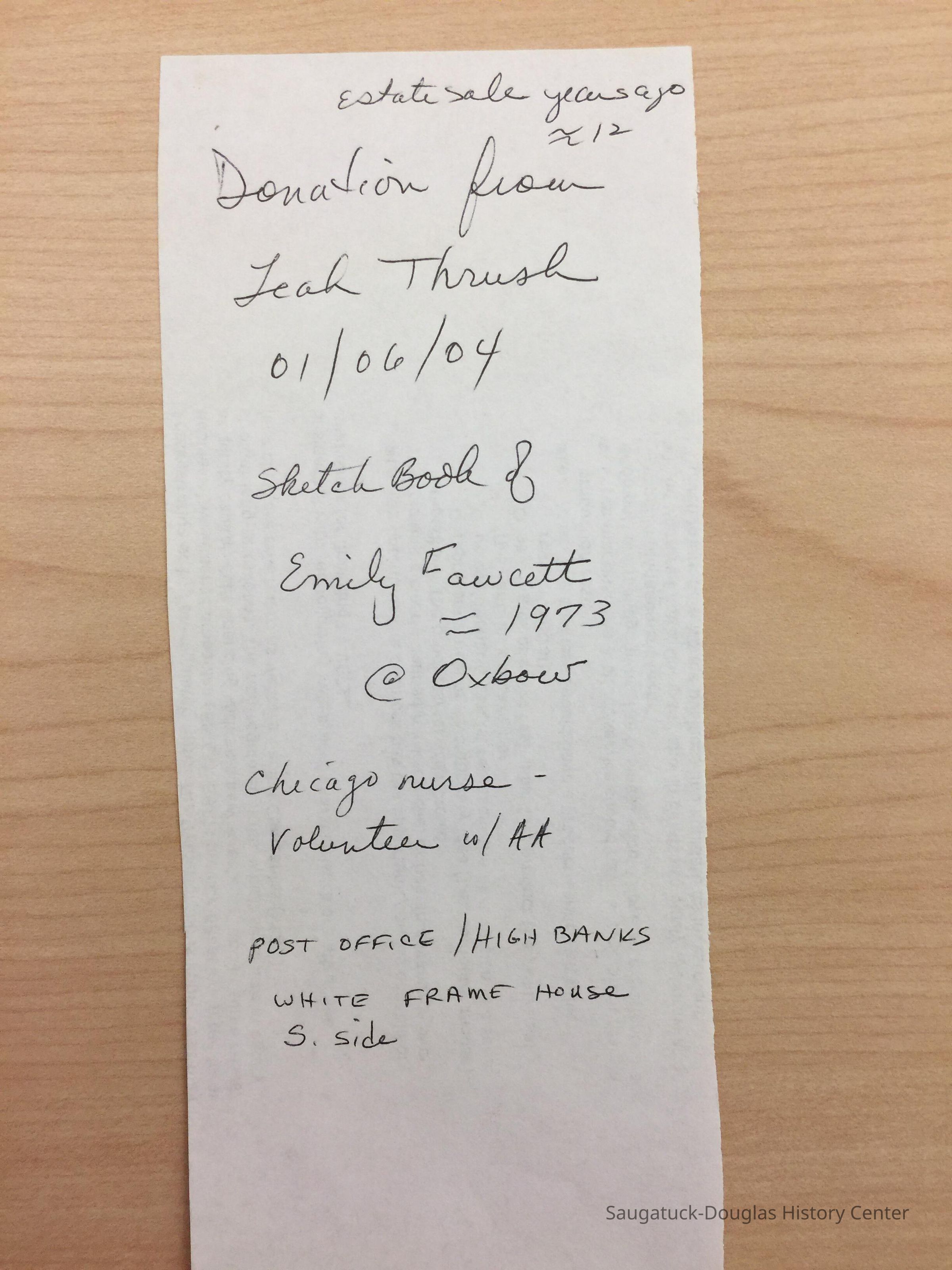 A note indicates the the sketchbook was purchased at an unknown estate sale (circa 1960) and donated by Leah Thrush on 1/6/2004. The book belonged to Emily Fawcett who studied at Ox-Bow circa 1973. "Chicago nurse - volunteer to/AA" "Post office/high banks" "White frame house S. side."
