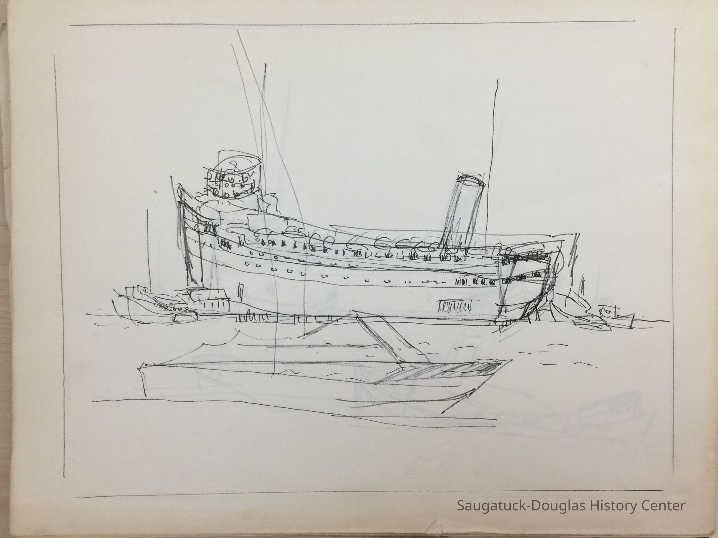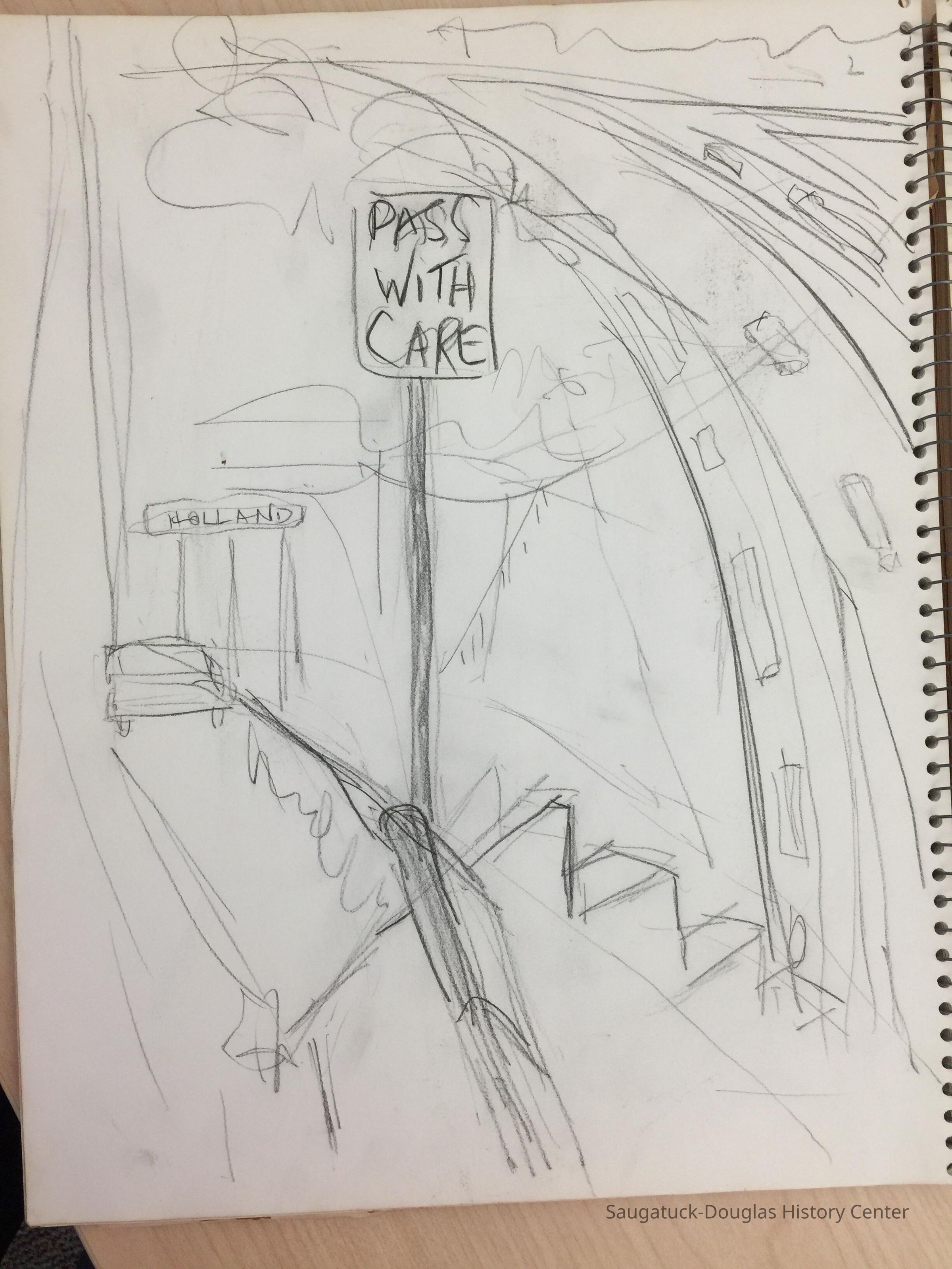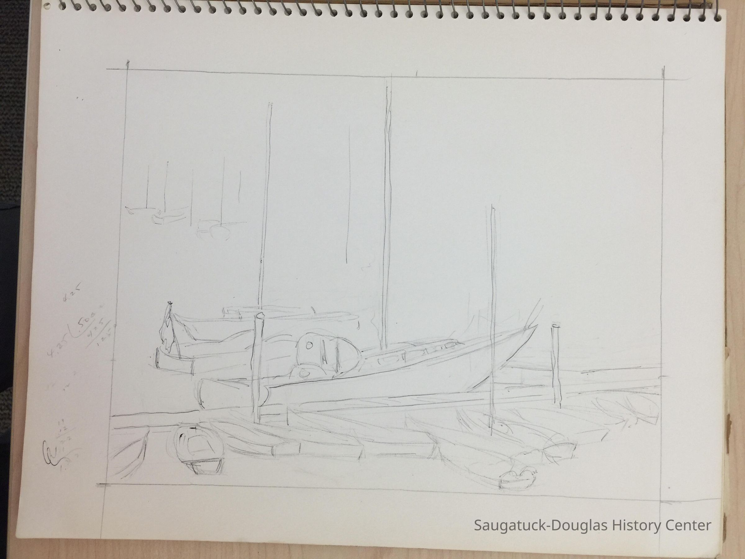 A note indicates the the sketchbook was purchased at an unknown estate sale (circa 1960) and donated by Leah Thrush on 1/6/2004. The book belonged to Emily Fawcett who studied at Ox-Bow circa 1973. "Chicago nurse - volunteer to/AA" "Post office/high banks" "White frame house S. side."
