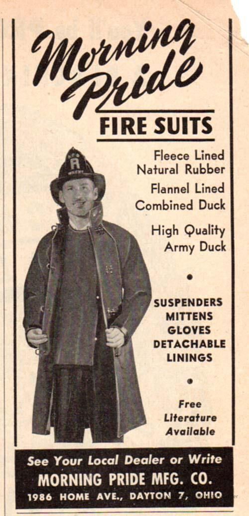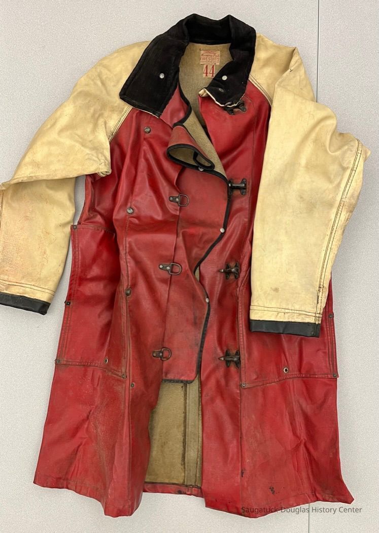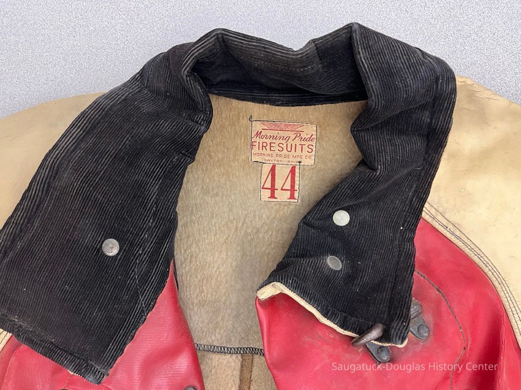 A rubber-coated canvas. fire fighting coat belonging to Bert Van Dis, size 44. The coat has white raglan sleeves, a red body and black corduroy collar. It is lined with a beige fleece. It closes with metal latches that have an additional backing panel to create a water-resistant closure. Manufacturers label sewn to collar reads "Morning Pride Firesuits, Morning Pride Mfg. Co., Dayton, Ohio."