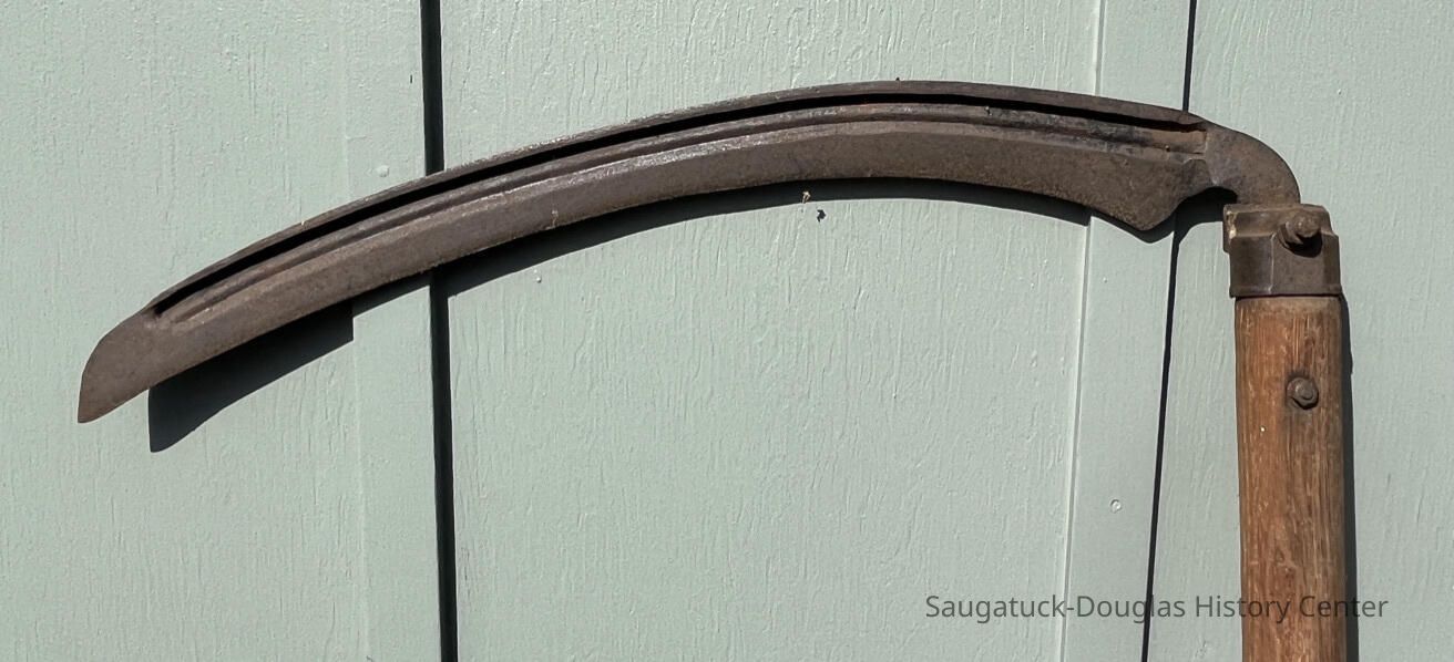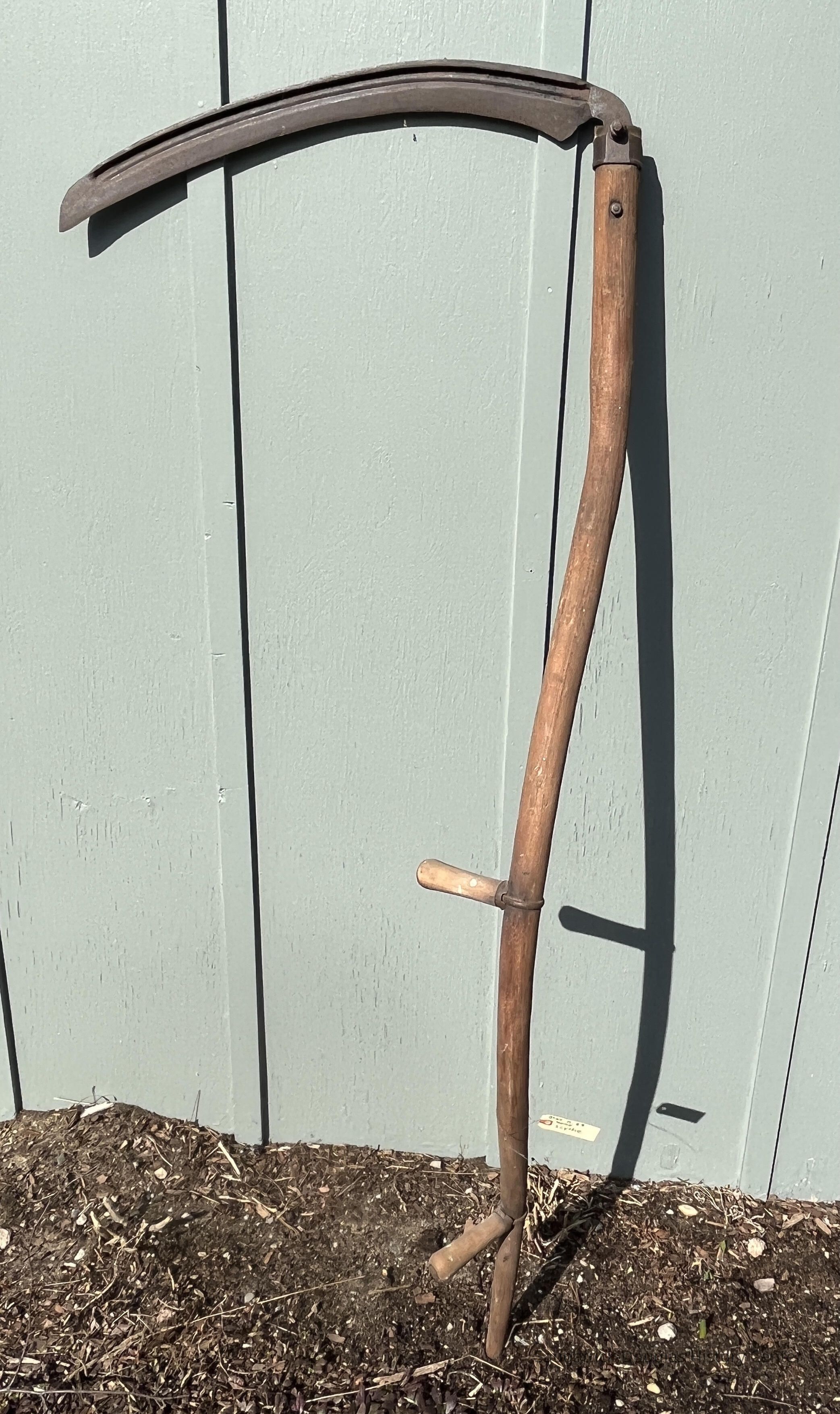 Wooden hand scythe with 27" metal blade and two attached grips from the House estate.