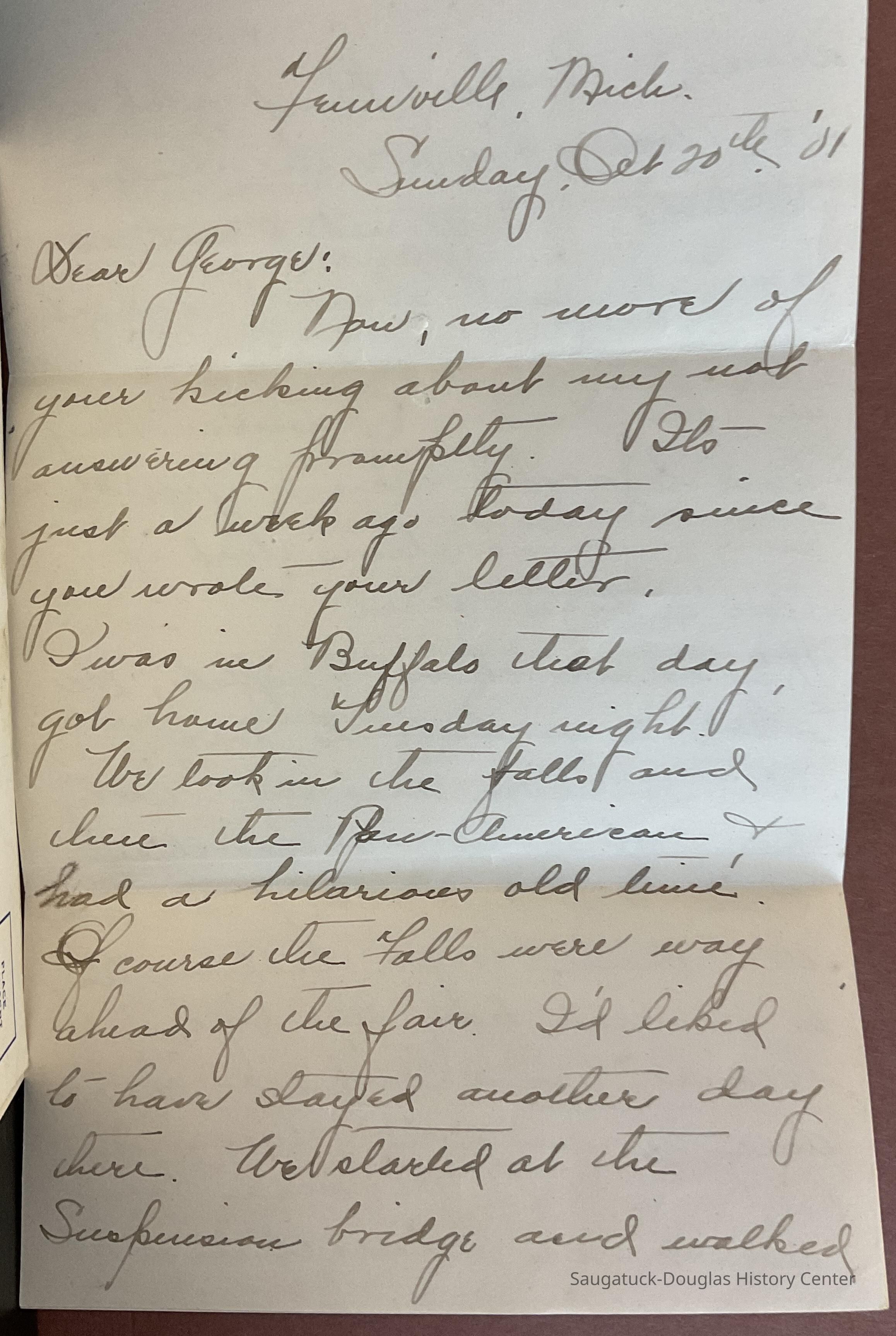 Letter sent to Mr. George B. Tisdale in Sault St. Marie Michigan from Sue (or sis) in Fennville, MI telling him of her trip to the Pan American and Niagara Falls, and news of friends who are working in CA.