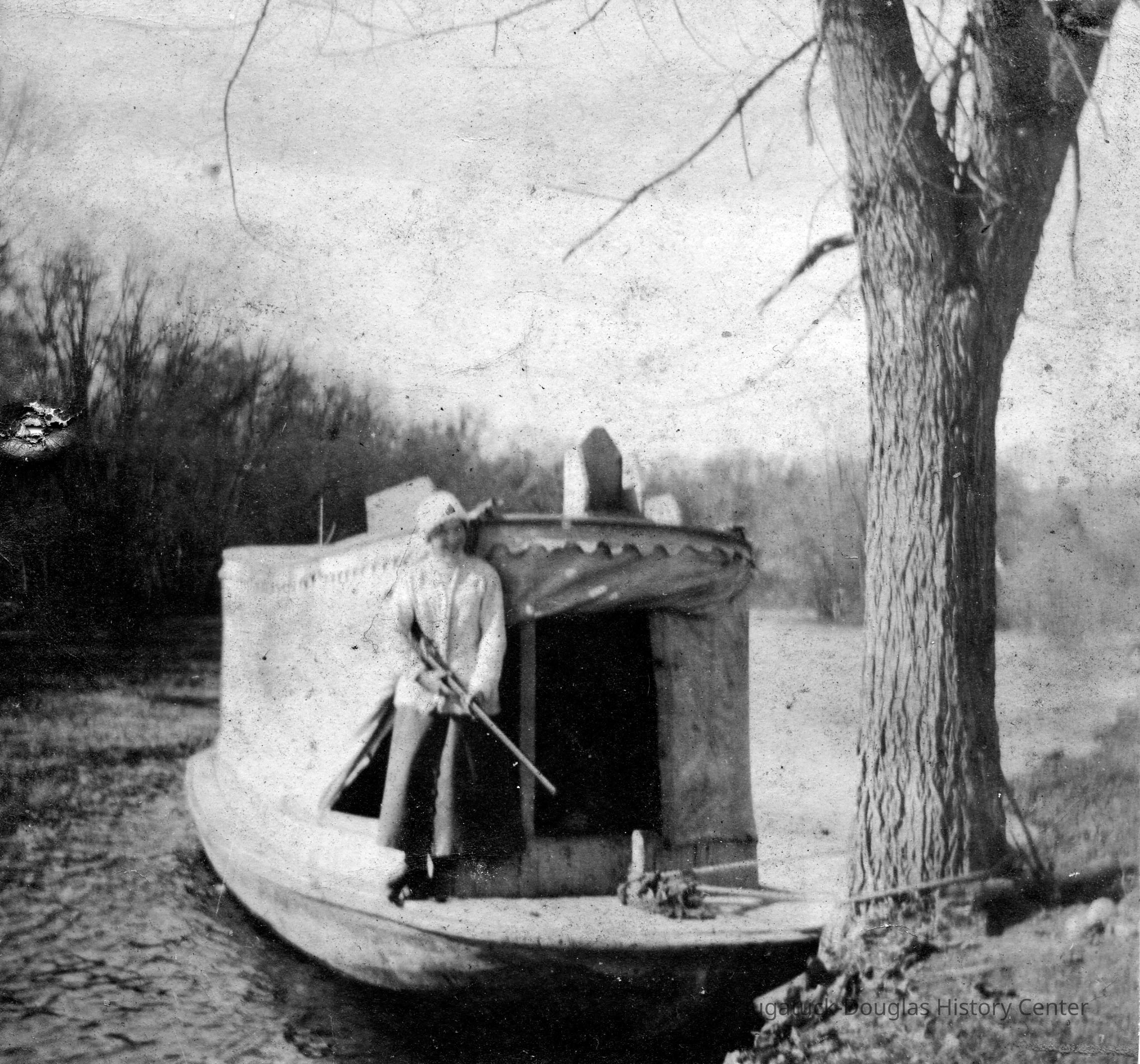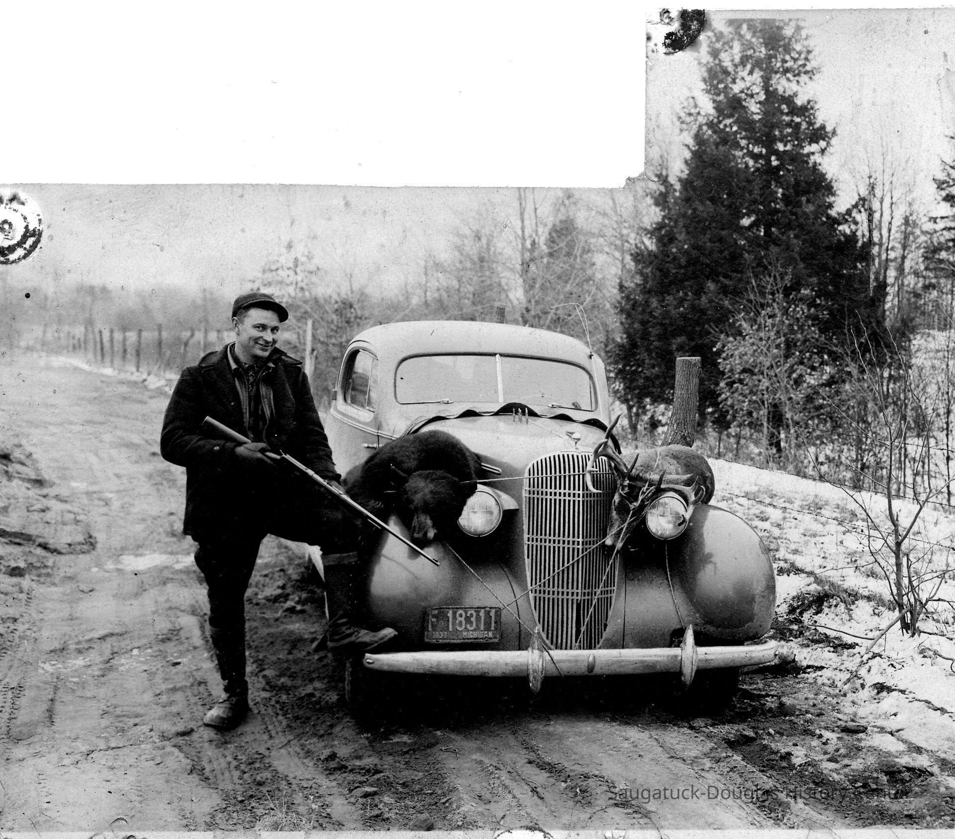 A collection of photos of people showing of their success hunting ducks, deer or muskrats. Also hunting cabins.
