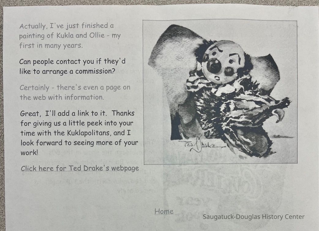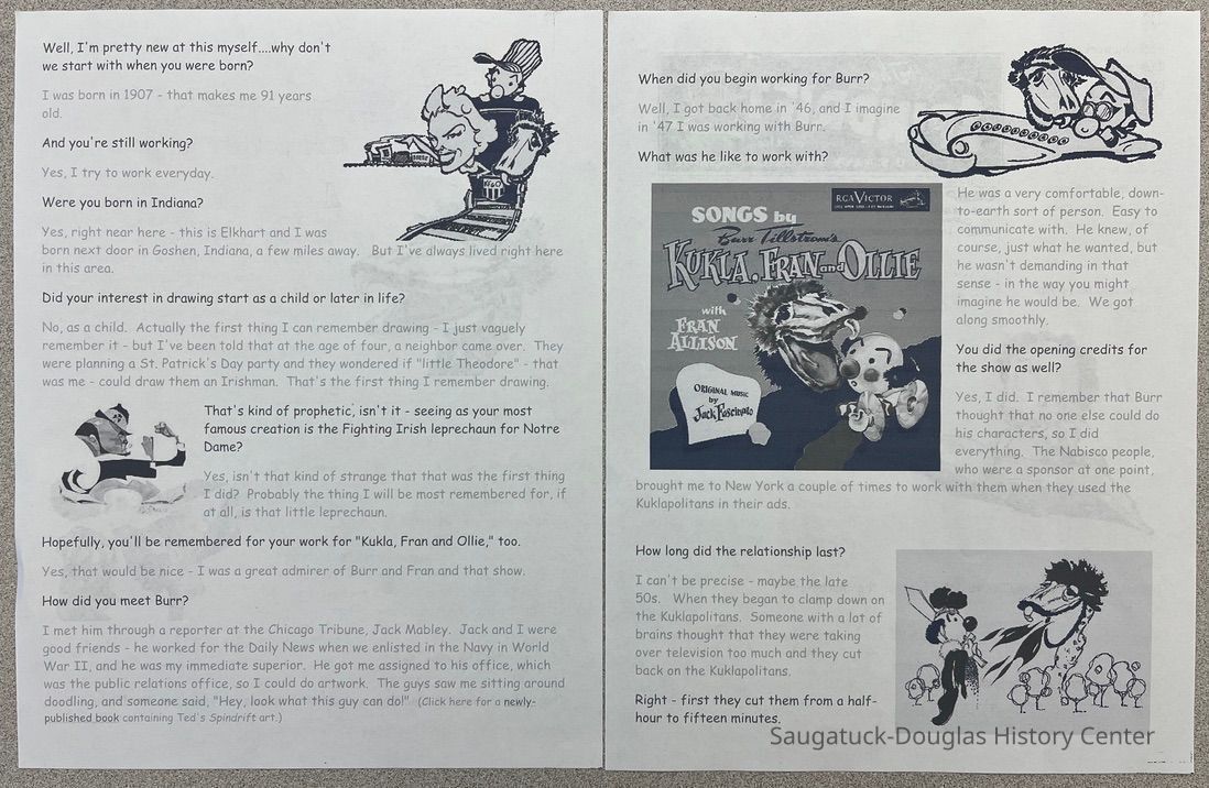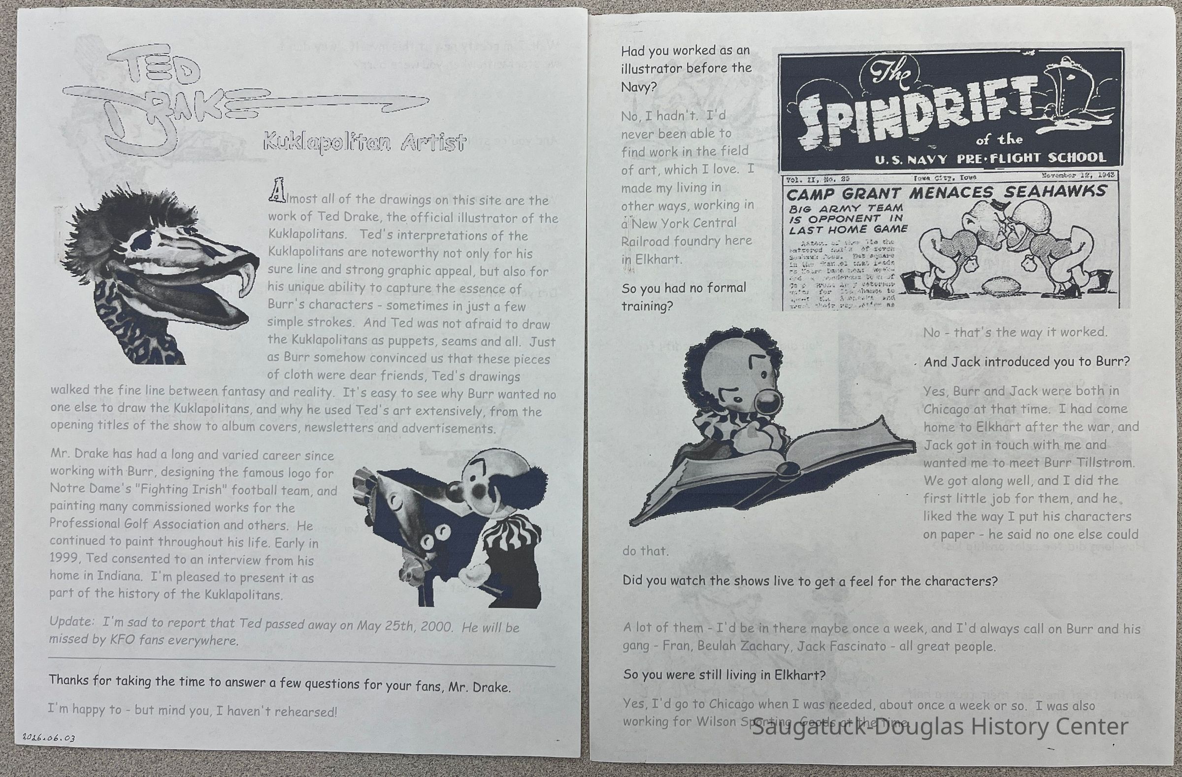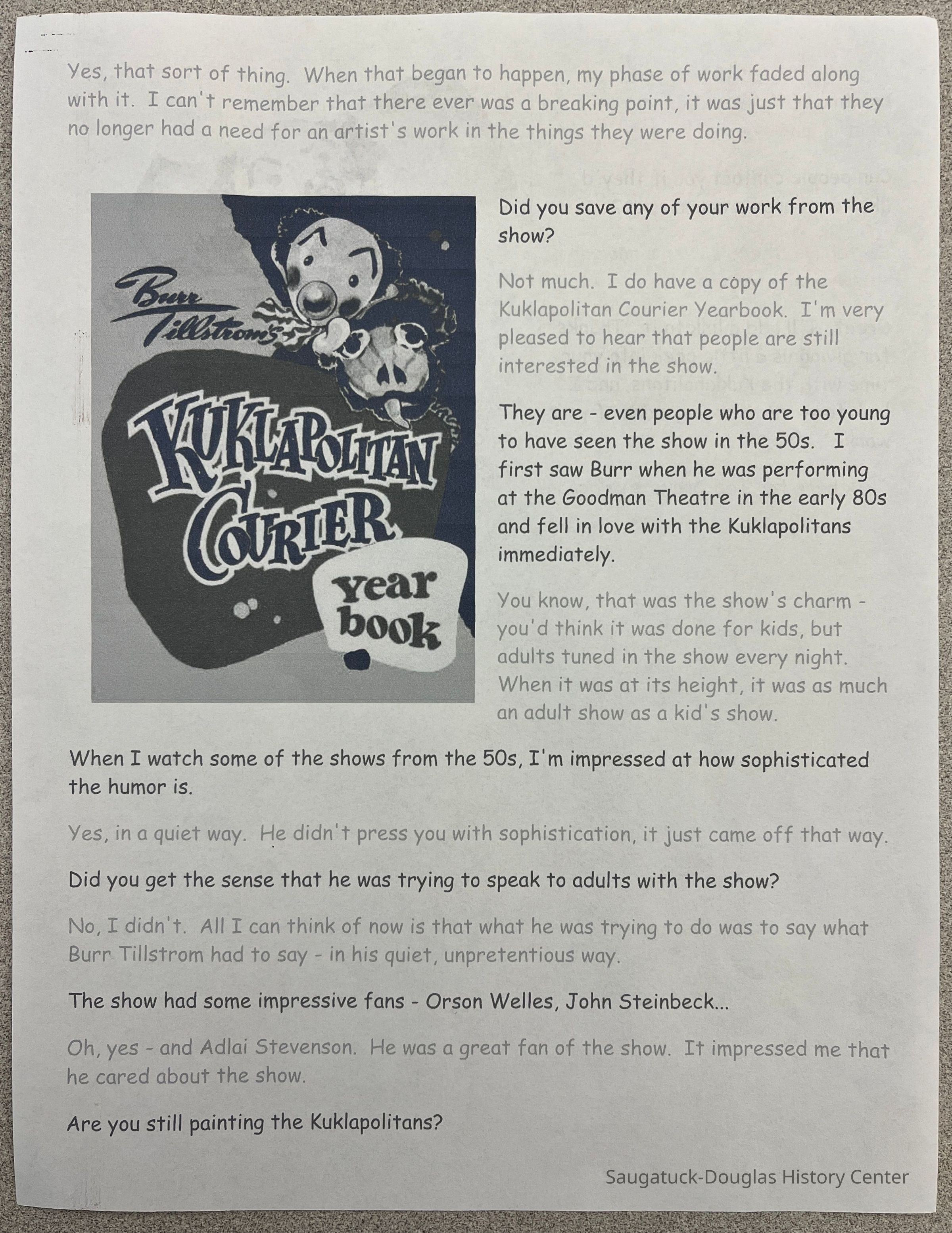 Also, 6-page laser print of a website-hosted interview with illustrator Ted Drake with emphasis on his experiences working for Burr Tillstrom. In the interview, Mr. Drake specifically mentions the Kuklapolitan Courier Year Book. 2026.06.03