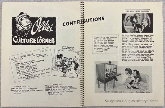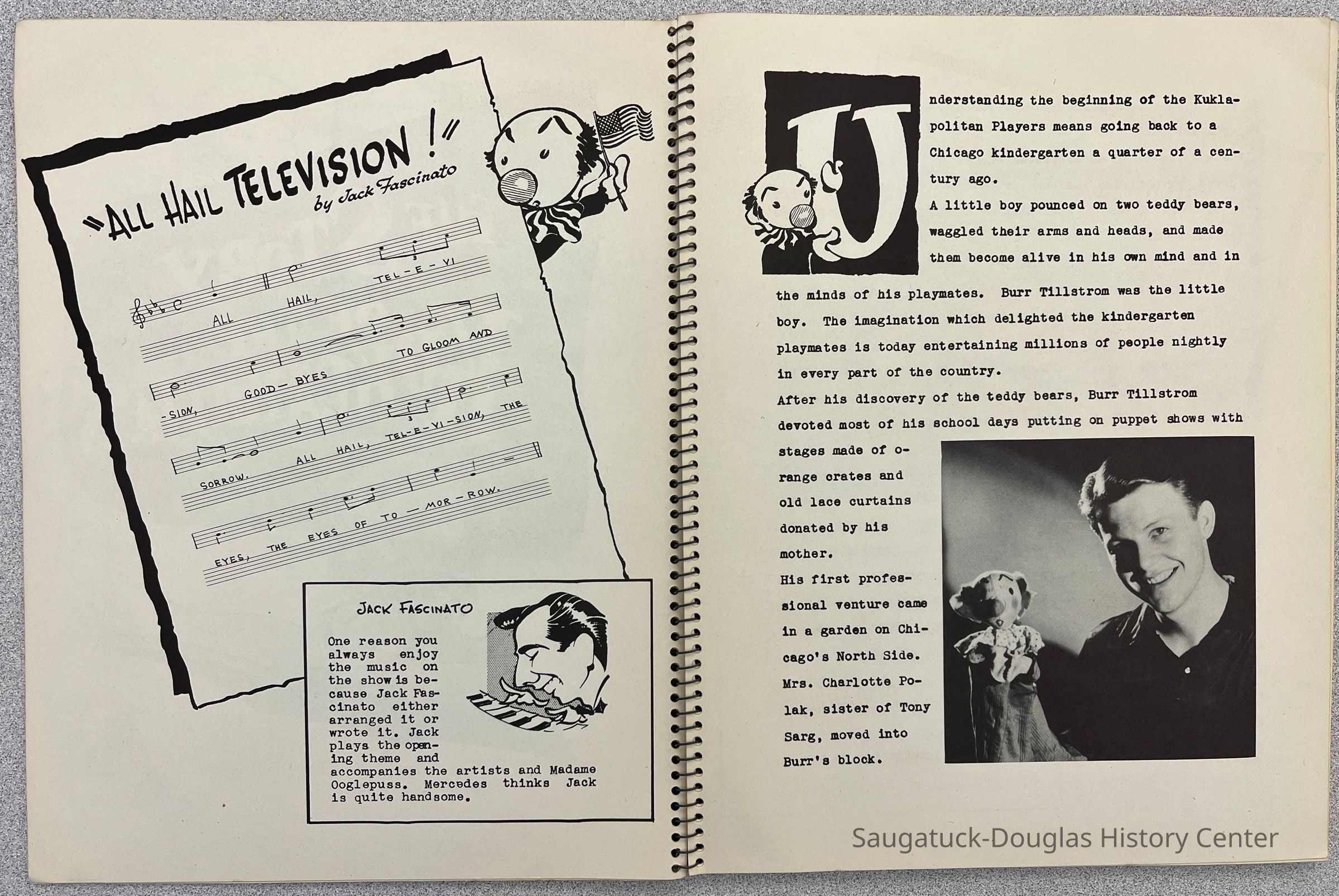 Wire spiral-bound 64-page booklet with photos, illustrations by Ted Drake and text about Burr Tillstrom, Fran Allison, Jack Fascinato, Joe Lockwood, Lew Gomavitz, Beulah Zachary, Lynwood King and other humans on the television show production team plus Kuklapolitans including Kukla, Ollie the Dragon, Fletcher Rabbit, Madame Ooglepuss, Beulah Witch, Cecil Bill, and Mercedes.