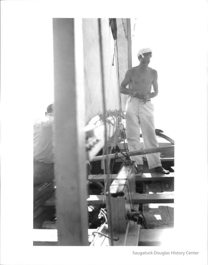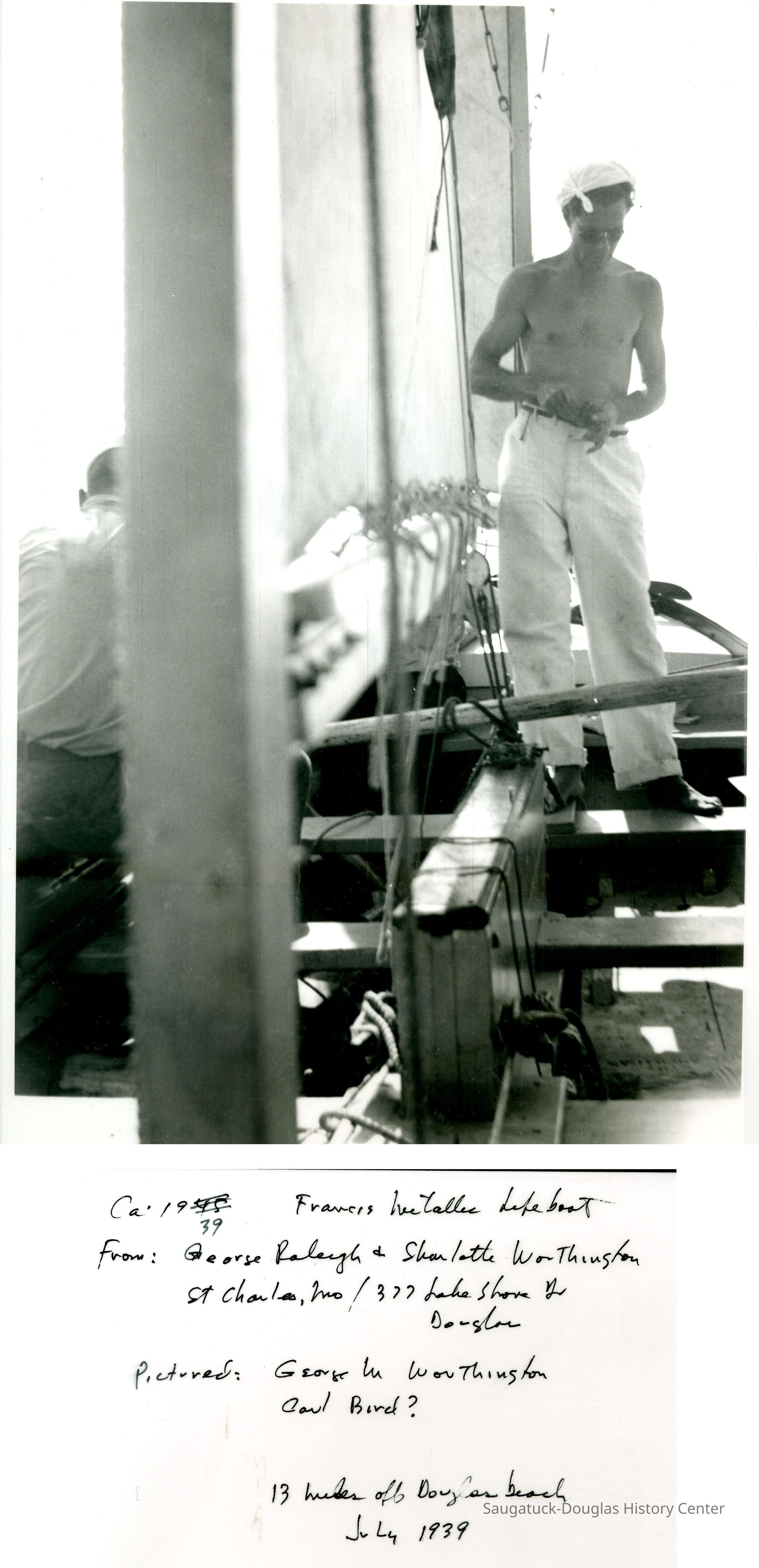 Photograph of George M. Worthington and possibly Carl Bird, Francis Metallic Lifeboat, 13 miles off Douglas Beach, July 1939. Image measures 12" x 7.5" and is laminated.