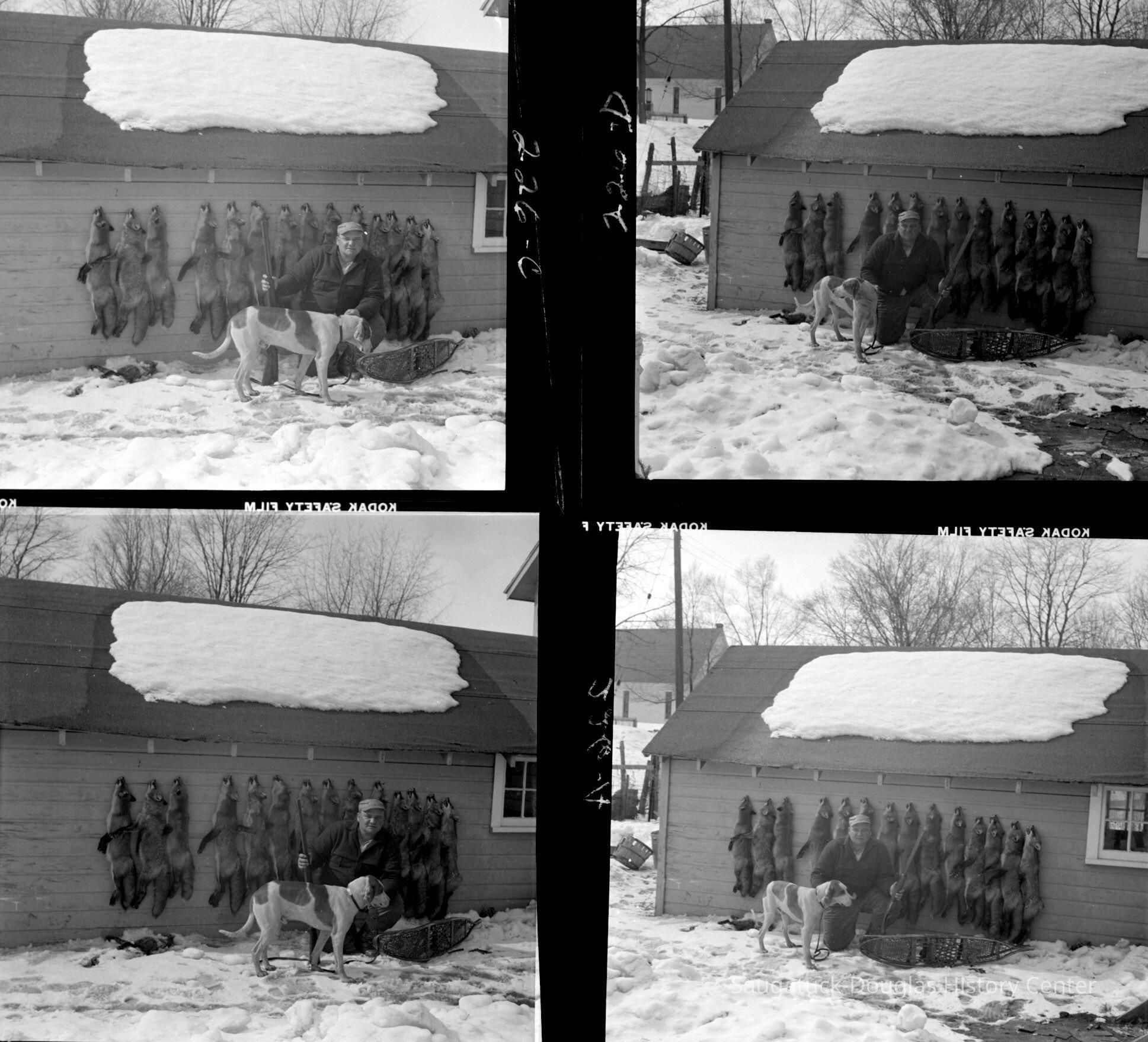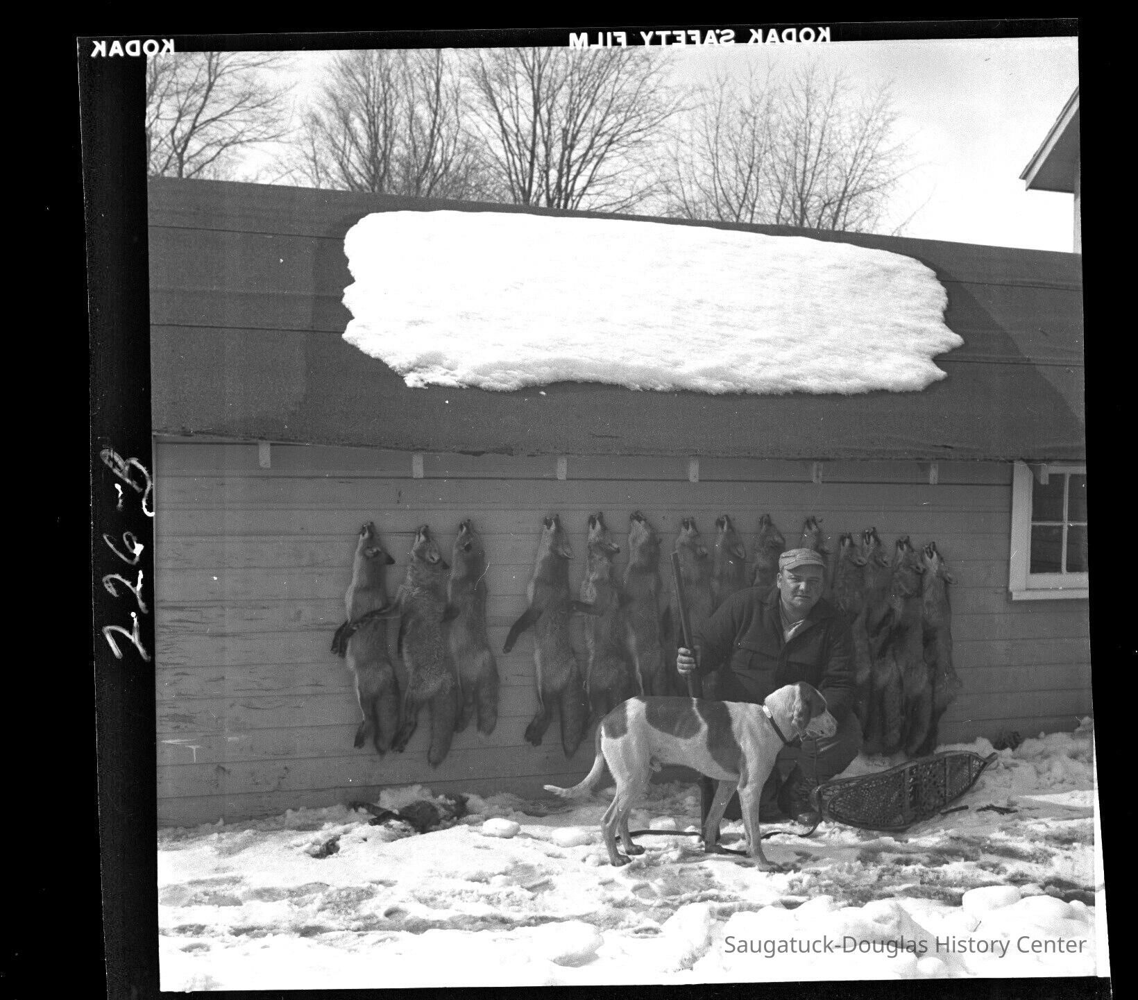 Lloyd Engel kneeling with his hunting dog and a rifle in front of a building with fourteen fox bodies hanging from the wall.
